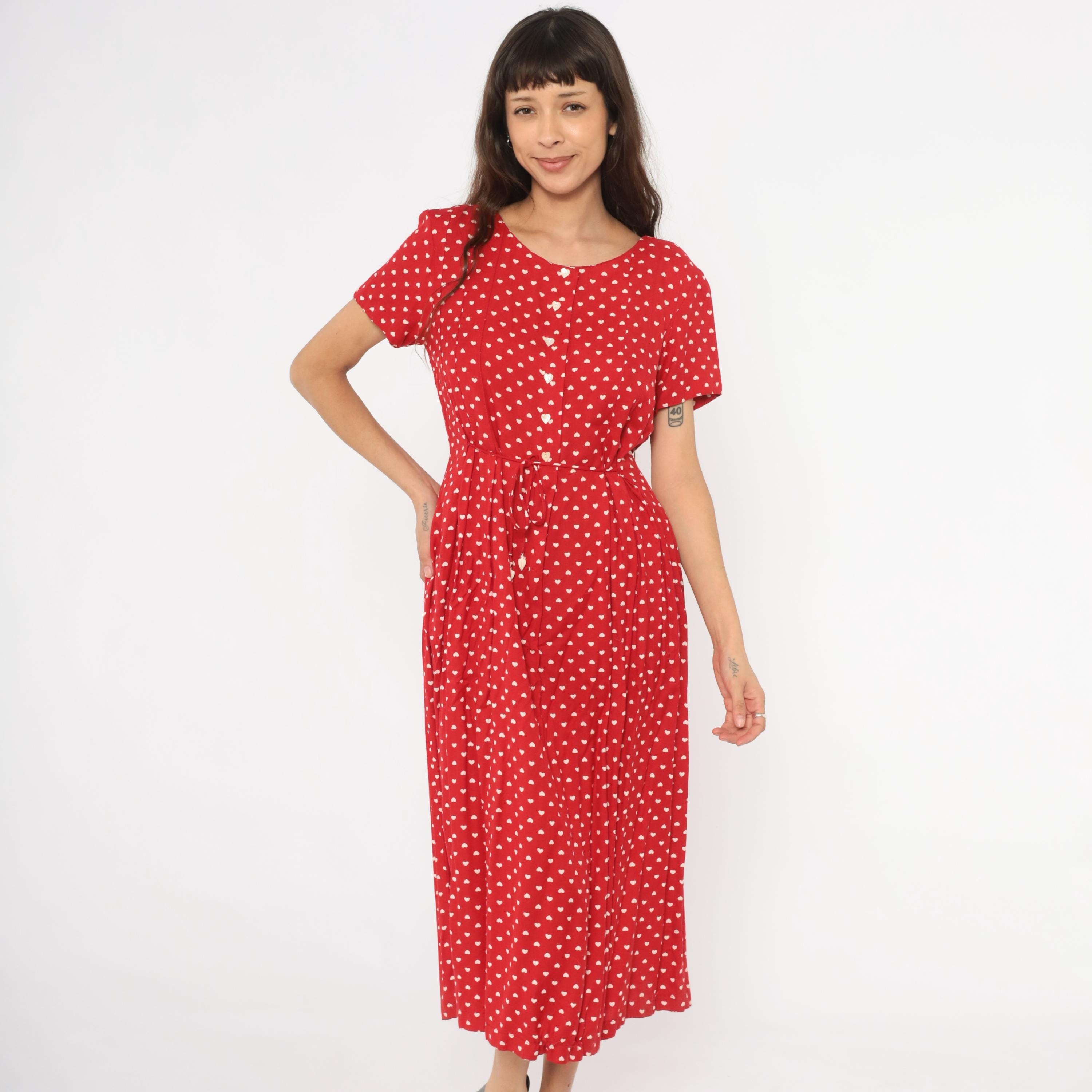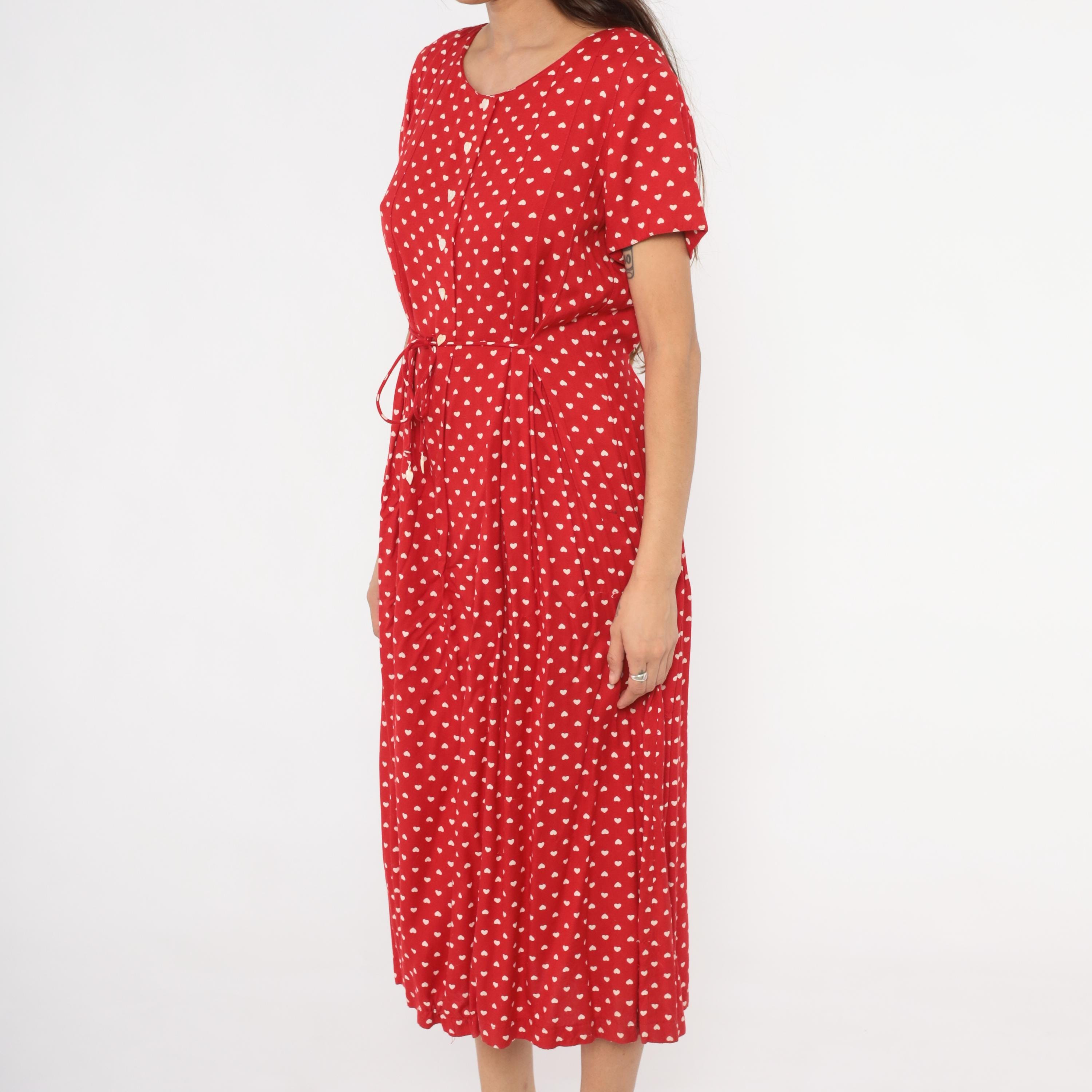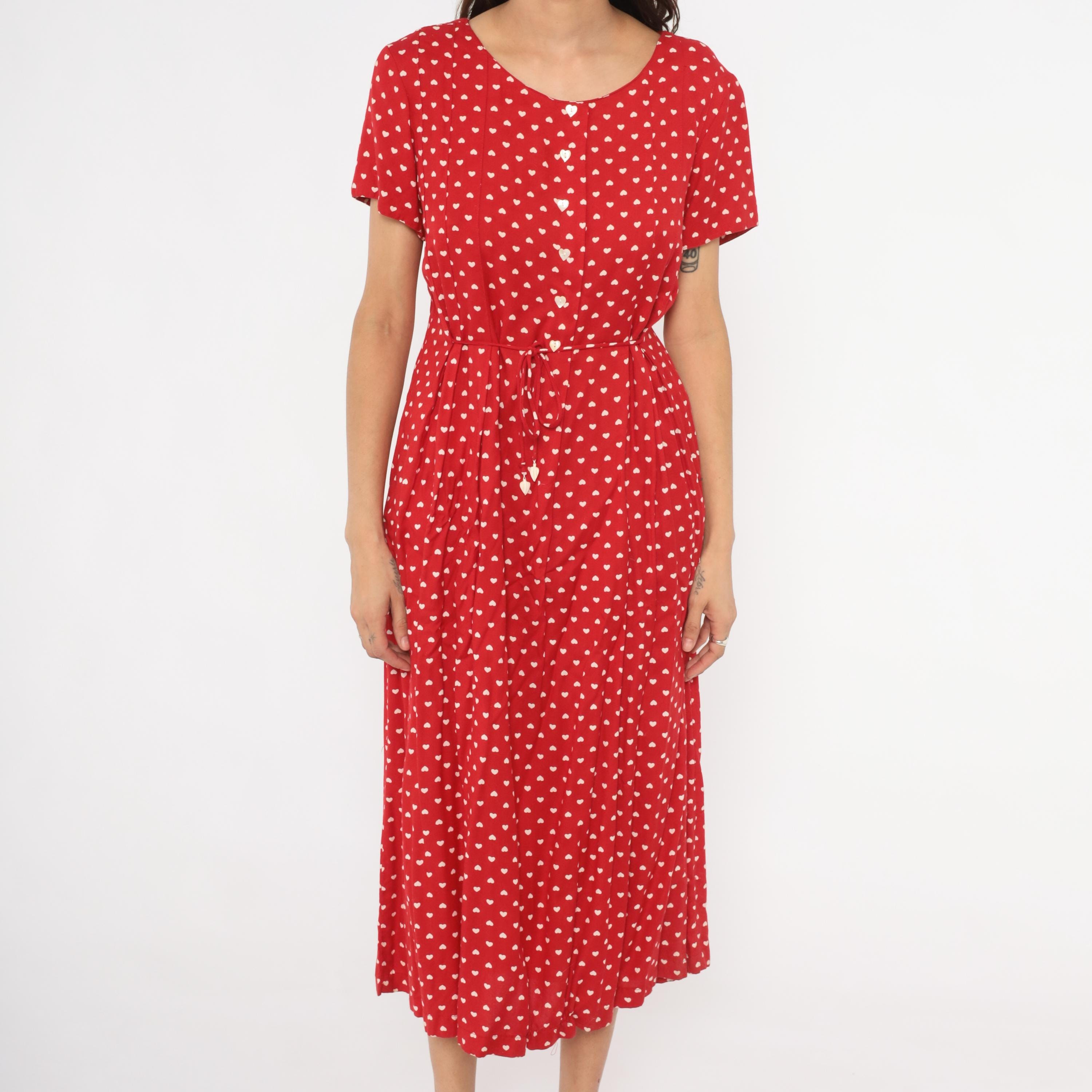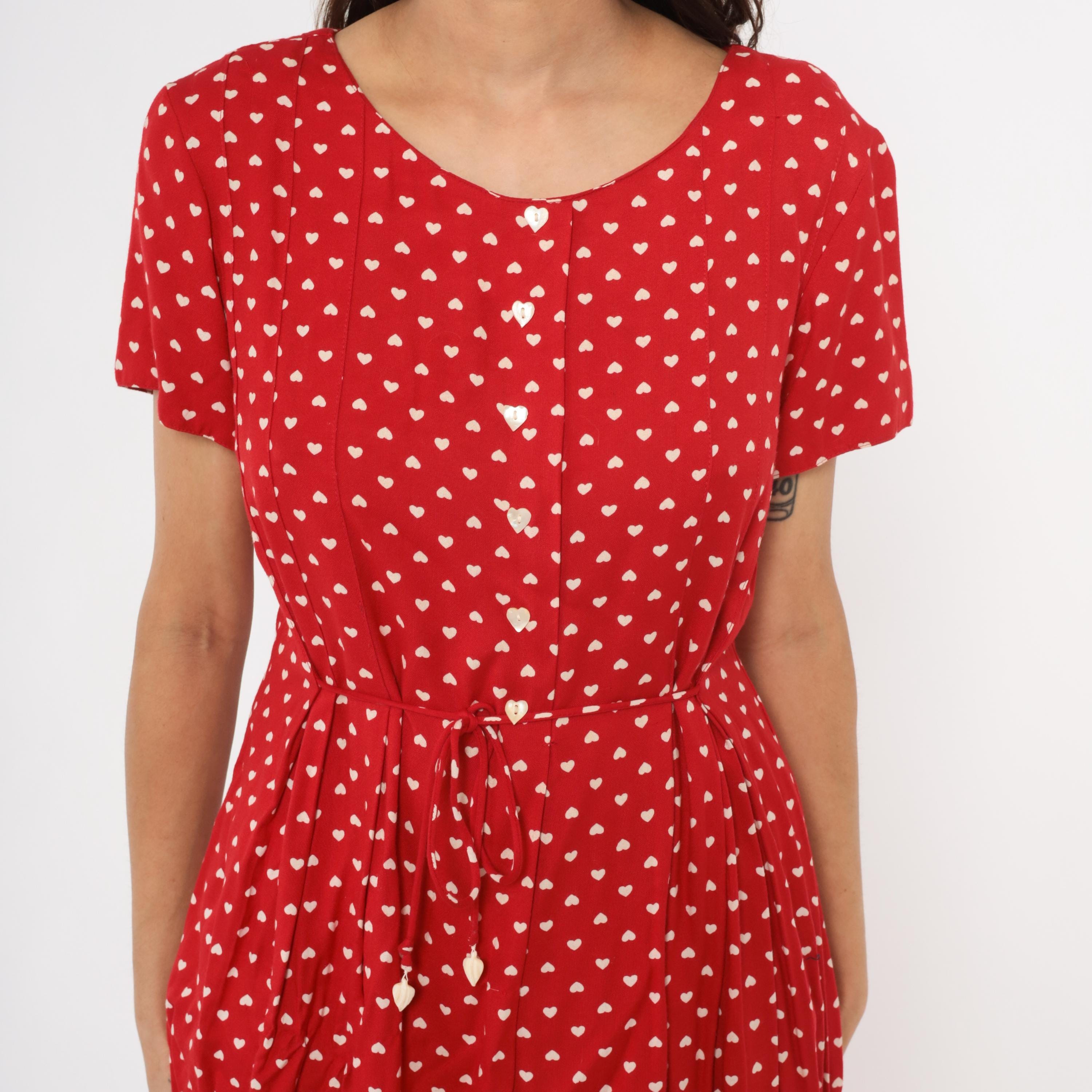 Red midi dress with an allover white heart print, scoop neckline, and short sleeves. Heart-shaped buttons run down the center front bodice, with a self-tie drawstring belt at the waist. Pleated skirt below the waistline with a back zipper closure.