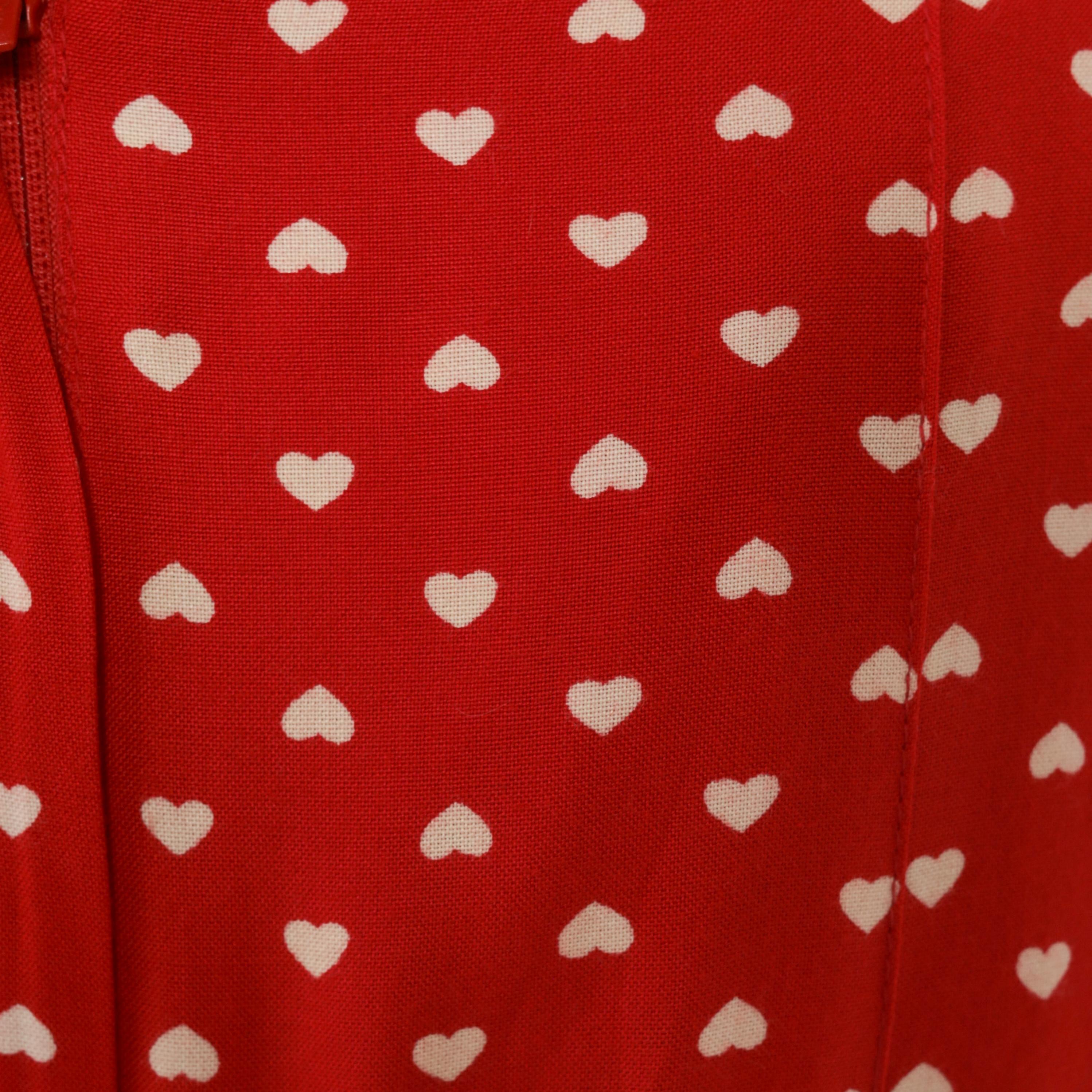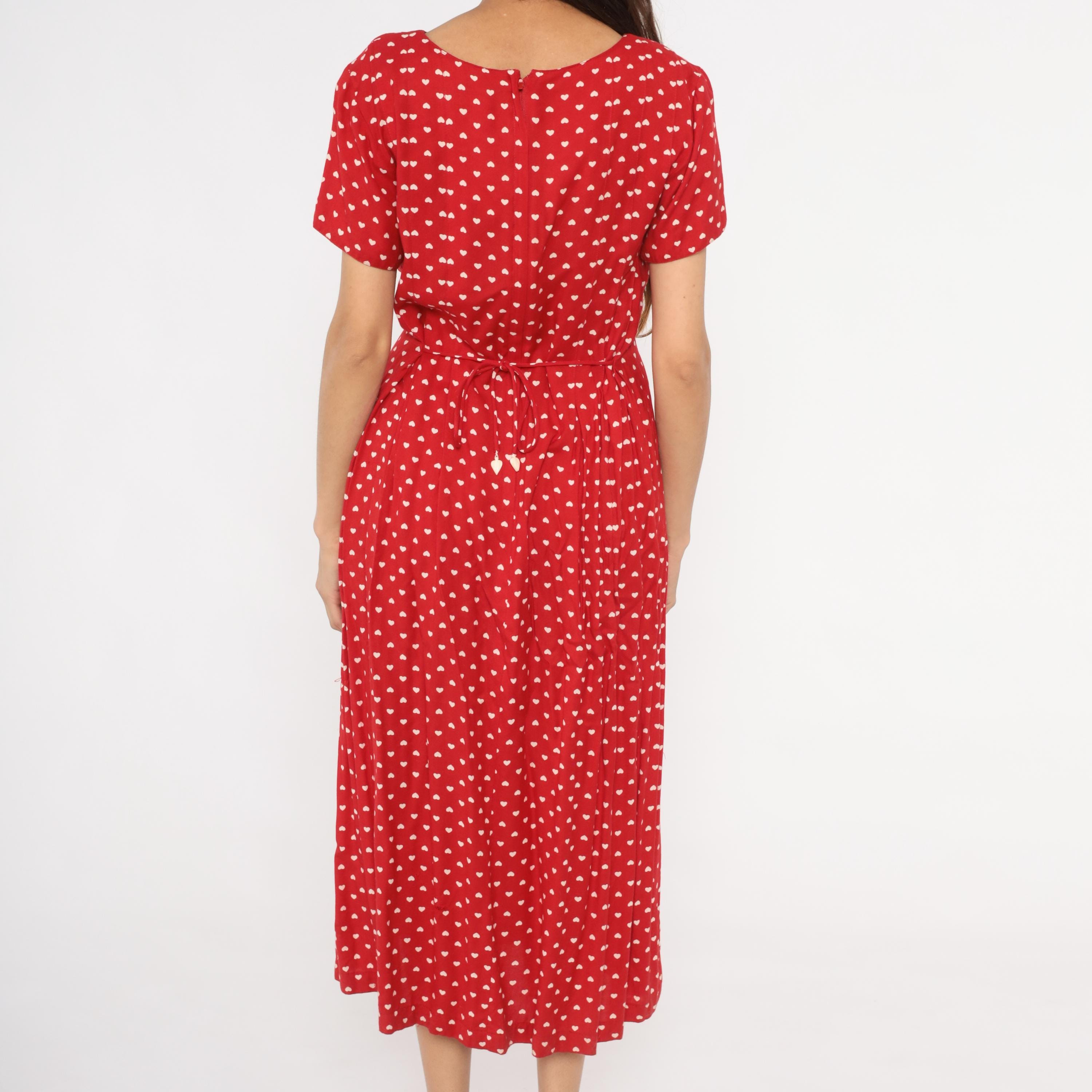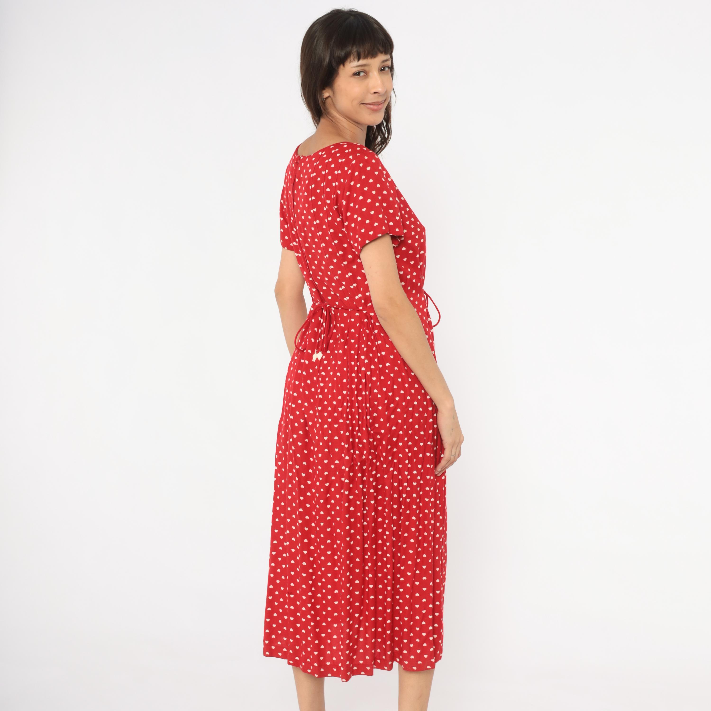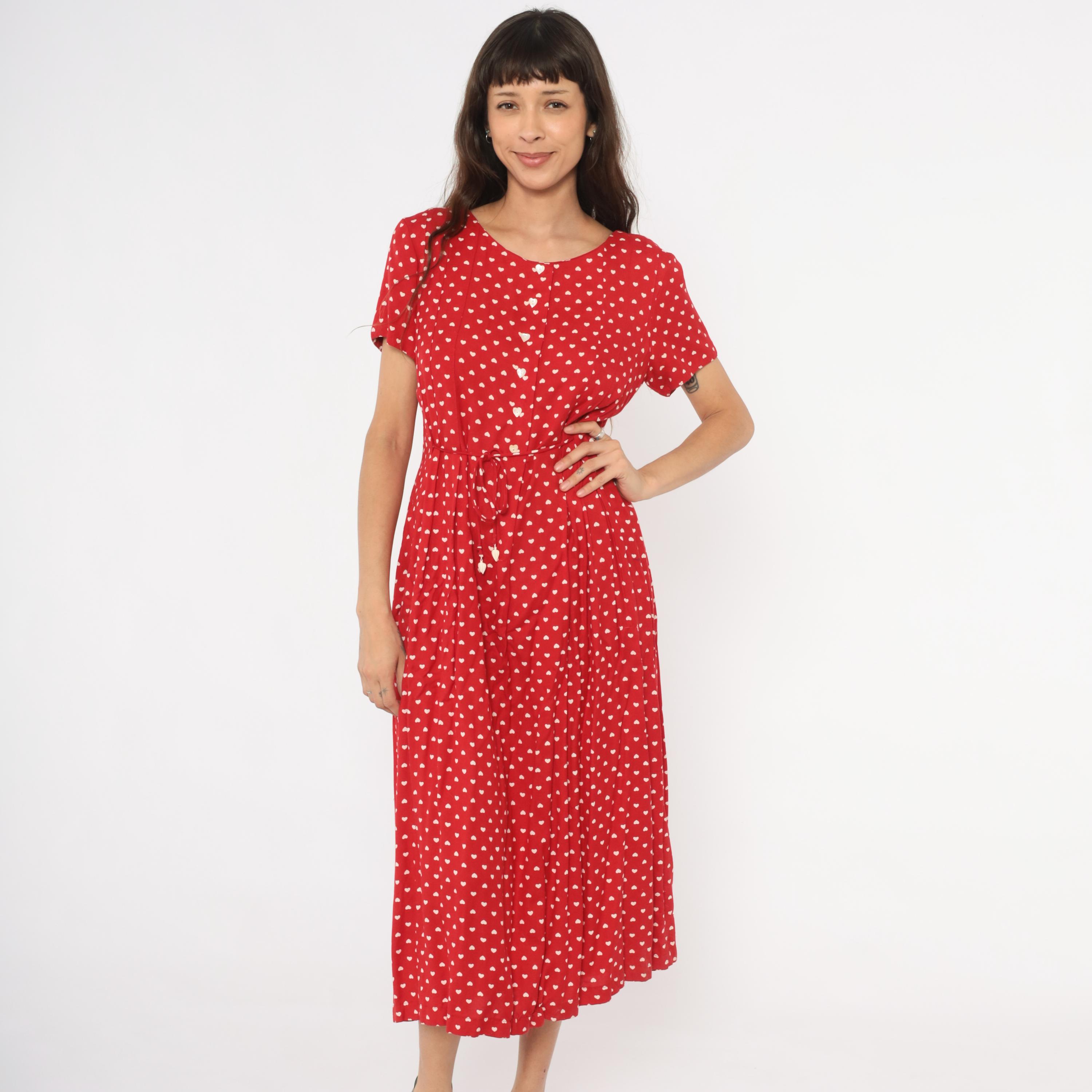 Red midi dress with an allover white heart print, scoop neckline, and short sleeves. Heart-shaped buttons run down the center front bodice, with a self-tie drawstring belt at the waist. Pleated skirt below the waistline with a back zipper closure.