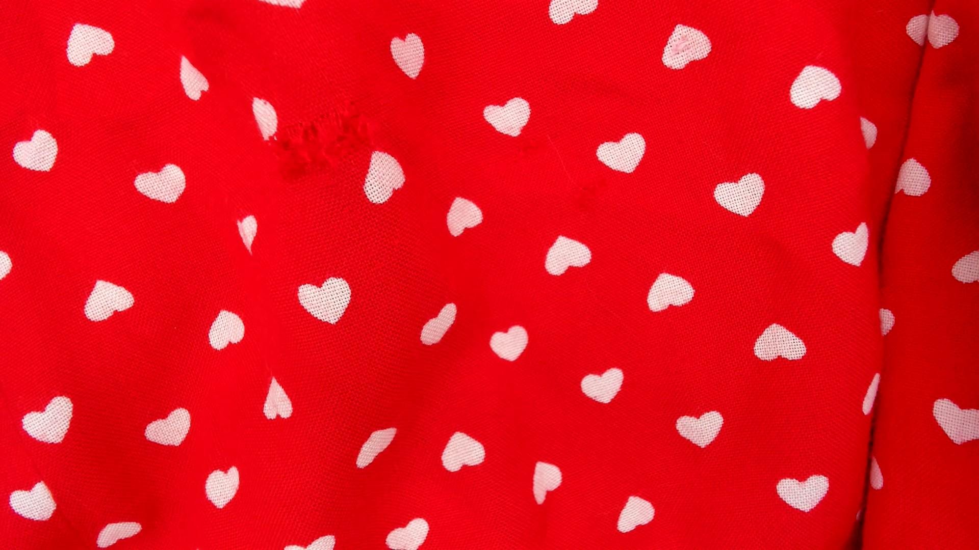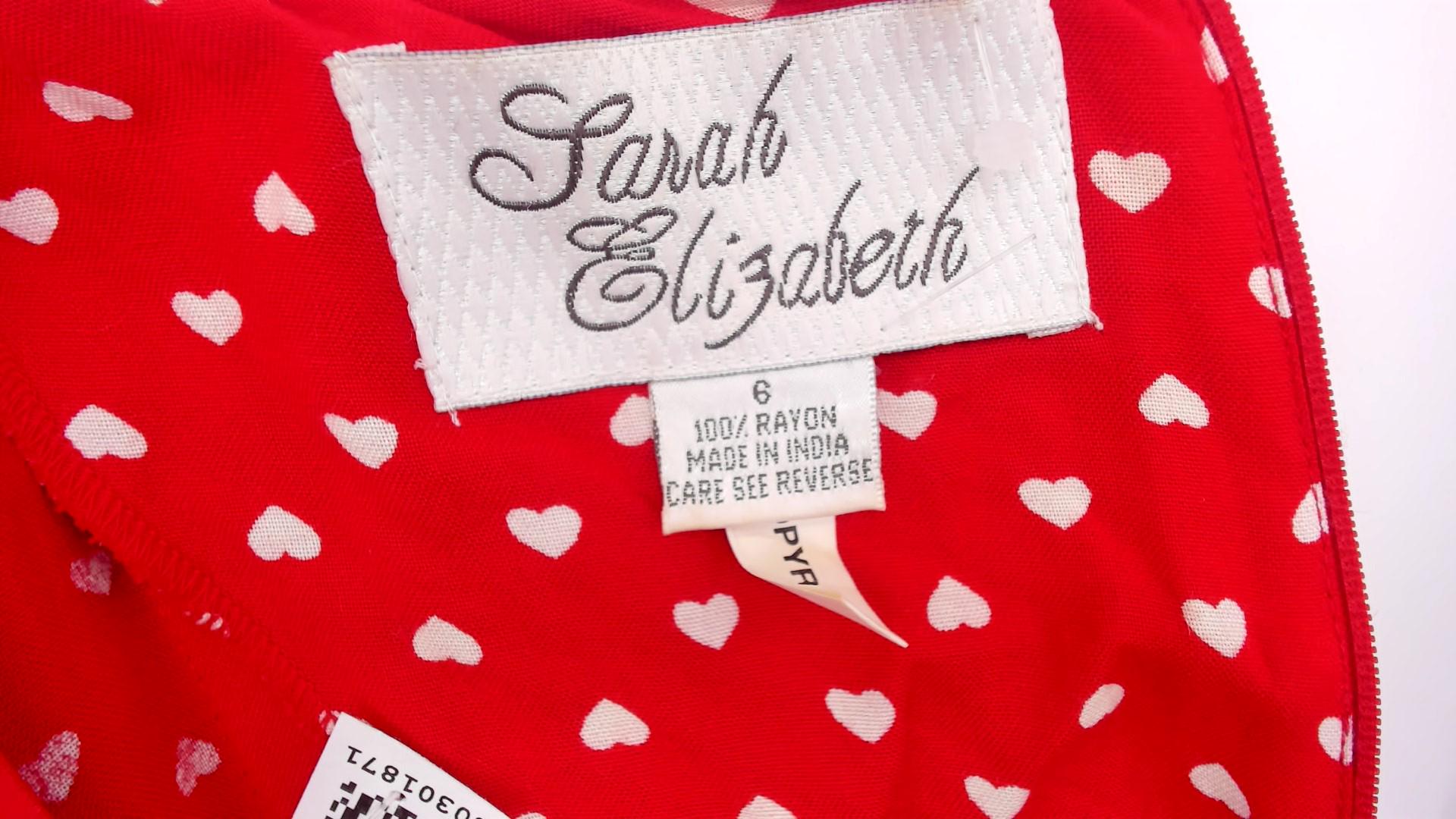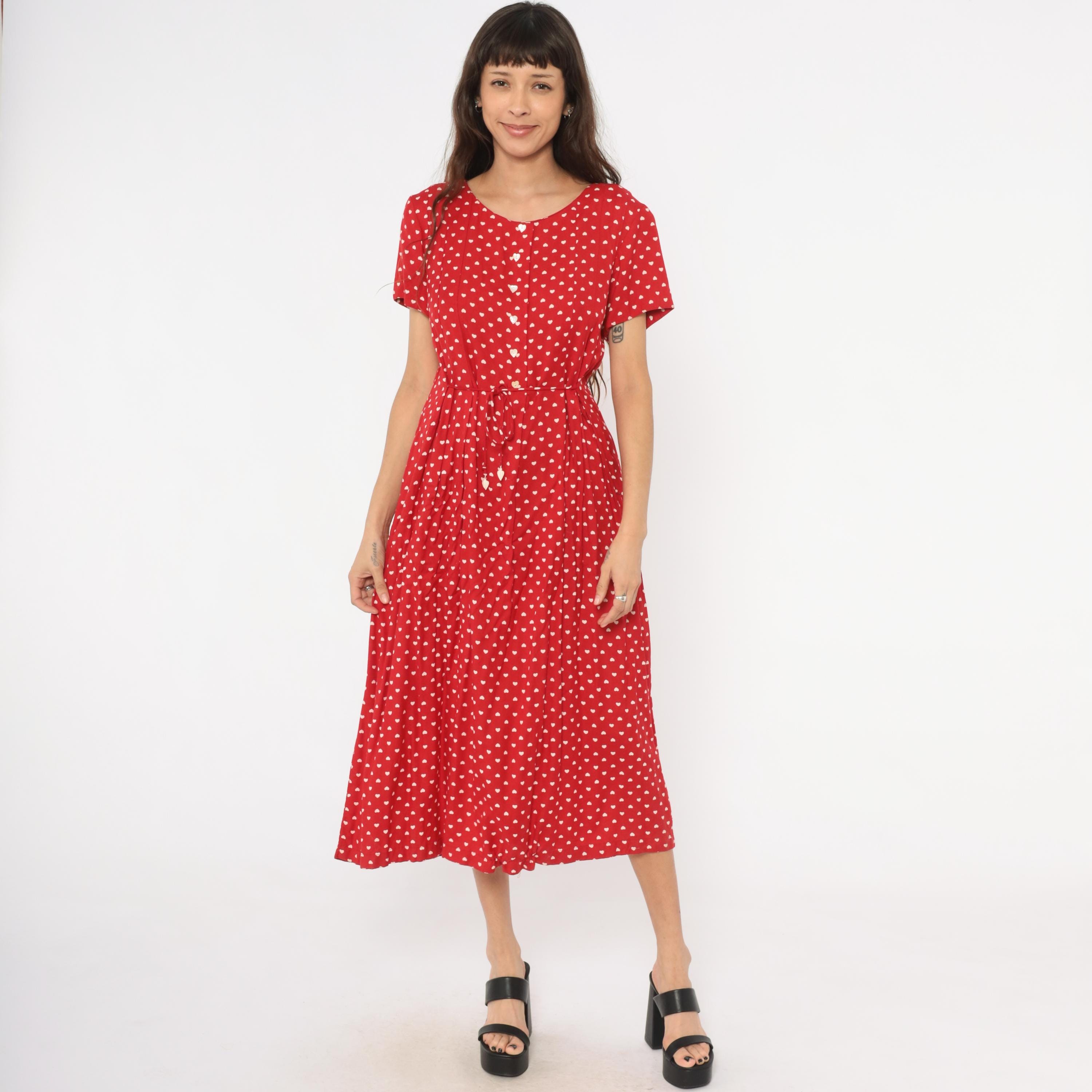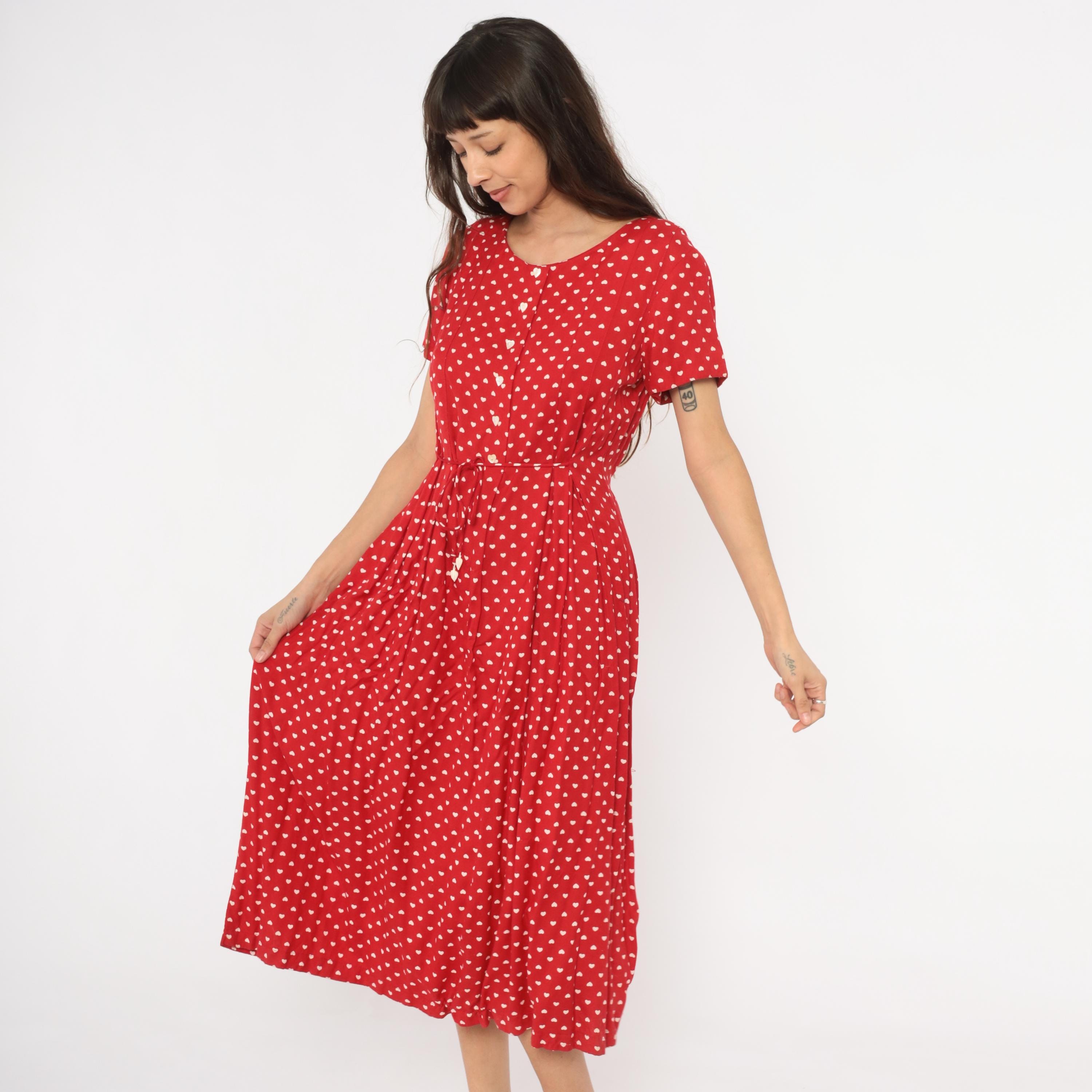 Red midi dress with an allover white heart print, scoop neckline, and short sleeves. Heart-shaped buttons run down the center front bodice, with a self-tie drawstring belt at the waist. Pleated skirt below the waistline with a back zipper closure.