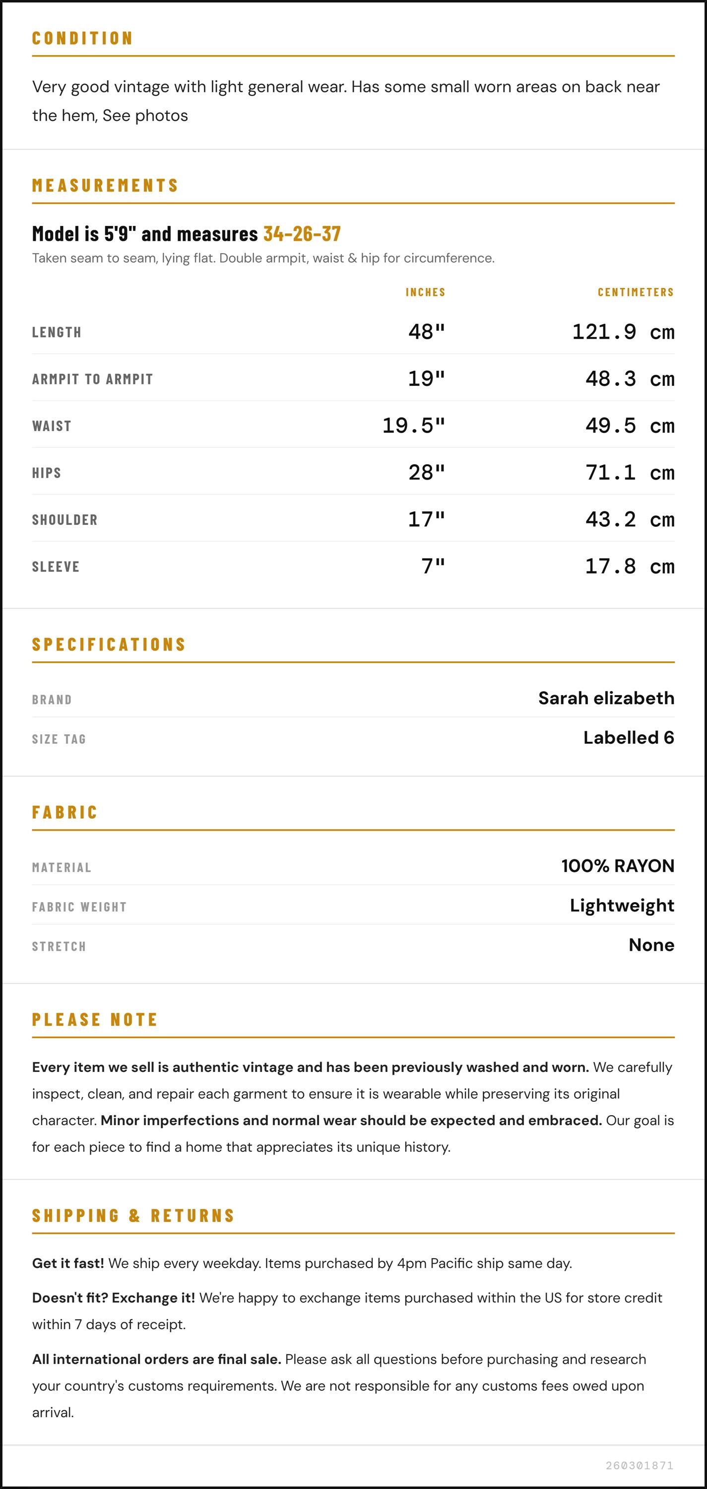 Condition: Very good vintage with light general wear. Has some small worn areas on back near the hem, See photos