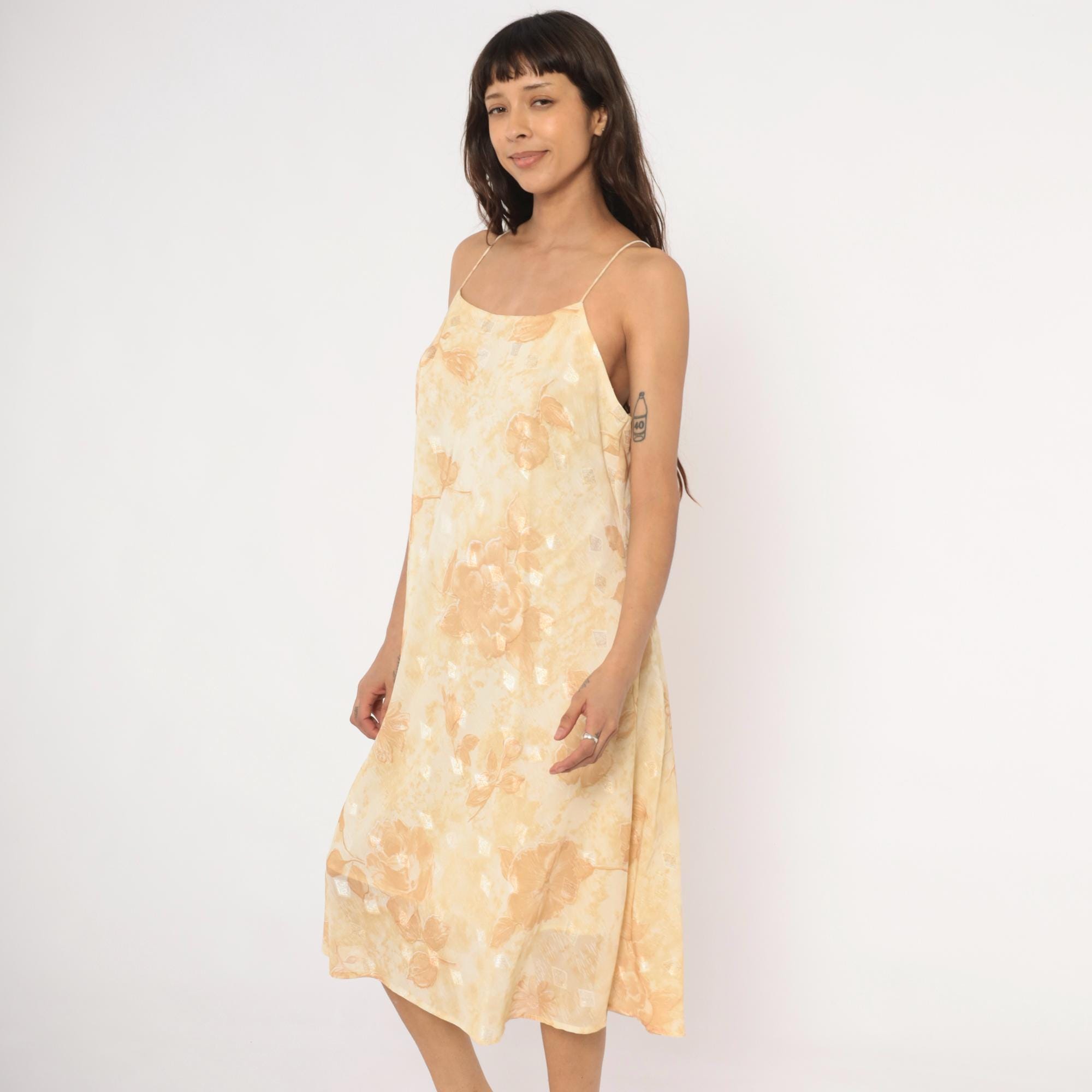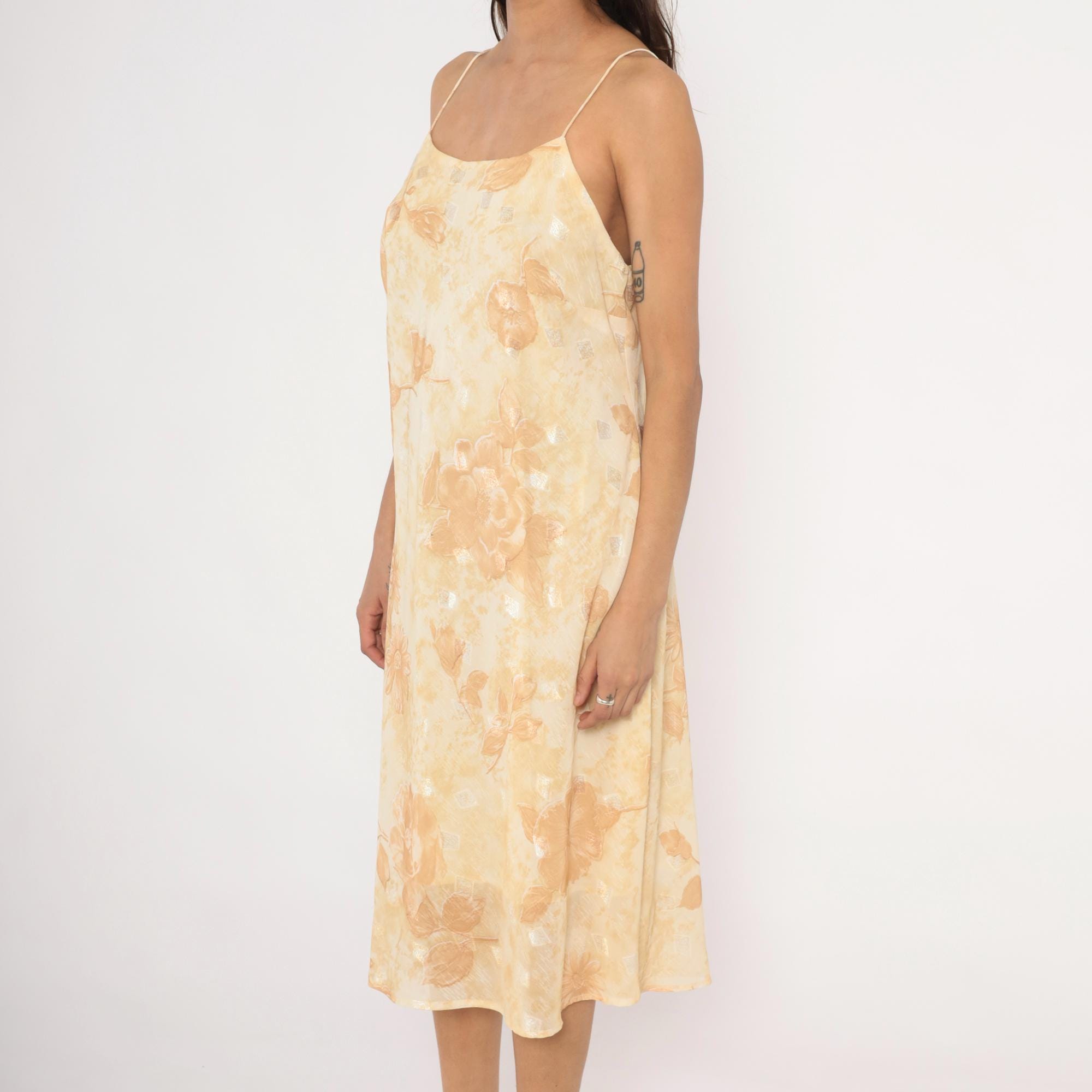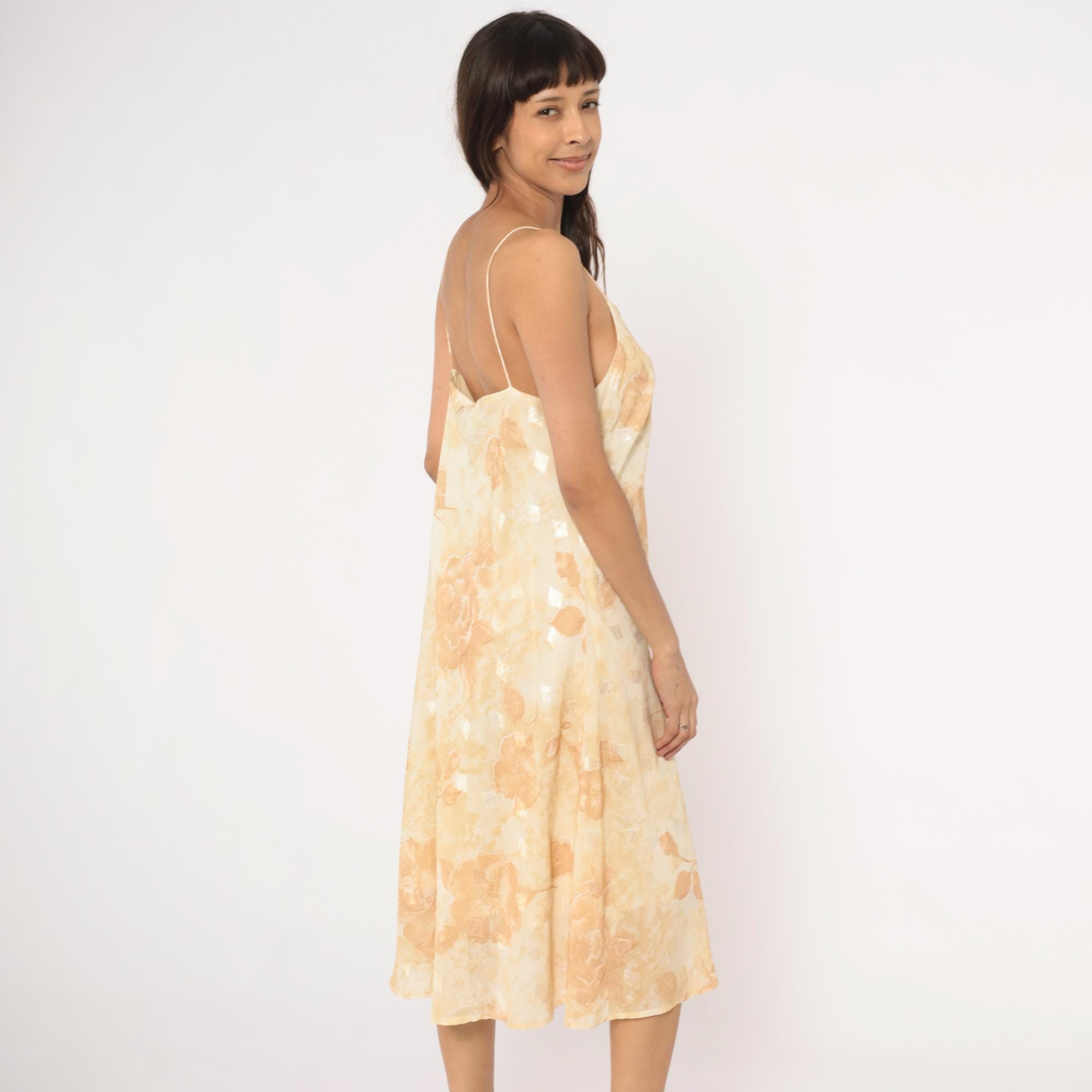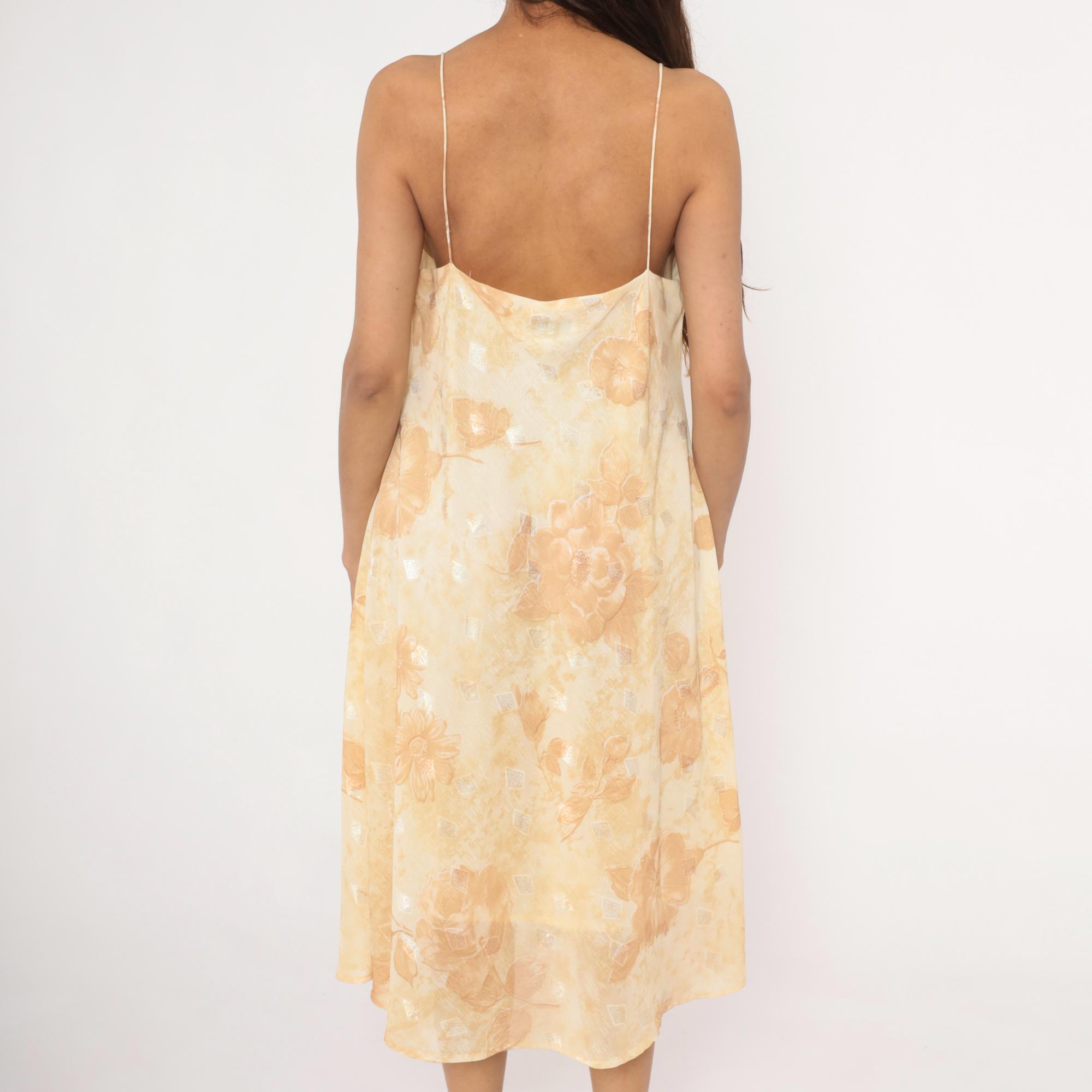 90s goldand cream slip dress with a tonal floral print of roses and daisies across the fabric. Spaghetti straps, straight neckline, and a low scoop back. A-line silhouette with a midi length hem, and subtle metallic silver accents scattered throughout the print.