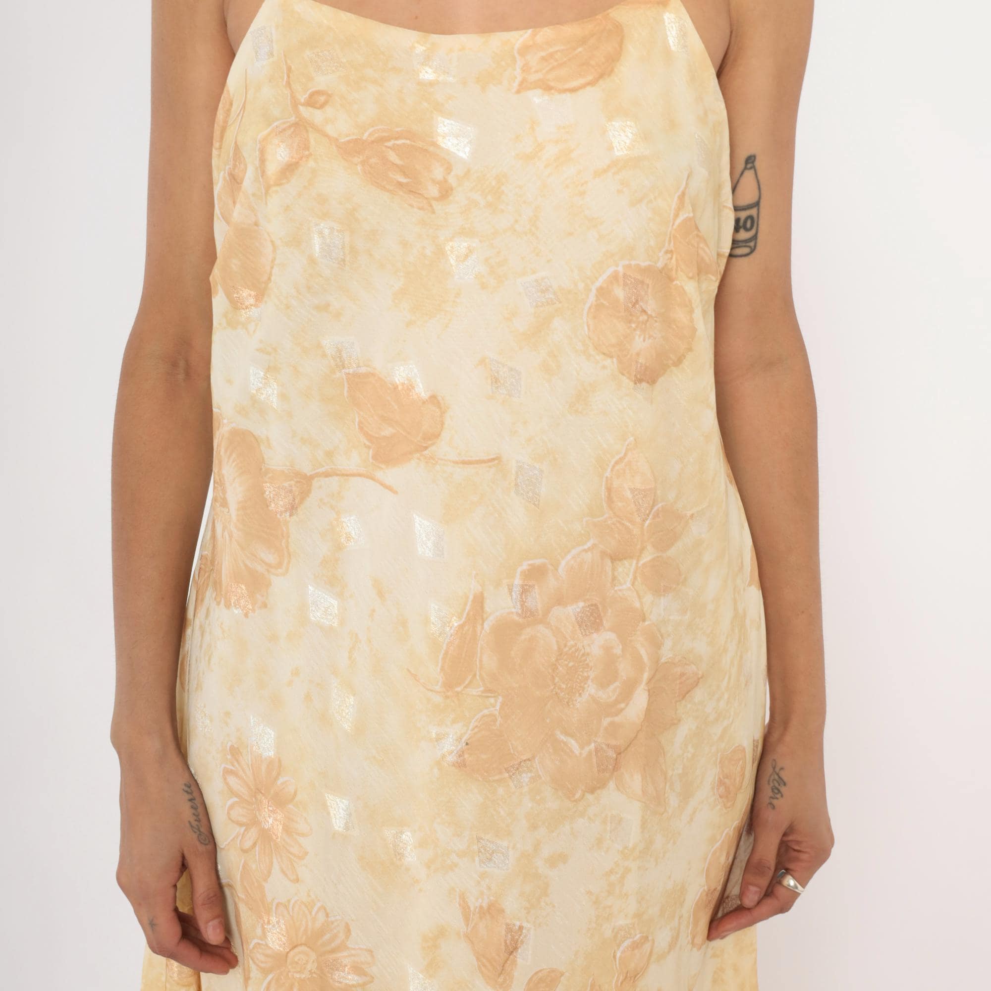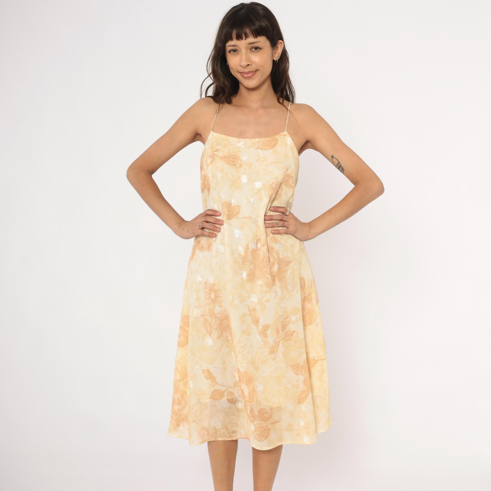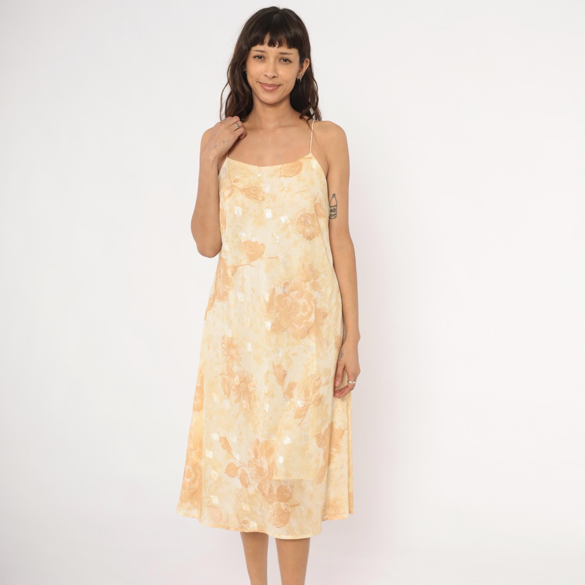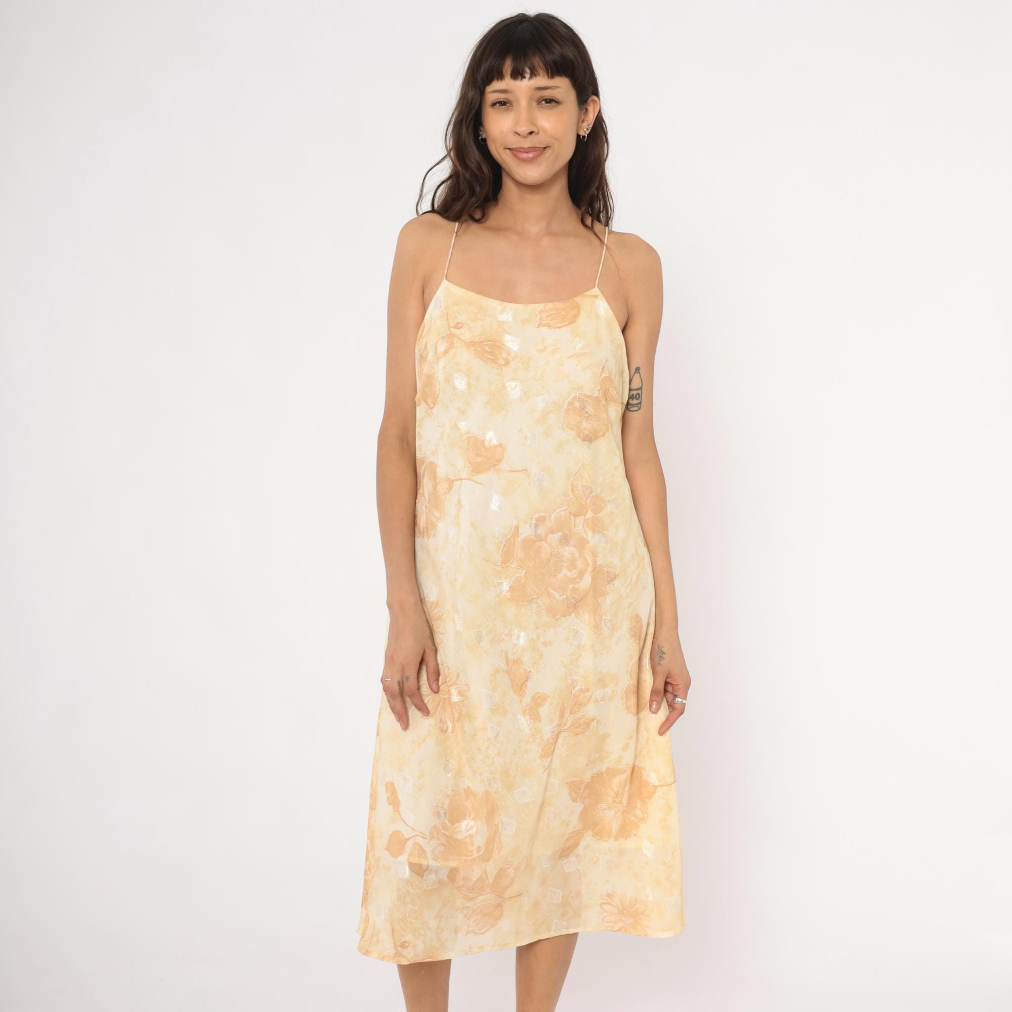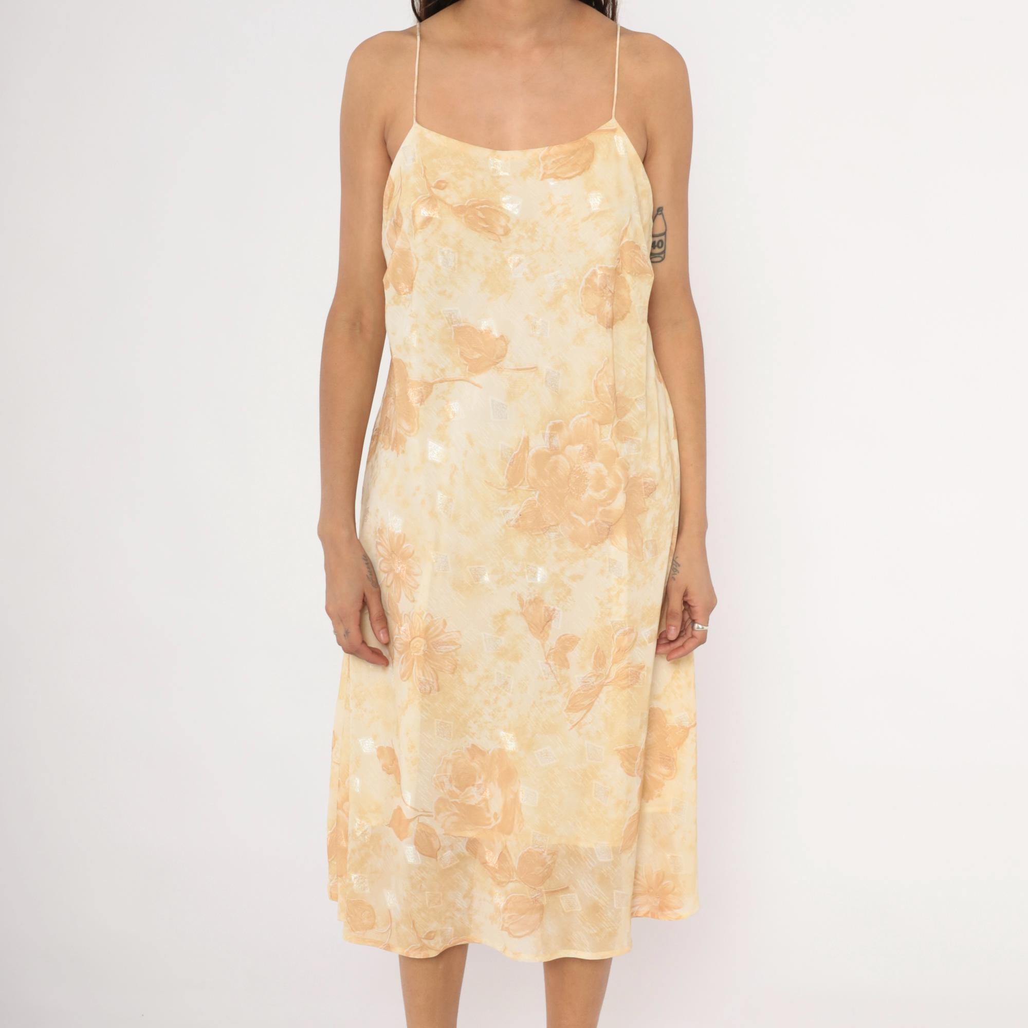 90s goldand cream slip dress with a tonal floral print of roses and daisies across the fabric. Spaghetti straps, straight neckline, and a low scoop back. A-line silhouette with a midi length hem, and subtle metallic silver accents scattered throughout the print.