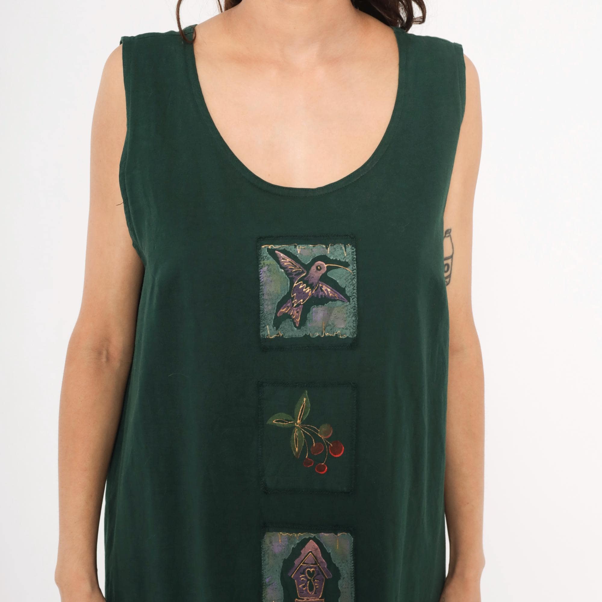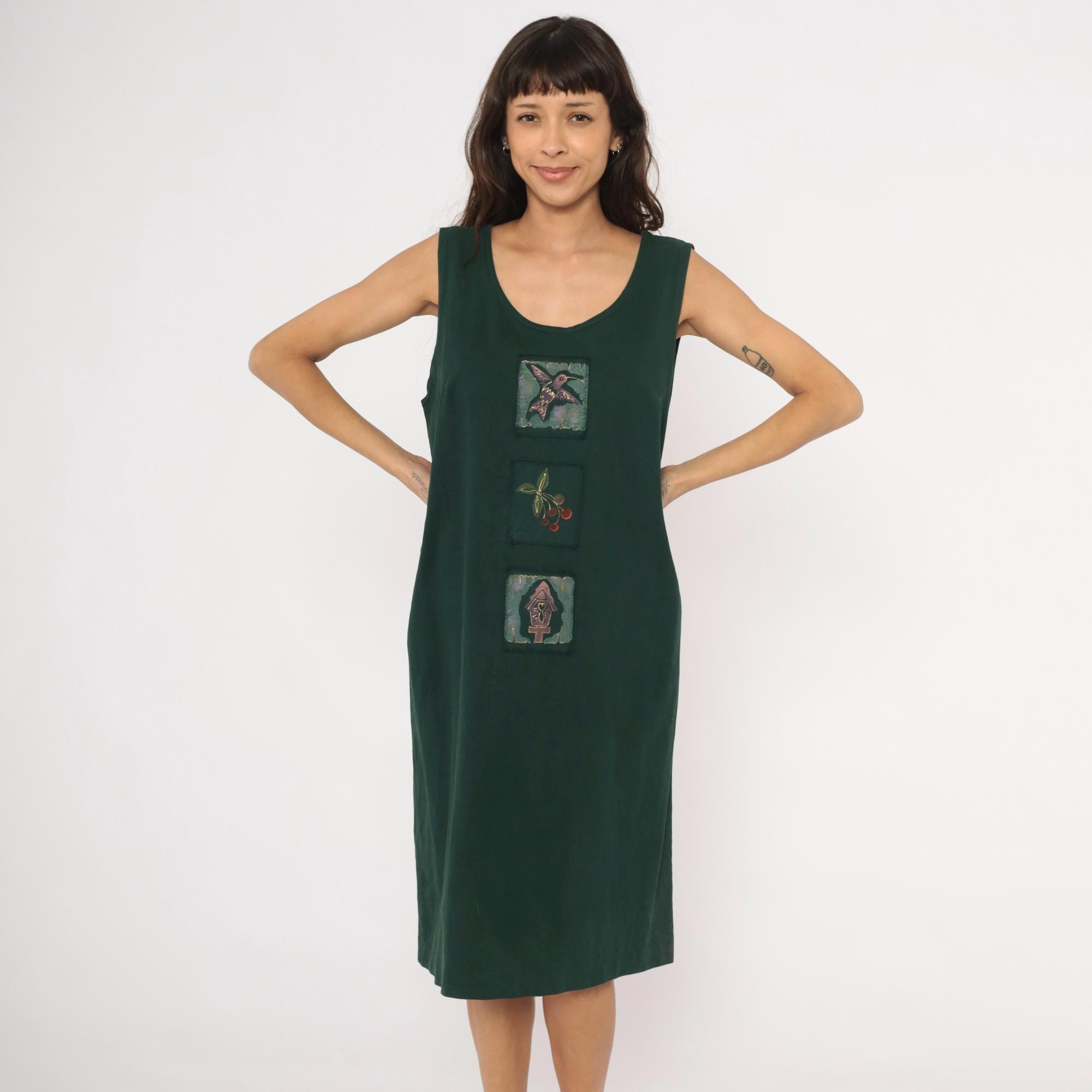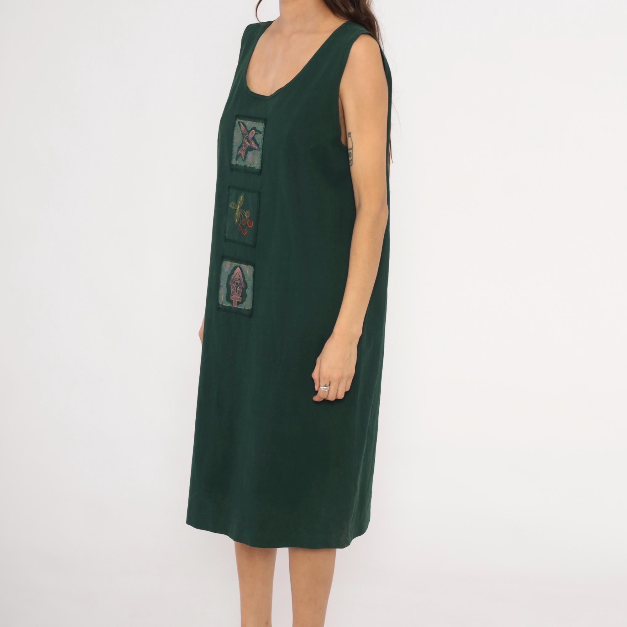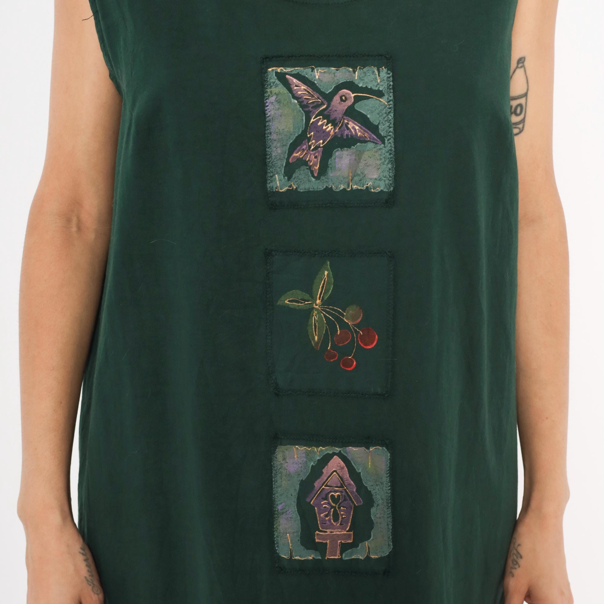 90s forest green sleeveless shift dress with three hand-painted square applique patches down the center front, depicting a hummingbird, a cherry branch, and a birdhouse. Scoop neckline, straight silhouette with a relaxed fit through the body, and knee-length hem.
