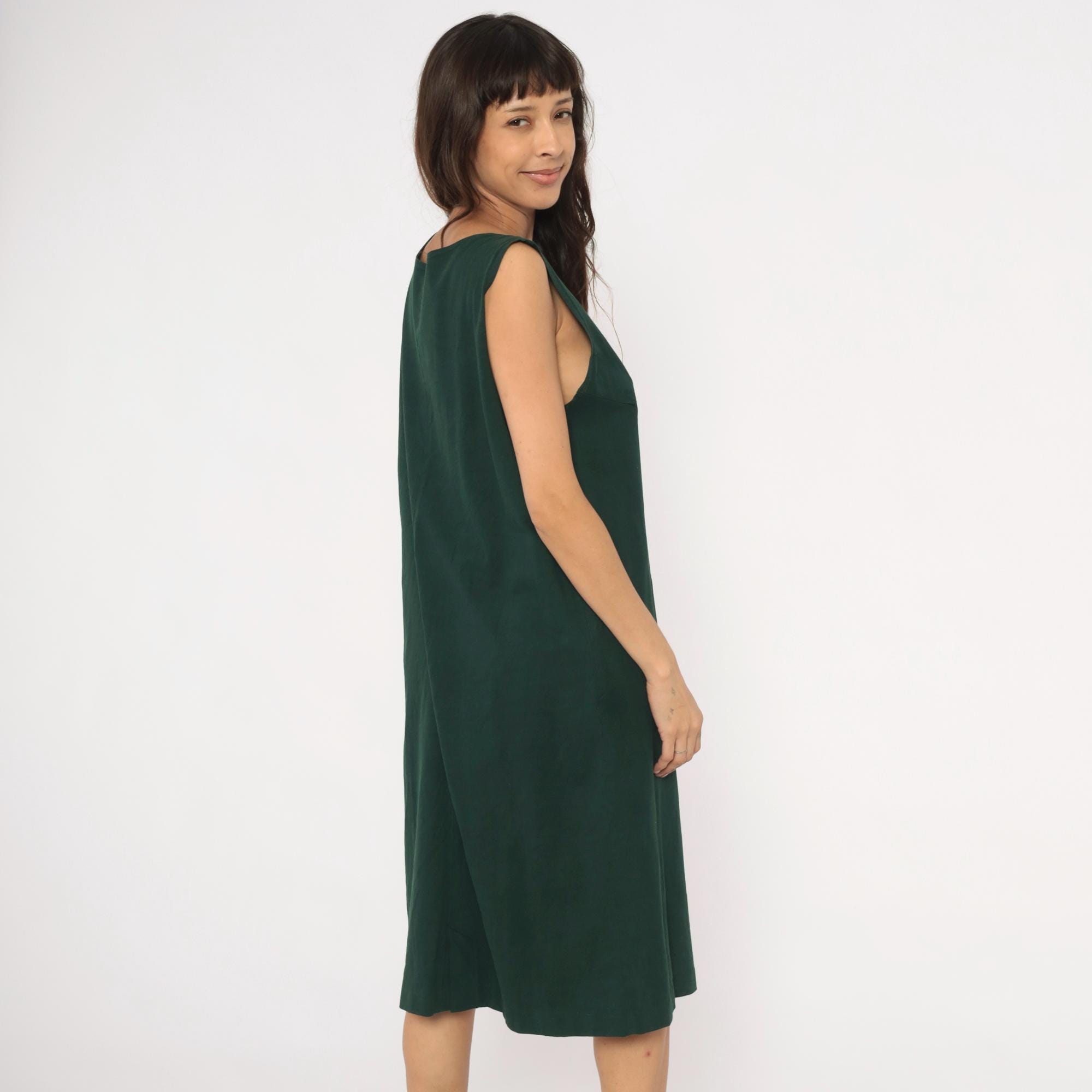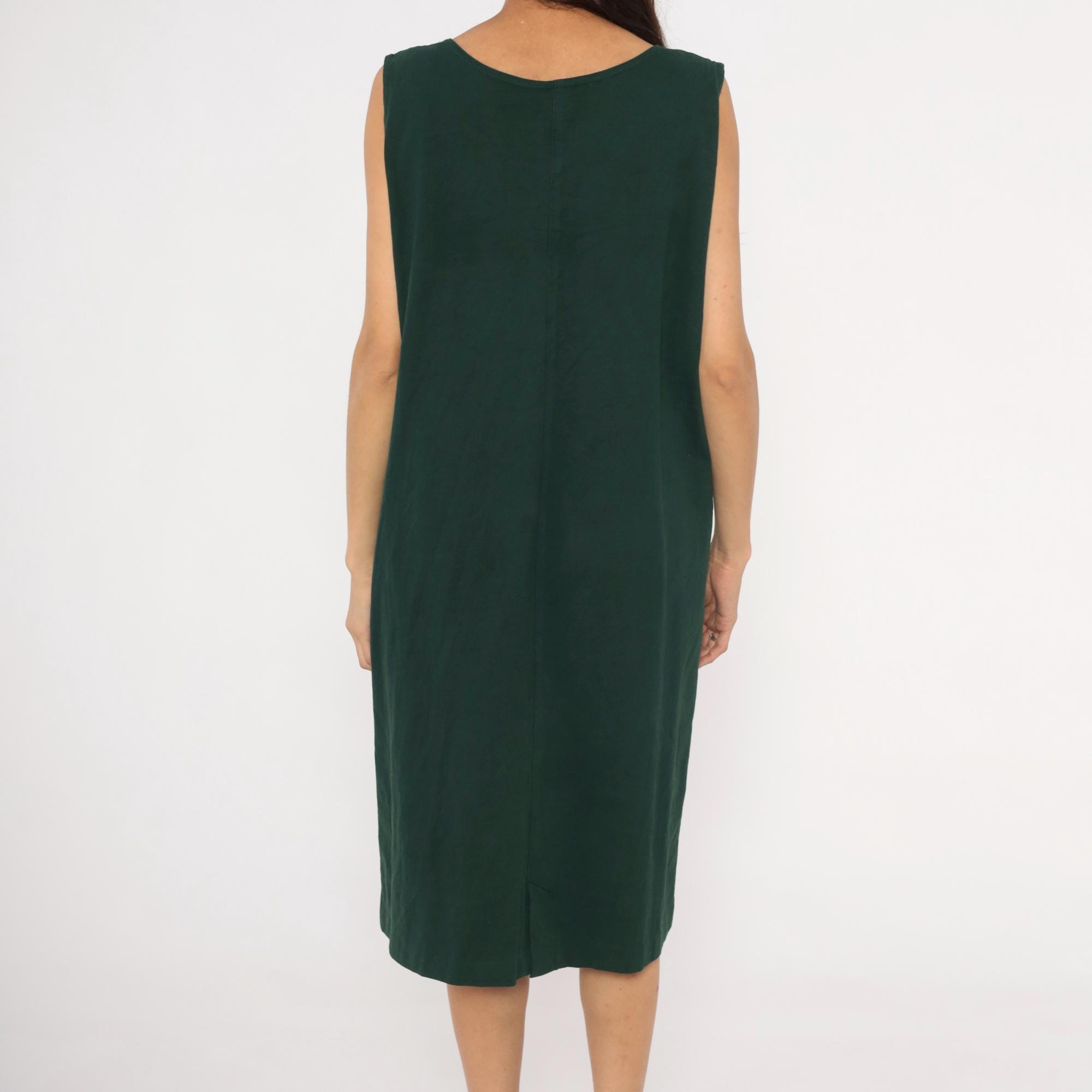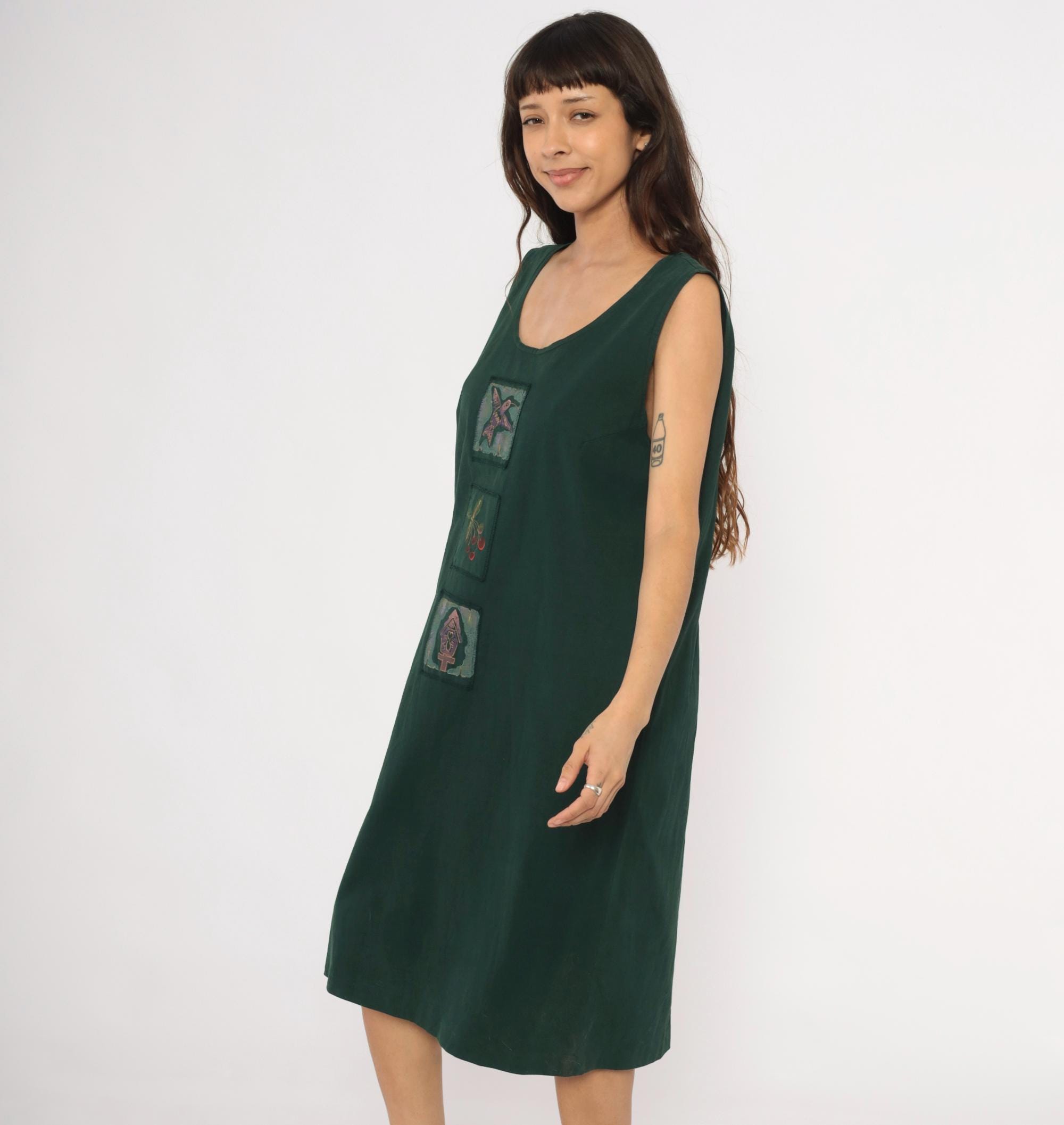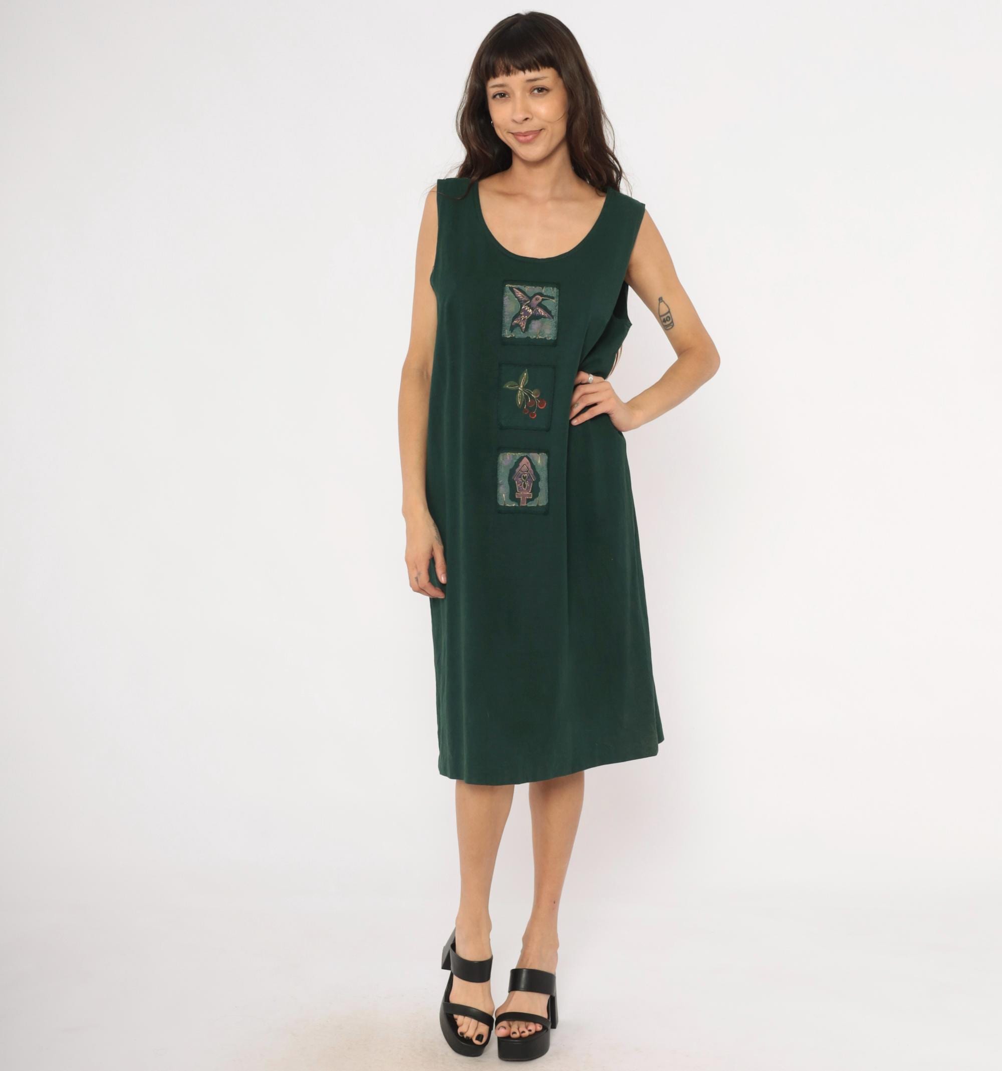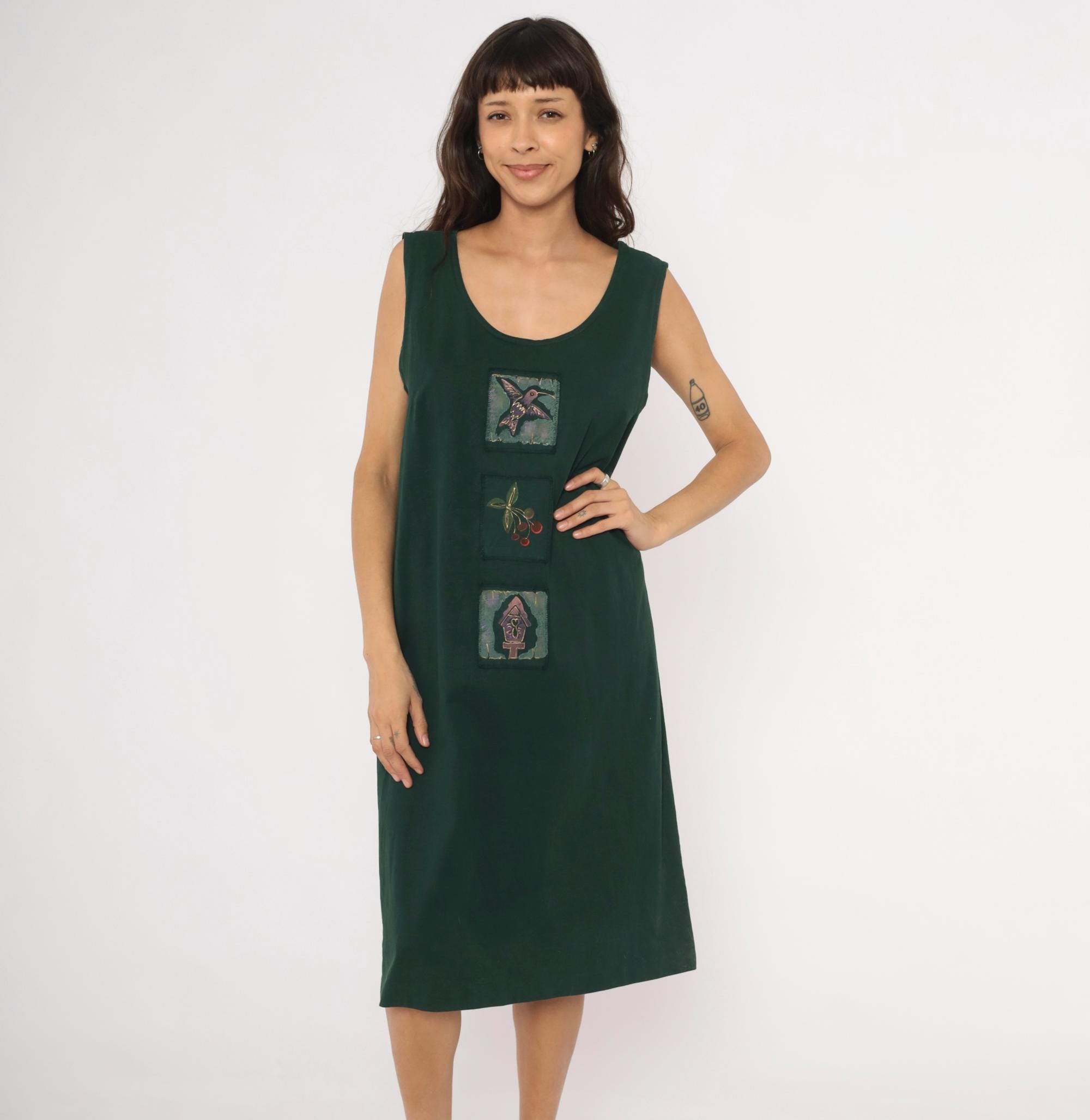 90s forest green sleeveless shift dress with three hand-painted square applique patches down the center front, depicting a hummingbird, a cherry branch, and a birdhouse. Scoop neckline, straight silhouette with a relaxed fit through the body, and knee-length hem.