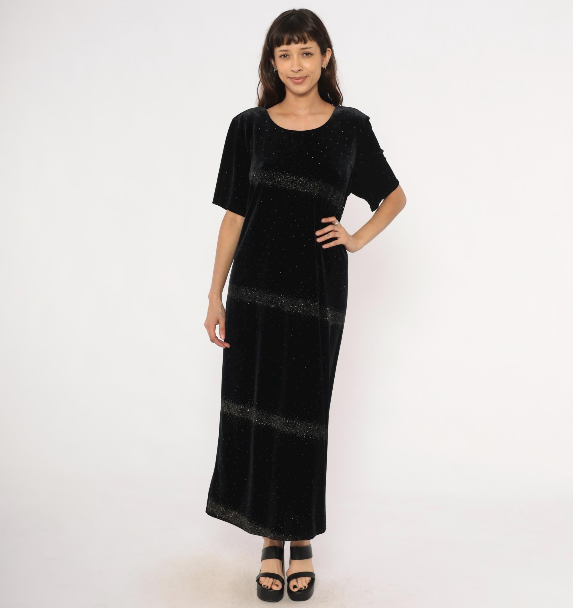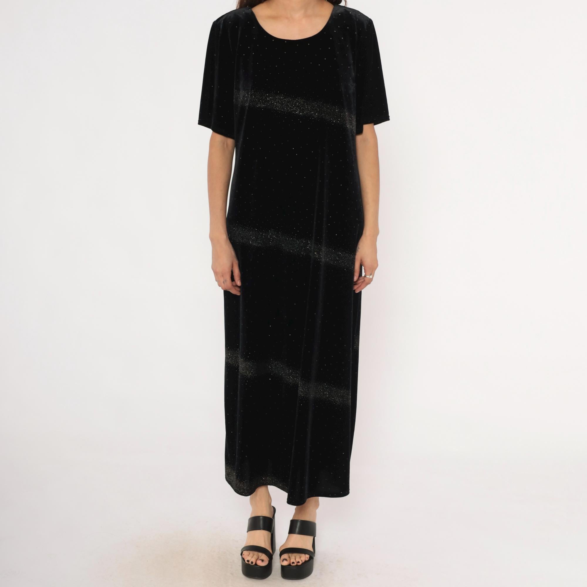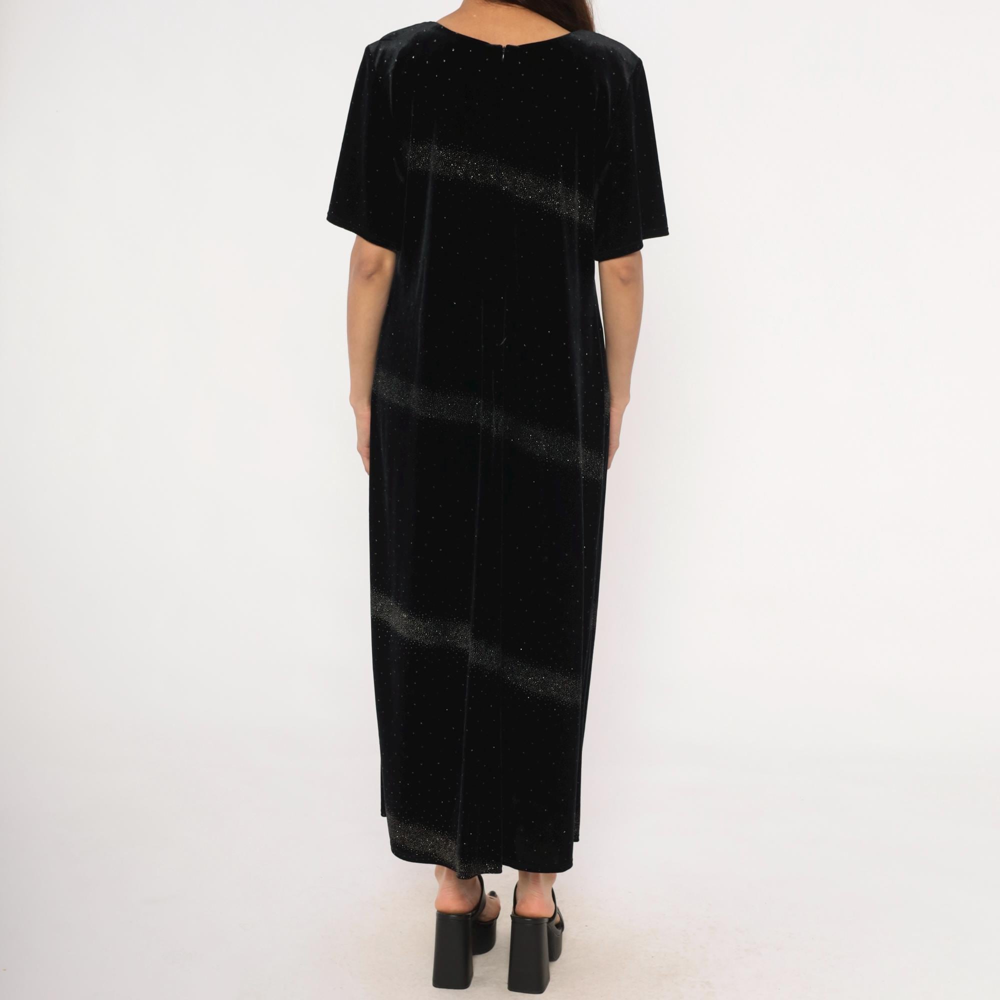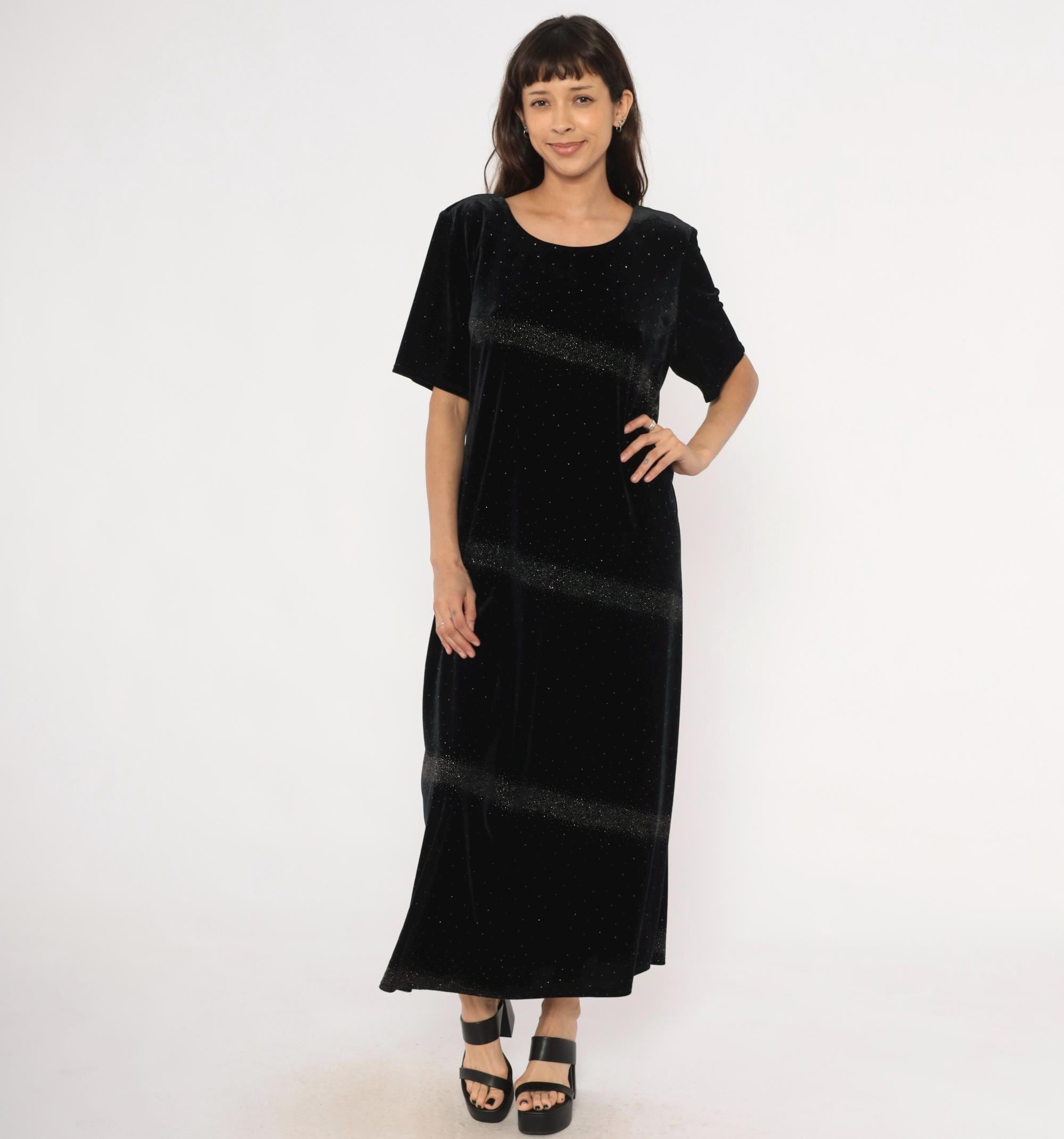 Black velvet maxi dress with allover glitter speckle detail across the fabric, creating a night-sky appearance. Scoop neckline, short sleeves, and a straight column silhouette falling to ankle length. Back zipper closure. The glitter particles are embedded throughout the velvet in varying densities, with denser clusters appearing in horizontal bands across the body.