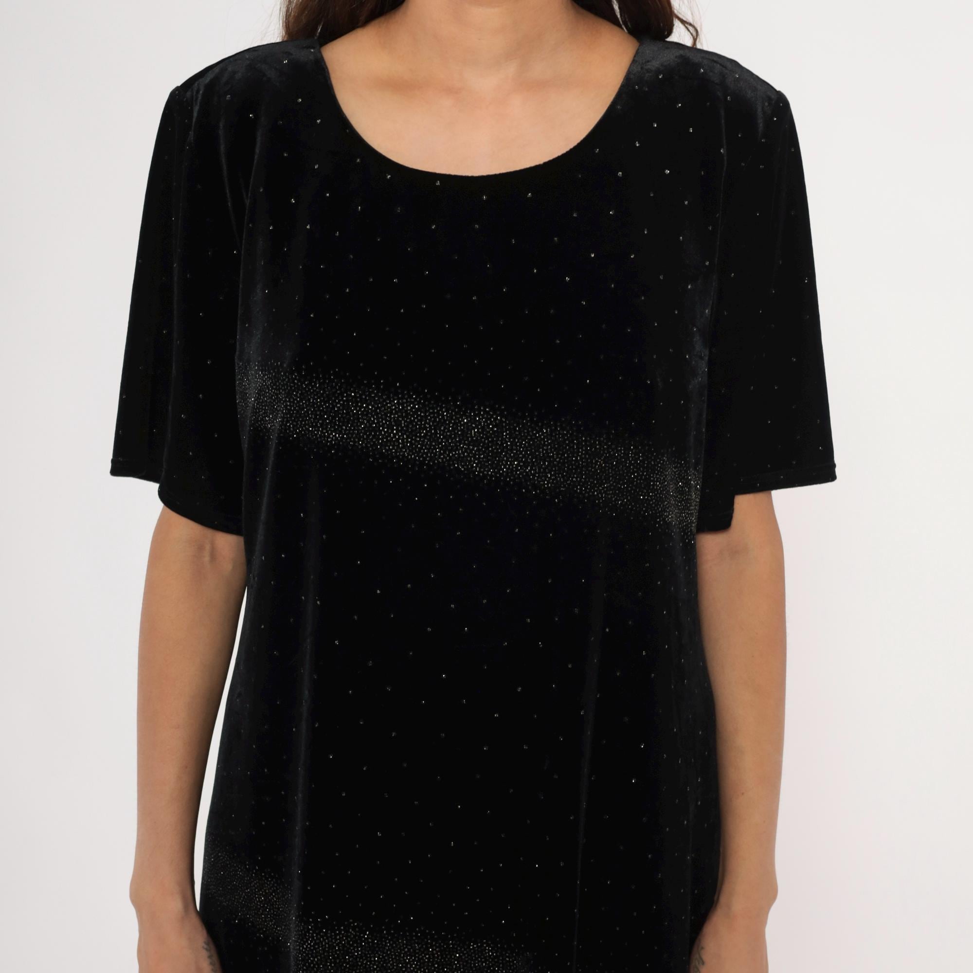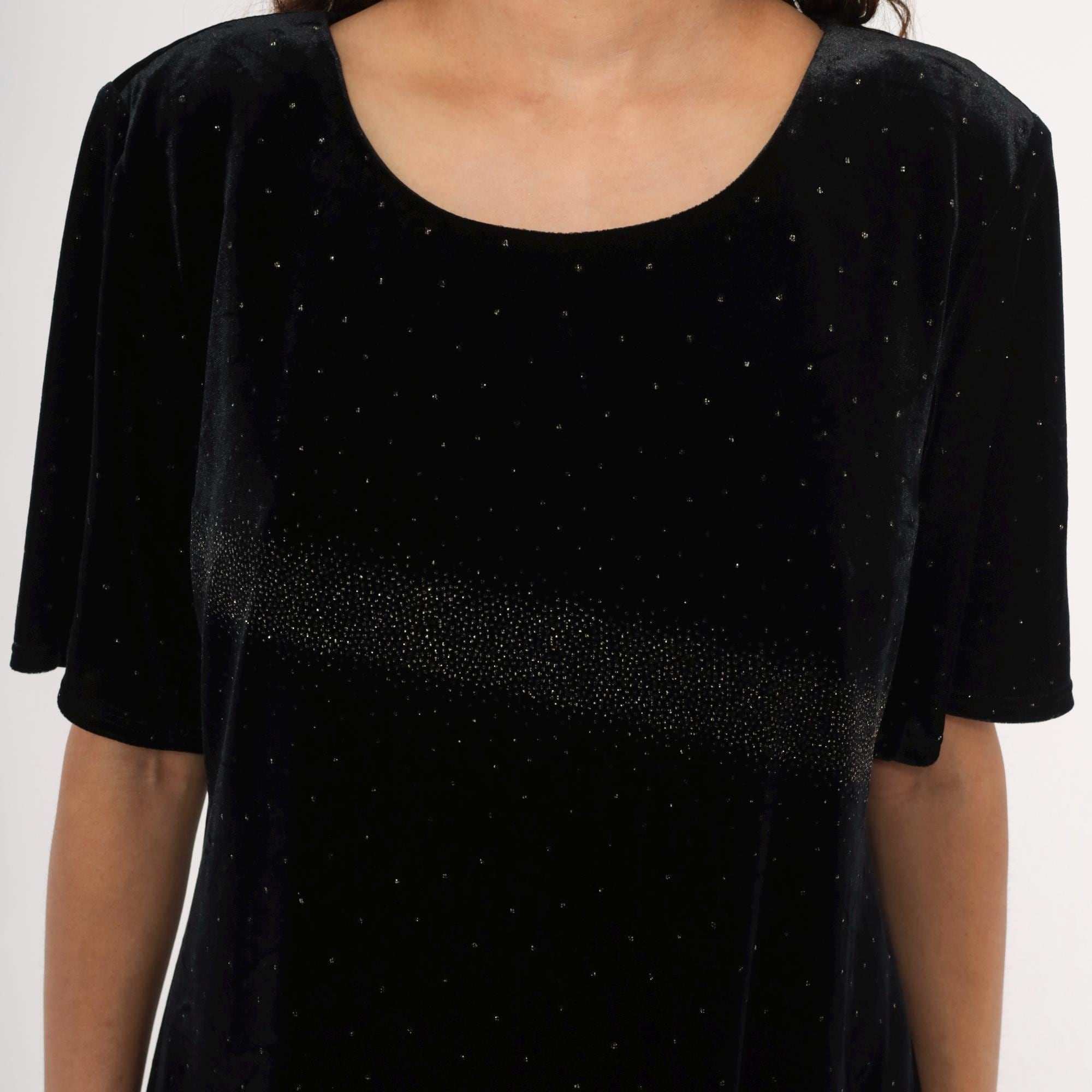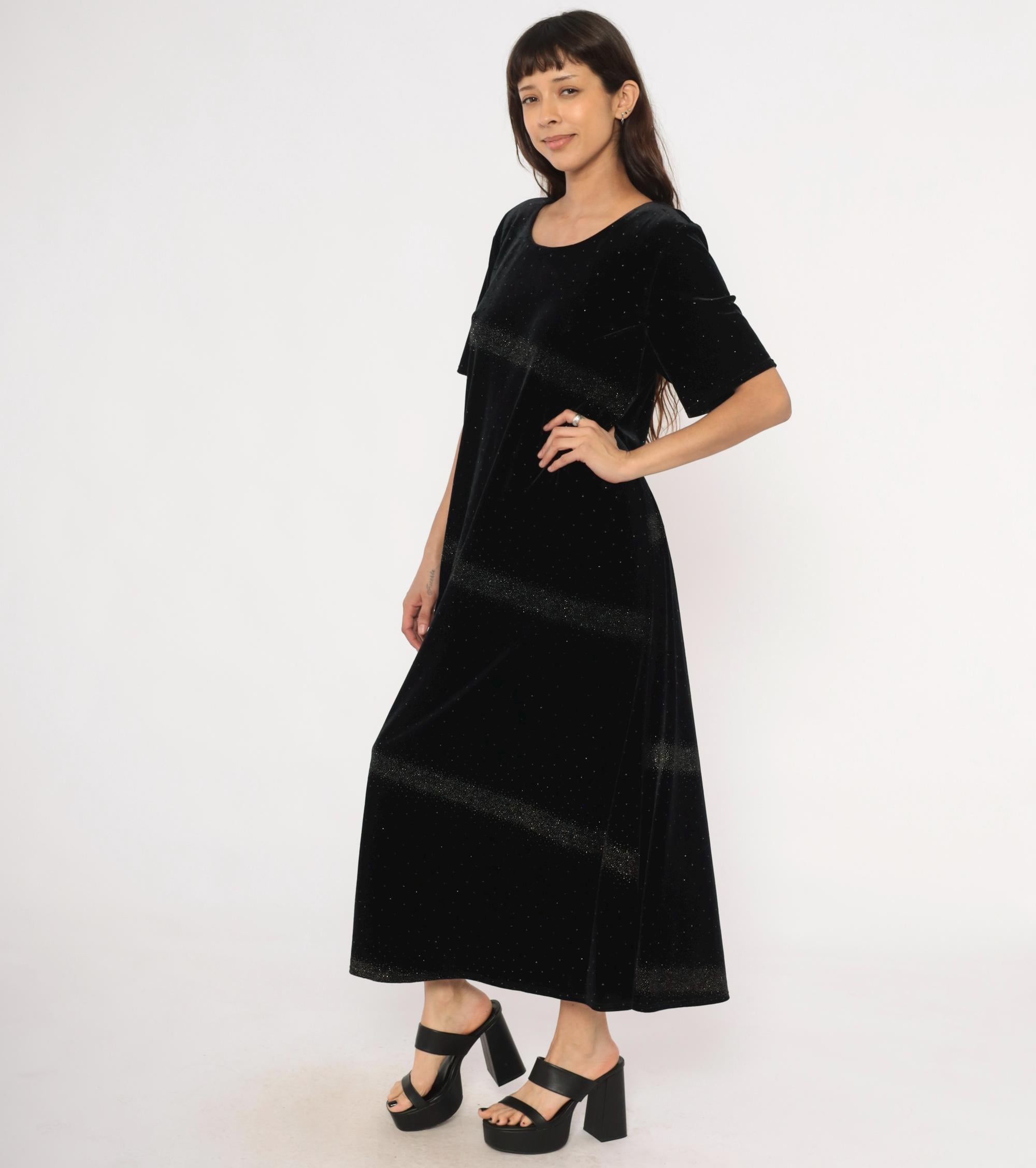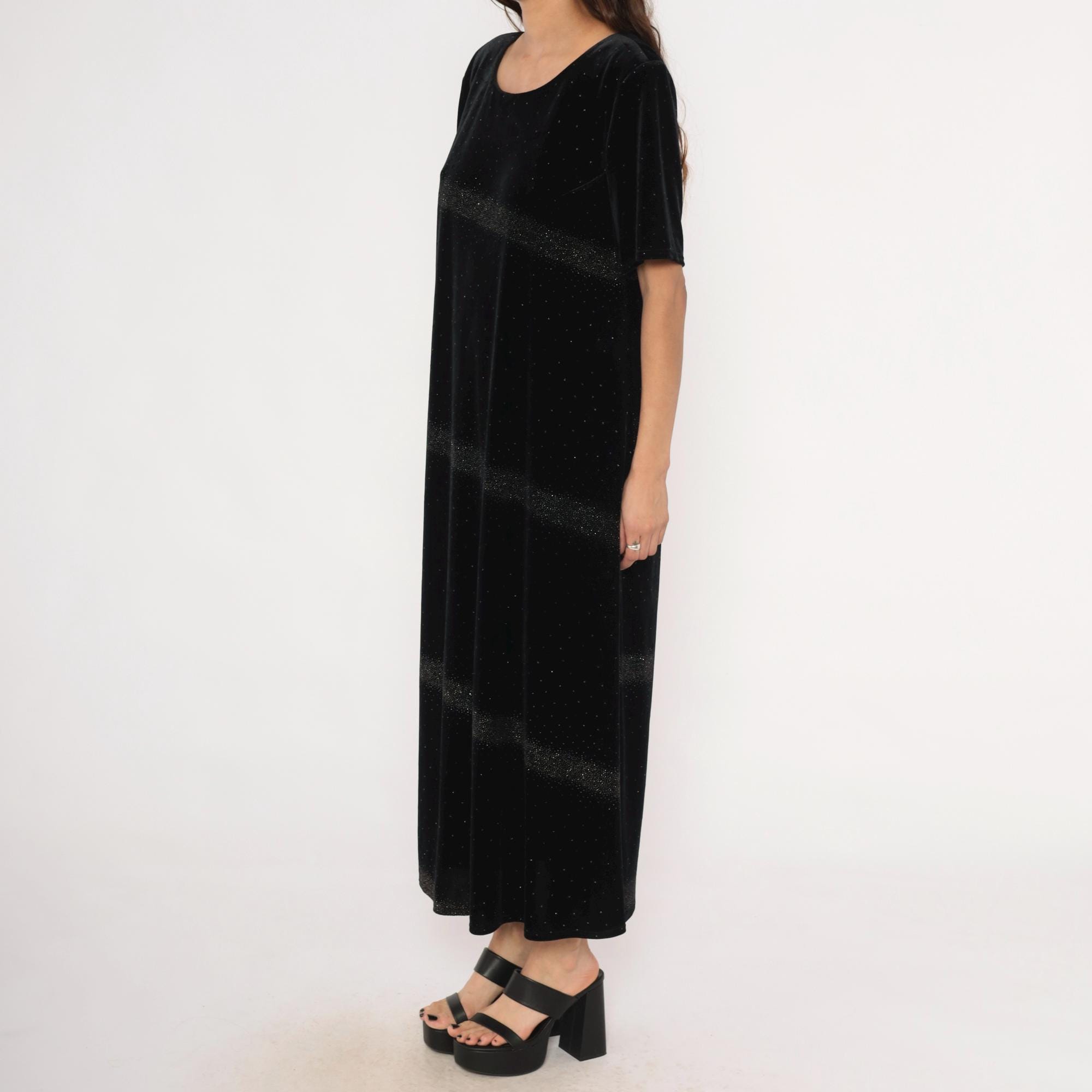 Black velvet maxi dress with allover glitter speckle detail across the fabric, creating a night-sky appearance. Scoop neckline, short sleeves, and a straight column silhouette falling to ankle length. Back zipper closure. The glitter particles are embedded throughout the velvet in varying densities, with denser clusters appearing in horizontal bands across the body.