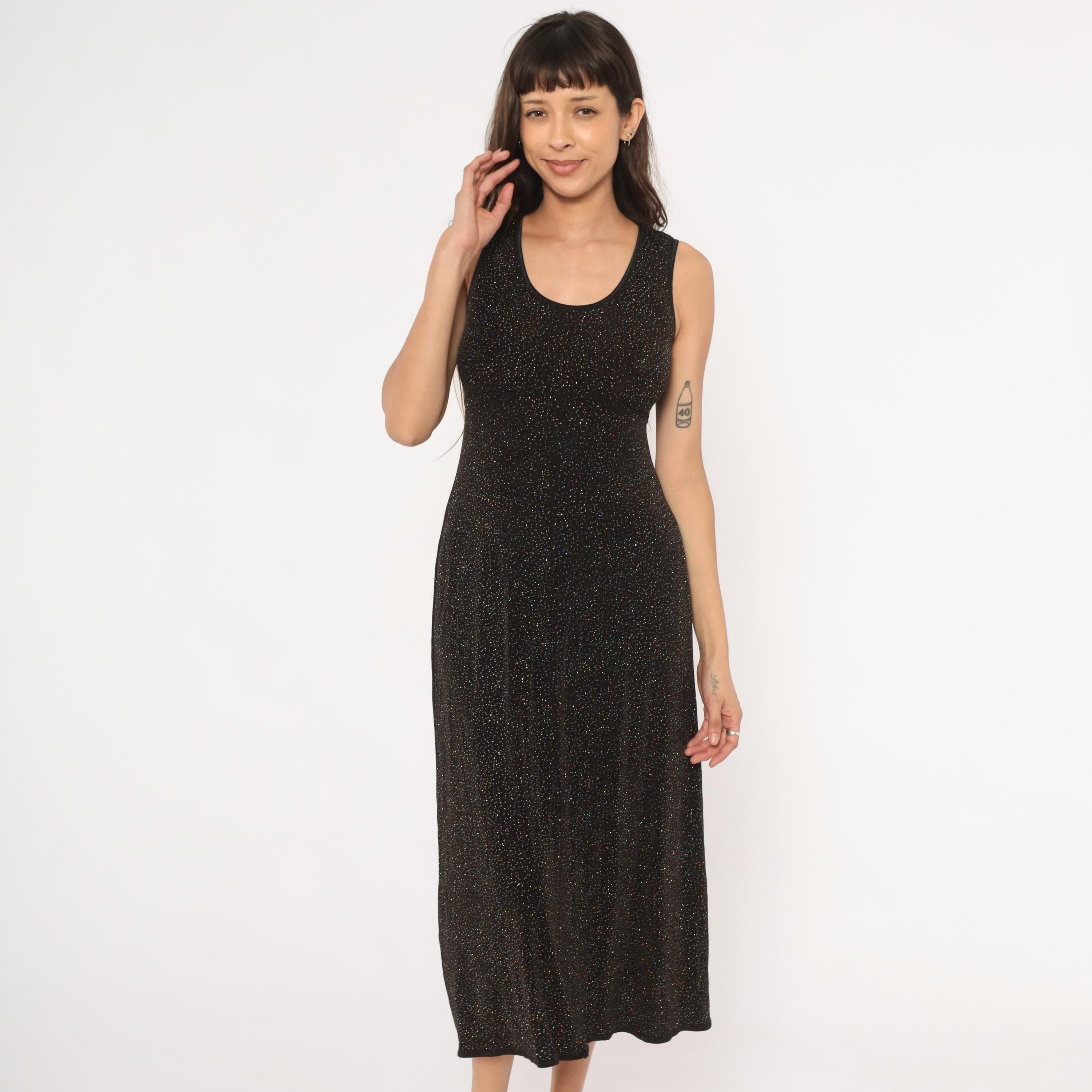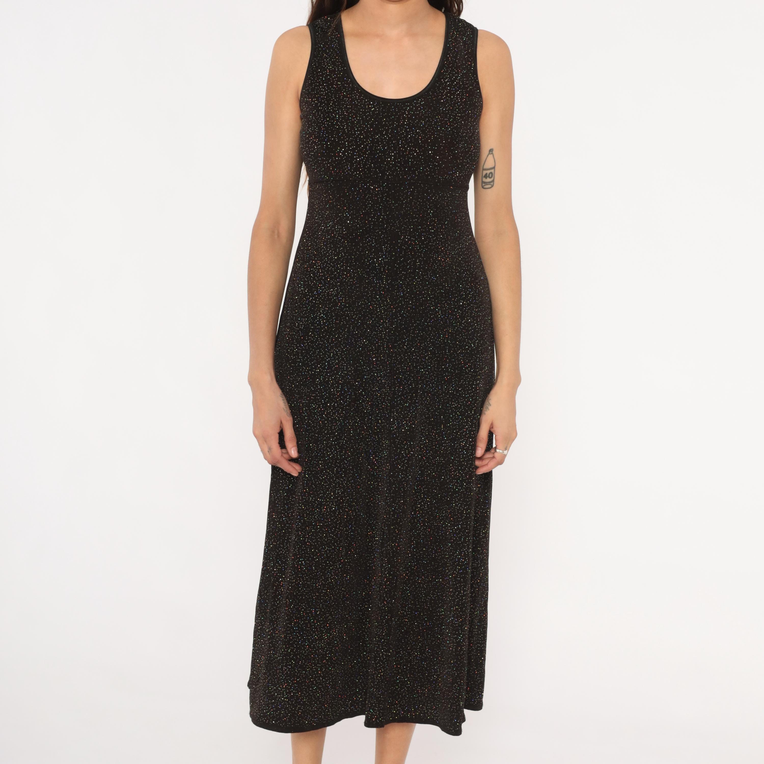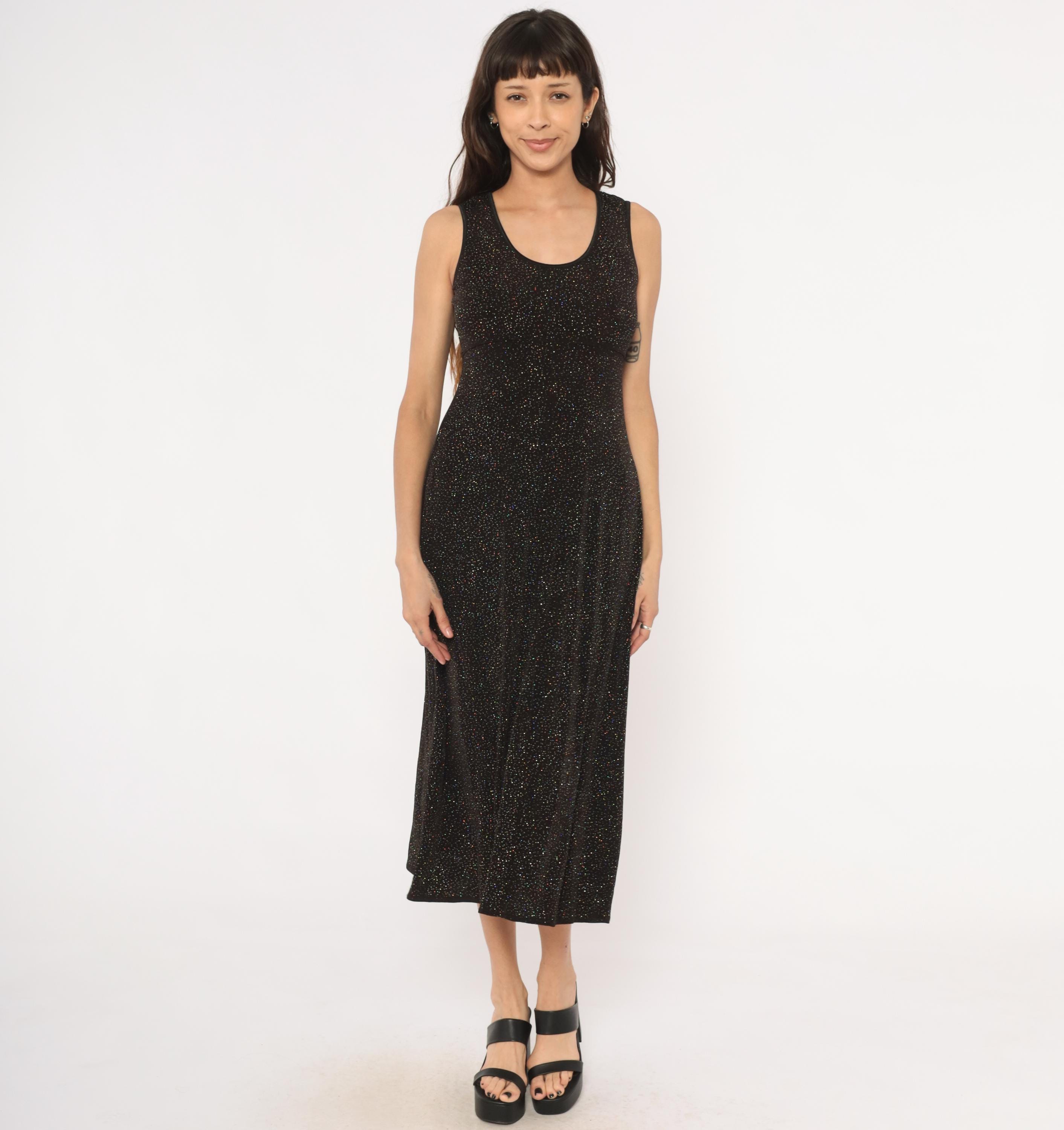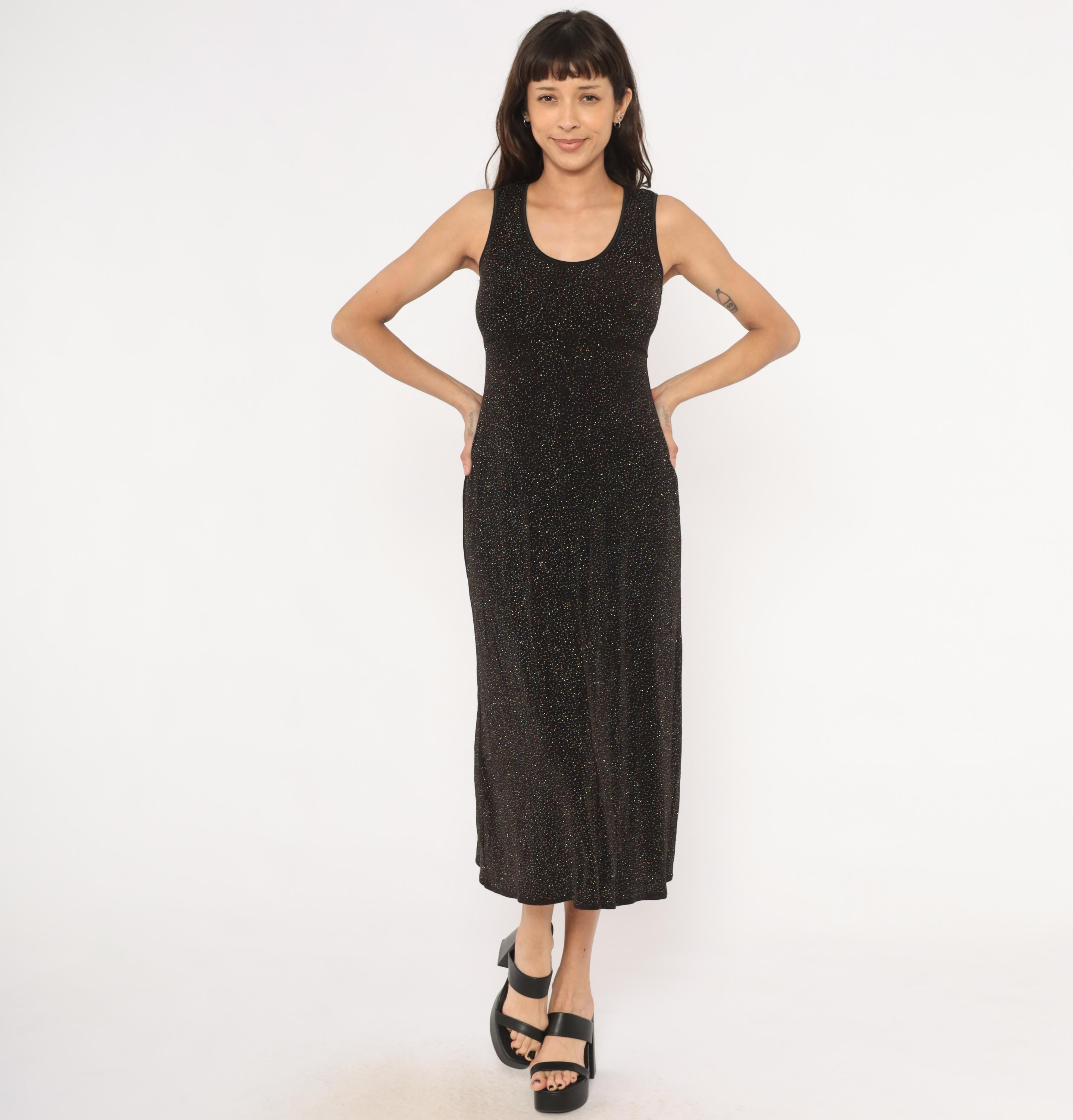 90s black glitter-speckled sleeveless maxi dress with a scoop neckline and wide tank straps. Empire waist seam with an A-line skirt falling to ankle length. Multicolor metallic flecks throughout the knit fabric catch light across the entire garment. Bound neckline and armhole edges with a clean, unadorned back.