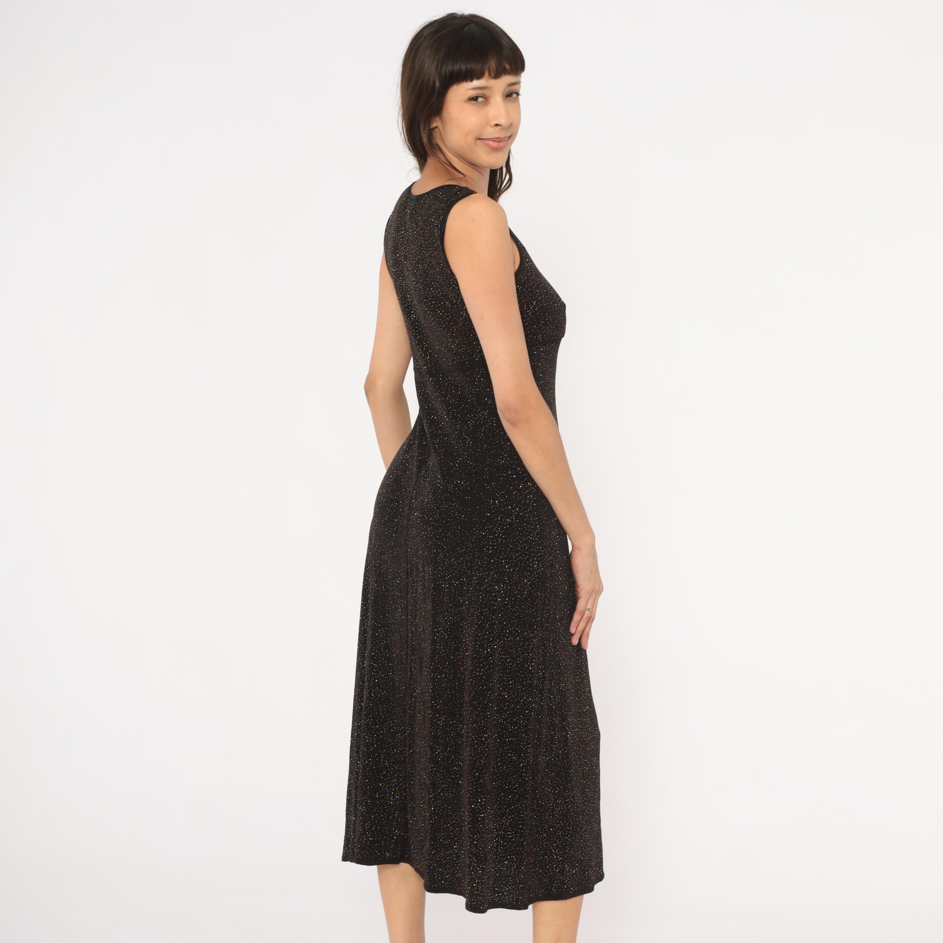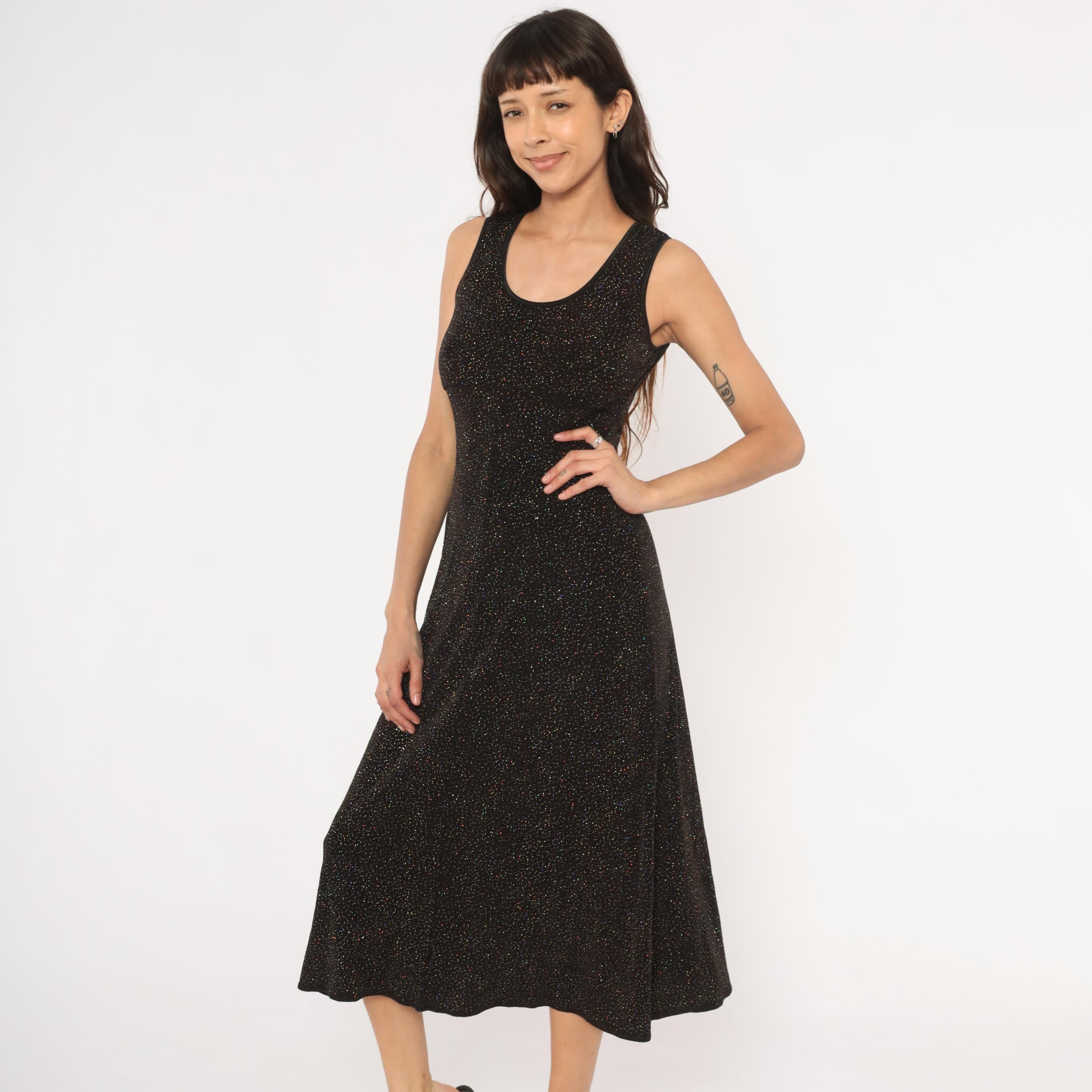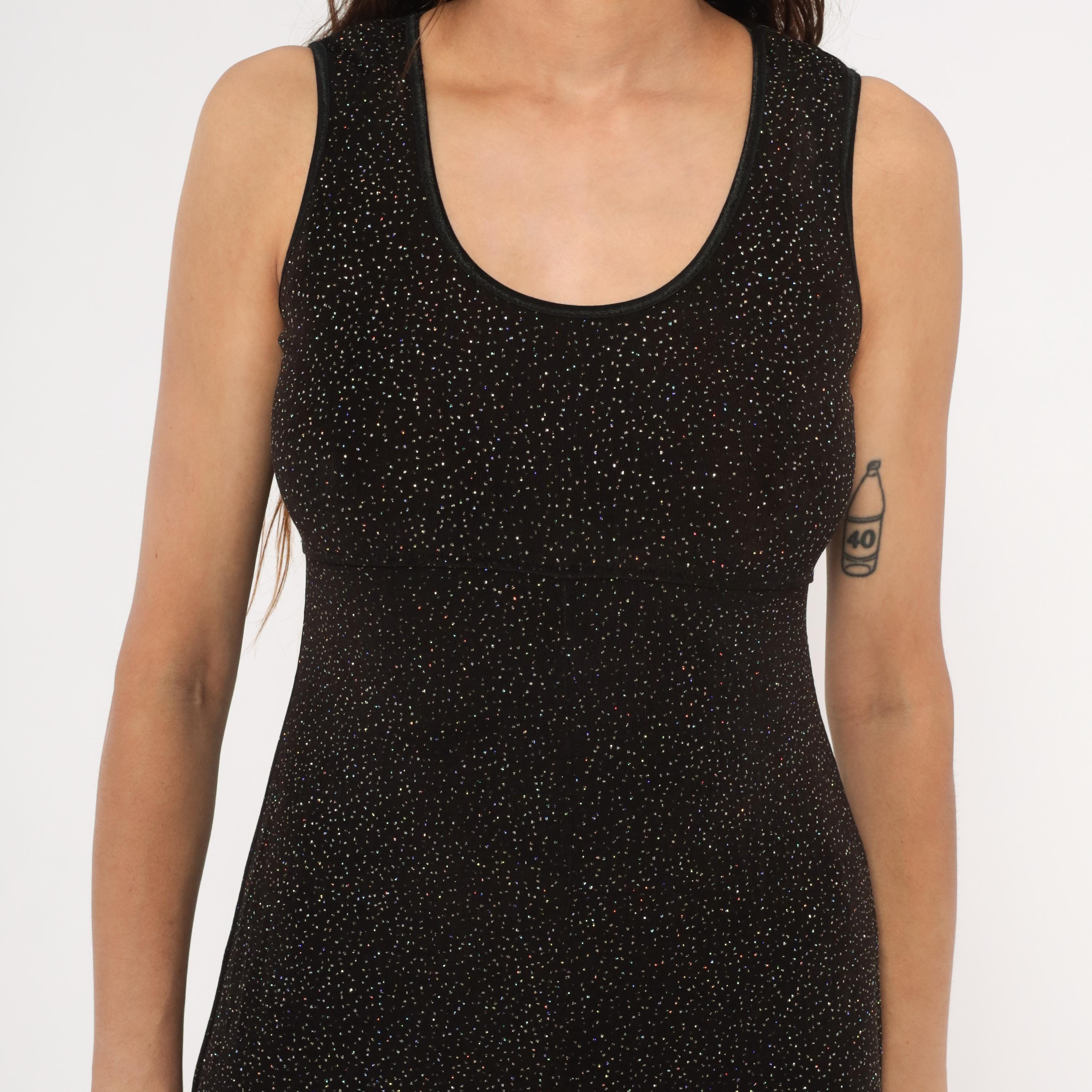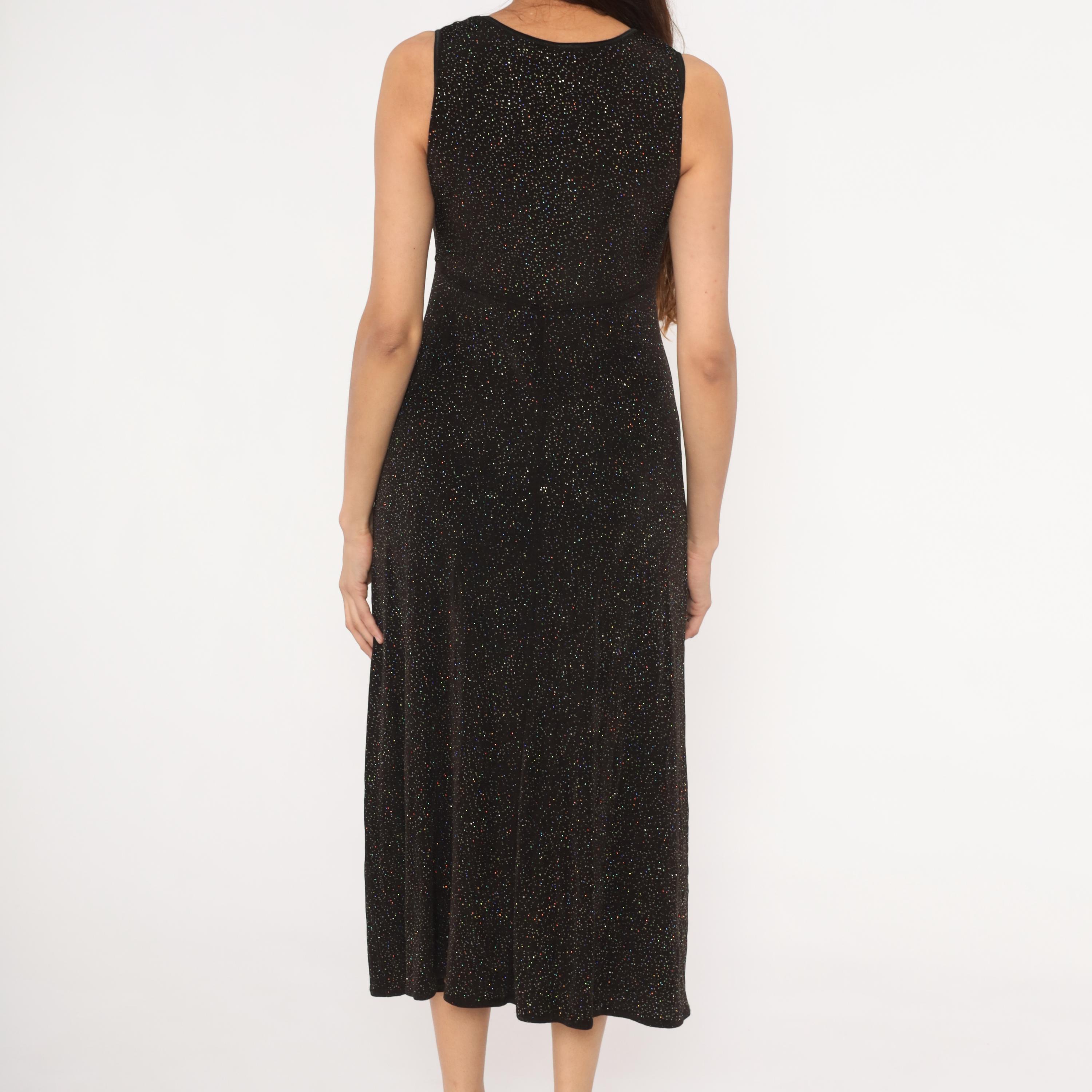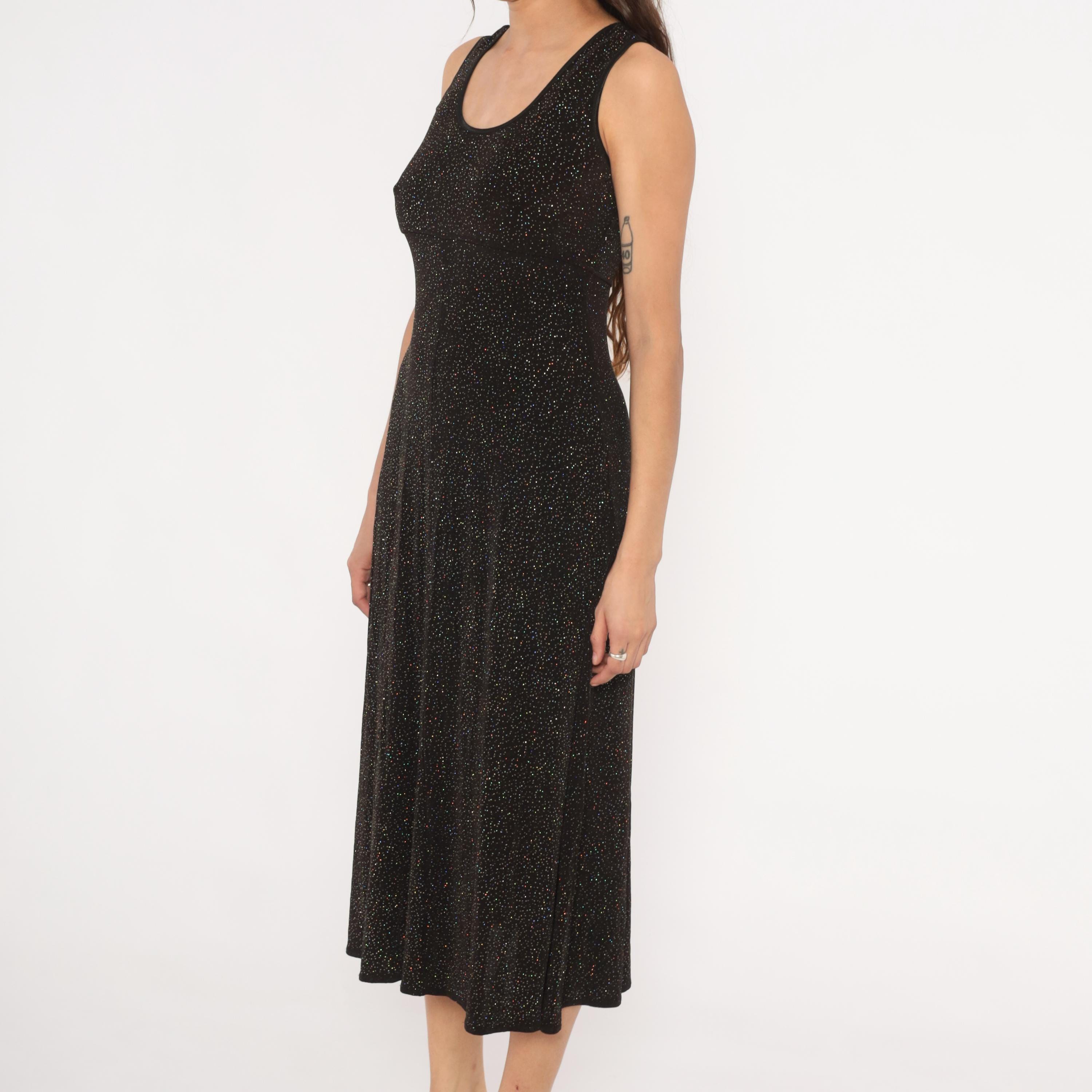 90s black glitter-speckled sleeveless maxi dress with a scoop neckline and wide tank straps. Empire waist seam with an A-line skirt falling to ankle length. Multicolor metallic flecks throughout the knit fabric catch light across the entire garment. Bound neckline and armhole edges with a clean, unadorned back.