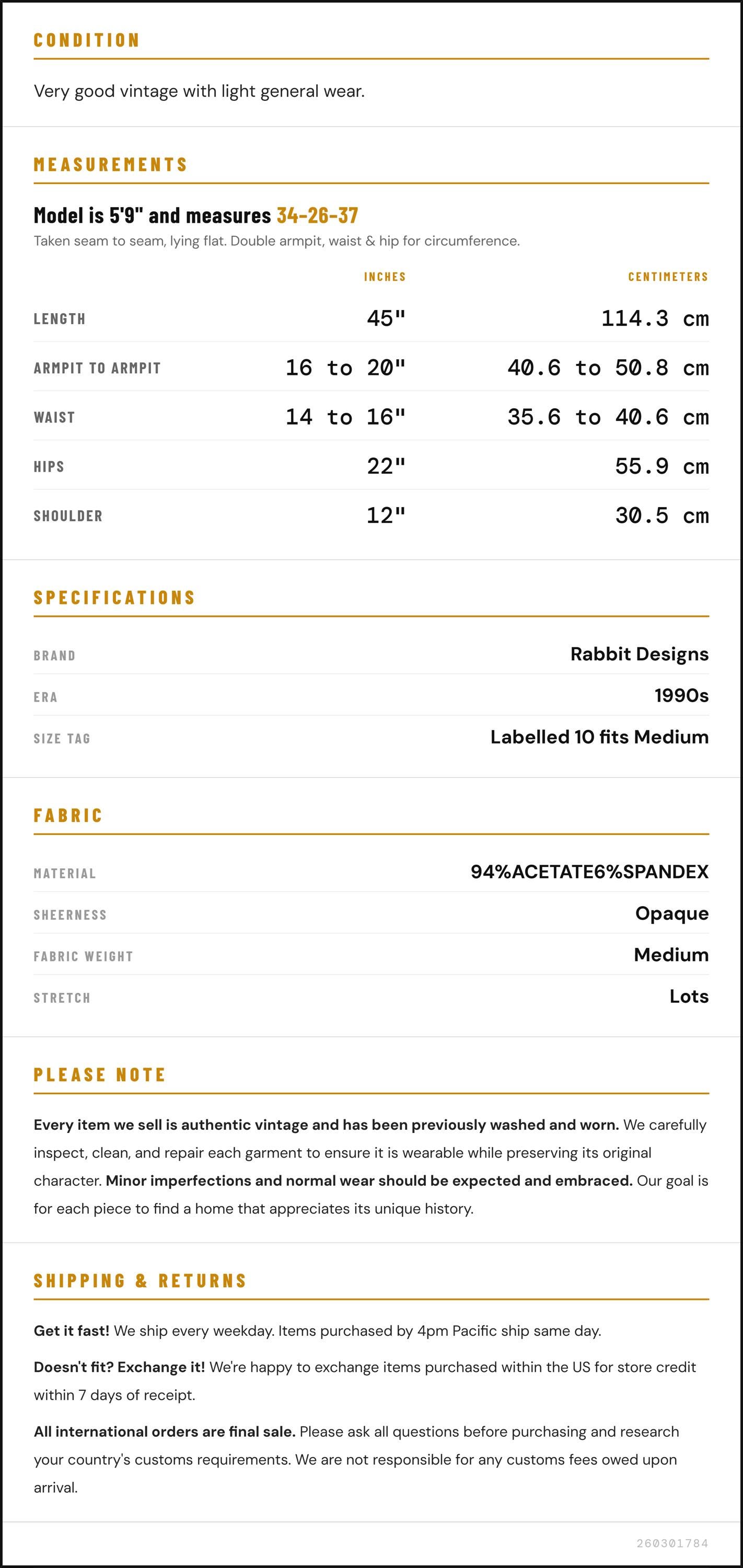 Measurements are taken laying flat and should be doubled where applicable. The "best fits" size is just an estimate, and vintage sizing can vary from modern sizing. Please use measurements to ensure proper fit. The best thing to do is measure a similar item of your own, and compare. When an item has stretch, we will list the unstretched dimensions with the stretched measurement afterwards.
