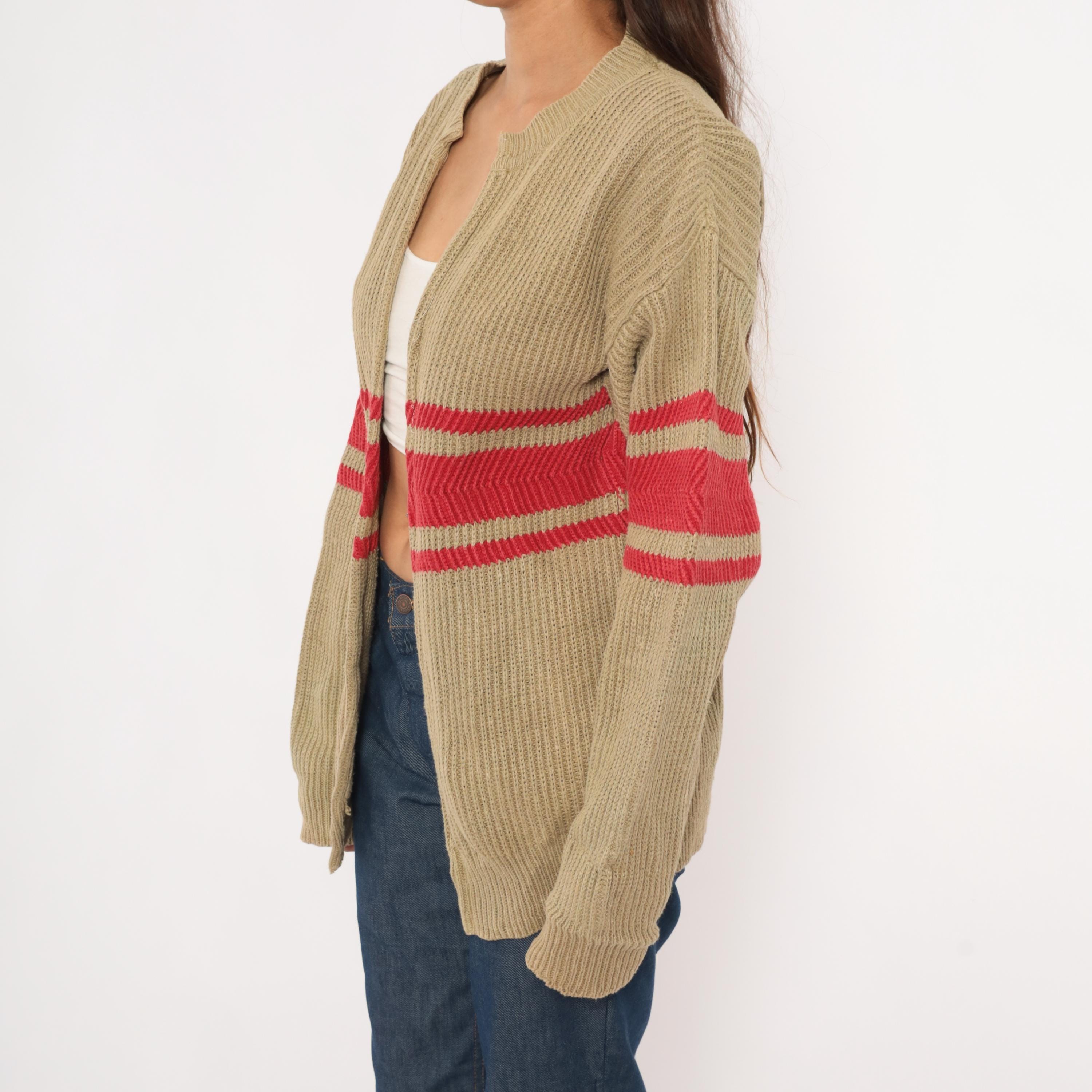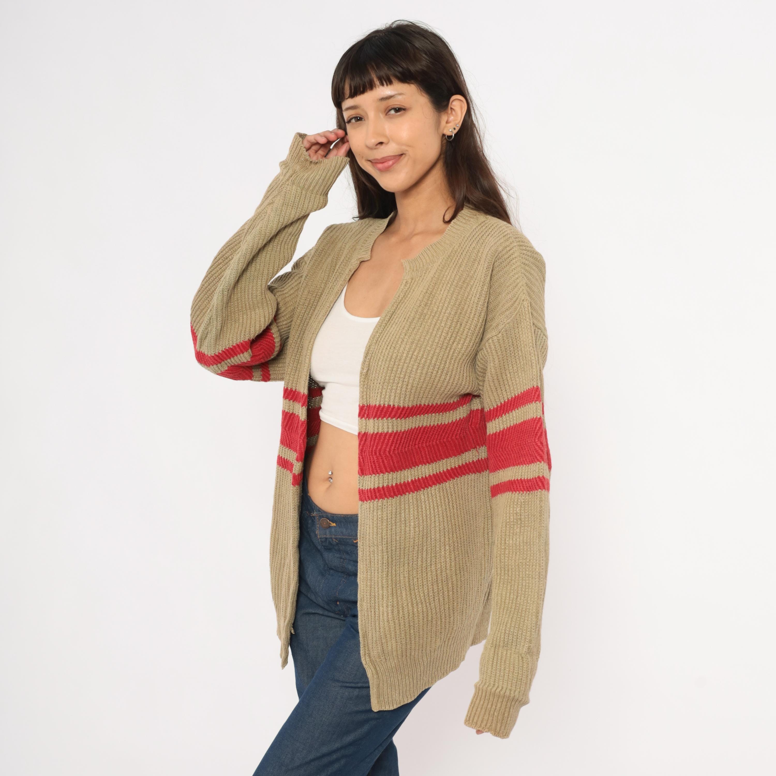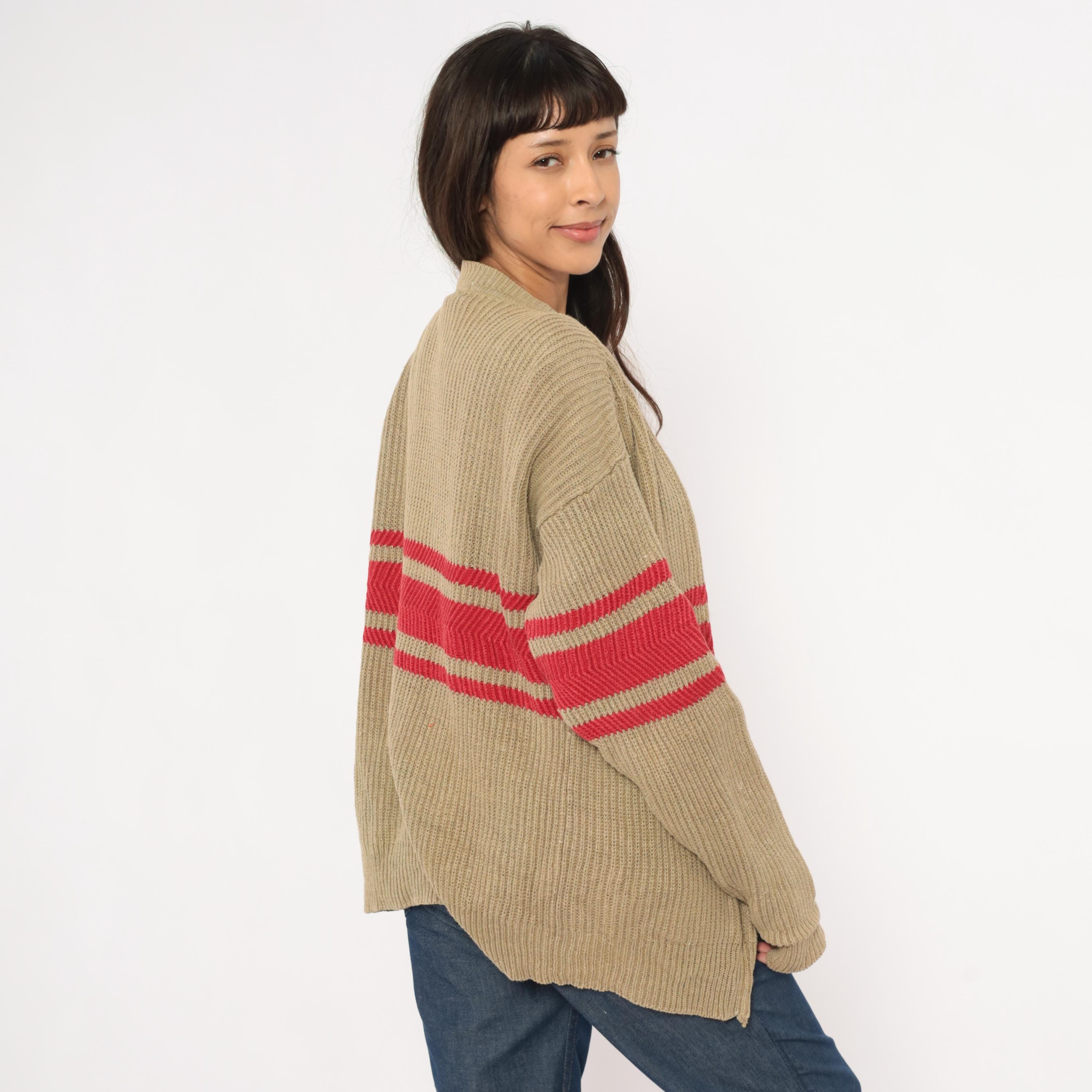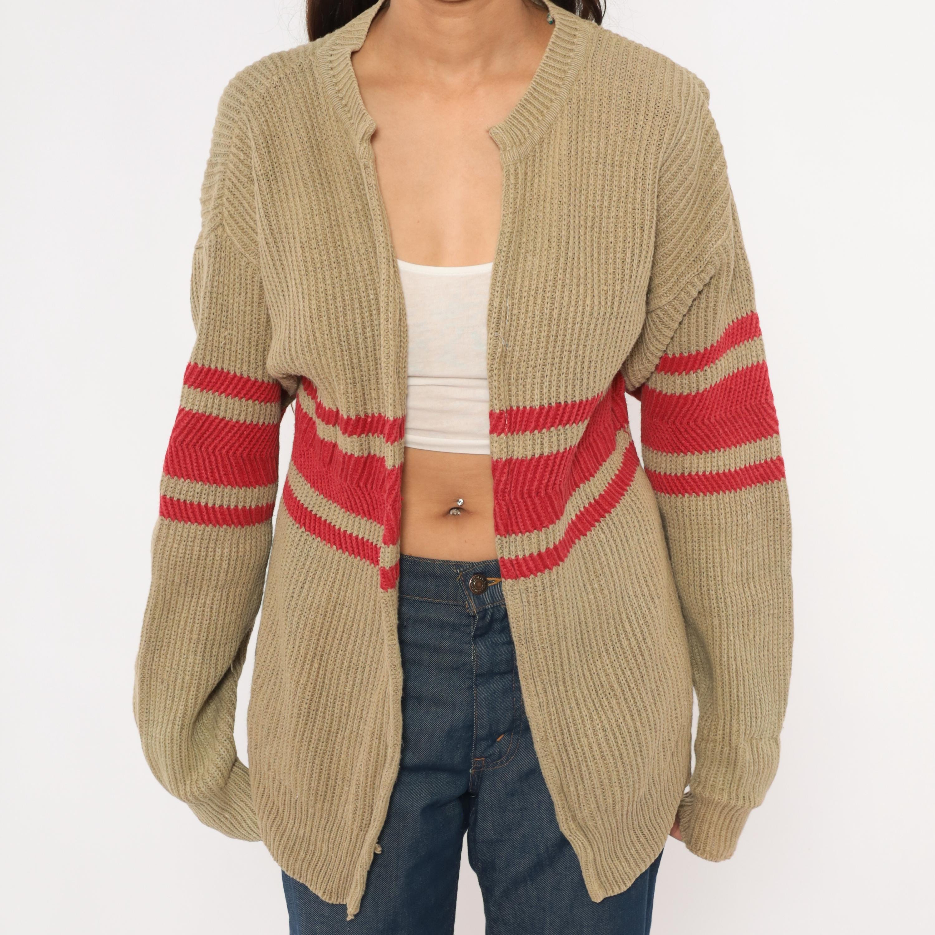 90s open front cardigan from GAP in a tan ribbed knit with red horizontal band stripes across the midsection and sleeves. Crew neckline with a small folded collar, long sleeves with ribbed cuffs, and no closure. The stripe pattern wraps continuously around the body and arms, with a solid sand-colored upper chest, shoulders, and lower body.