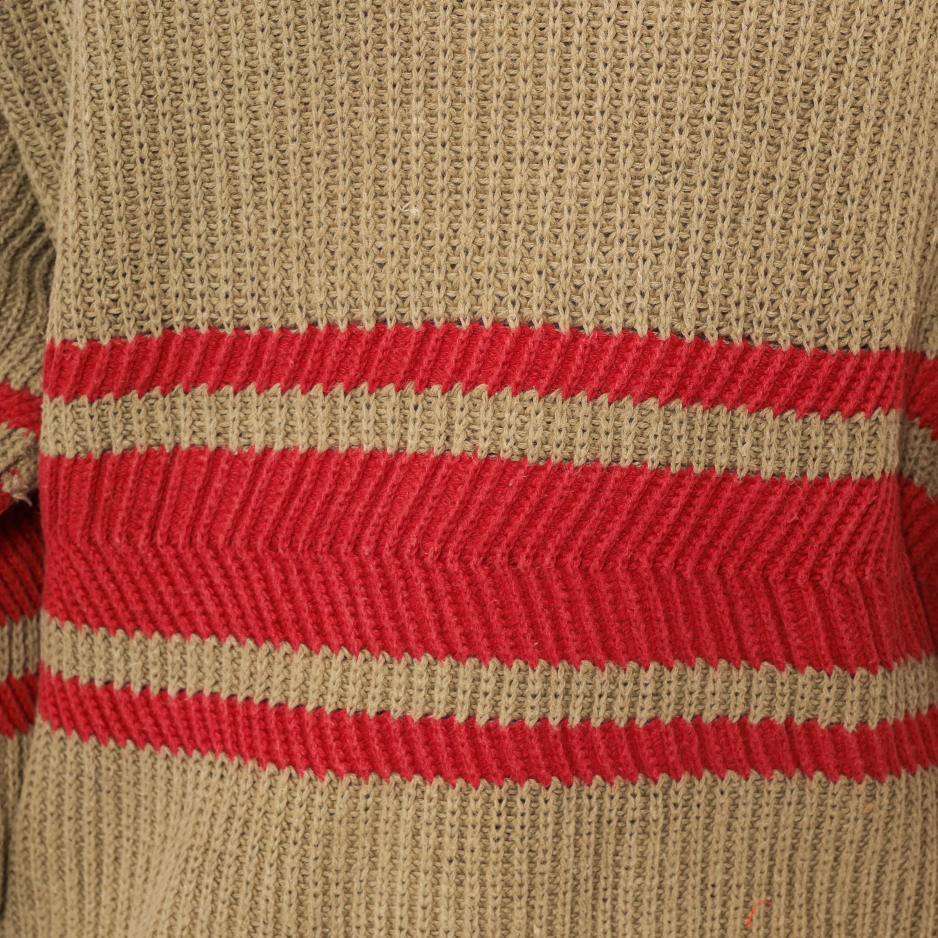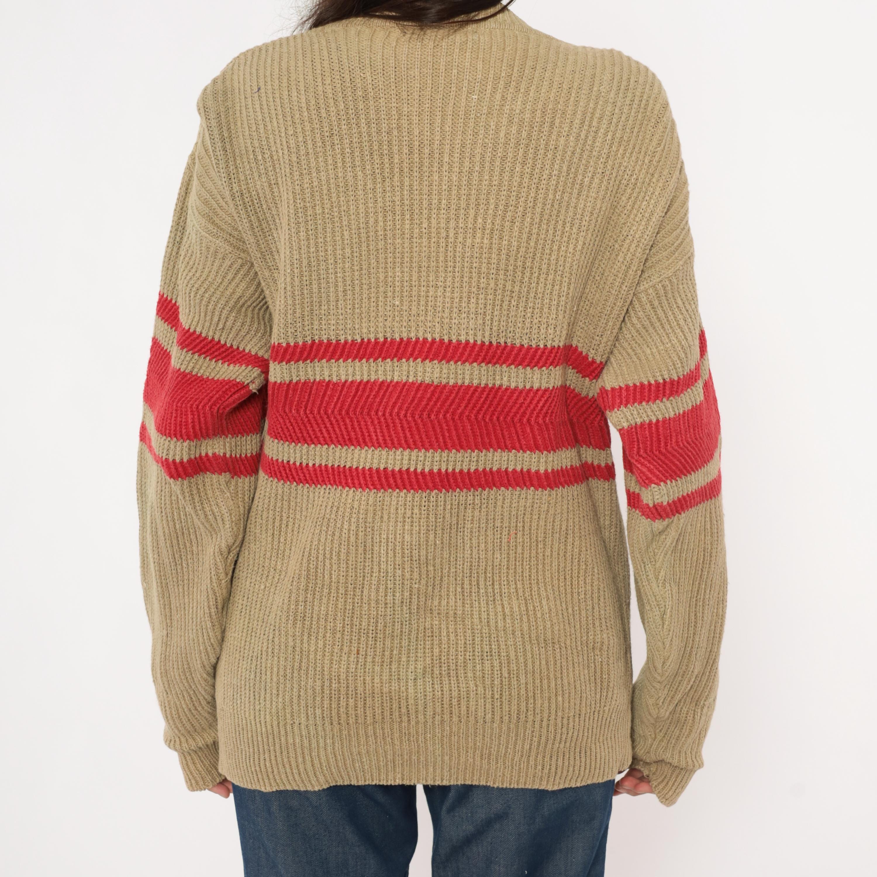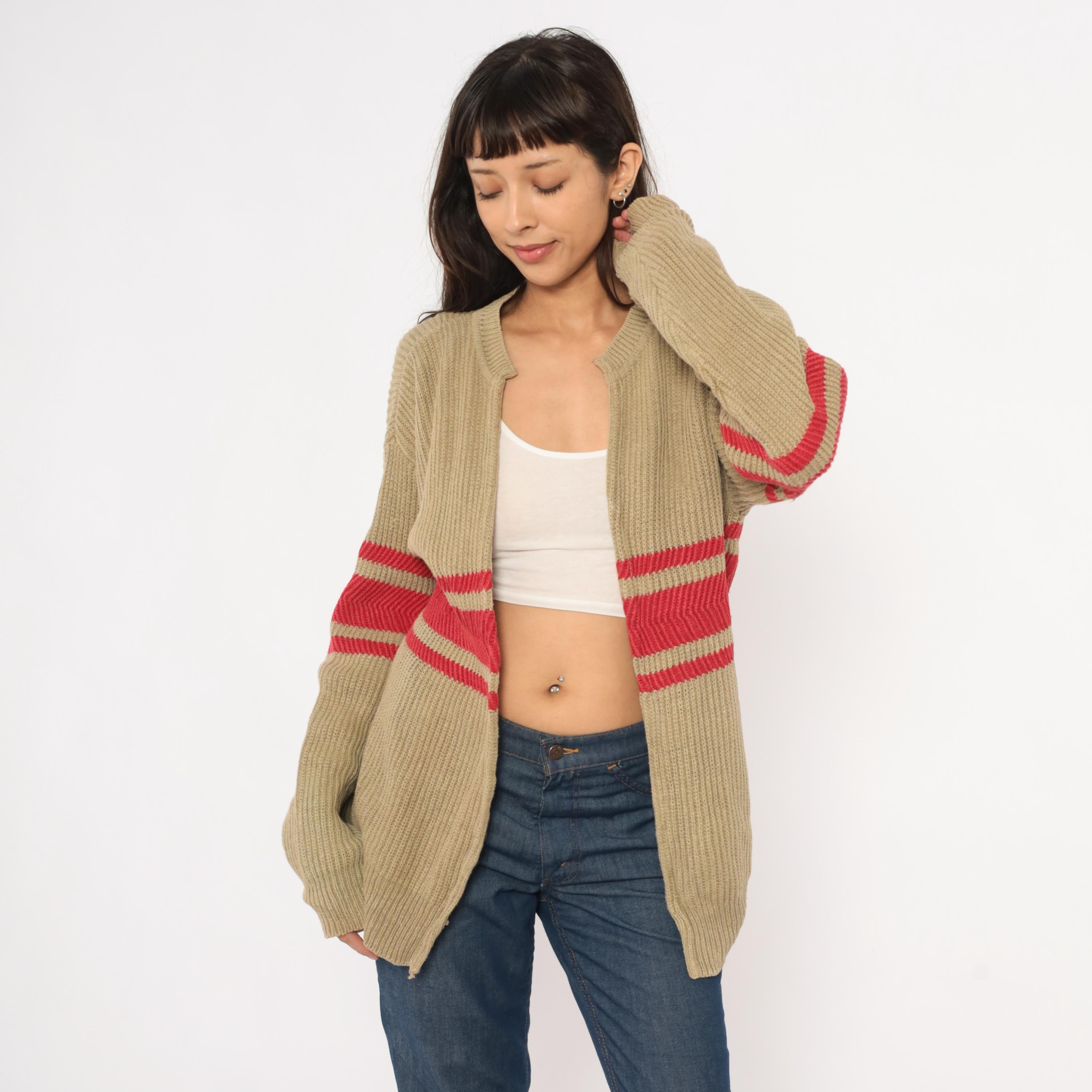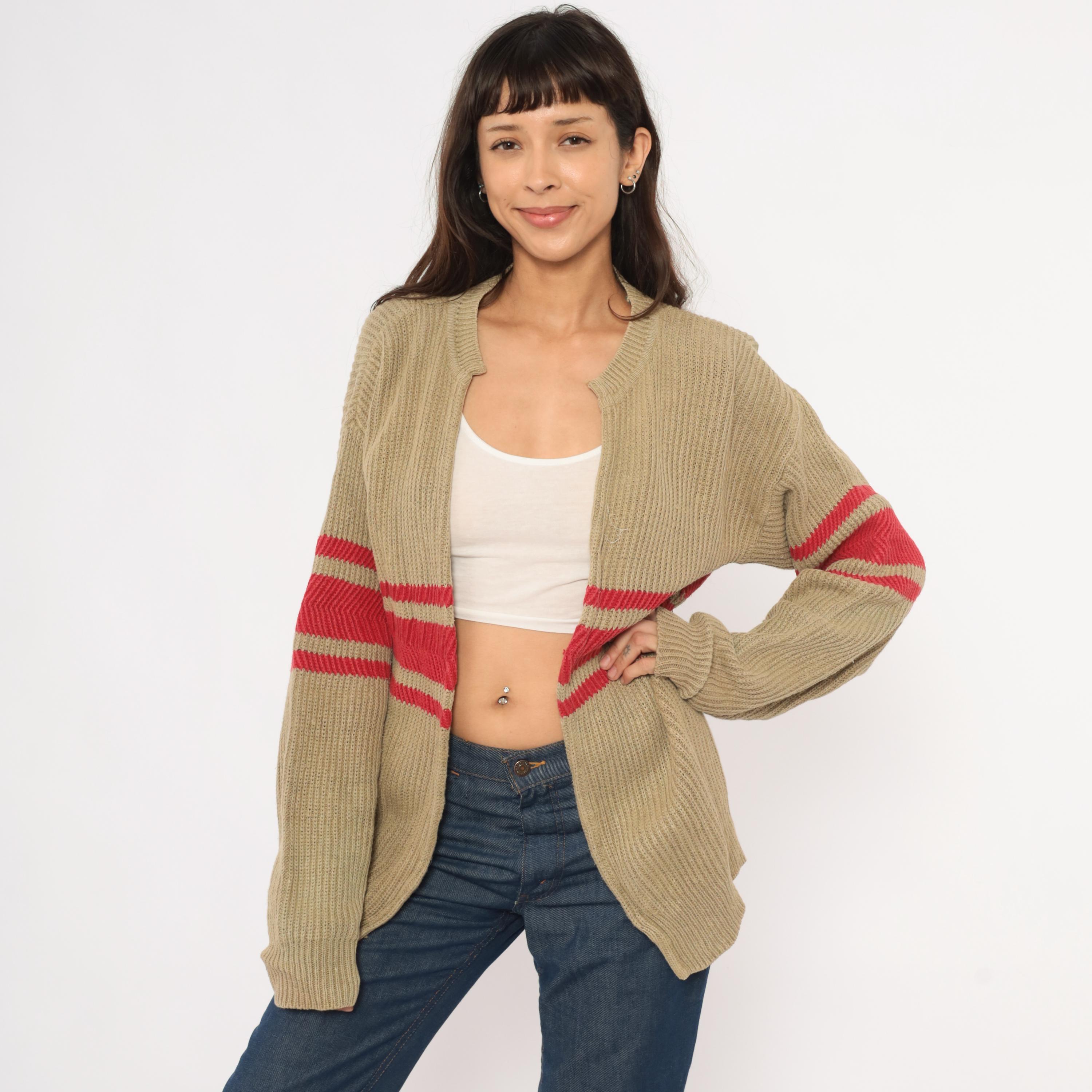 90s open front cardigan from GAP in a tan ribbed knit with red horizontal band stripes across the midsection and sleeves. Crew neckline with a small folded collar, long sleeves with ribbed cuffs, and no closure. The stripe pattern wraps continuously around the body and arms, with a solid sand-colored upper chest, shoulders, and lower body.