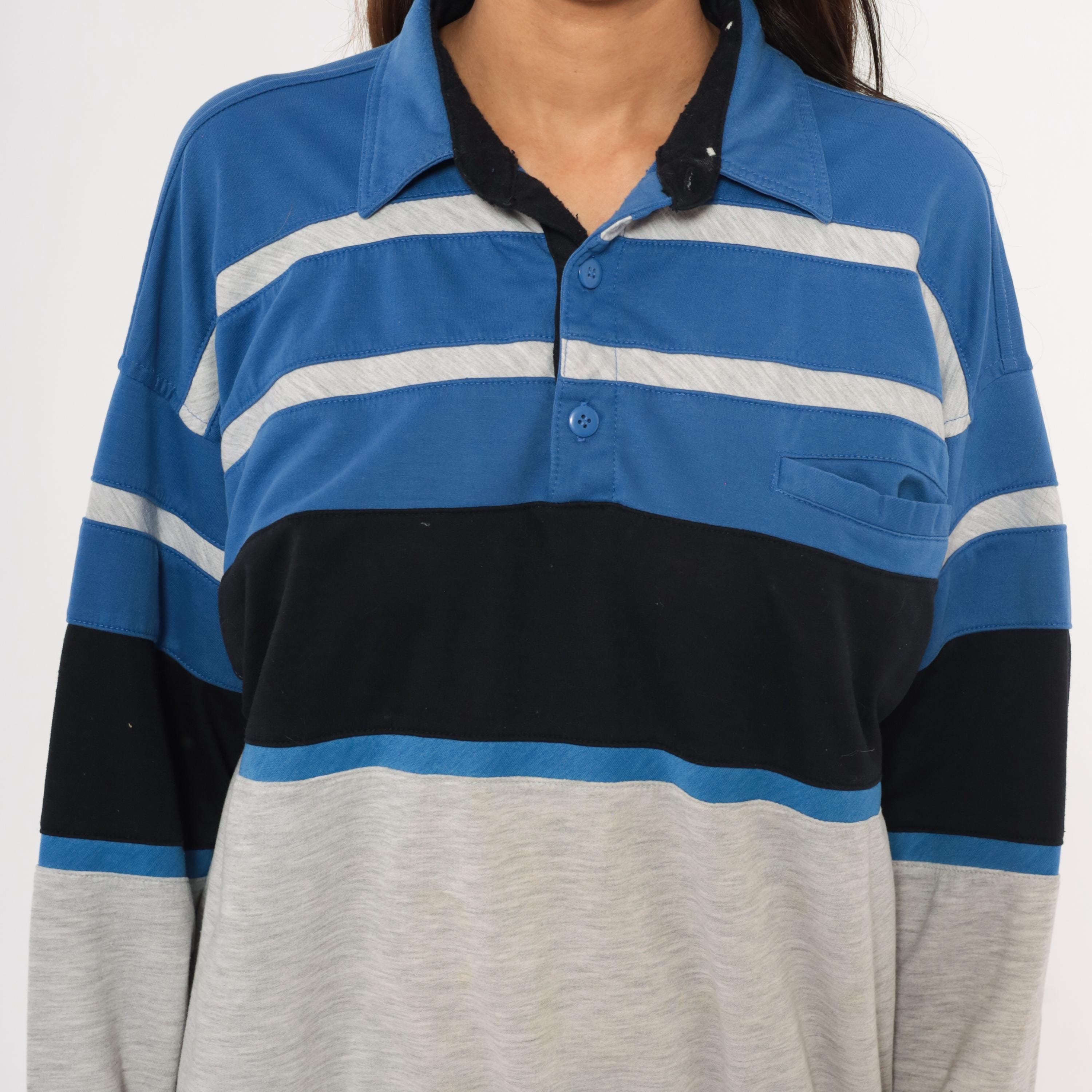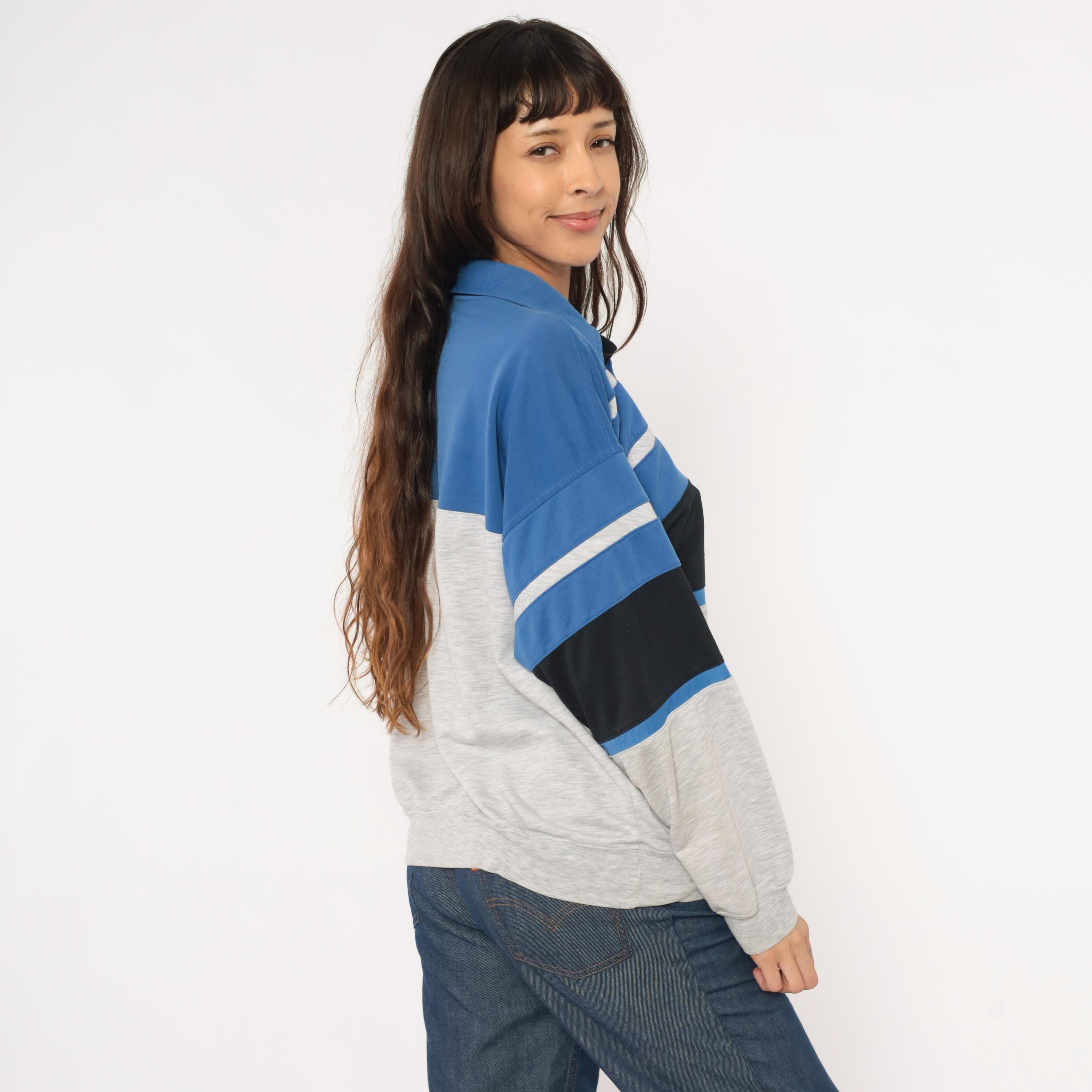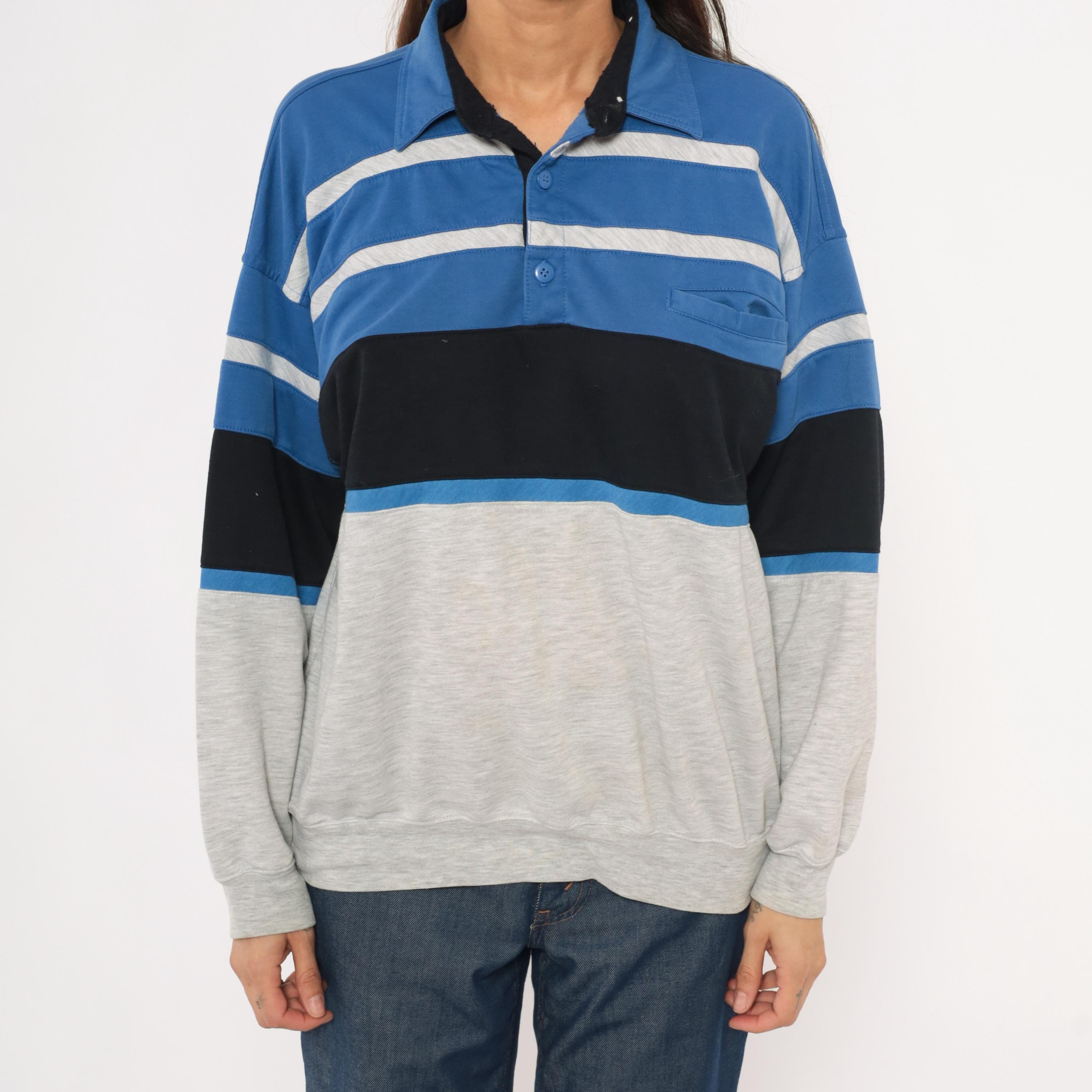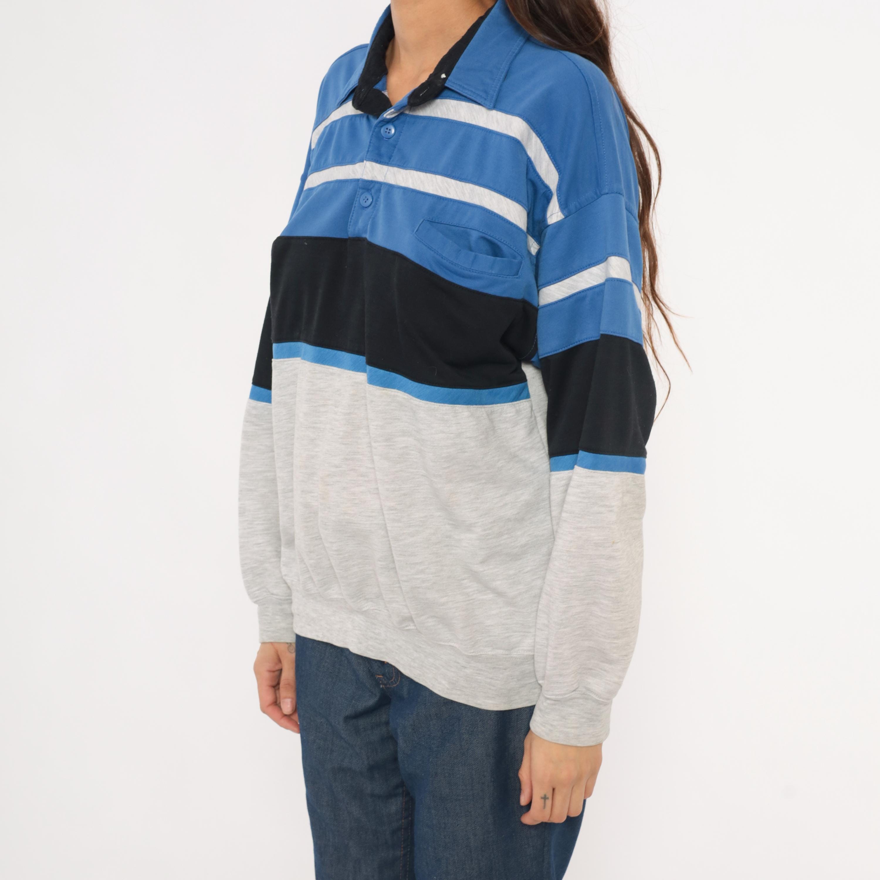 80s color block polo sweatshirt from Knightsbridge with a spread collar, black inner collar lining, and three-button placket. Blue upper section with gray horizontal stripes across the chest, a wide black band through the midsection, and a heather grey lower body and sleeves.