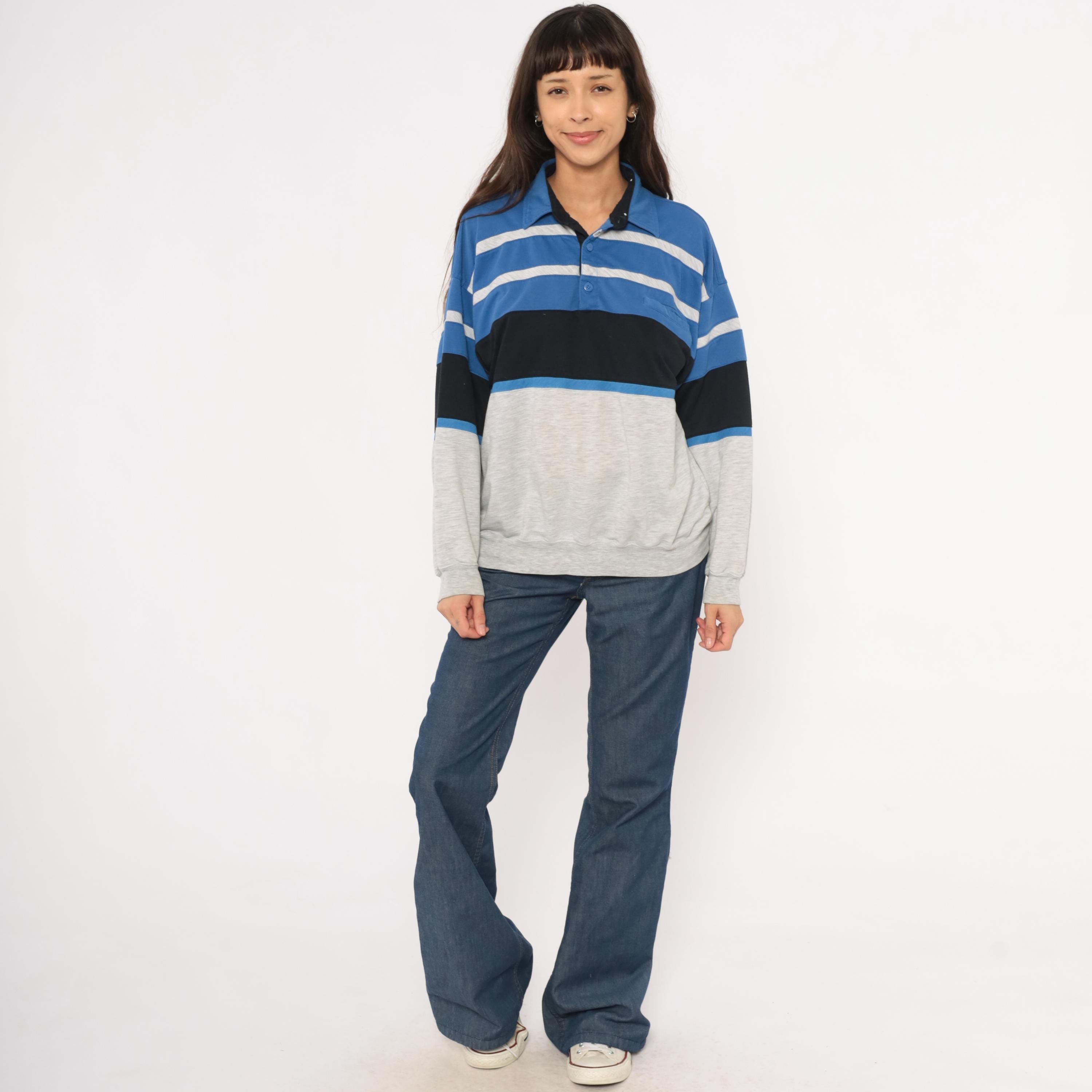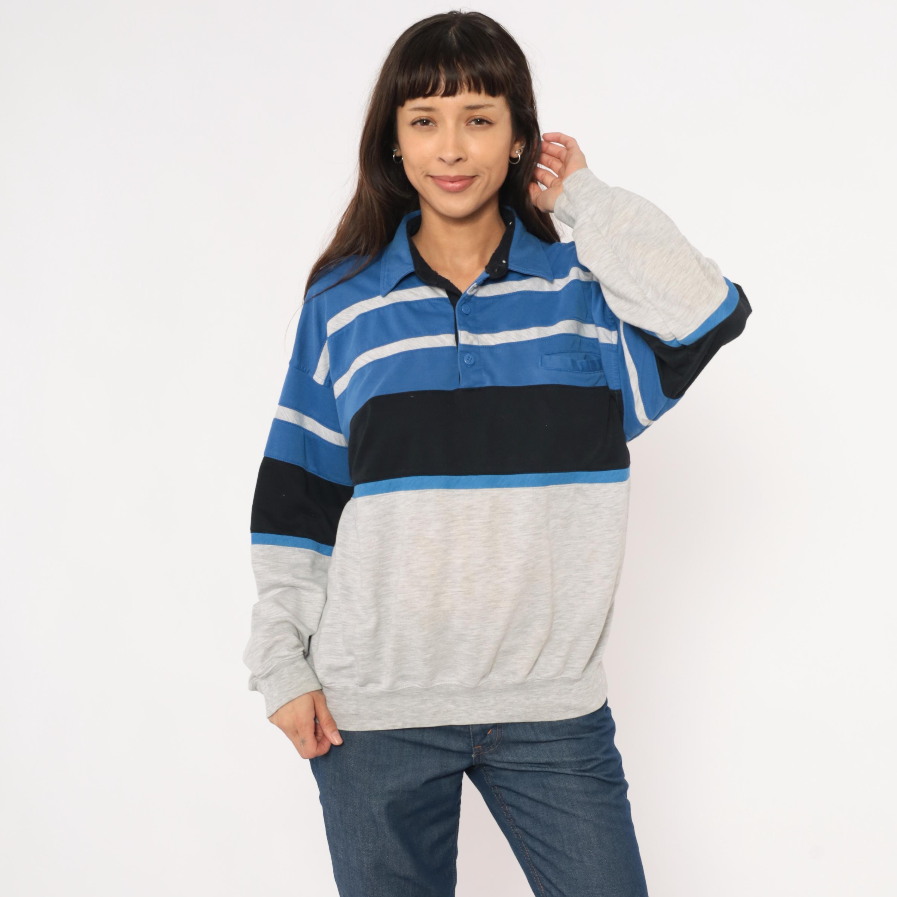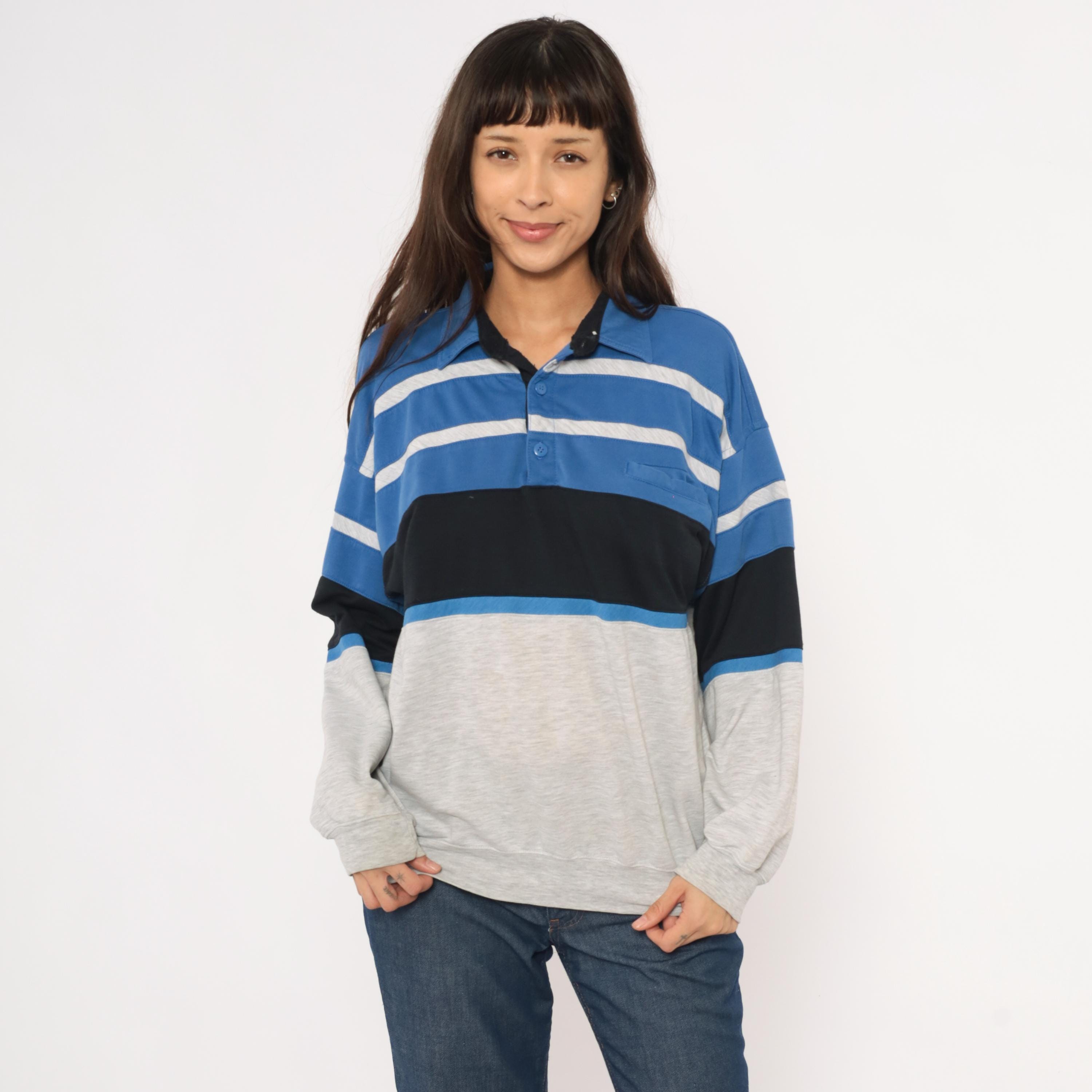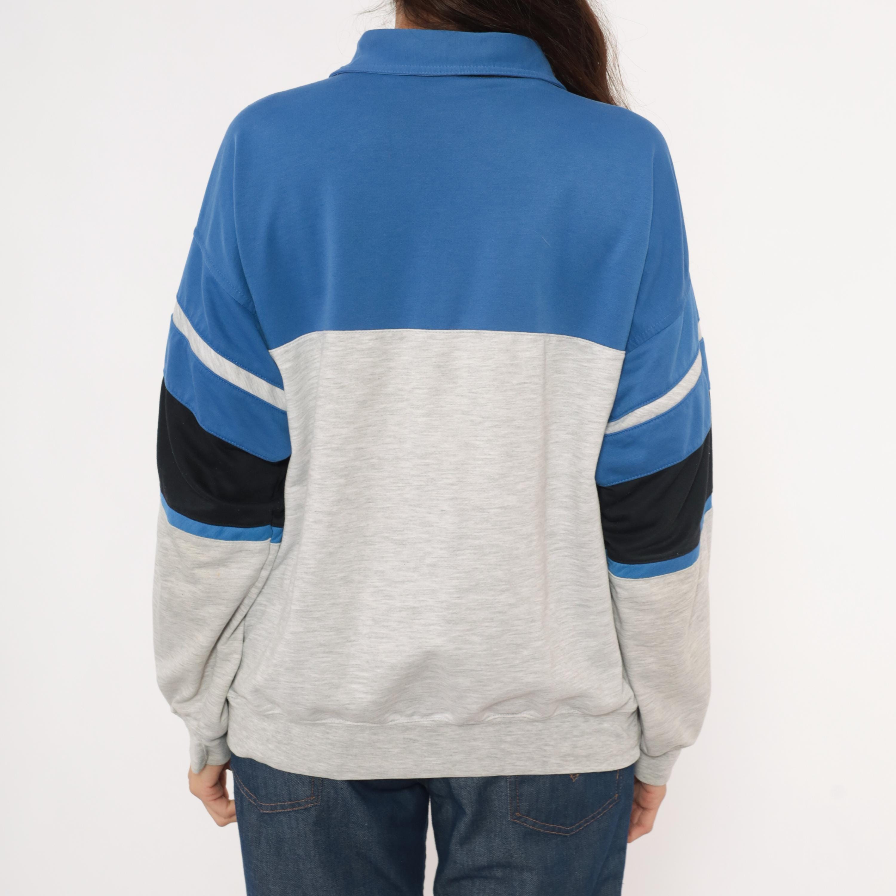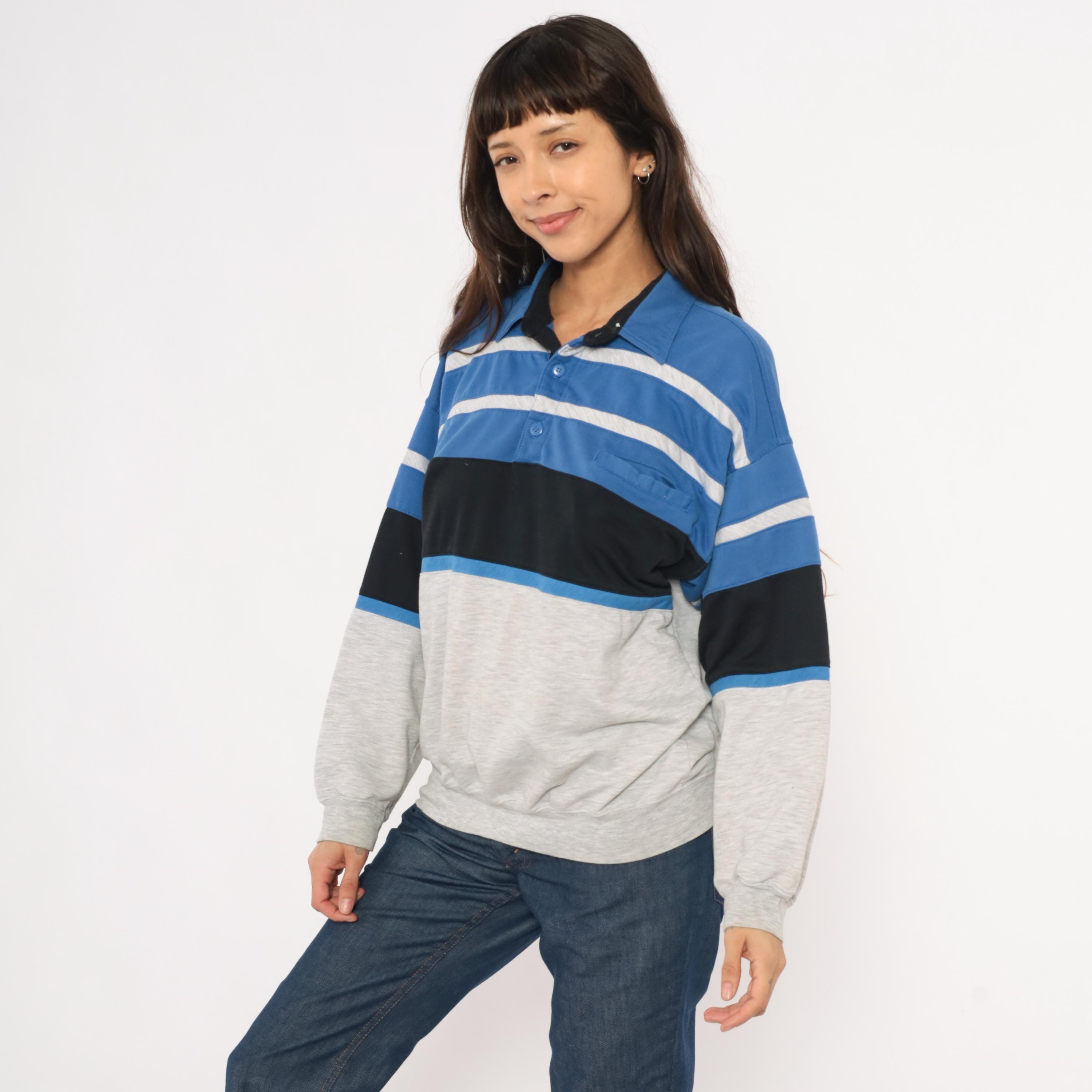 80s color block polo sweatshirt from Knightsbridge with a spread collar, black inner collar lining, and three-button placket. Blue upper section with gray horizontal stripes across the chest, a wide black band through the midsection, and a heather grey lower body and sleeves.