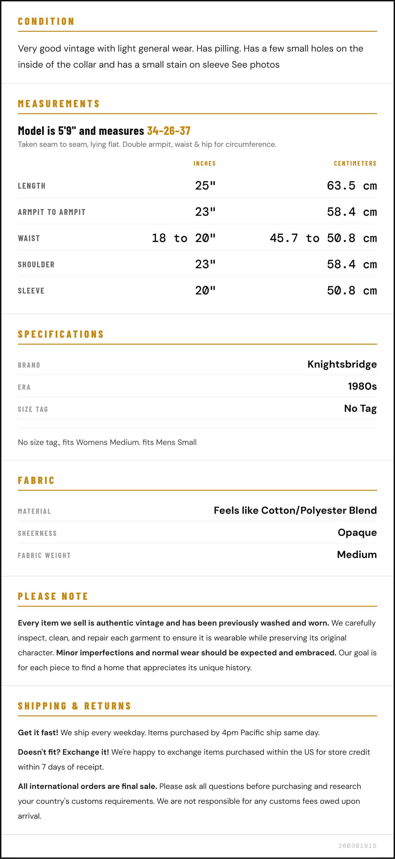Condition: Very good vintage with light general wear. Has pilling. Has a few small holes on the inside of the collar and has a small stain on sleeve See photos