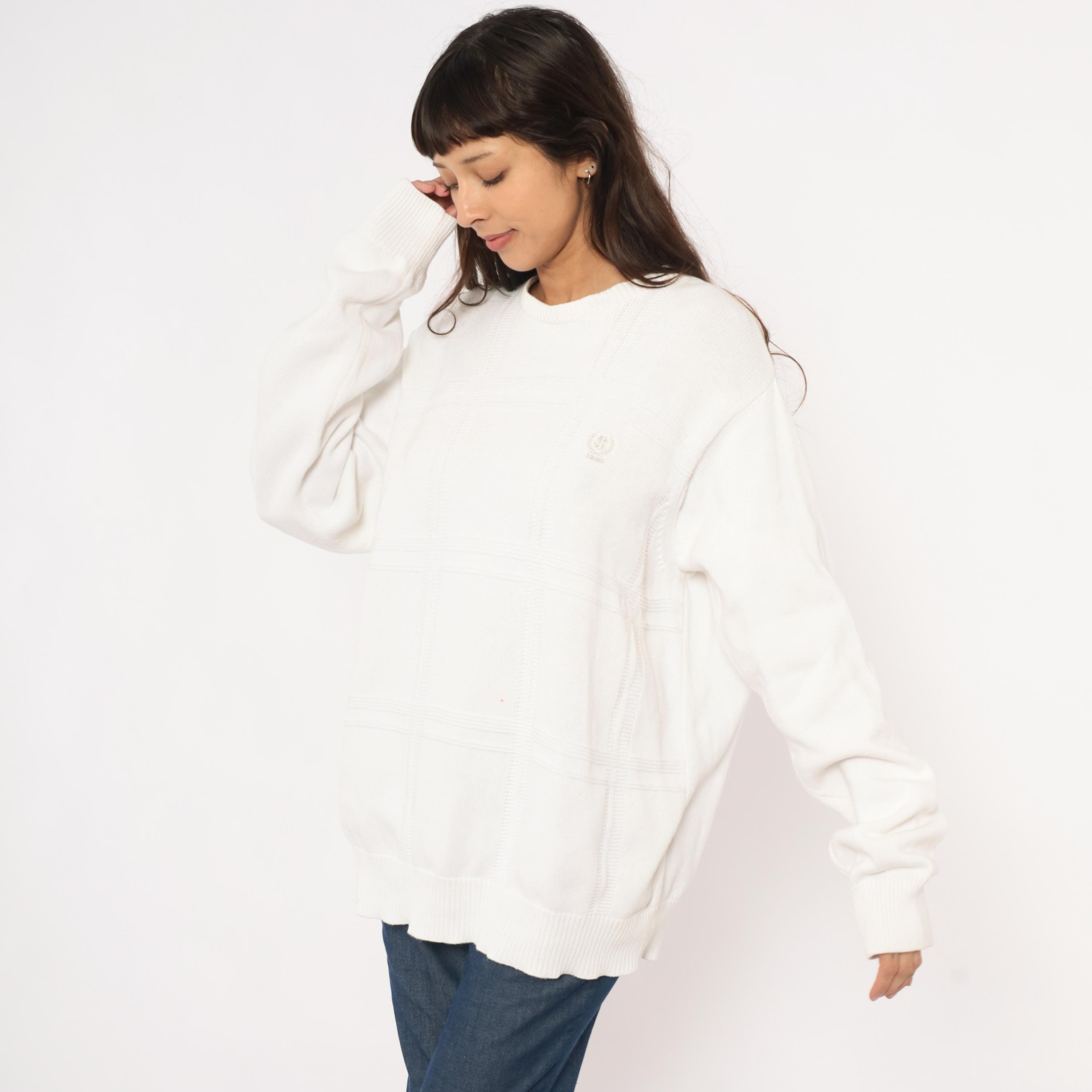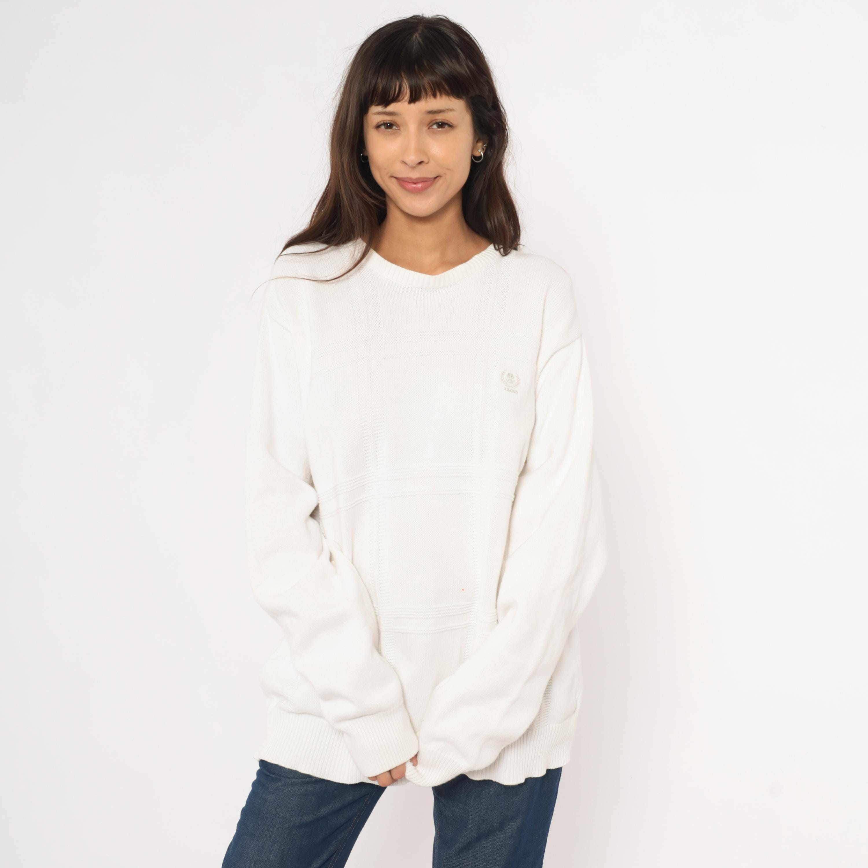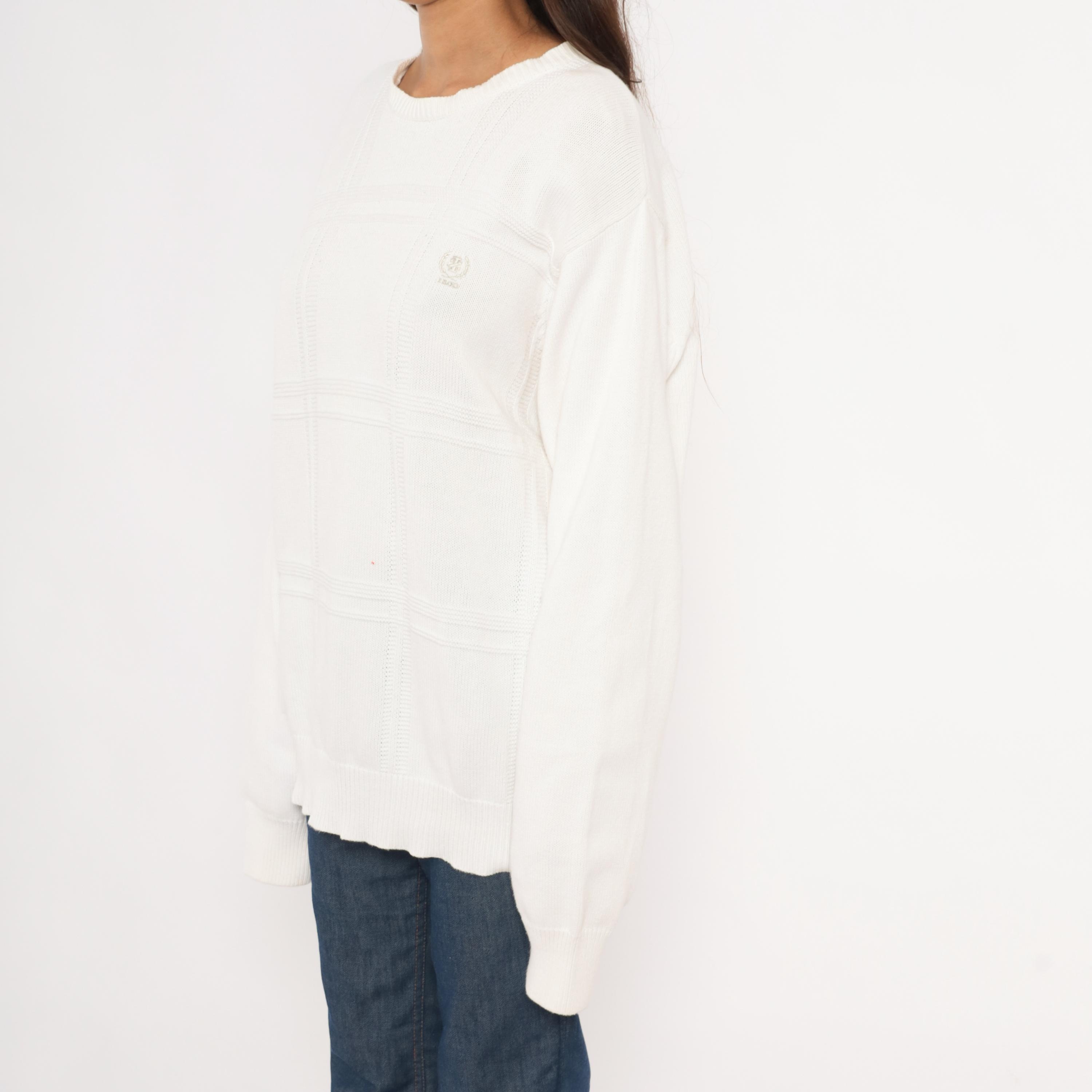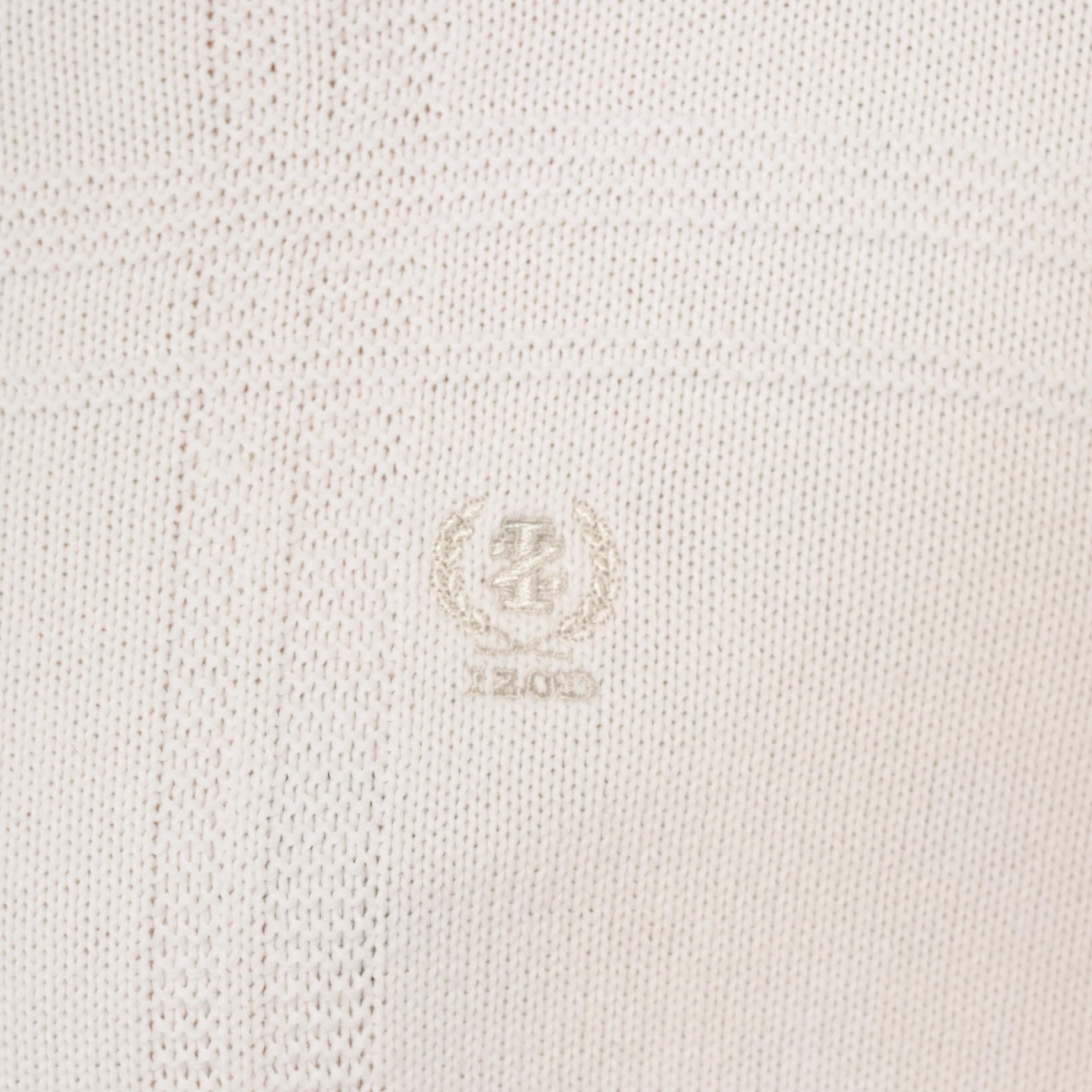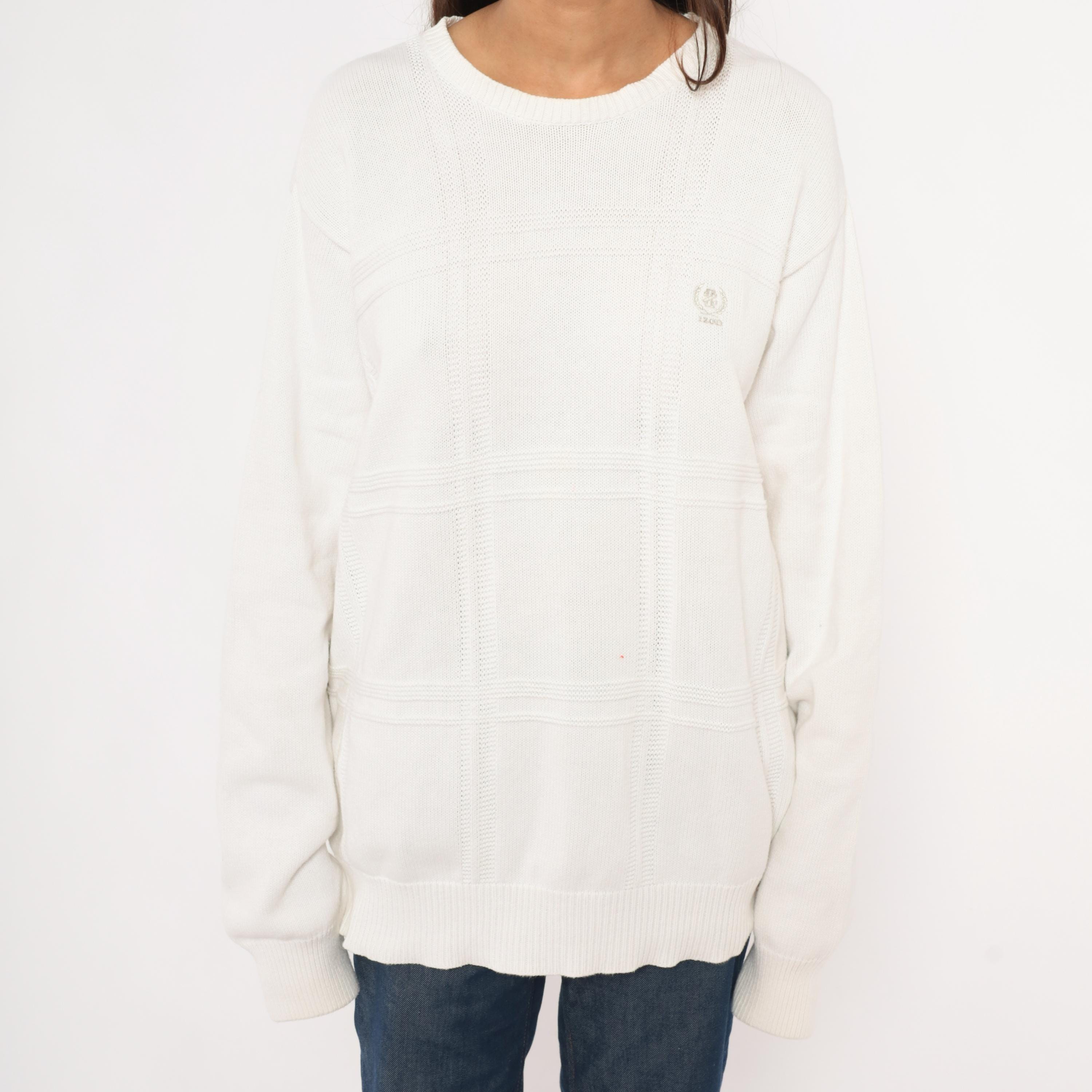 90s white crewneck pullover sweater from Izod with a raised windowpane grid pattern across the front body. Embroidered tonal brand logo on the upper left chest, ribbed crew neckline, cuffs, and waistband.