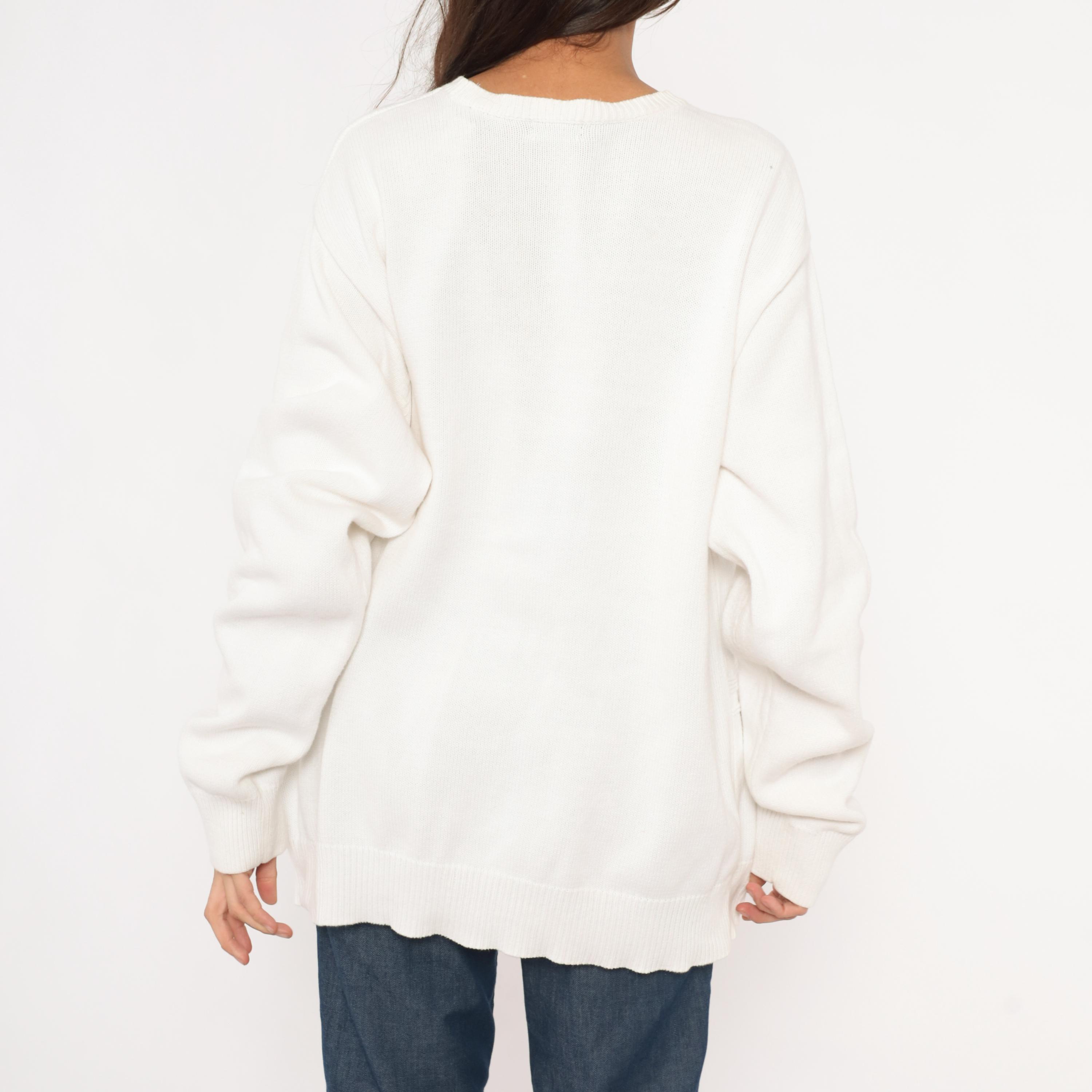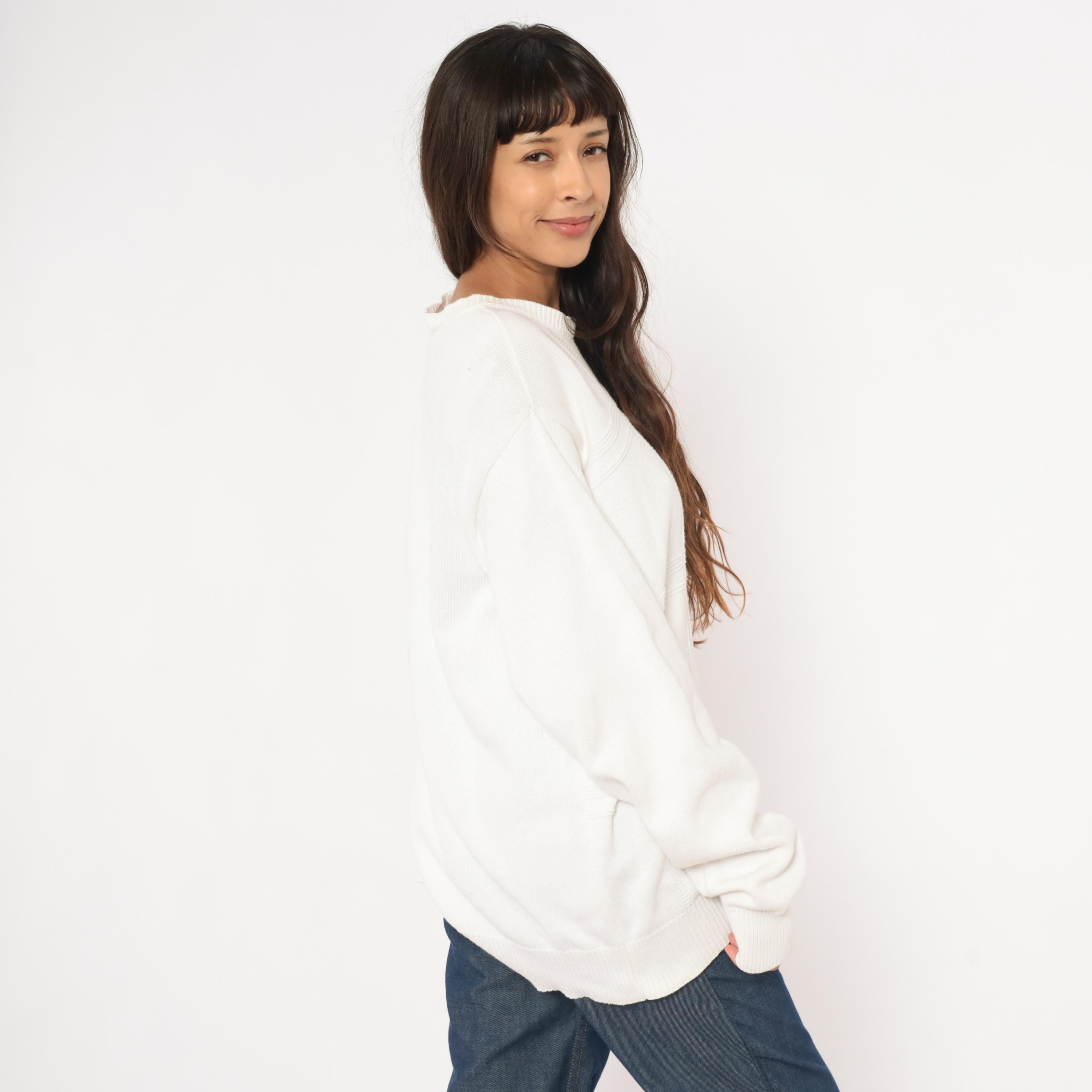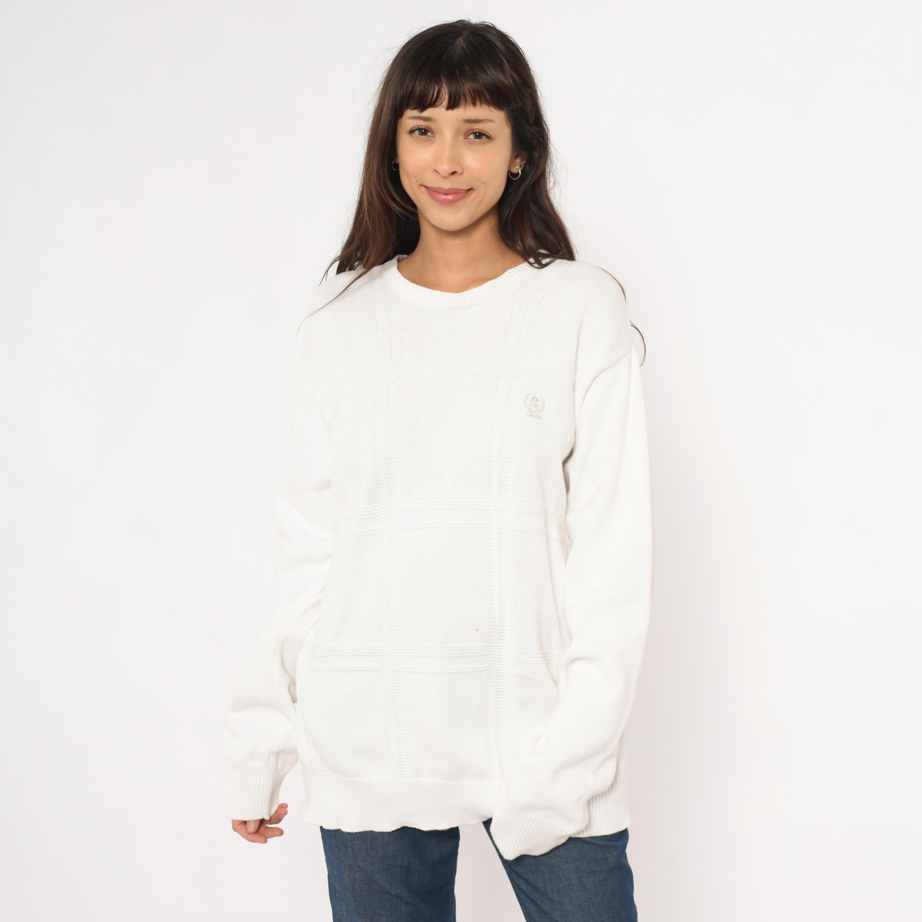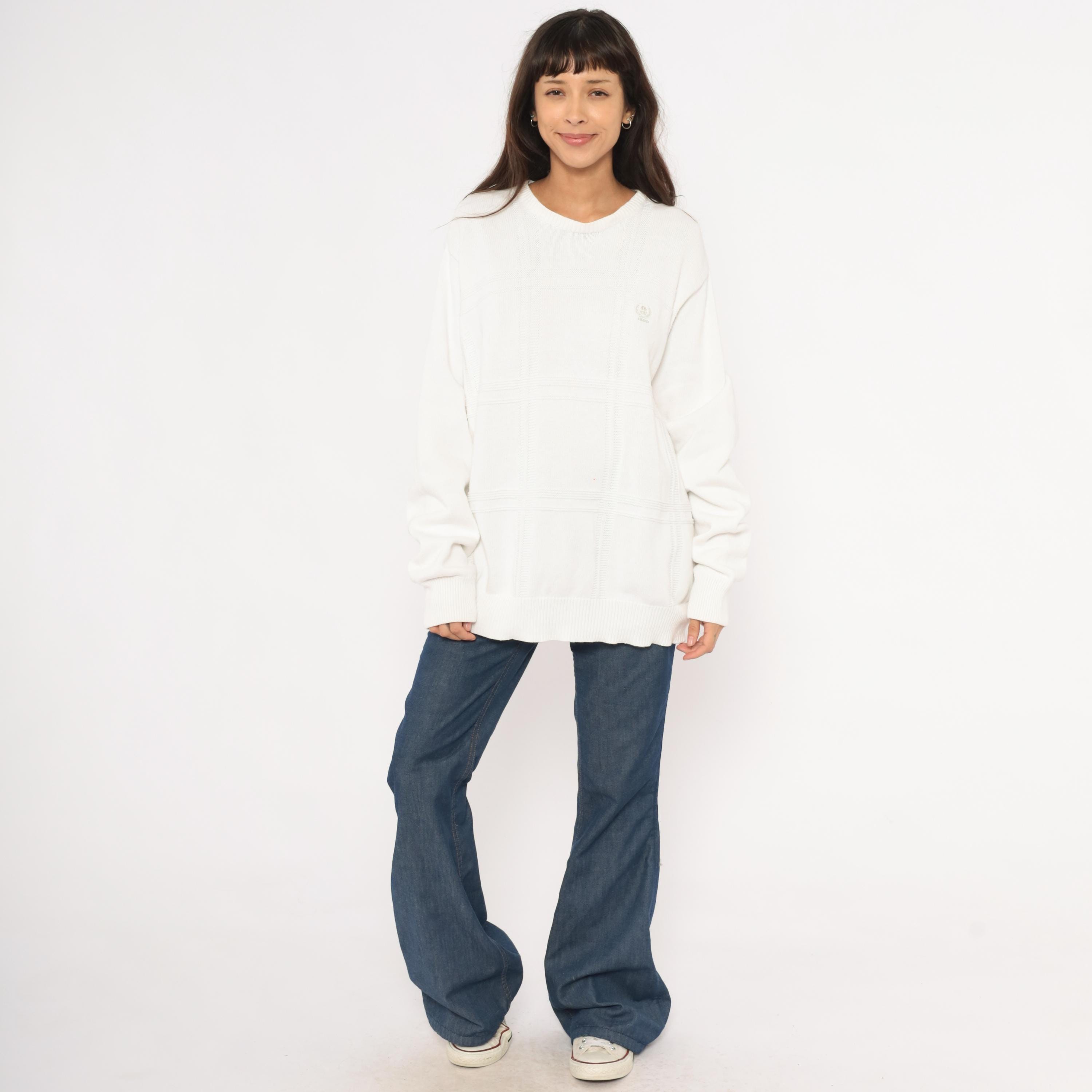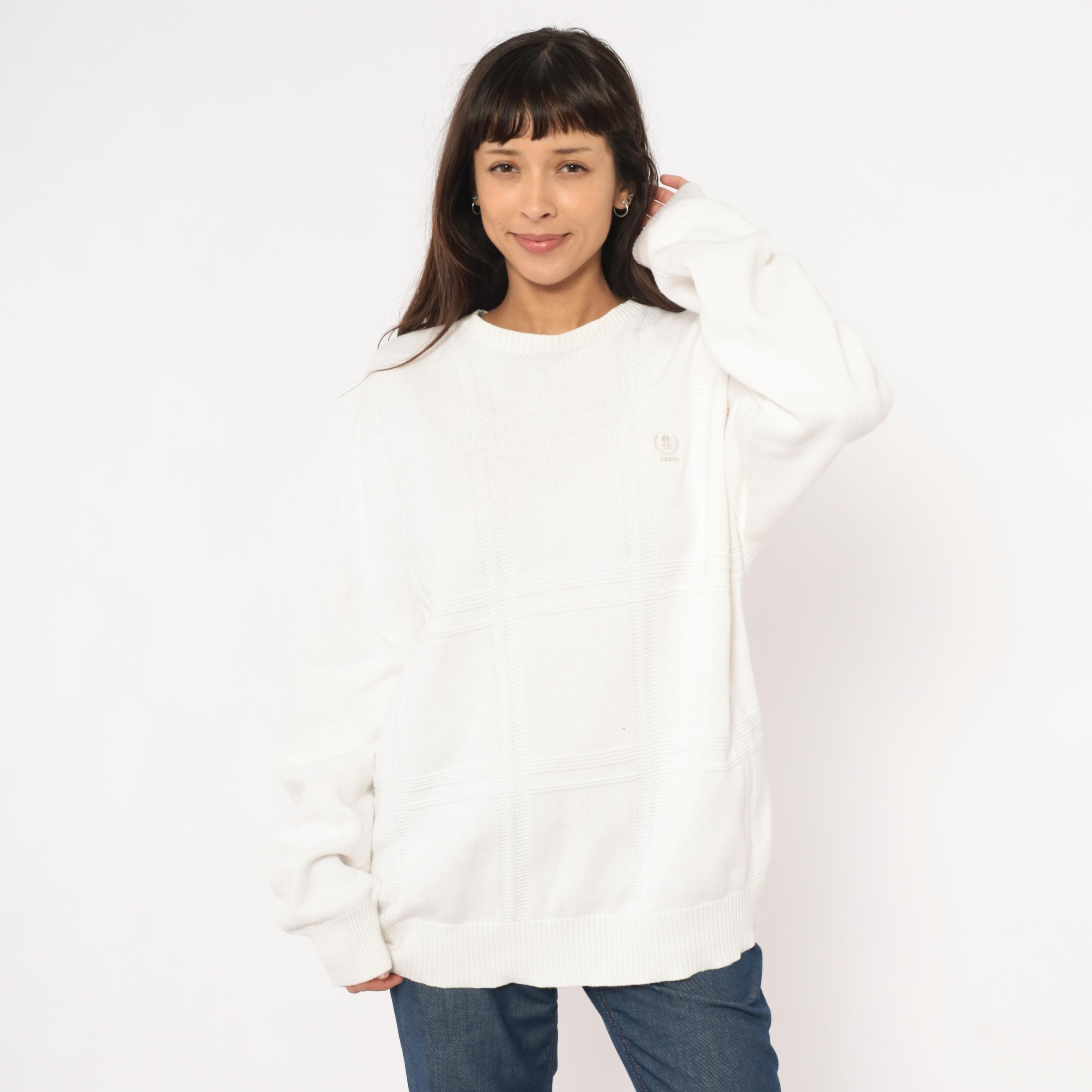 90s white crewneck pullover sweater from Izod with a raised windowpane grid pattern across the front body. Embroidered tonal brand logo on the upper left chest, ribbed crew neckline, cuffs, and waistband.