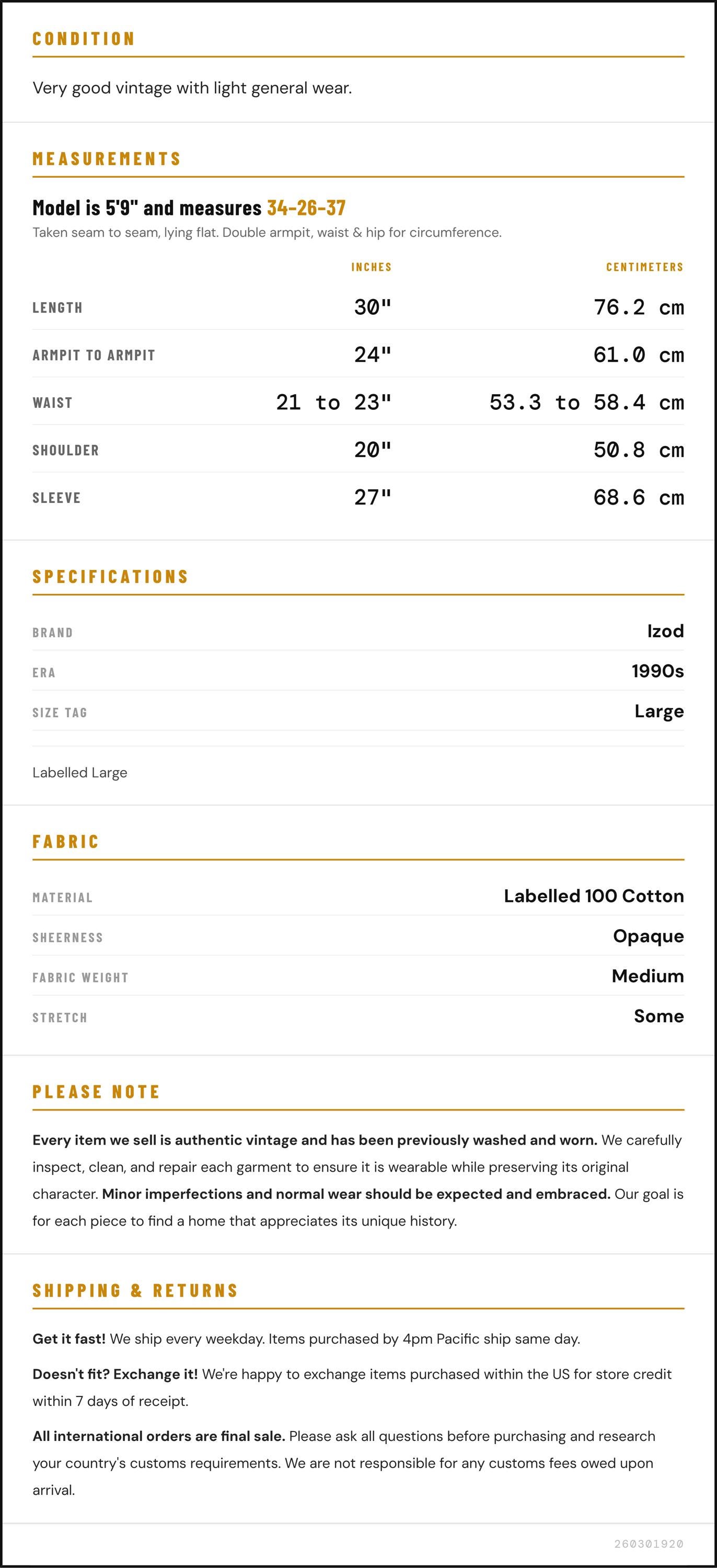 Vintage denim was usually made without any stretch, unlike modern jeans. Check the measurements to ensure proper fit, and remember to give yourself a little wiggle room in the waist and hips, depending on your preferred fit.