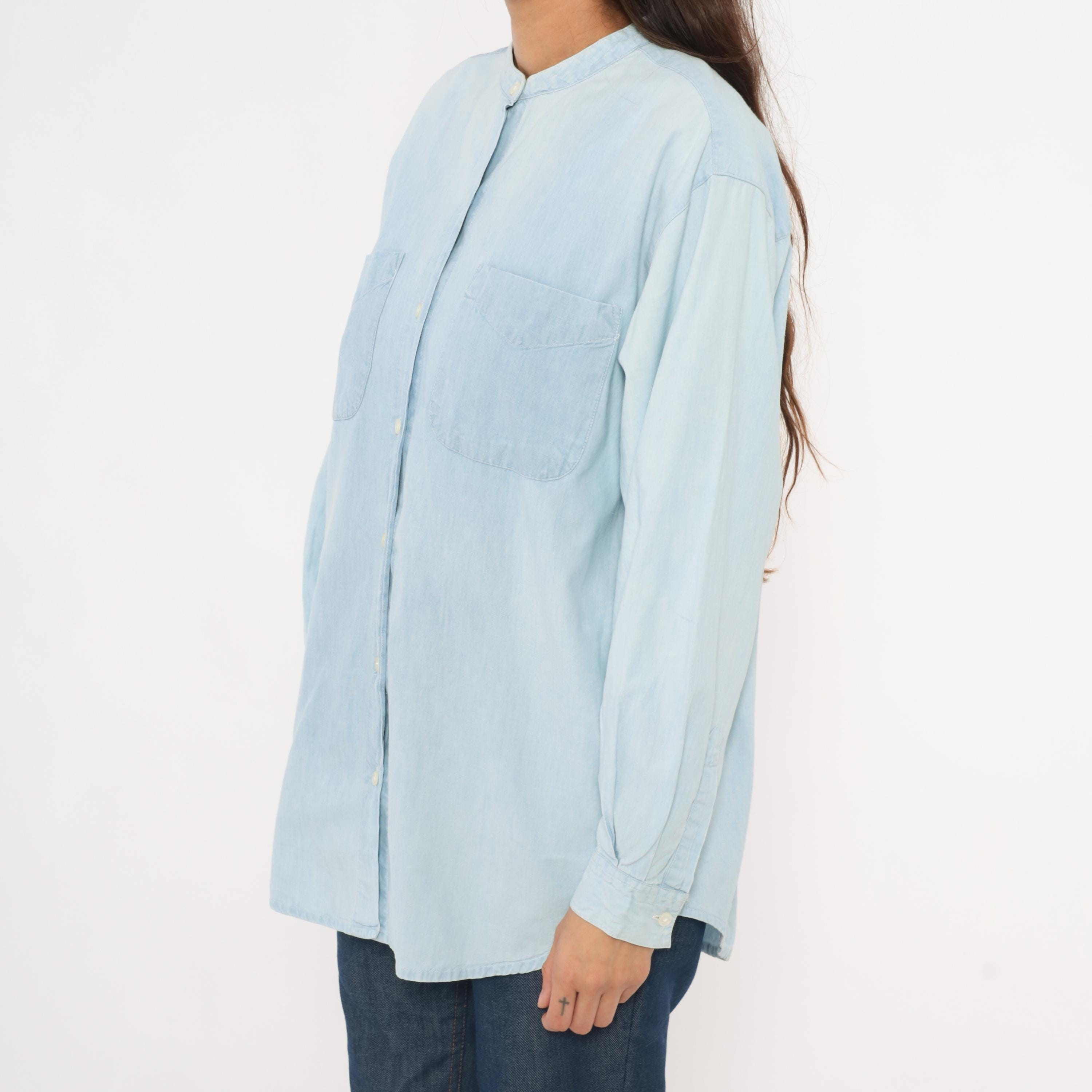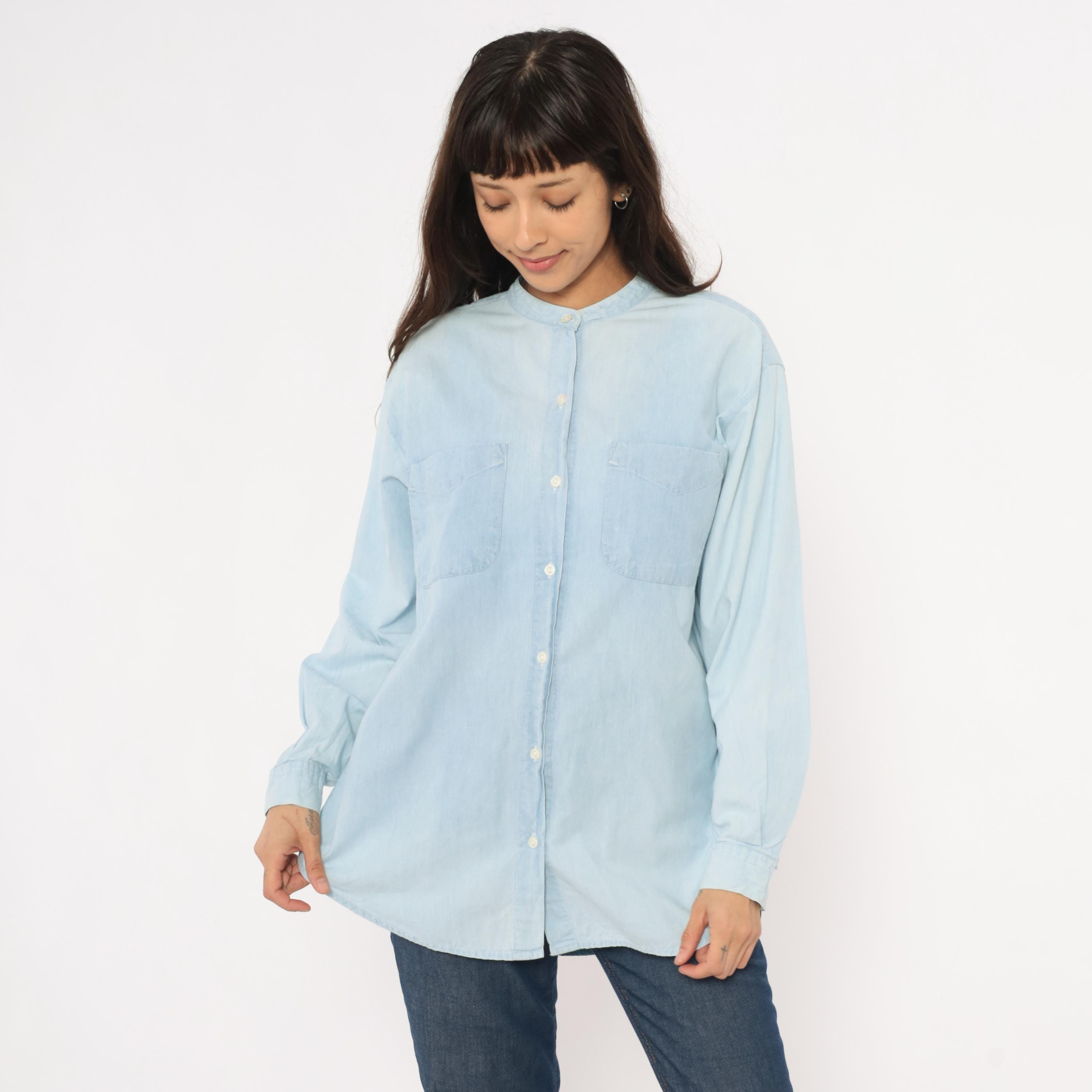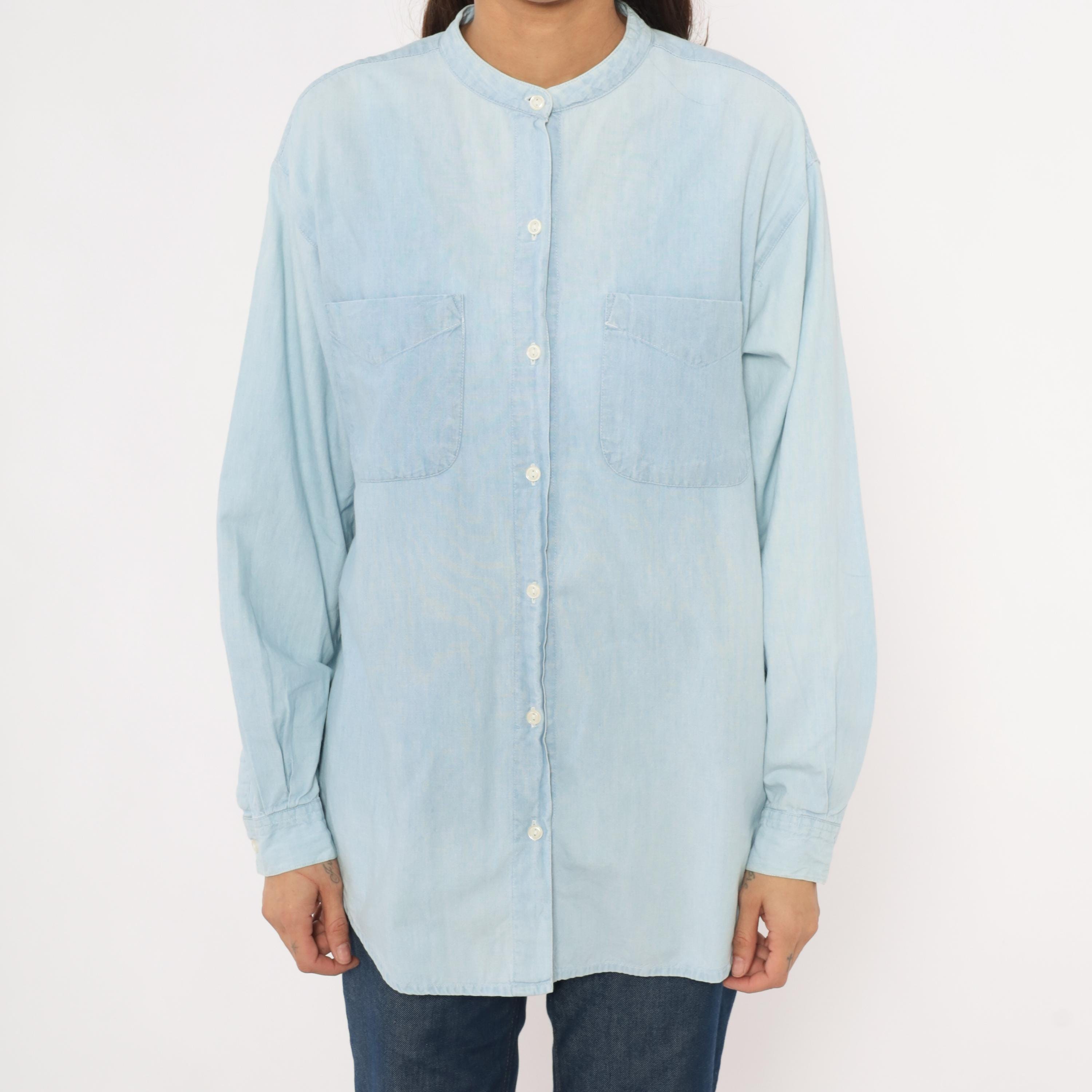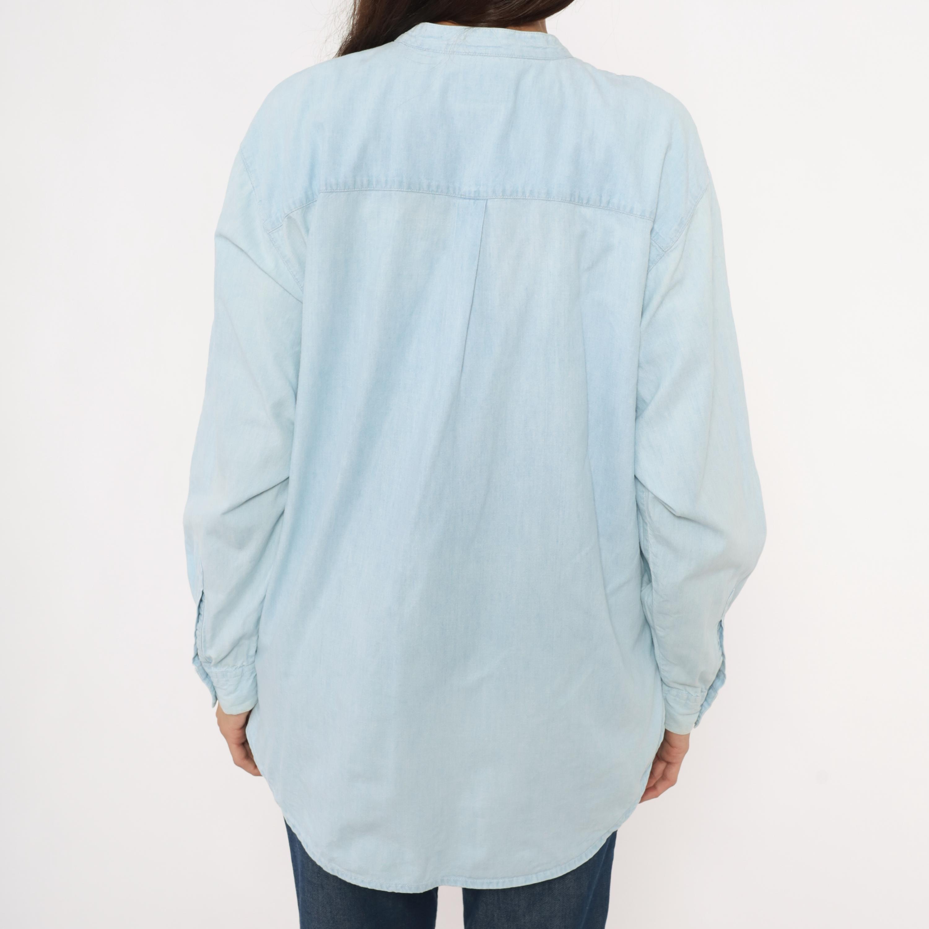 90s light blue chambray shirt from Solutions Original with a mandarin band collar and full button front closure. Two large patch pockets on the chest, long sleeves with single-button cuffs, and a curved hem. Sky blue washed denim tone throughout with white buttons, back yoke seam, and a relaxed tunic-length body.
