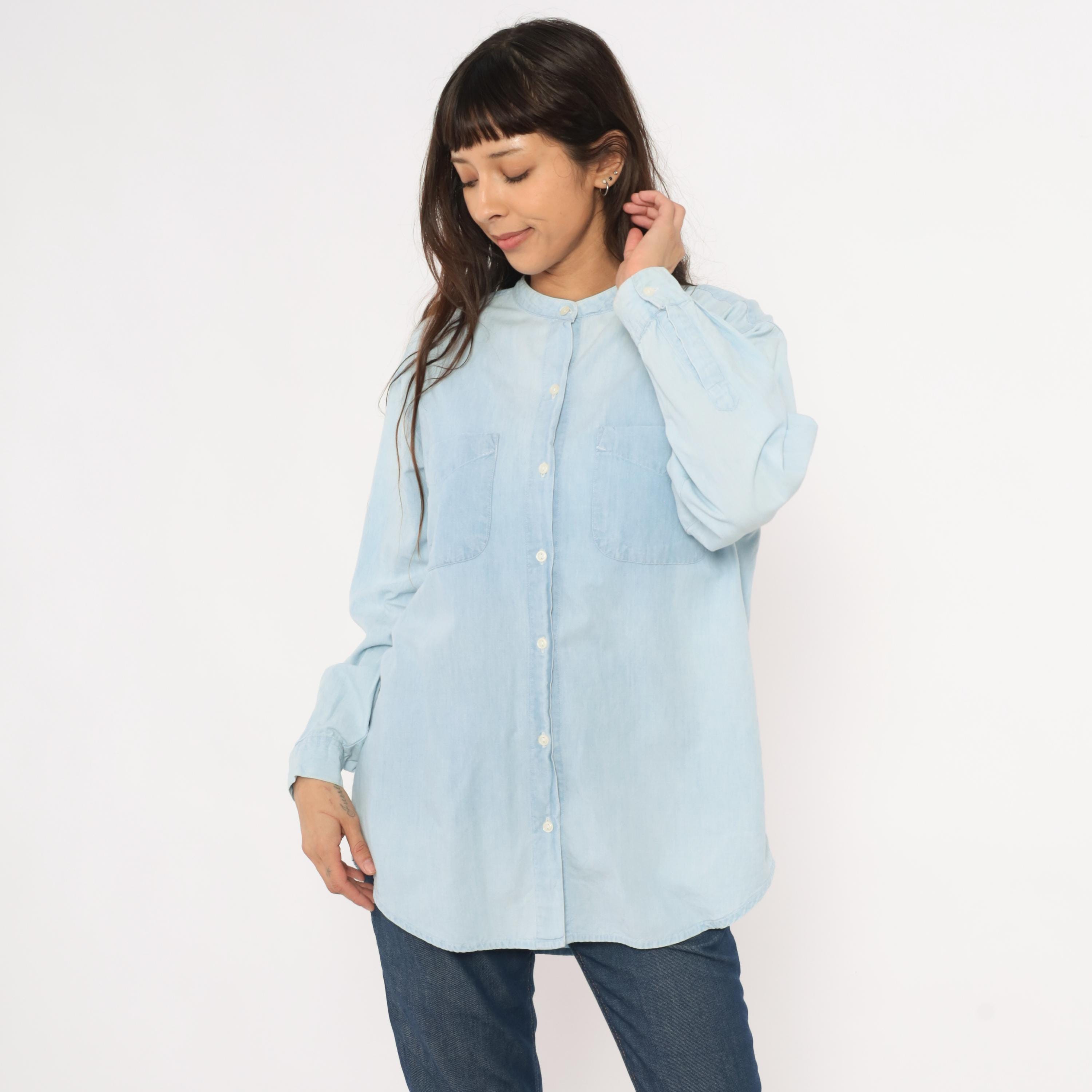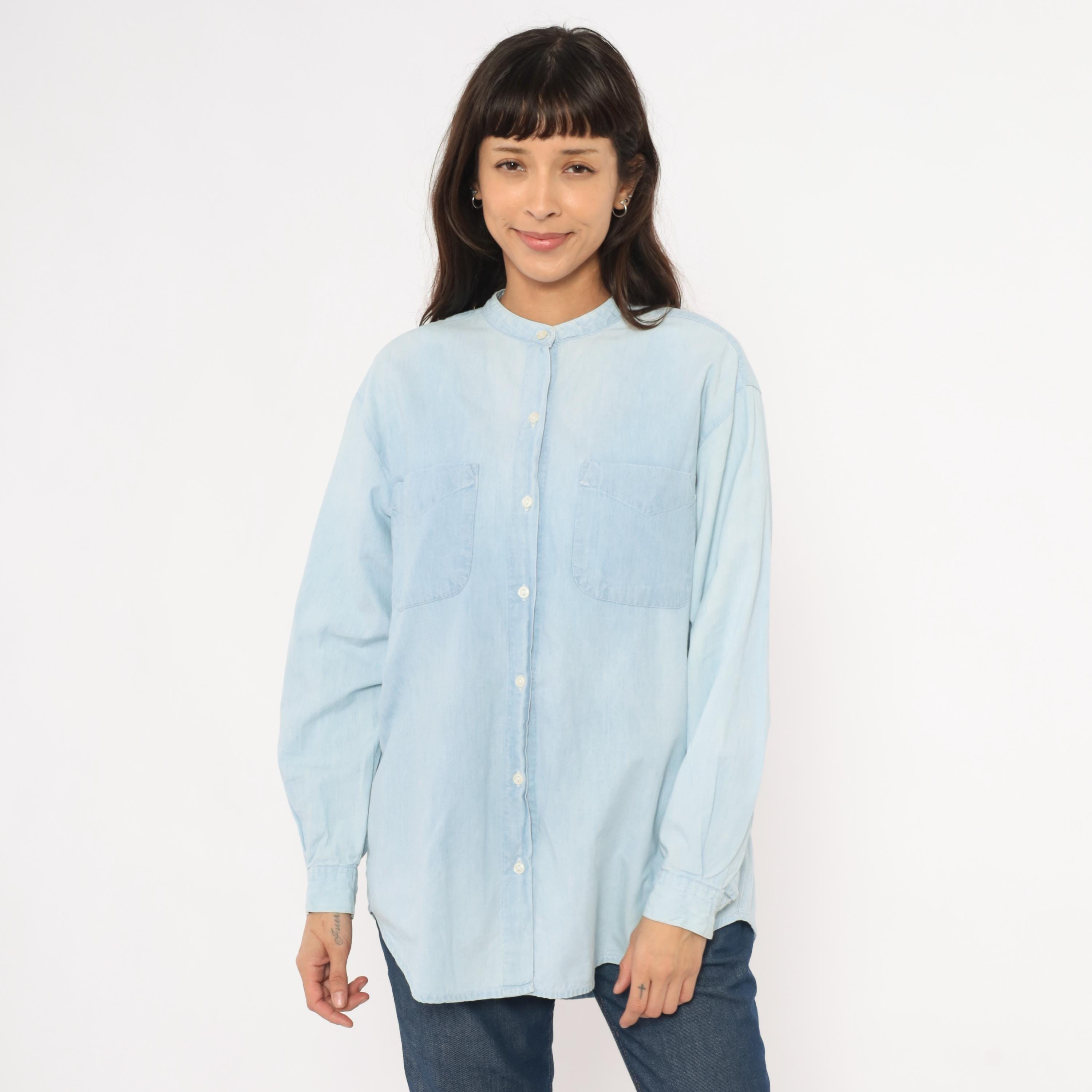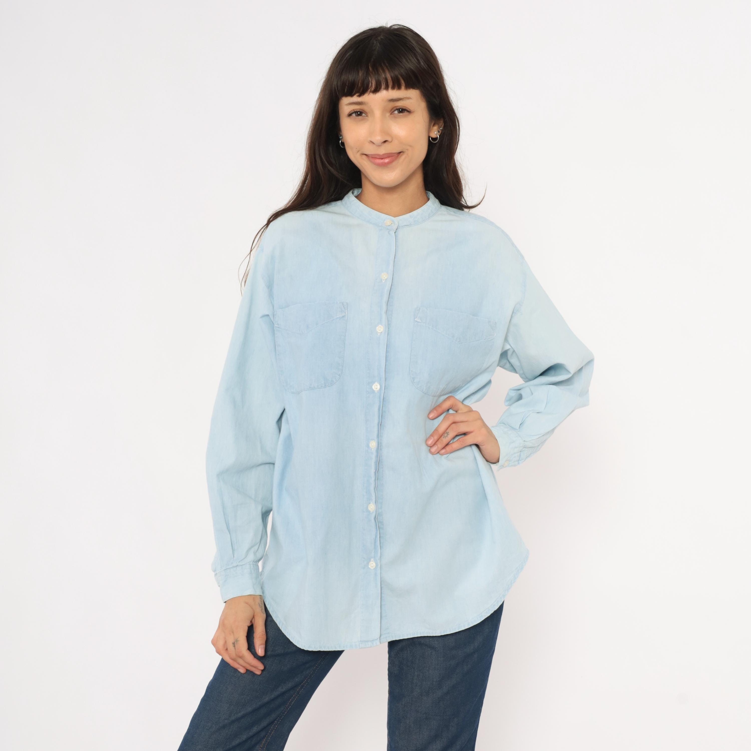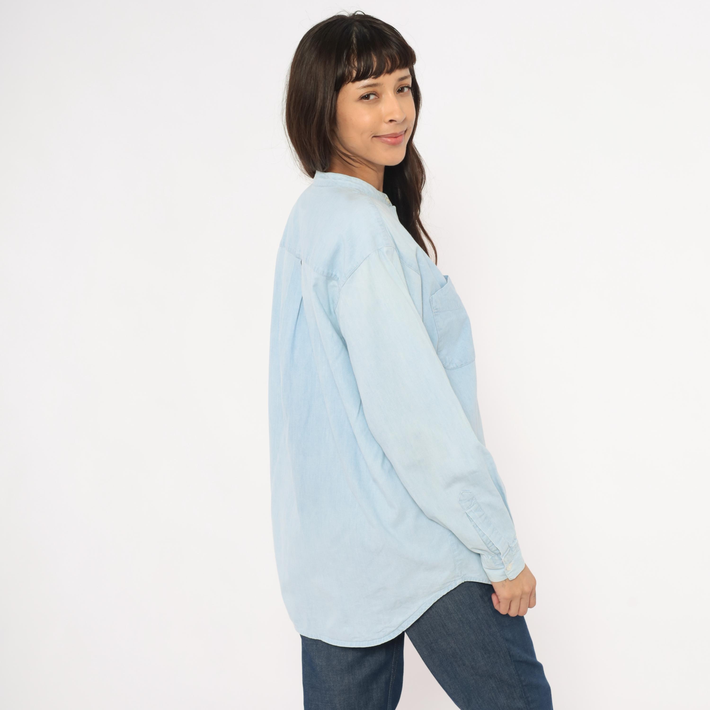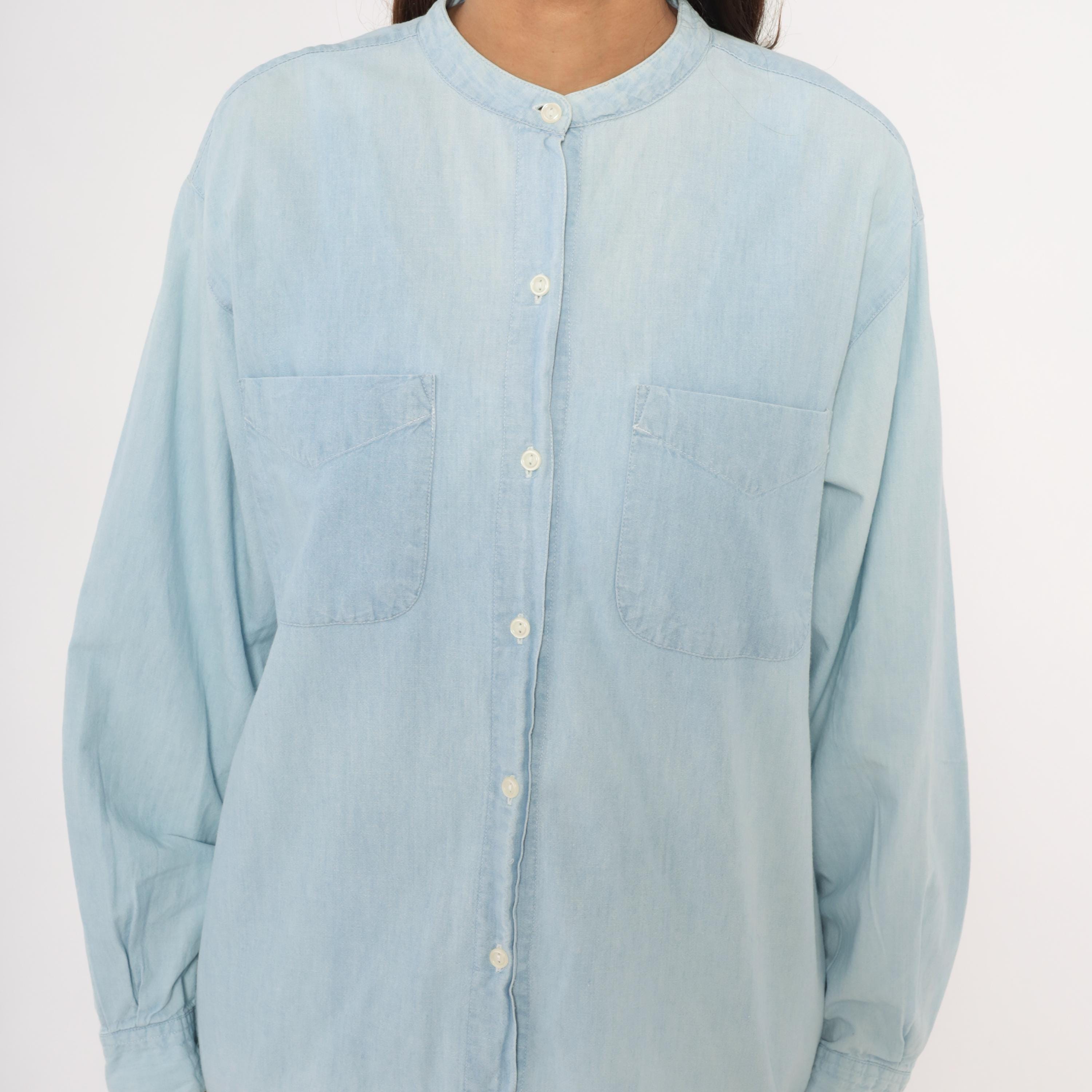 90s light blue chambray shirt from Solutions Original with a mandarin band collar and full button front closure. Two large patch pockets on the chest, long sleeves with single-button cuffs, and a curved hem. Sky blue washed denim tone throughout with white buttons, back yoke seam, and a relaxed tunic-length body.