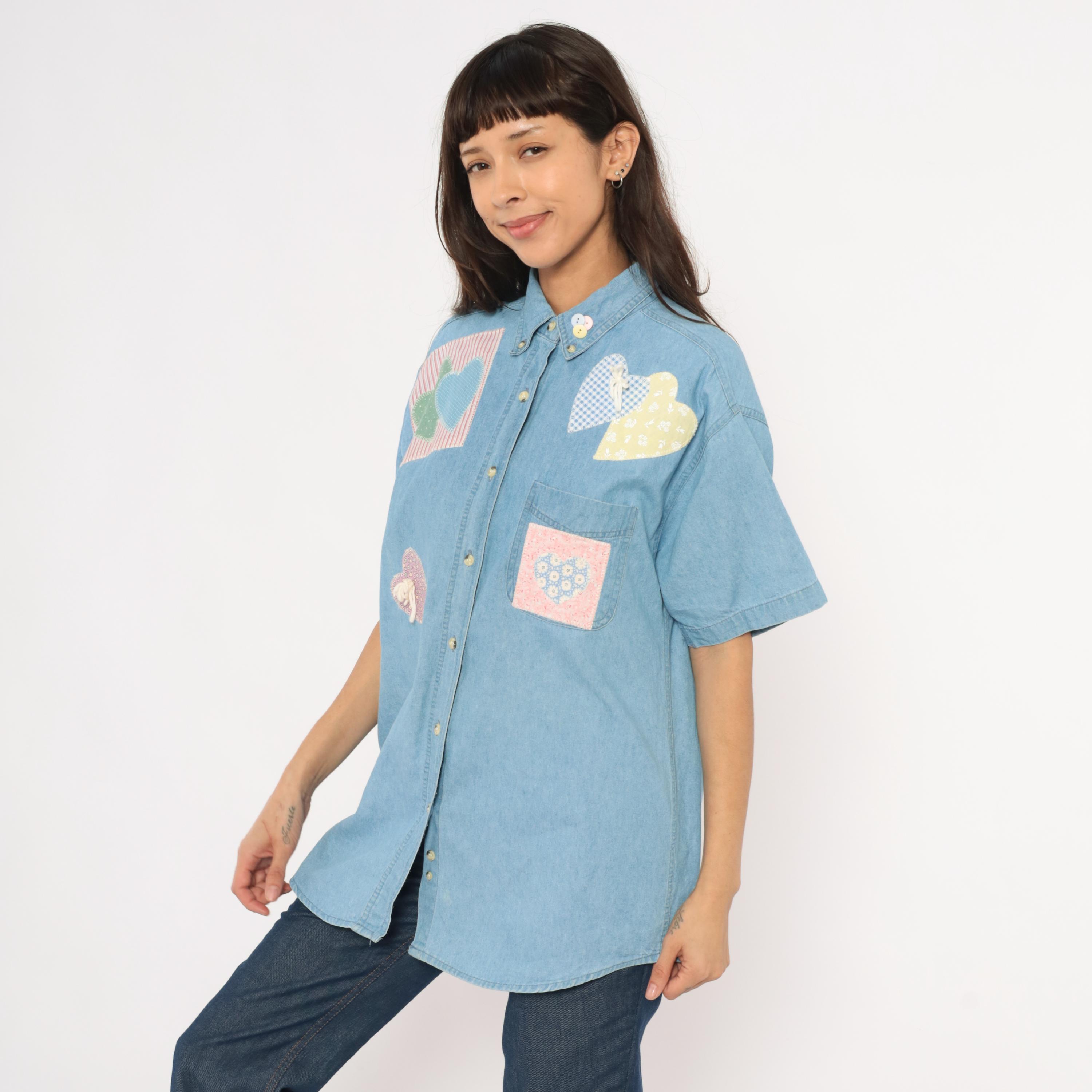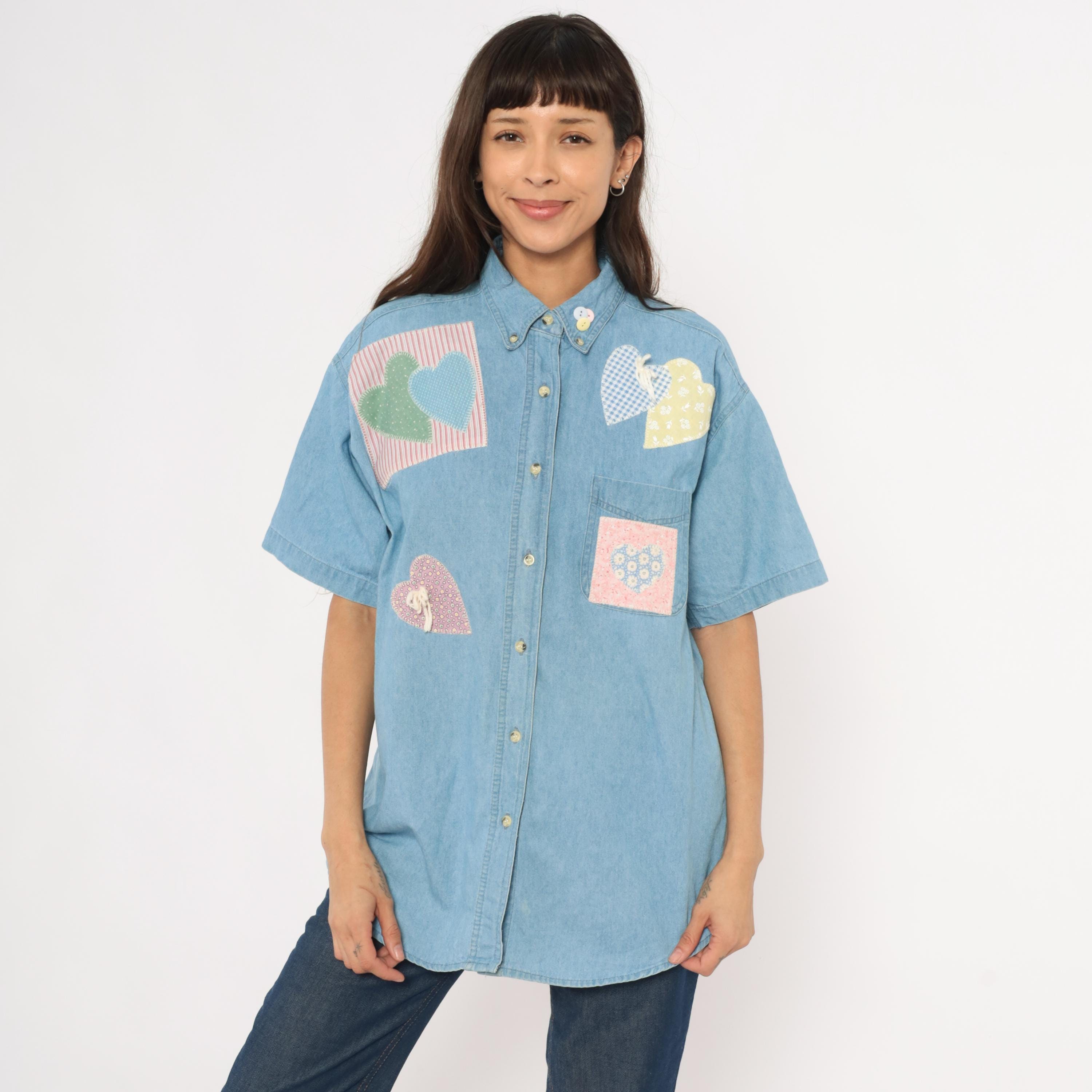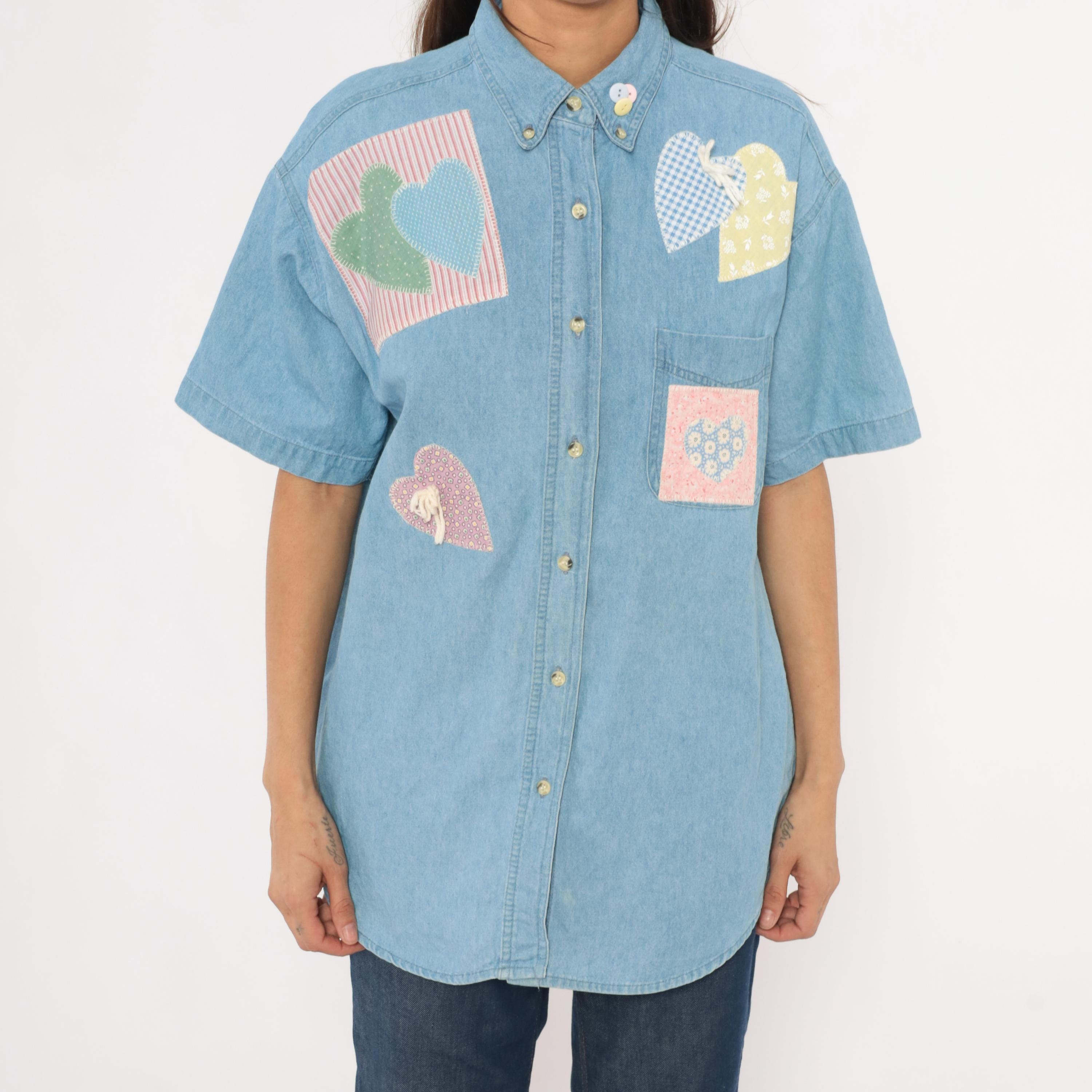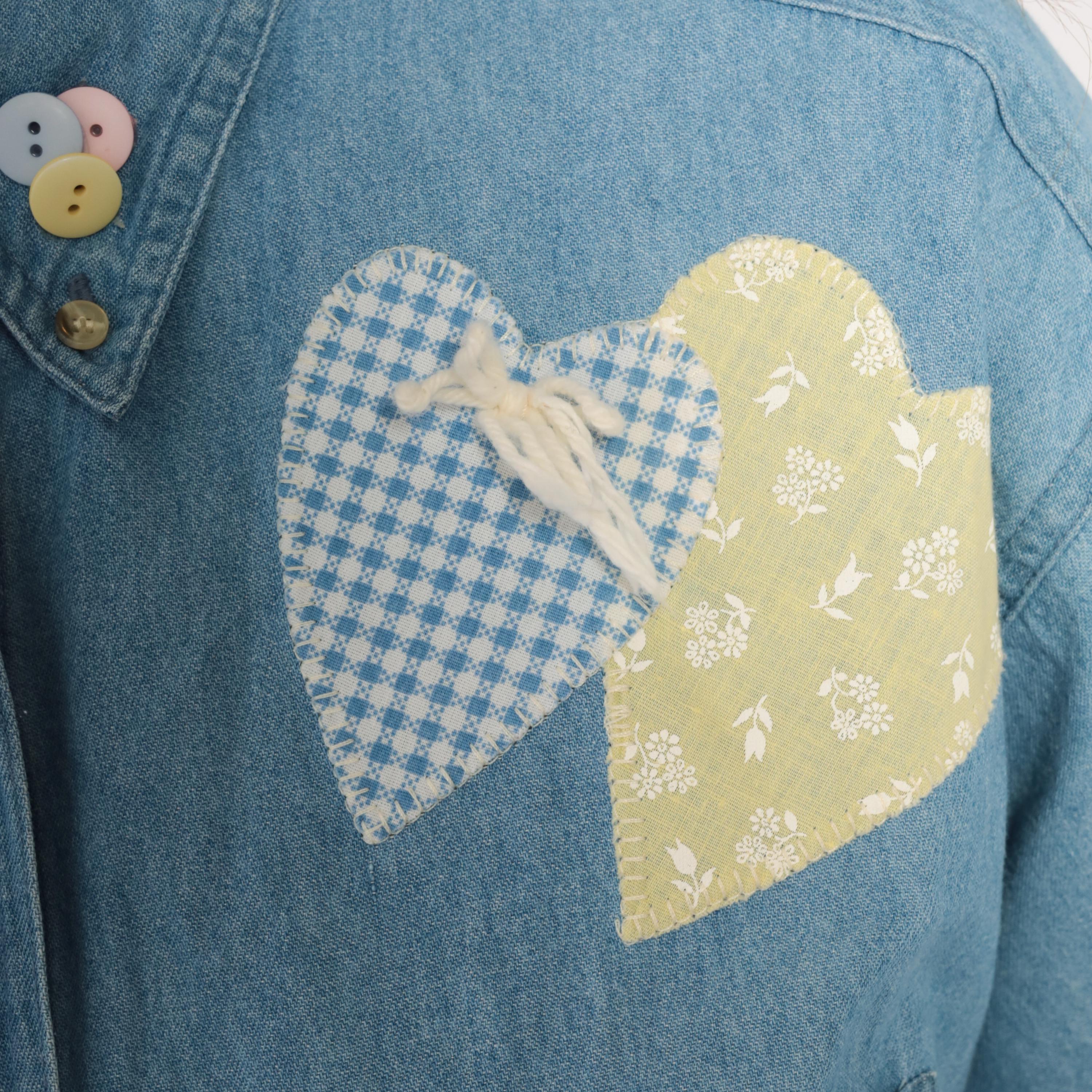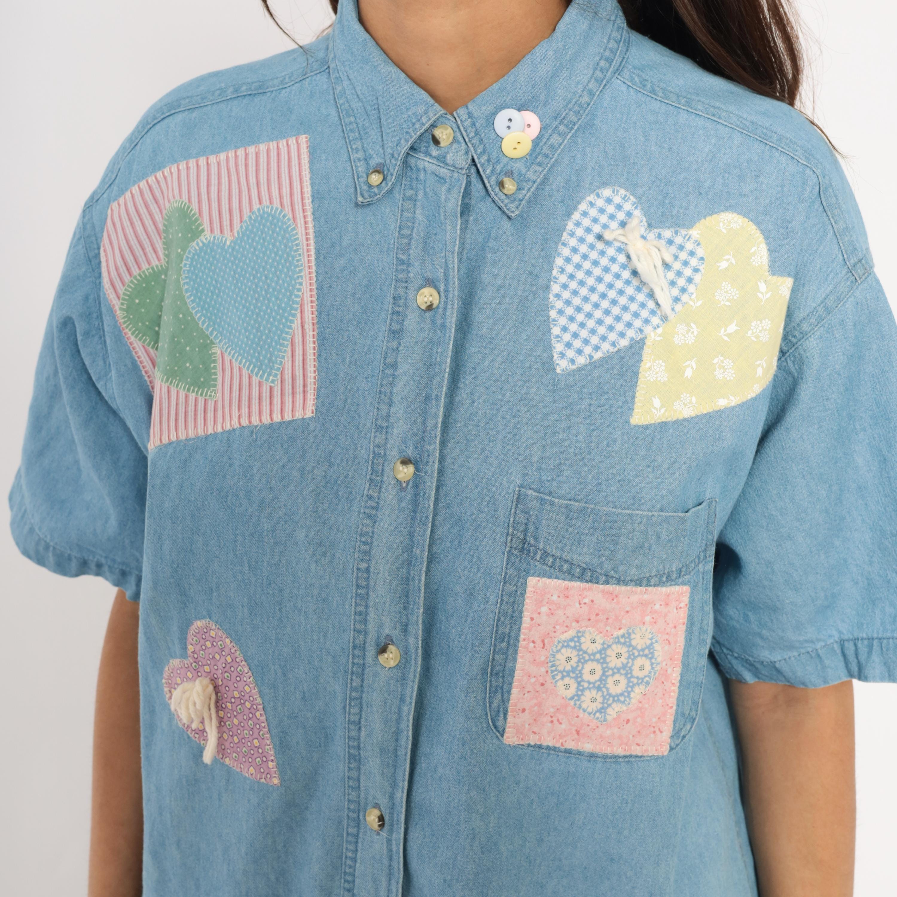 90s light wash denim button-front shirt from Satin Stitches Inc. with patchwork heart appliqués across the front in pink striped, green polka dot, blue gingham, yellow floral, and purple calico fabrics. Pointed button-down collar with decorative pastel buttons at the top, one chest pocket with a pink floral fabric overlay.