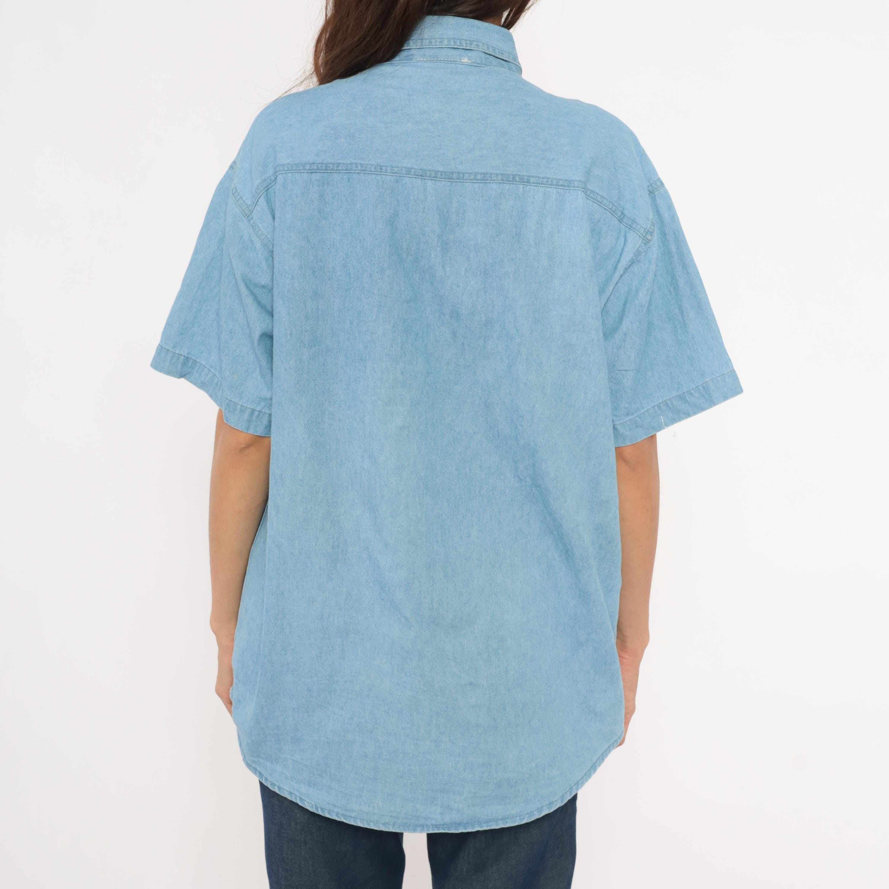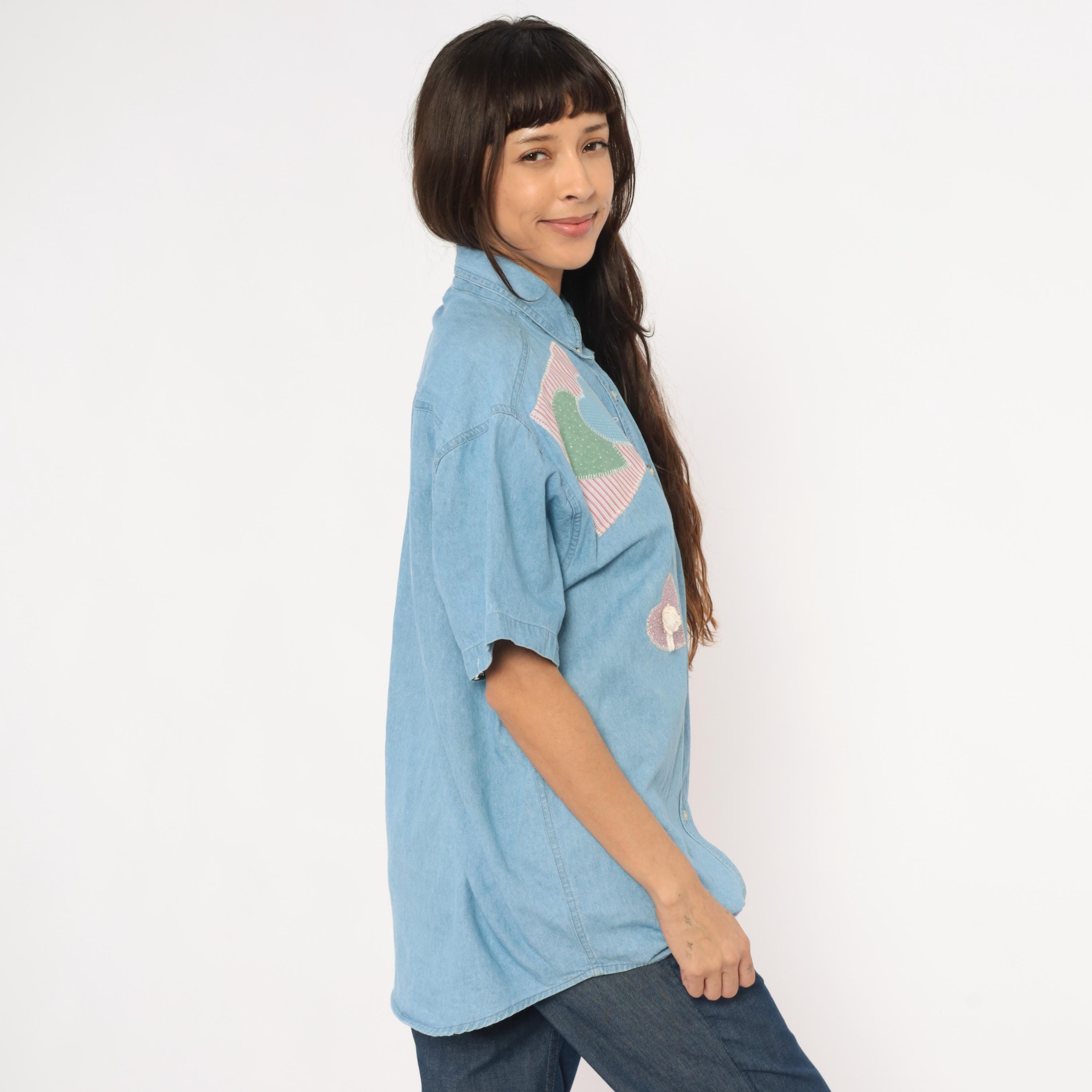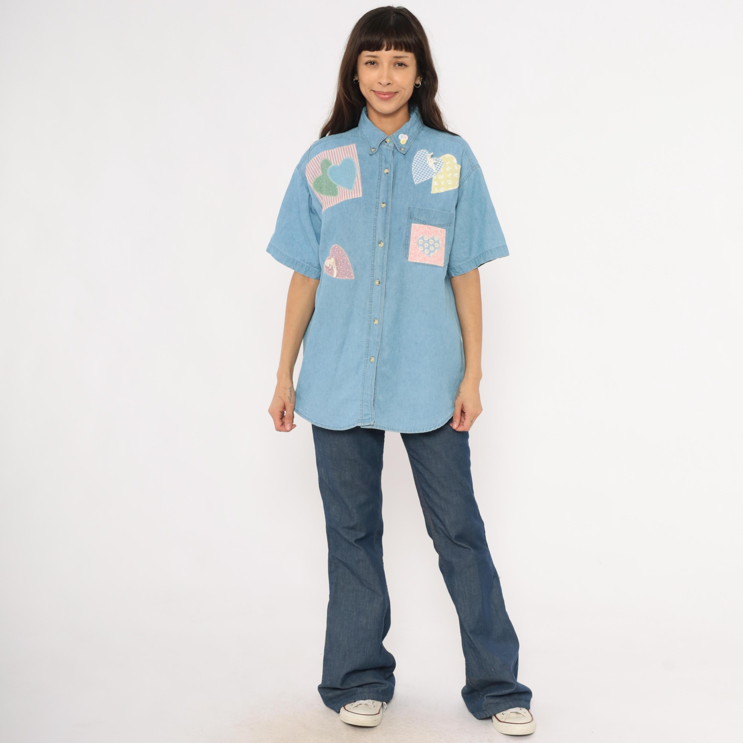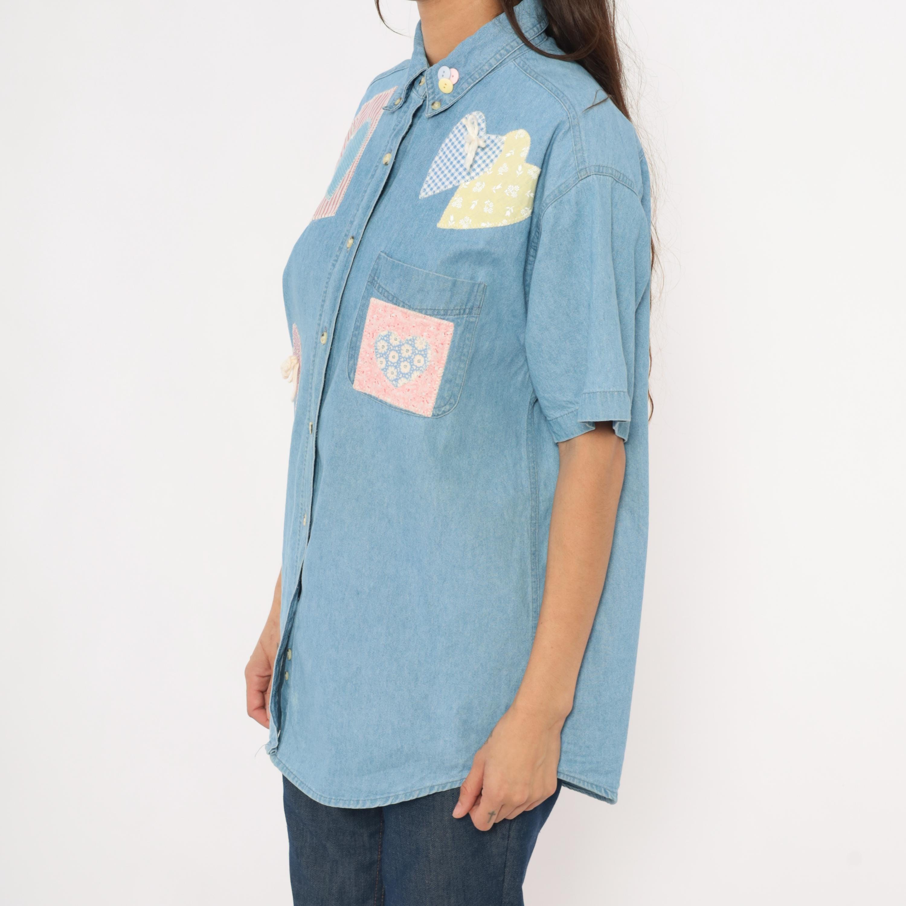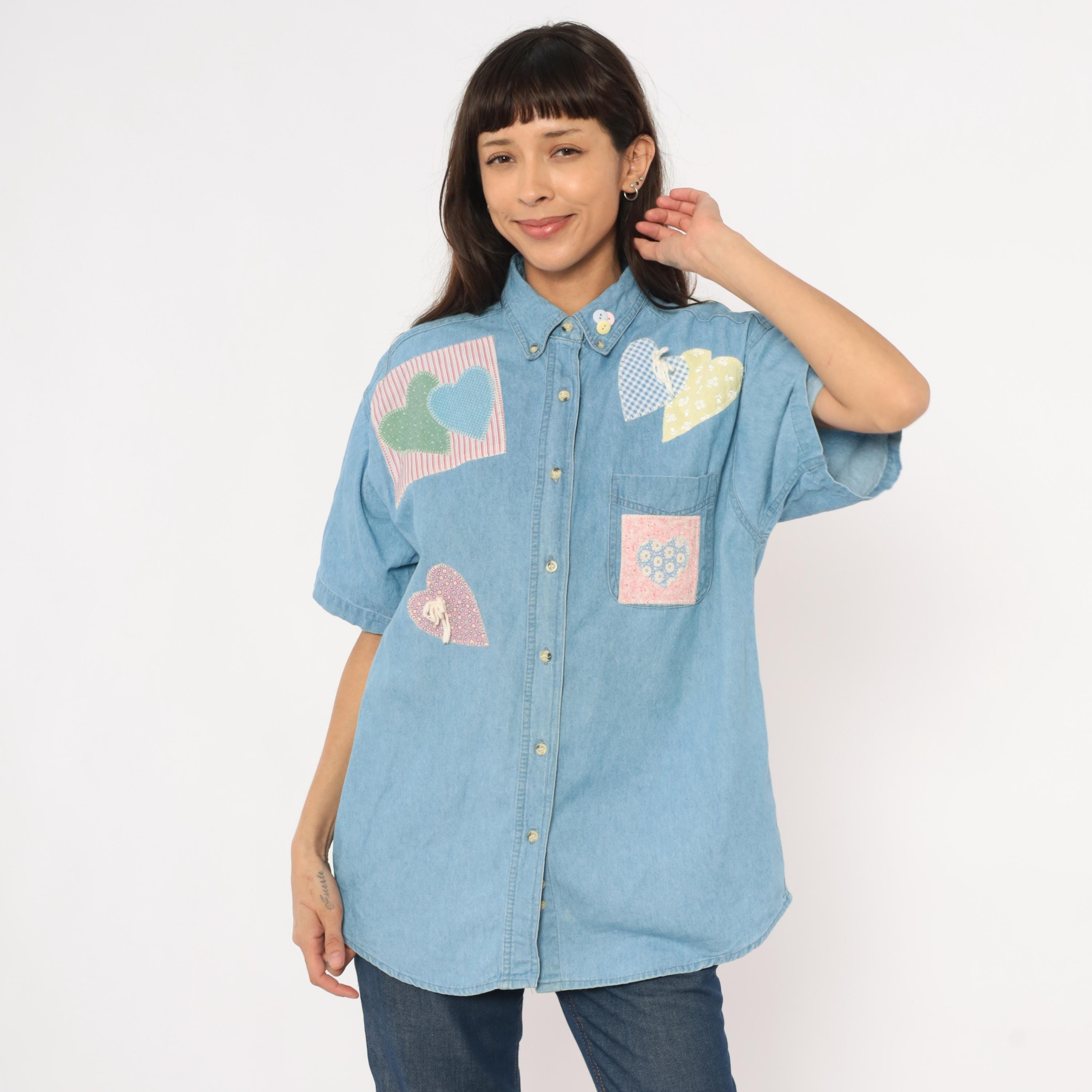 90s light wash denim button-front shirt from Satin Stitches Inc. with patchwork heart appliqués across the front in pink striped, green polka dot, blue gingham, yellow floral, and purple calico fabrics. Pointed button-down collar with decorative pastel buttons at the top, one chest pocket with a pink floral fabric overlay.