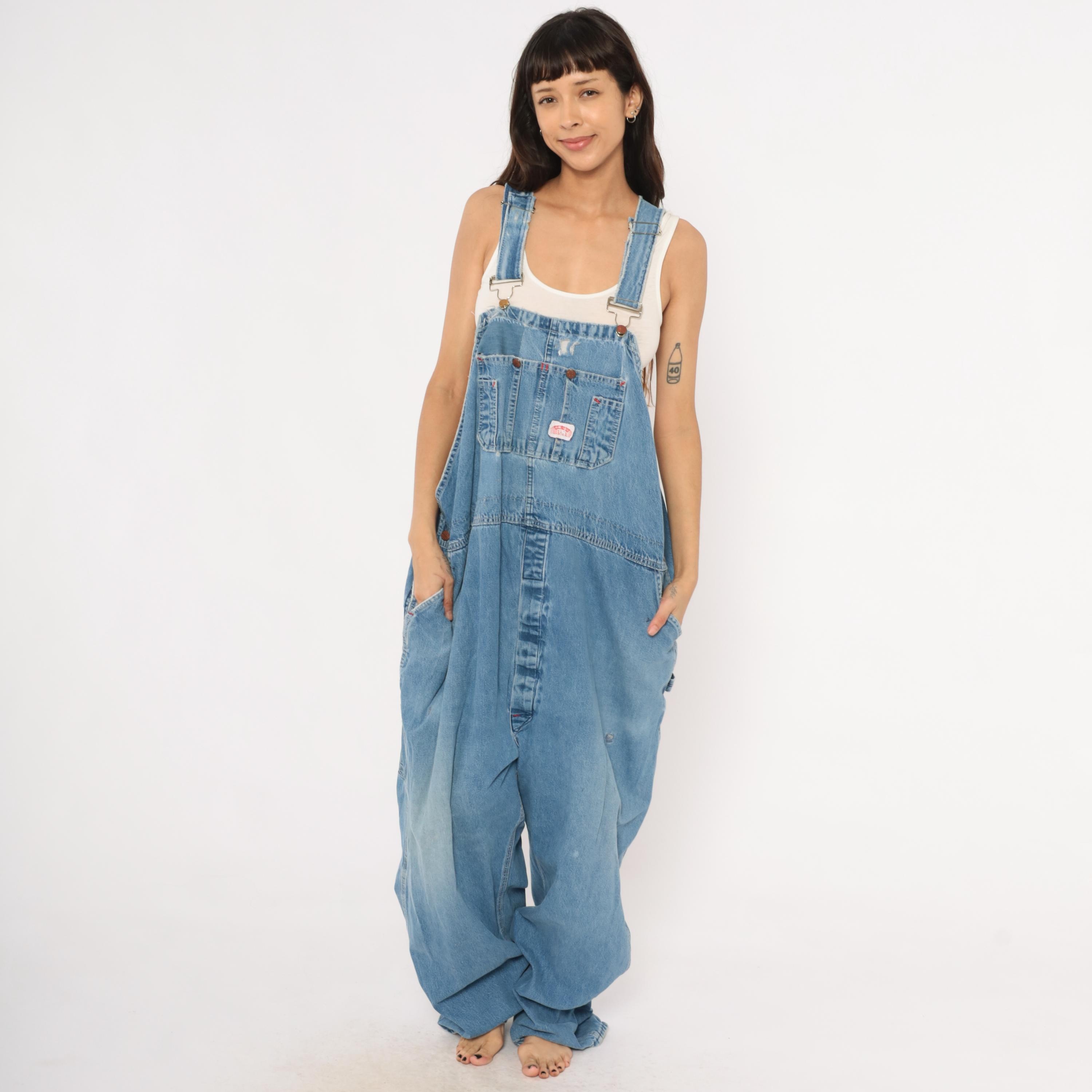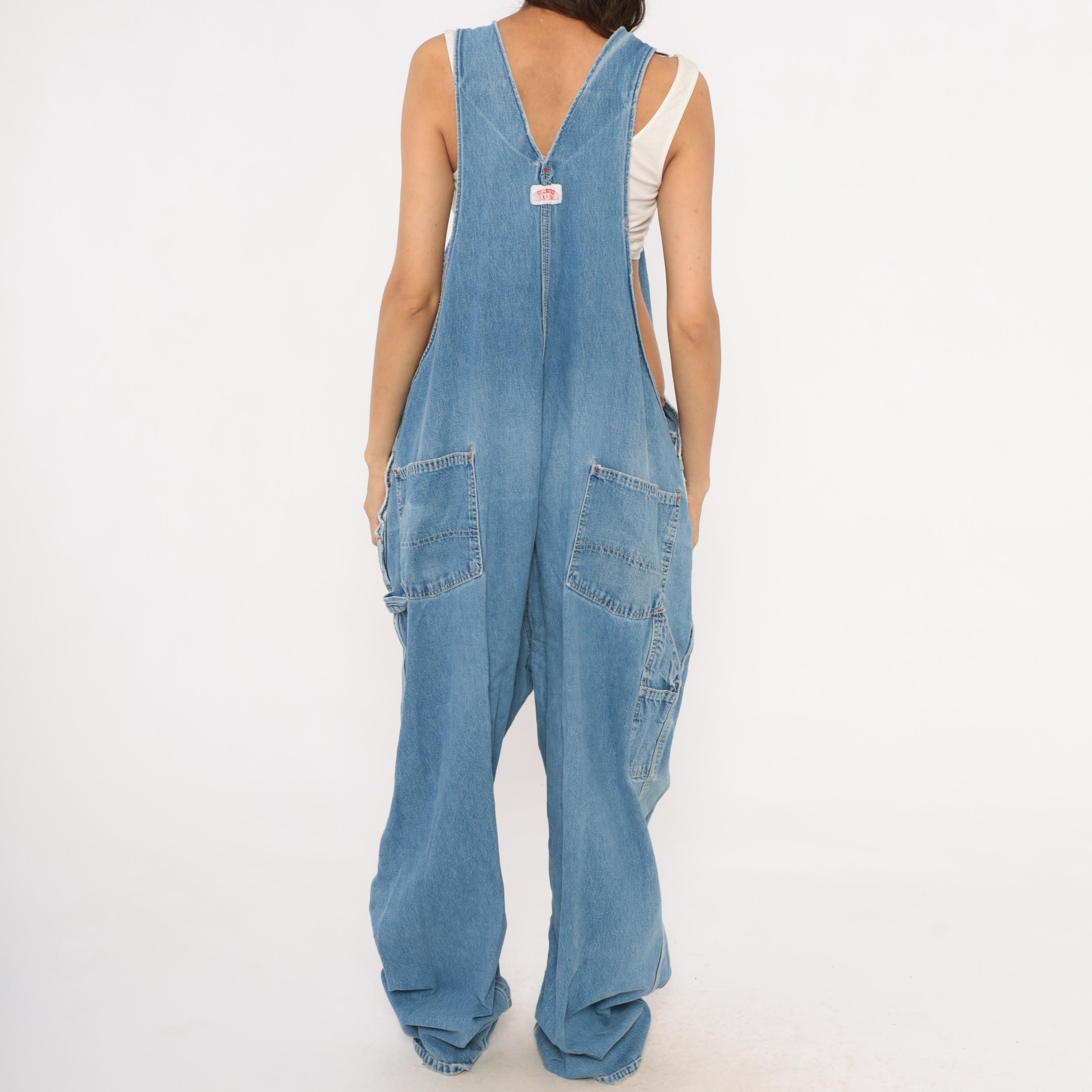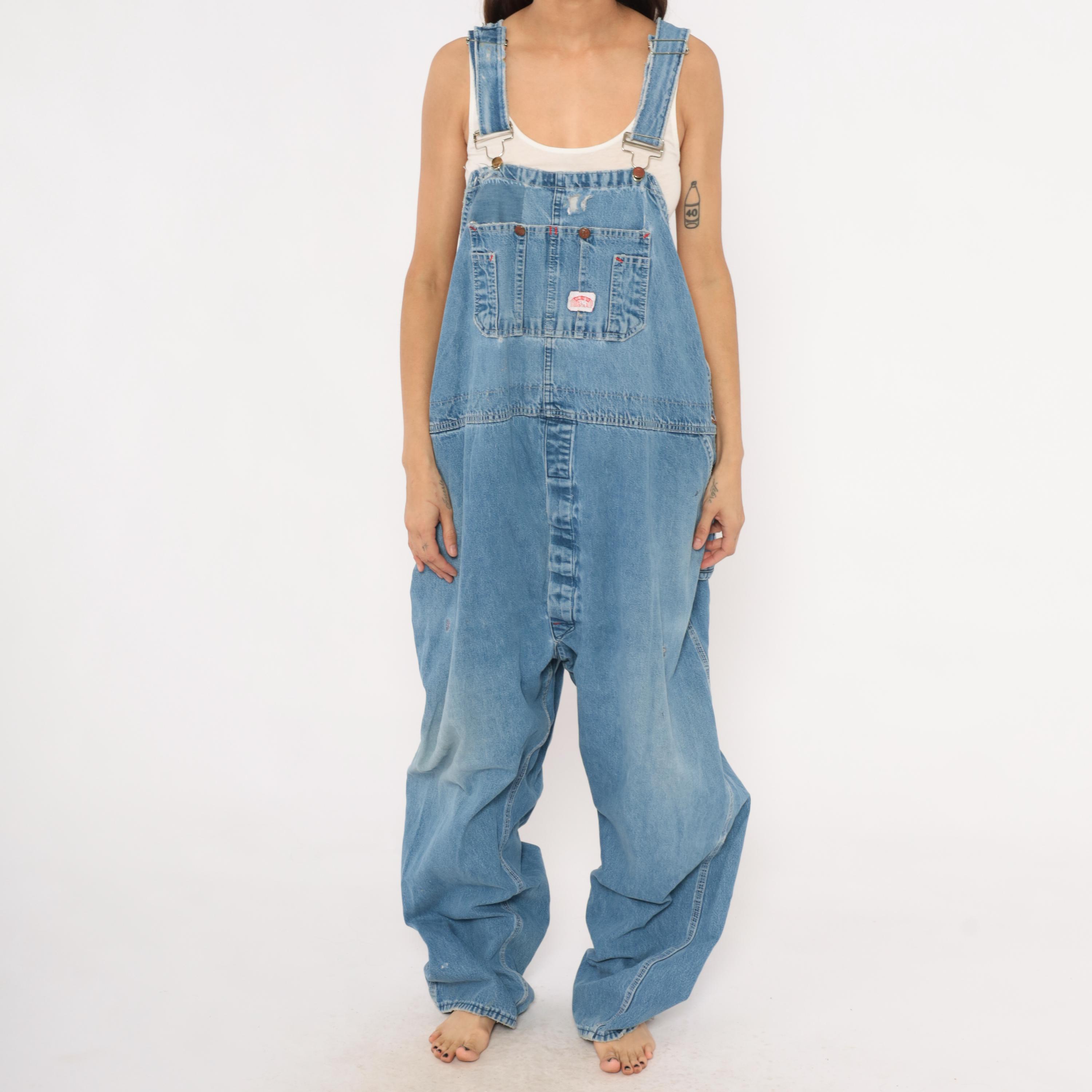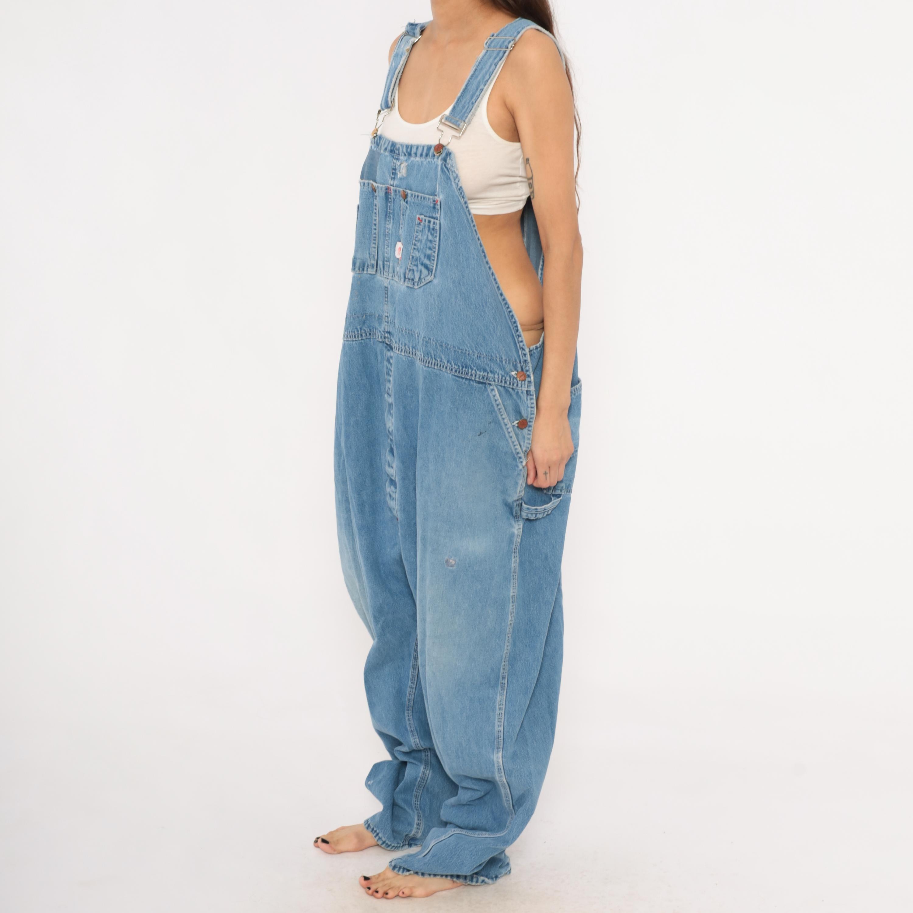90s light wash denim bib overalls with a relaxed, baggy silhouette and wide leg cut. Front bib panel with dual chest pockets, copper-tone snap buttons, and adjustable metal buckle straps. Side button closures at the waist, deep side seam pockets, and a rear V-back with brand patch. Carpenter-style construction with visible fading at the knees and thighs, and minor distressing along the bib.