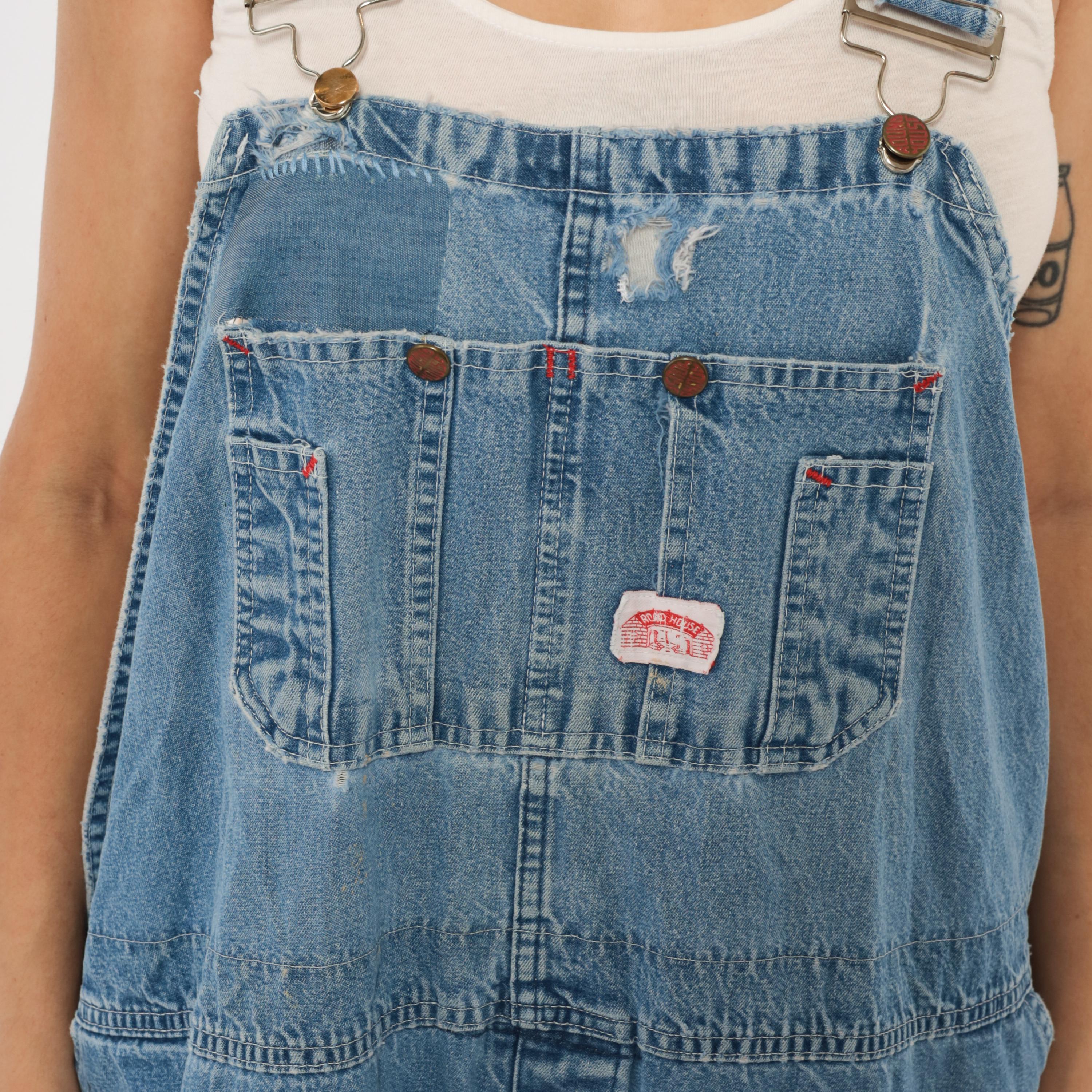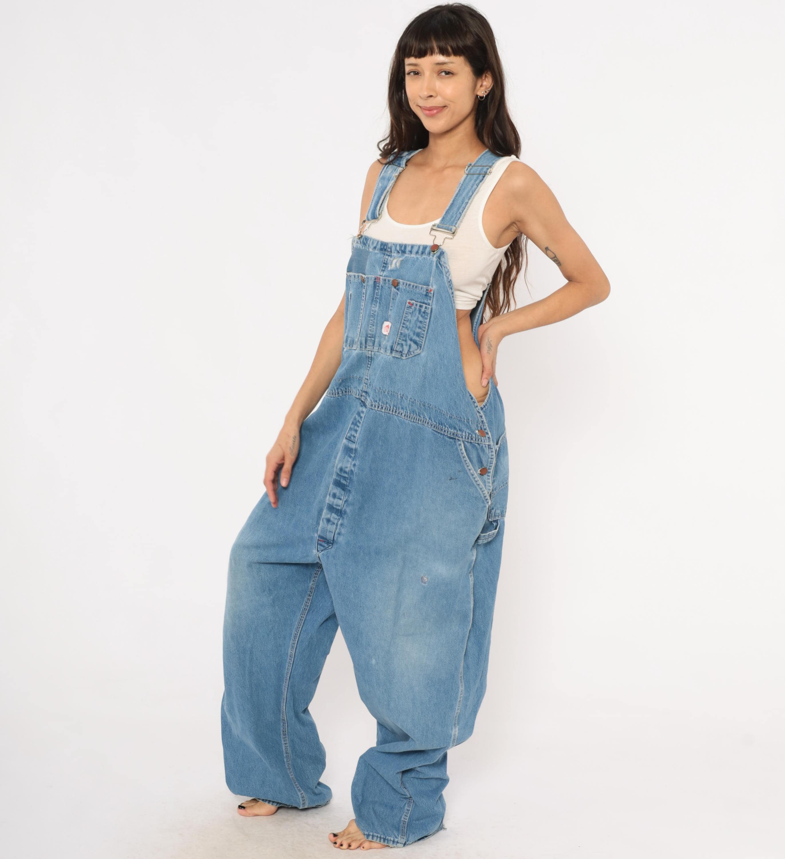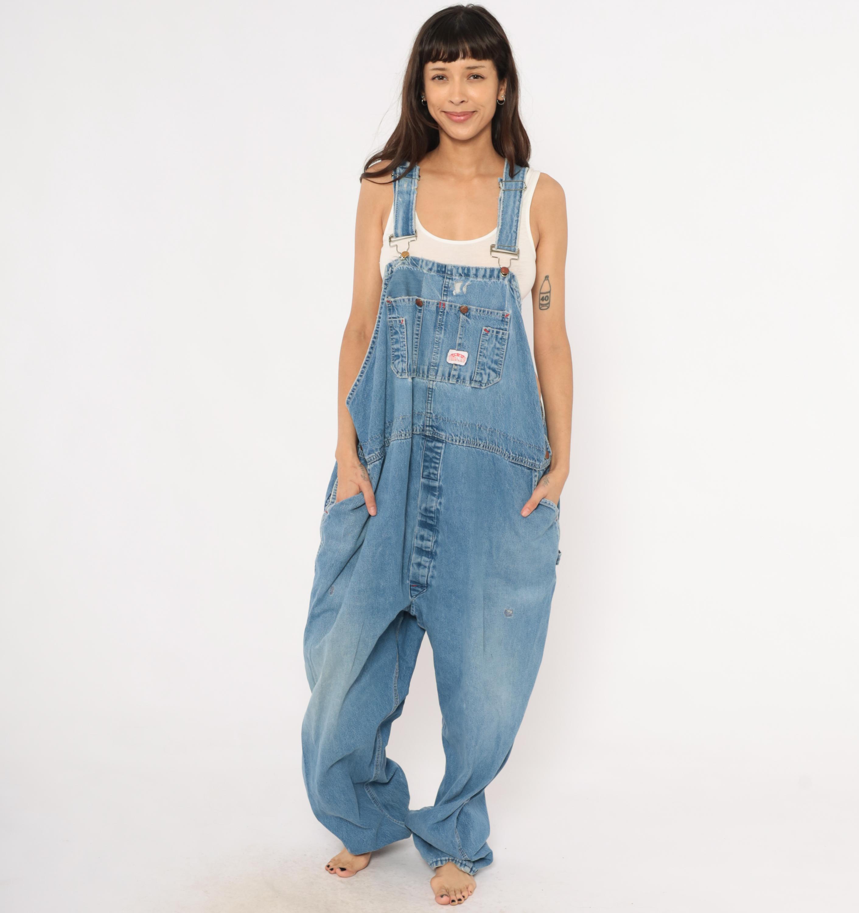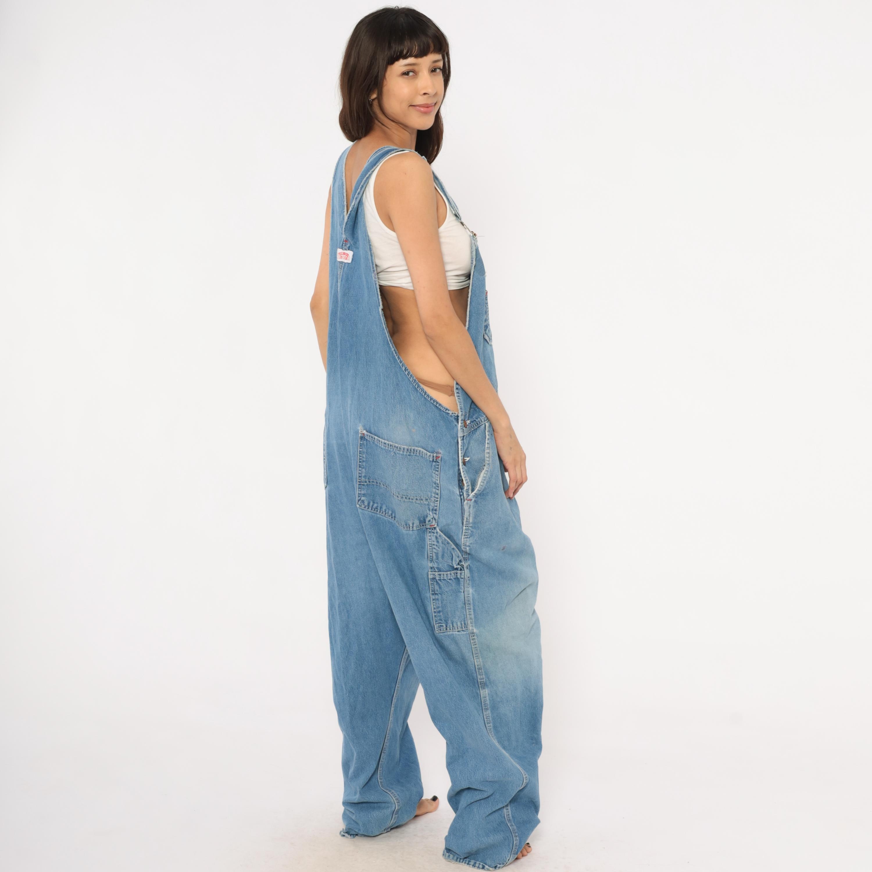 90s light wash denim bib overalls with a relaxed, baggy silhouette and wide leg cut. Front bib panel with dual chest pockets, copper-tone snap buttons, and adjustable metal buckle straps. Side button closures at the waist, deep side seam pockets, and a rear V-back with brand patch. Carpenter-style construction with visible fading at the knees and thighs, and minor distressing along the bib.