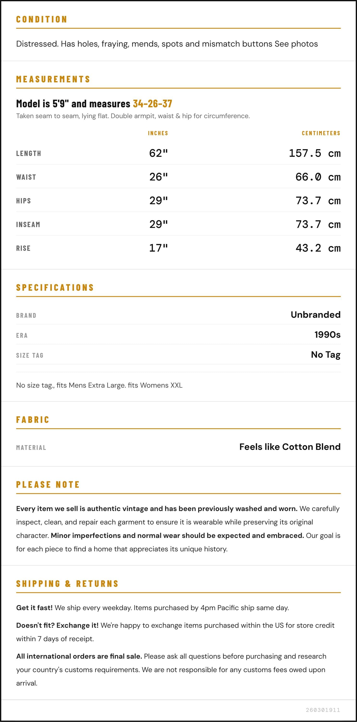 Condition: Distressed. Has holes, fraying, mends, spots and mismatch buttons See photos