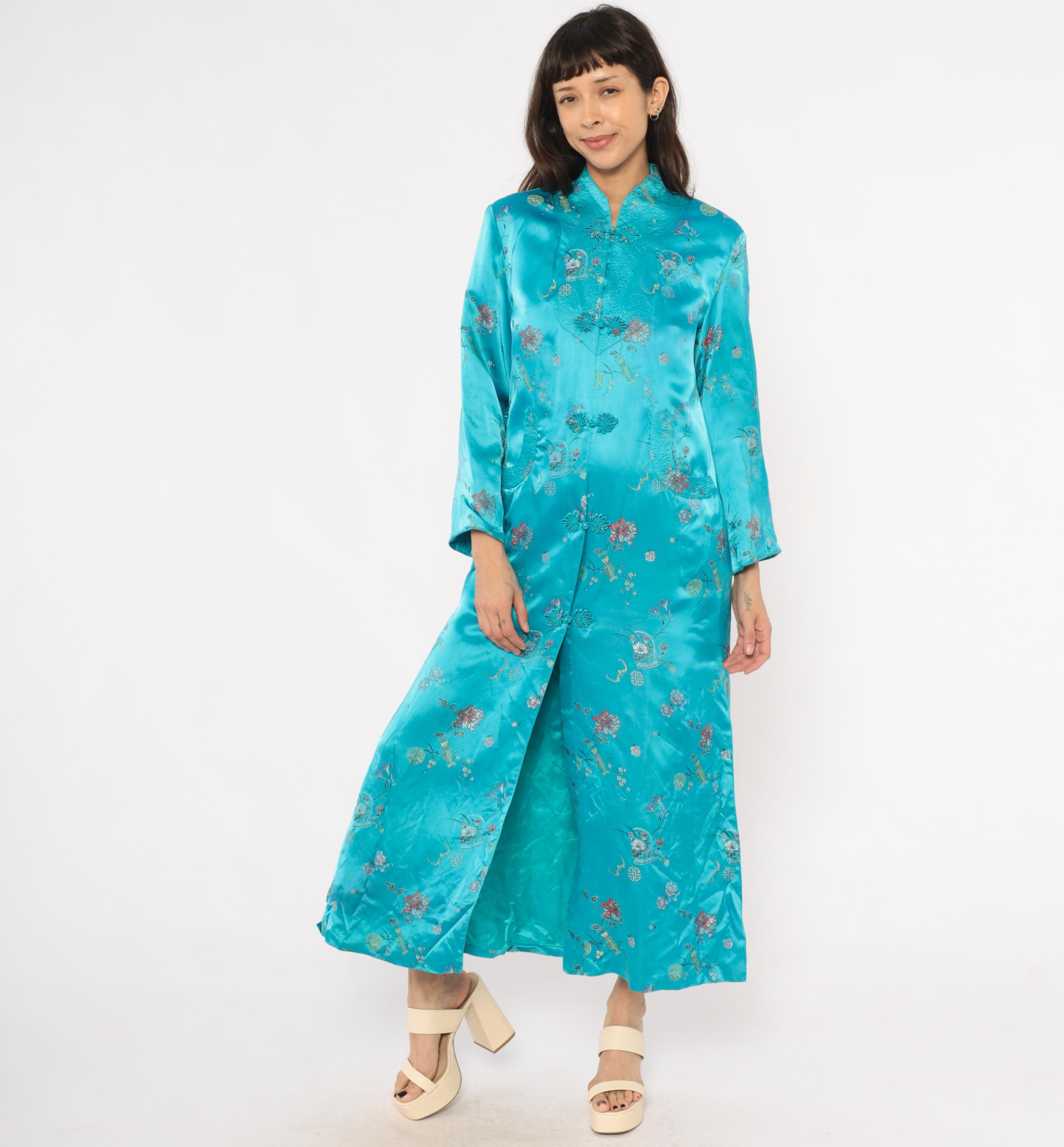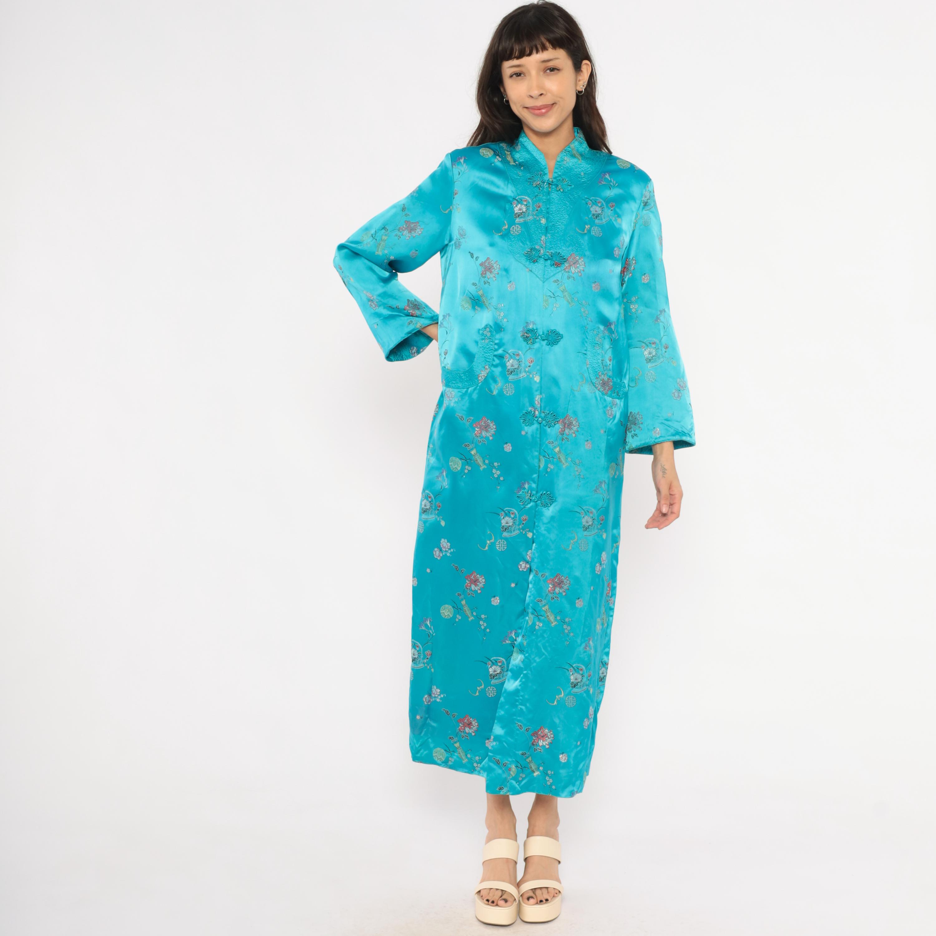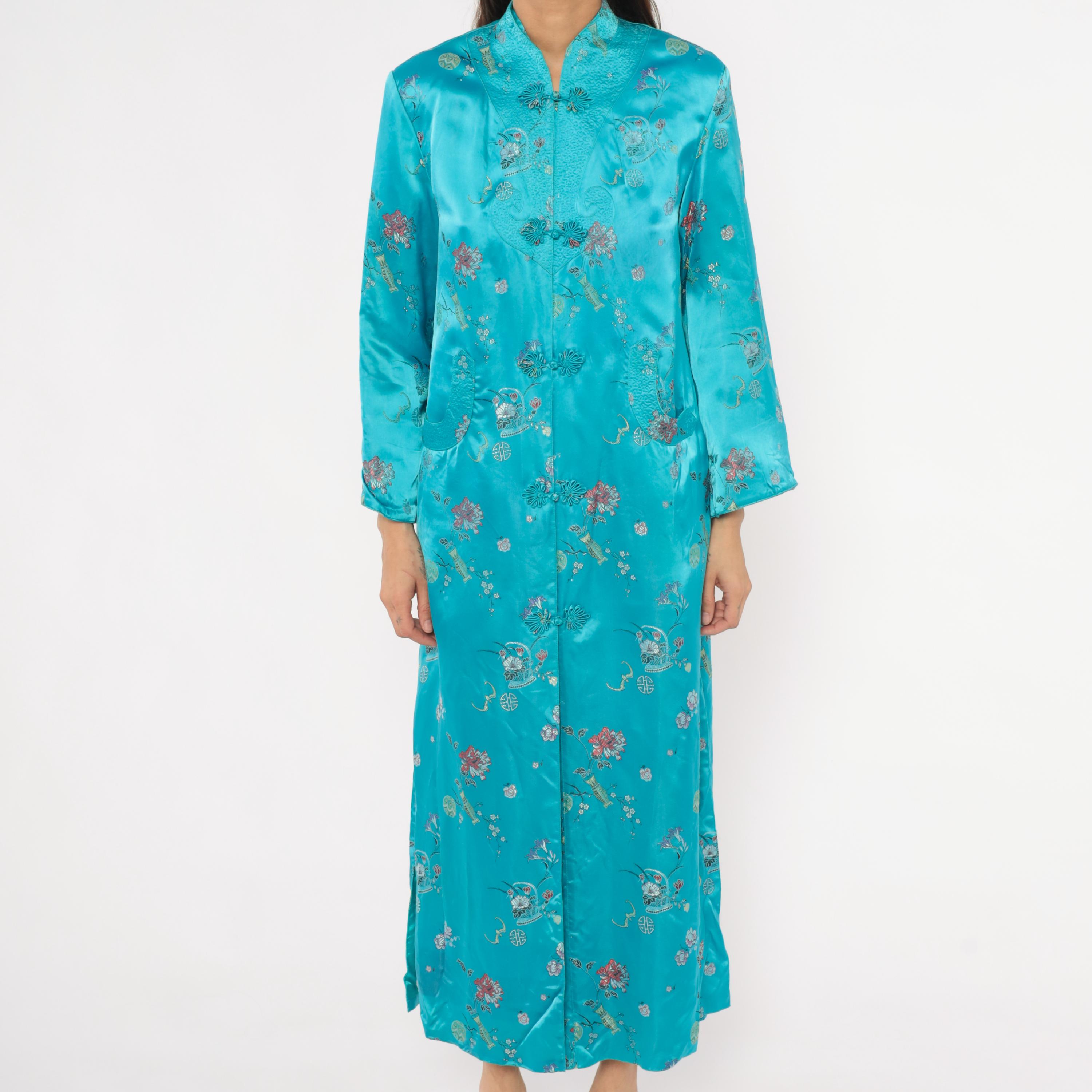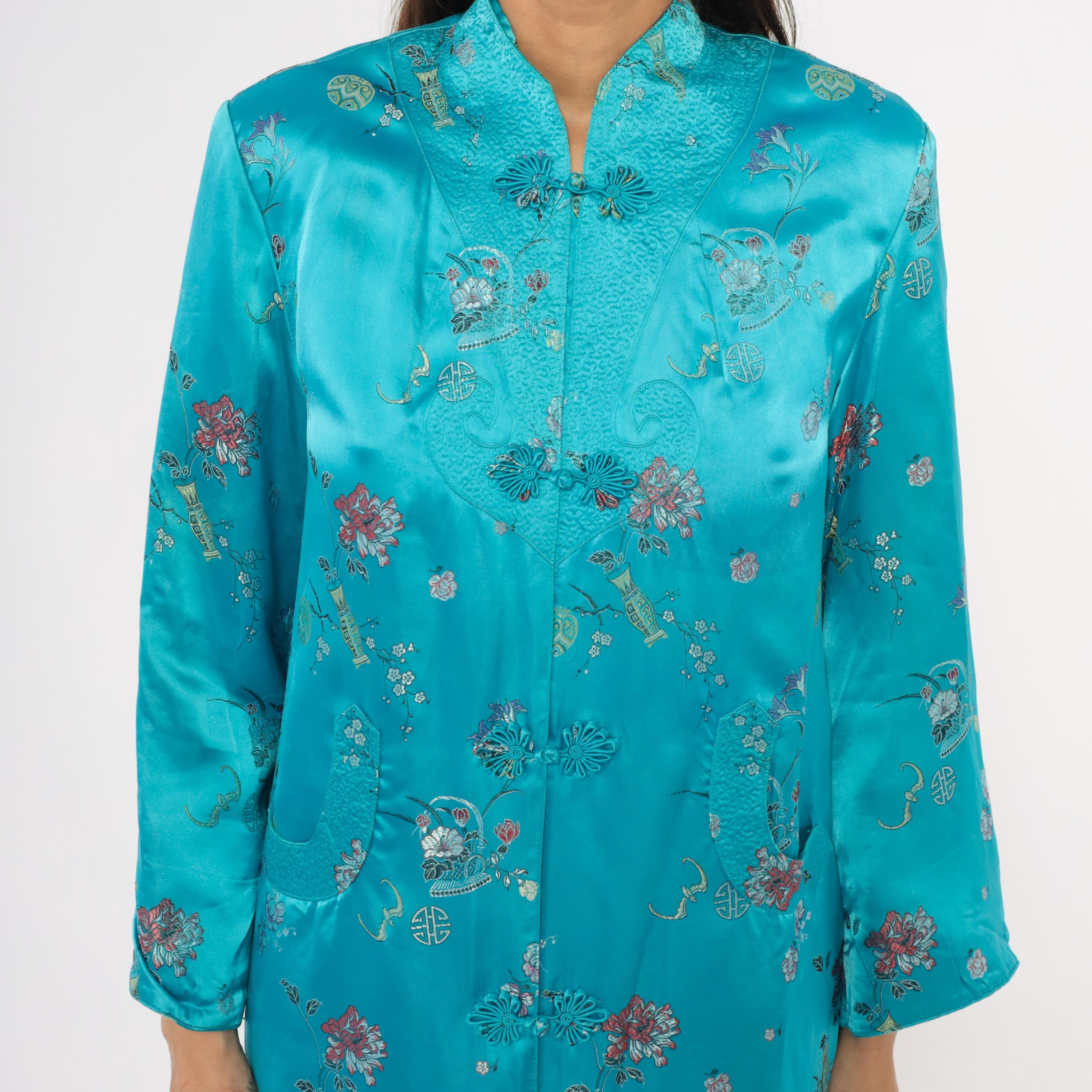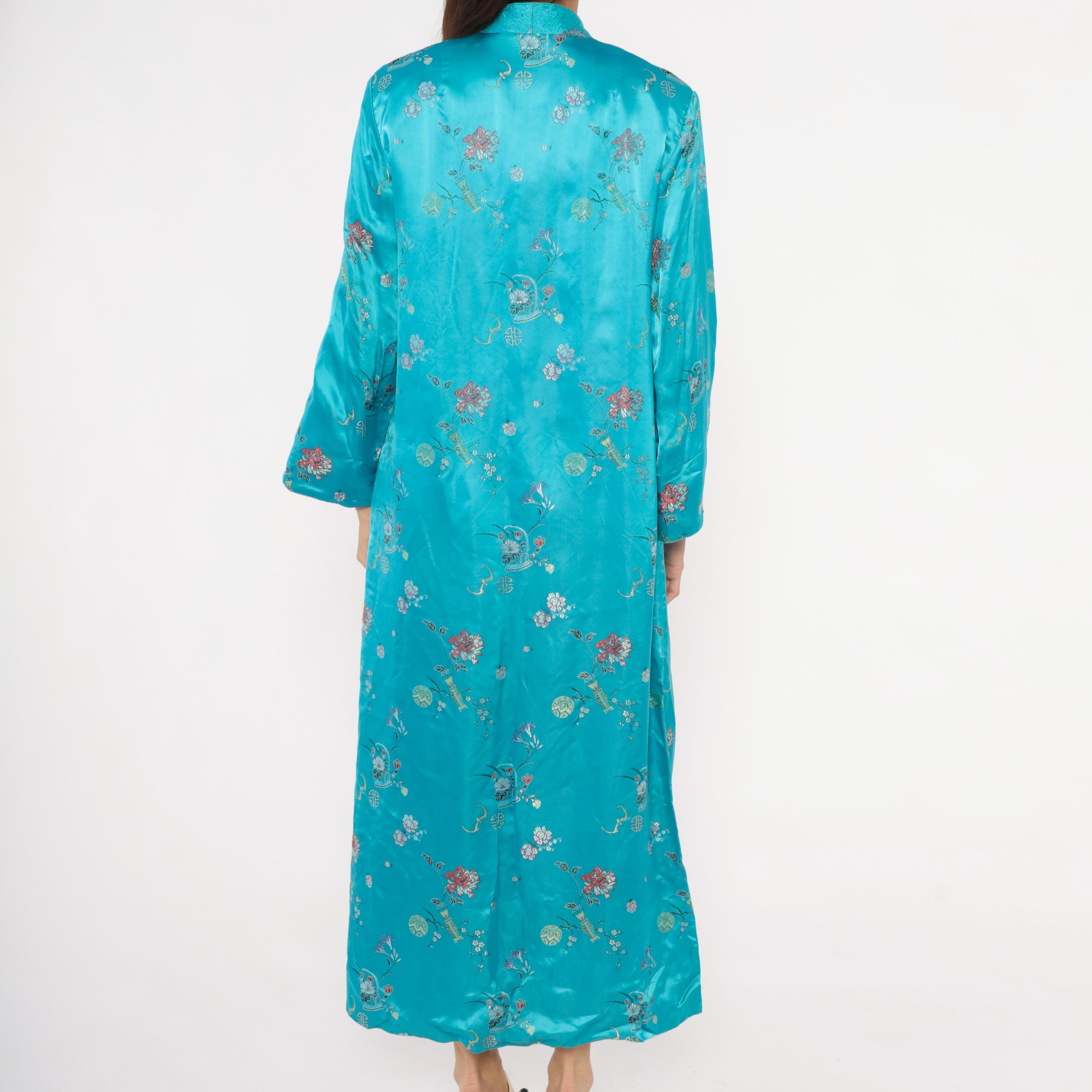 80s turquoise satin robe from Peony Brand with allover floral and fan brocade pattern in pink, green, and gold tones. Mandarin collar with textured jacquard yoke panel and decorative knotted frog button closures down the center front. Long sleeves, straight silhouette with side seam slits at the hem, and curved pocket openings trimmed in matching jacquard.