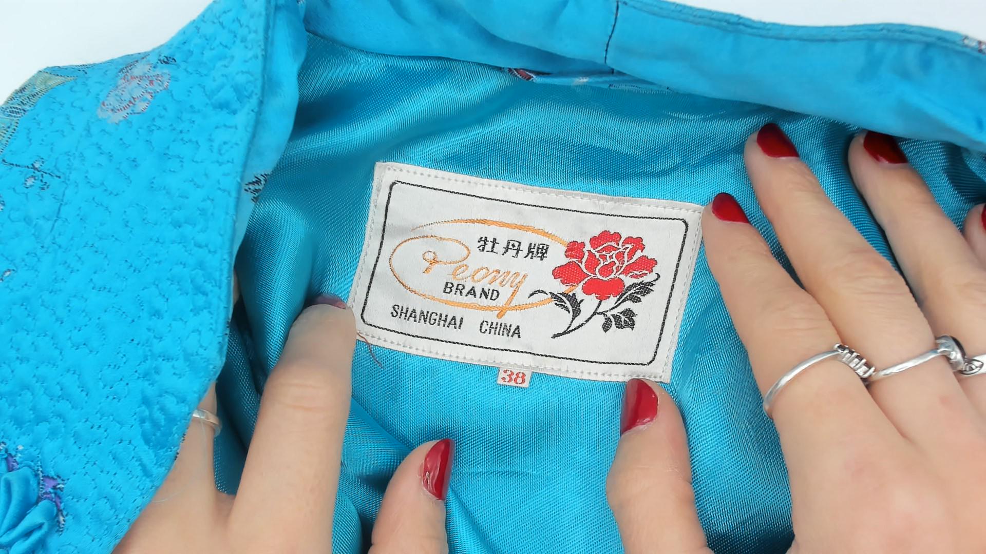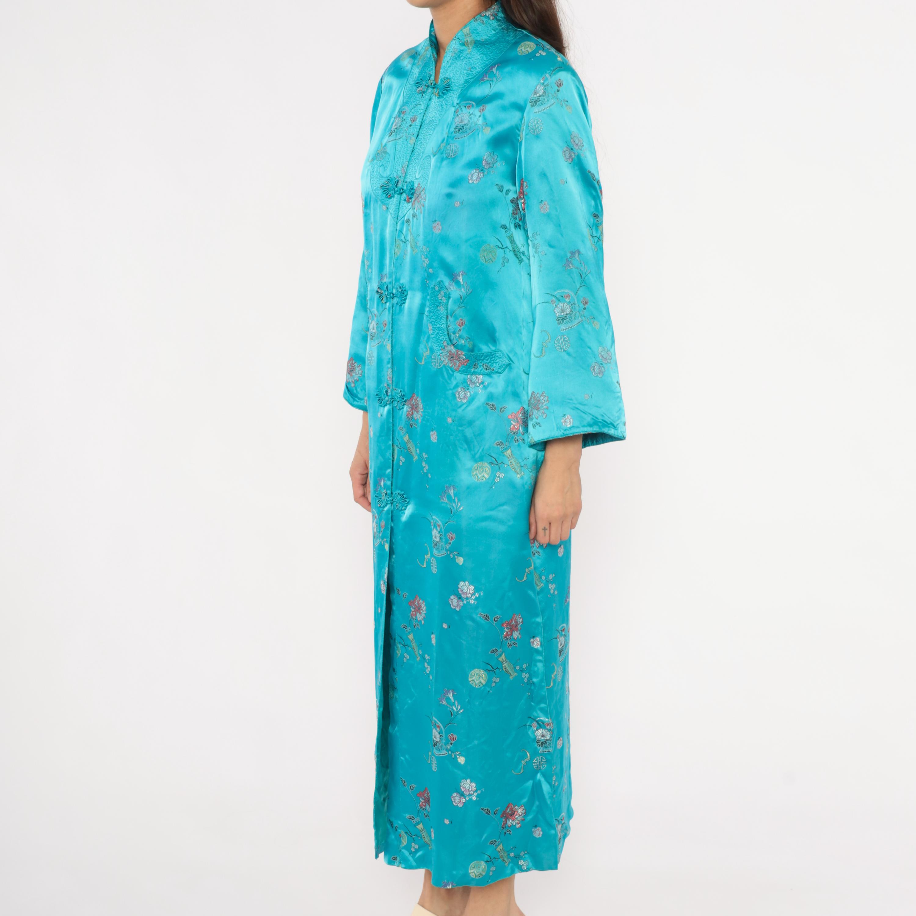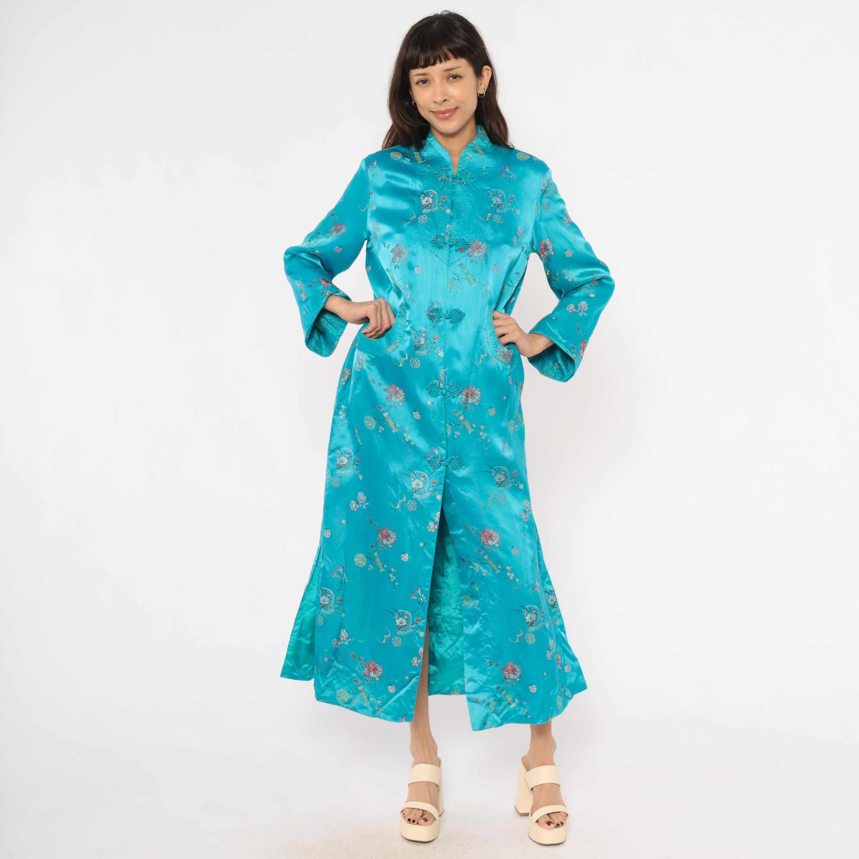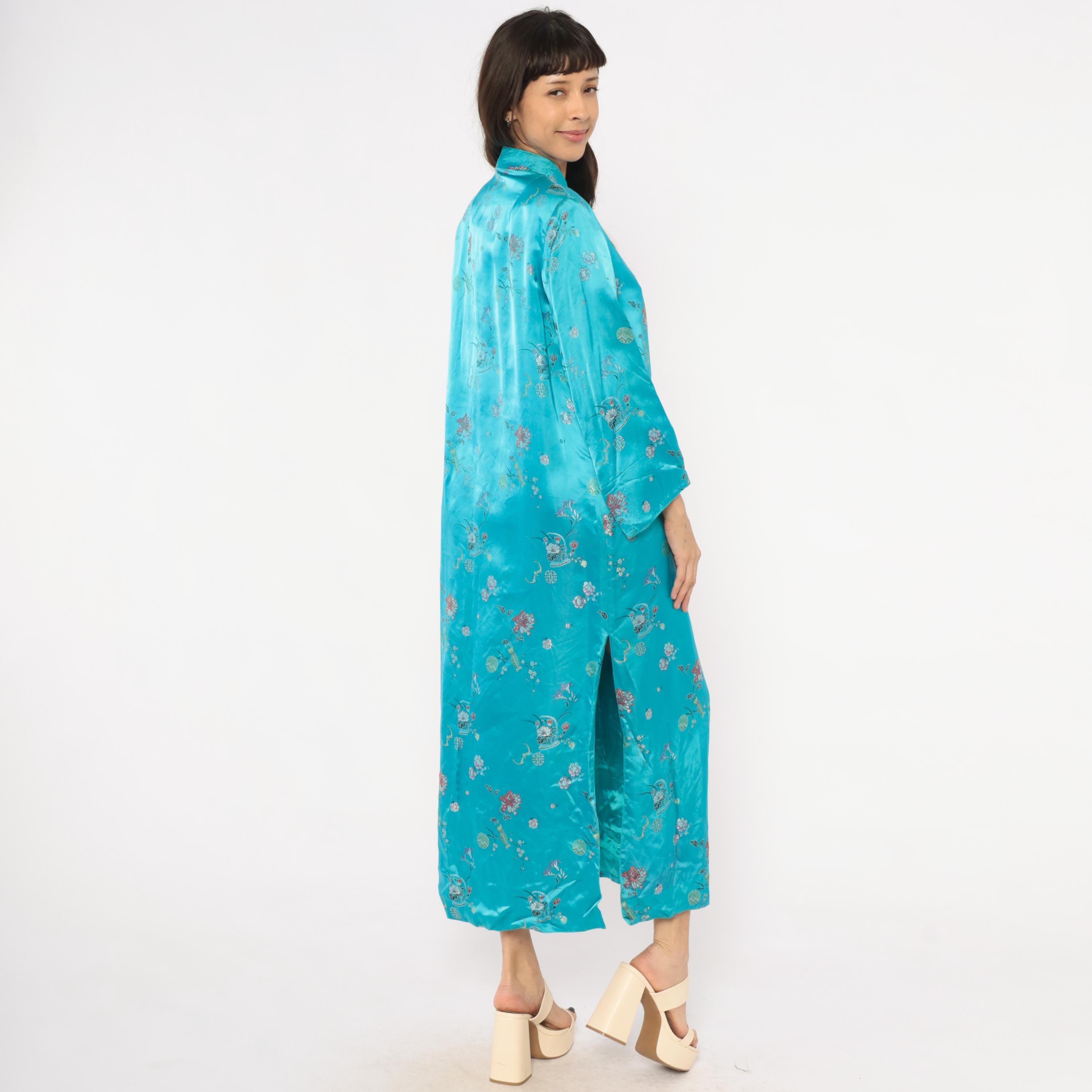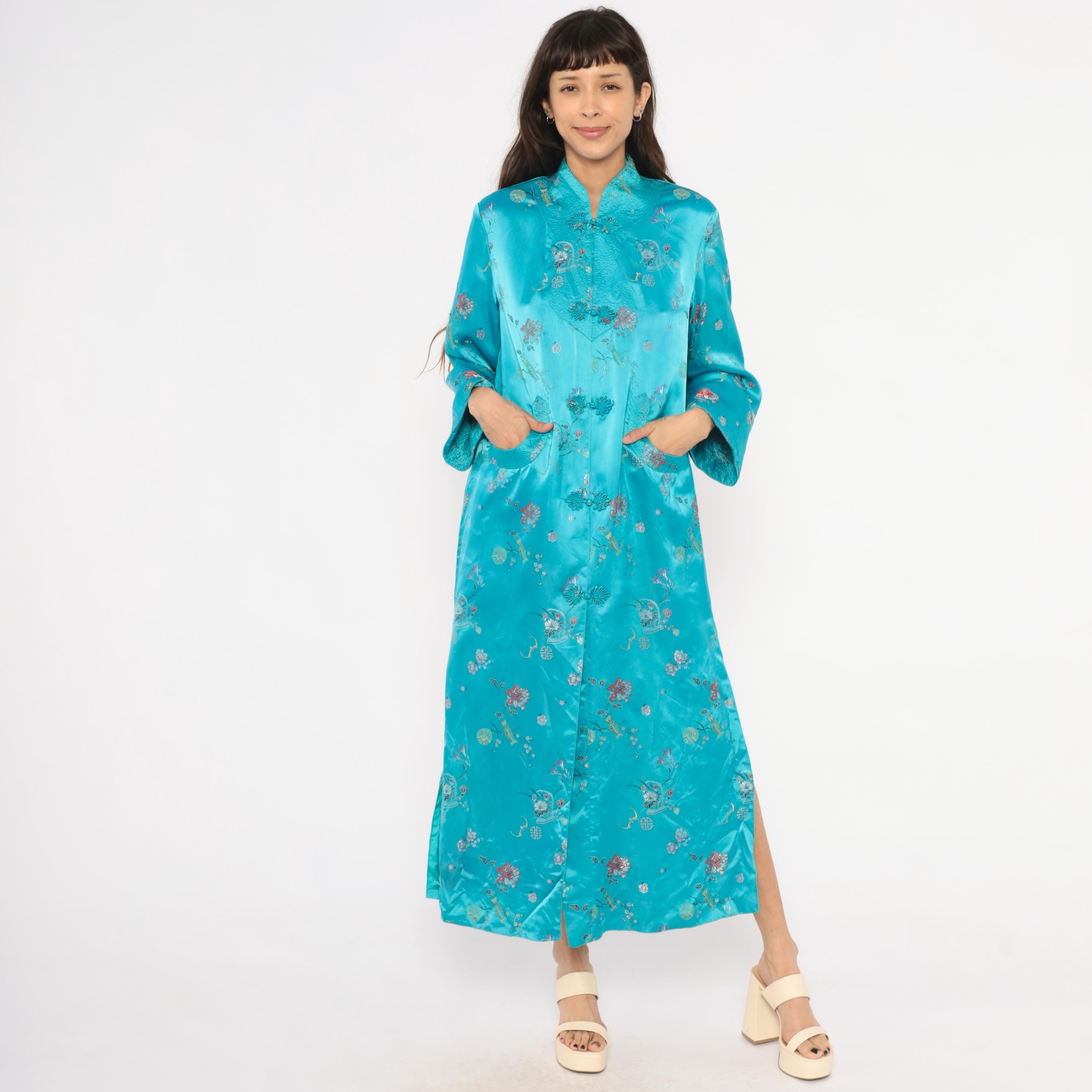 80s turquoise satin robe from Peony Brand with allover floral and fan brocade pattern in pink, green, and gold tones. Mandarin collar with textured jacquard yoke panel and decorative knotted frog button closures down the center front. Long sleeves, straight silhouette with side seam slits at the hem, and curved pocket openings trimmed in matching jacquard.