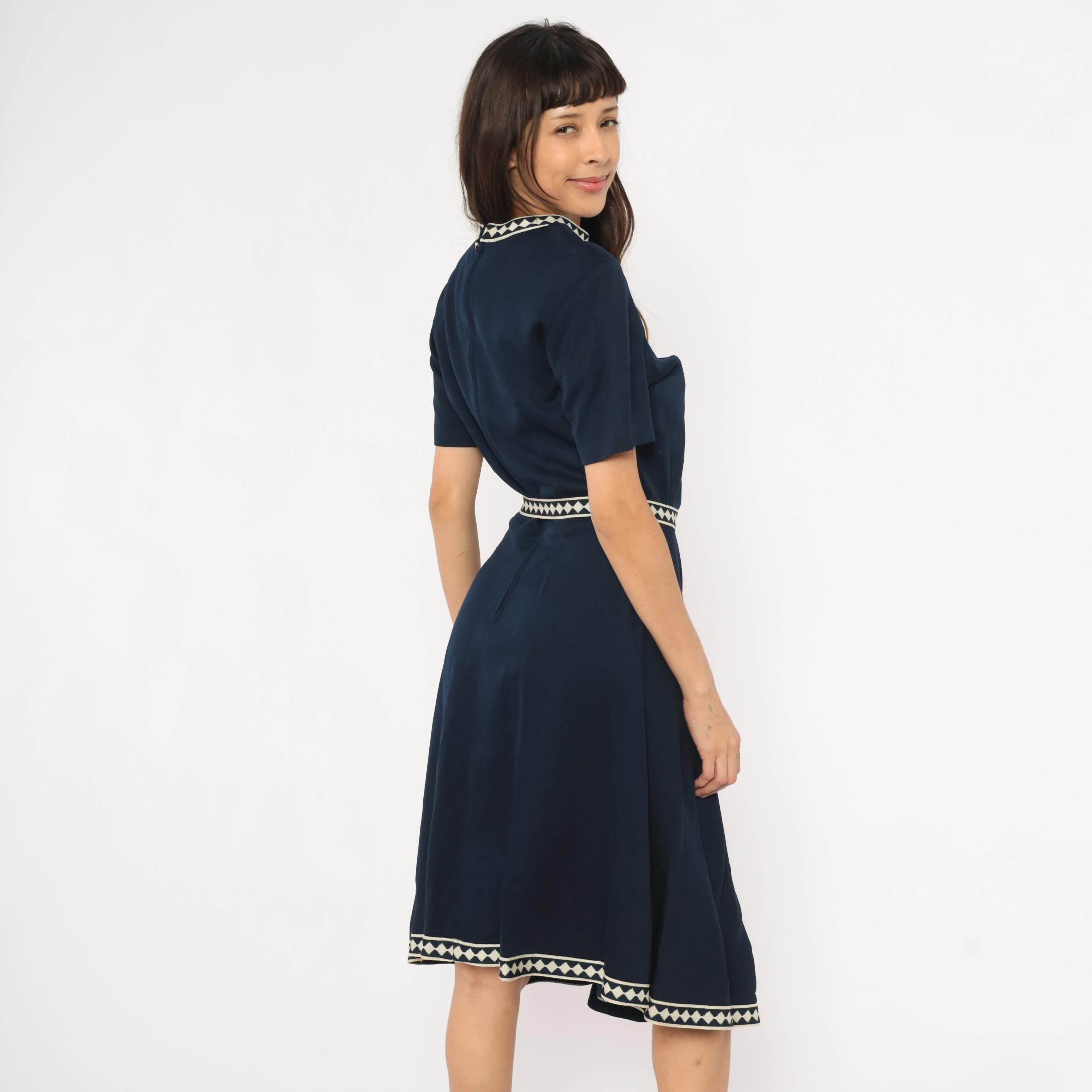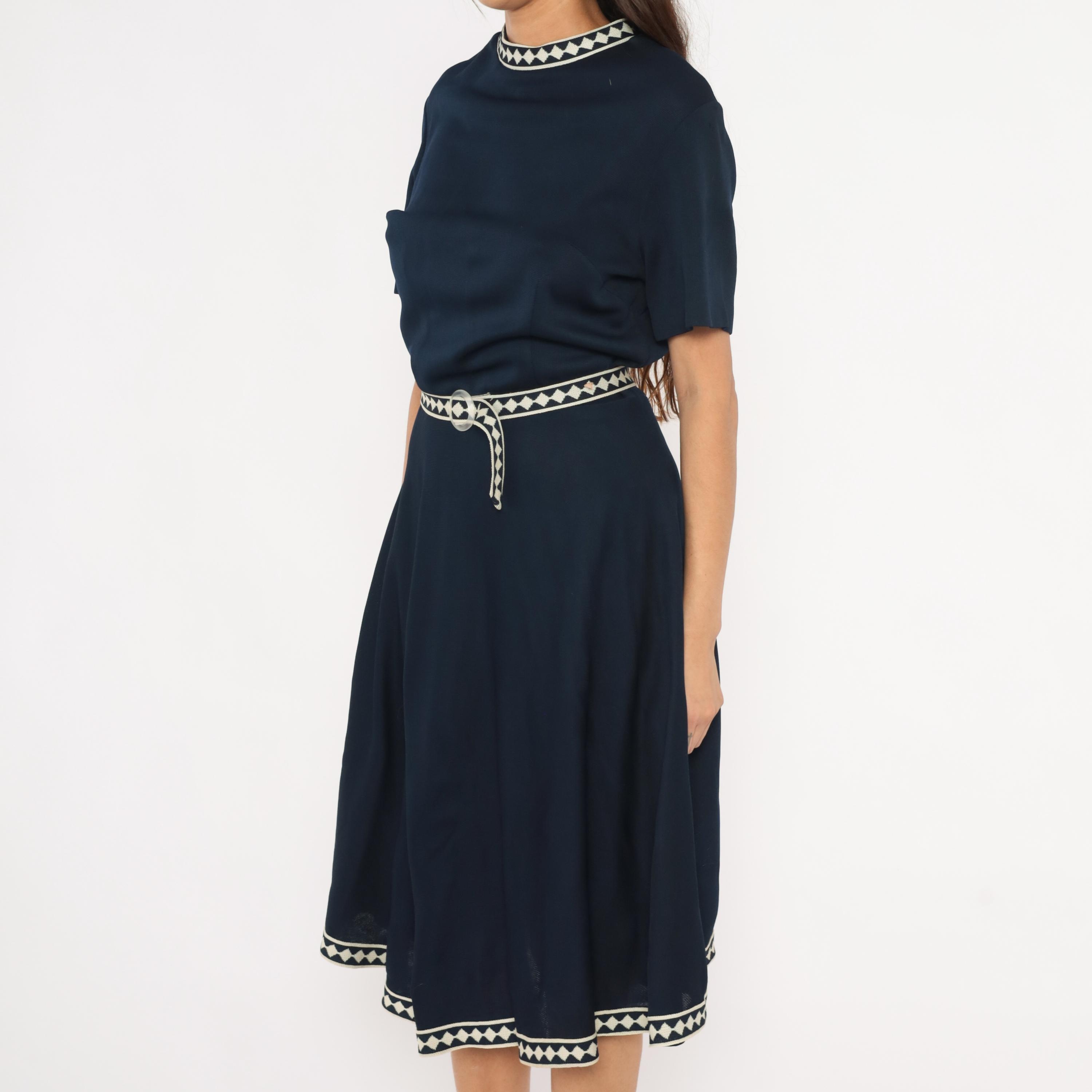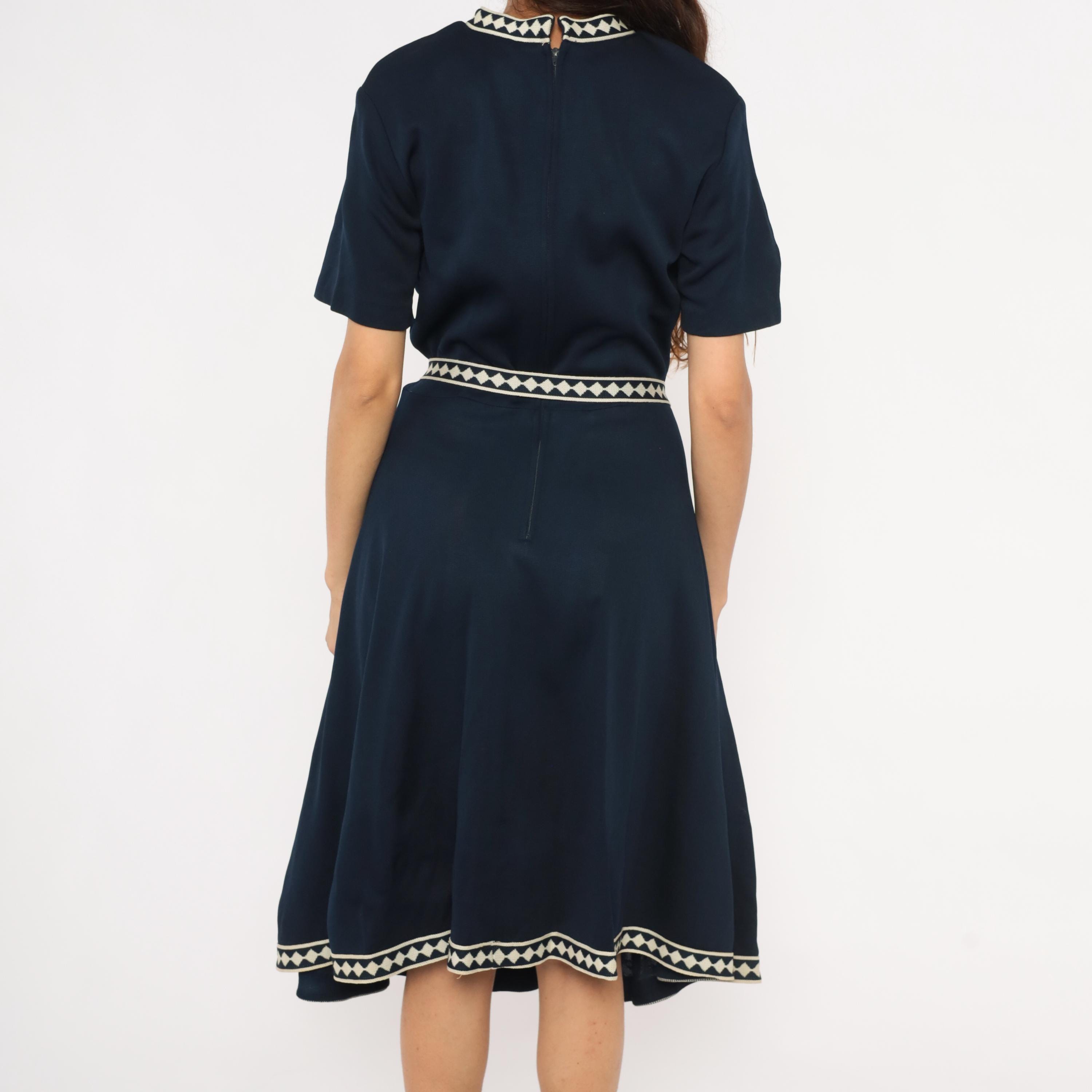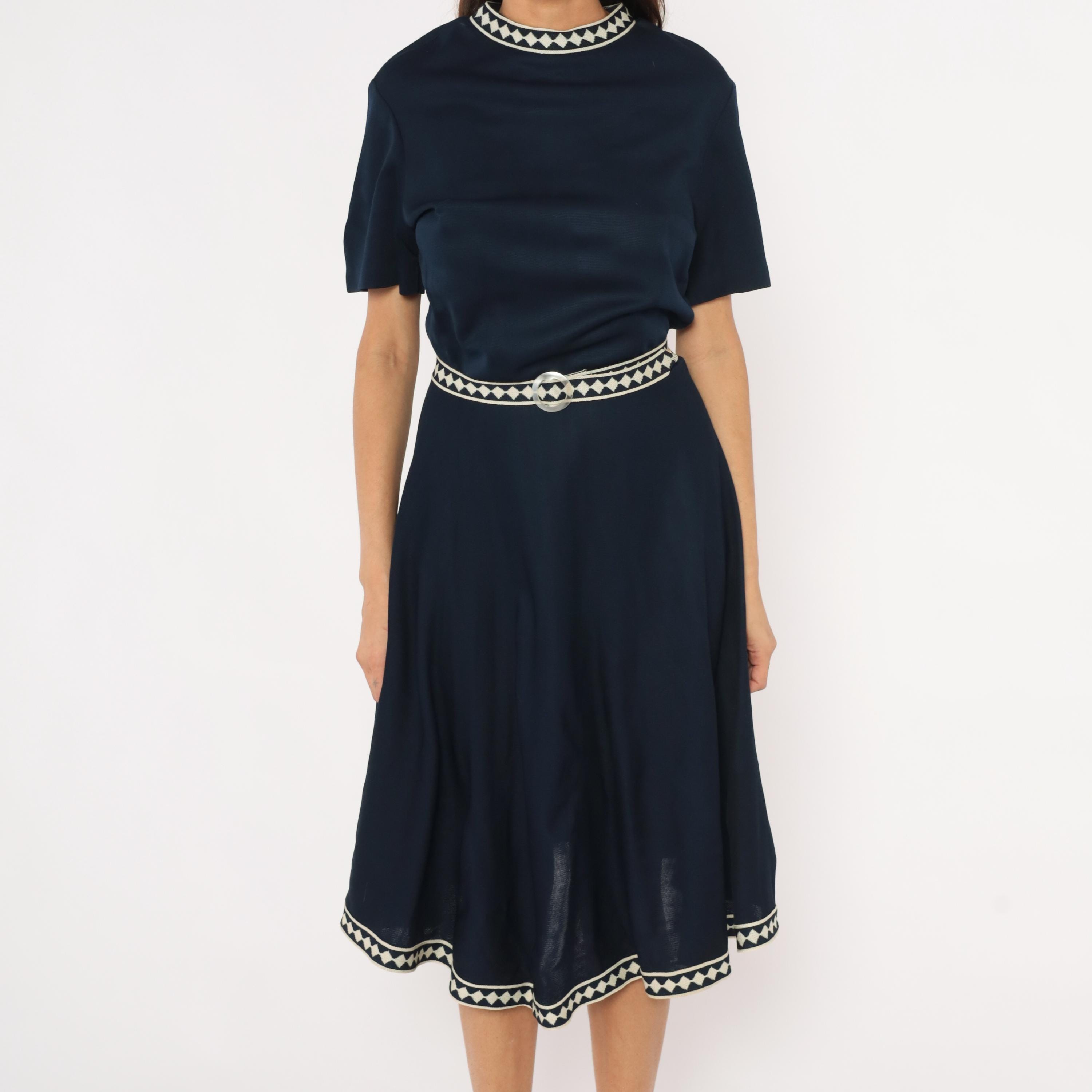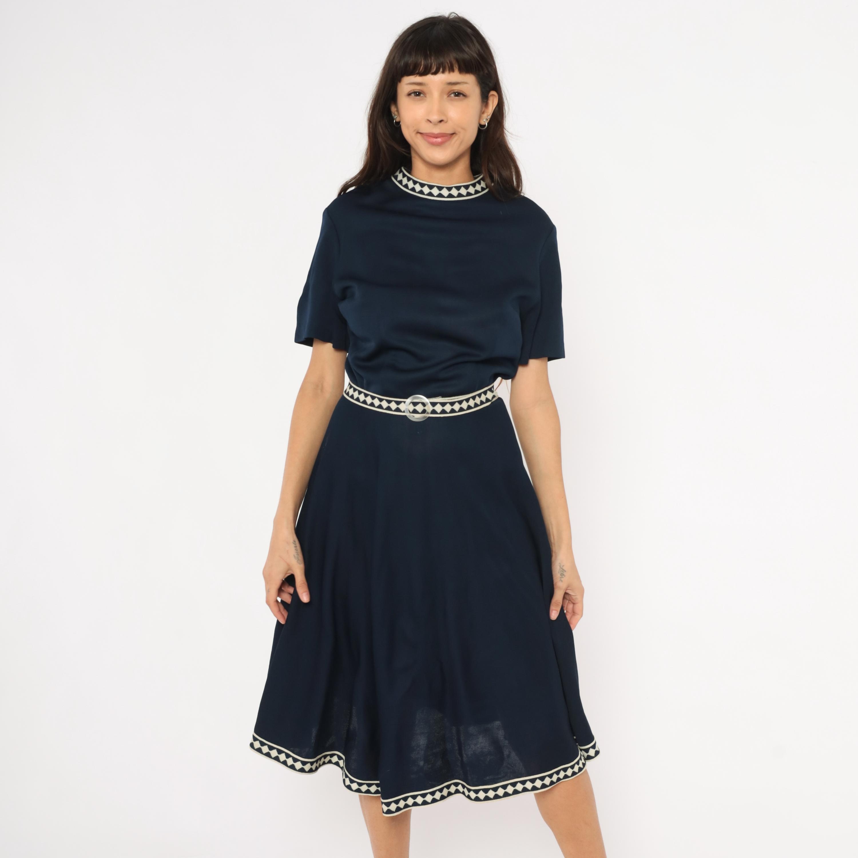 Navy 60s A-line dress by Marta D with cream and navy diamond-pattern woven trim at the neckline, waist belt, and hem. Short sleeves, round neckline, fitted waist with matching fabric belt and round buckle, and a flared skirt falling to mid-calf.