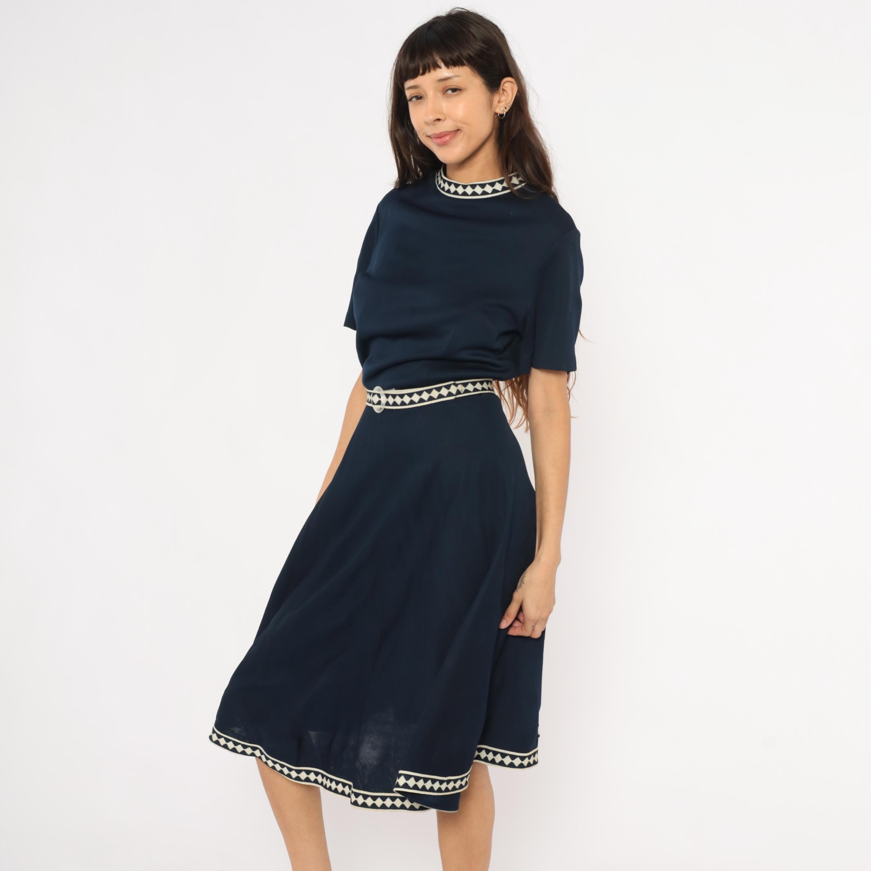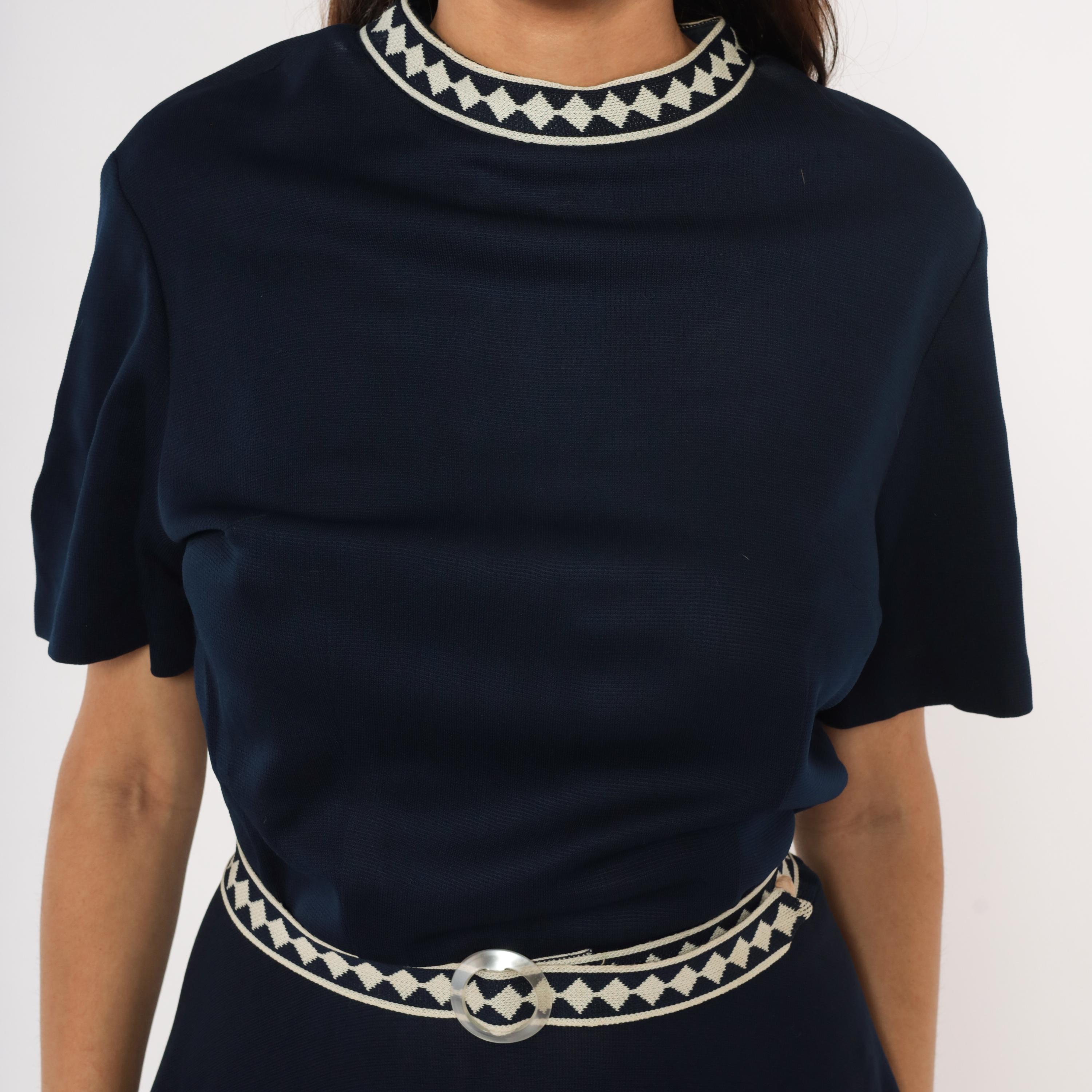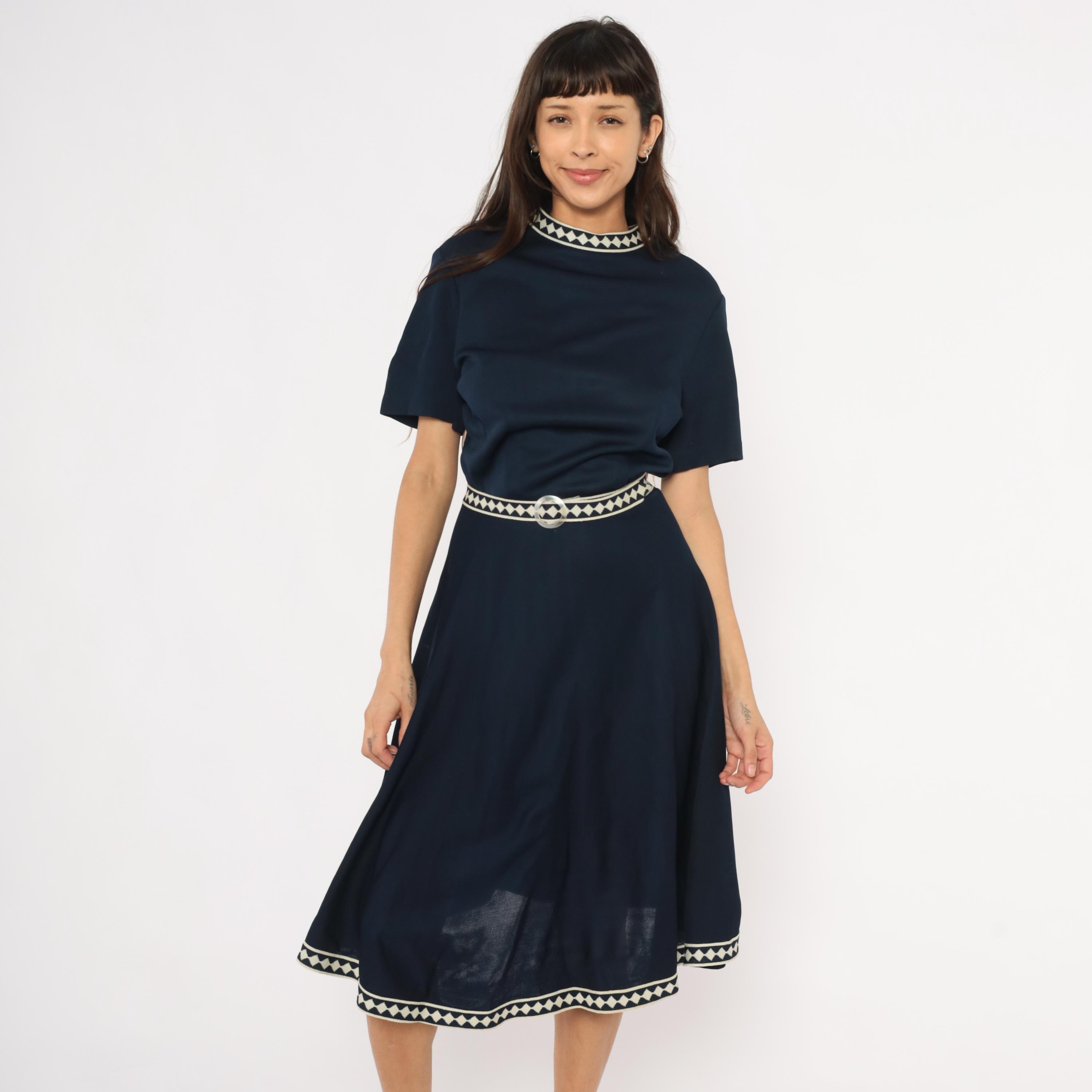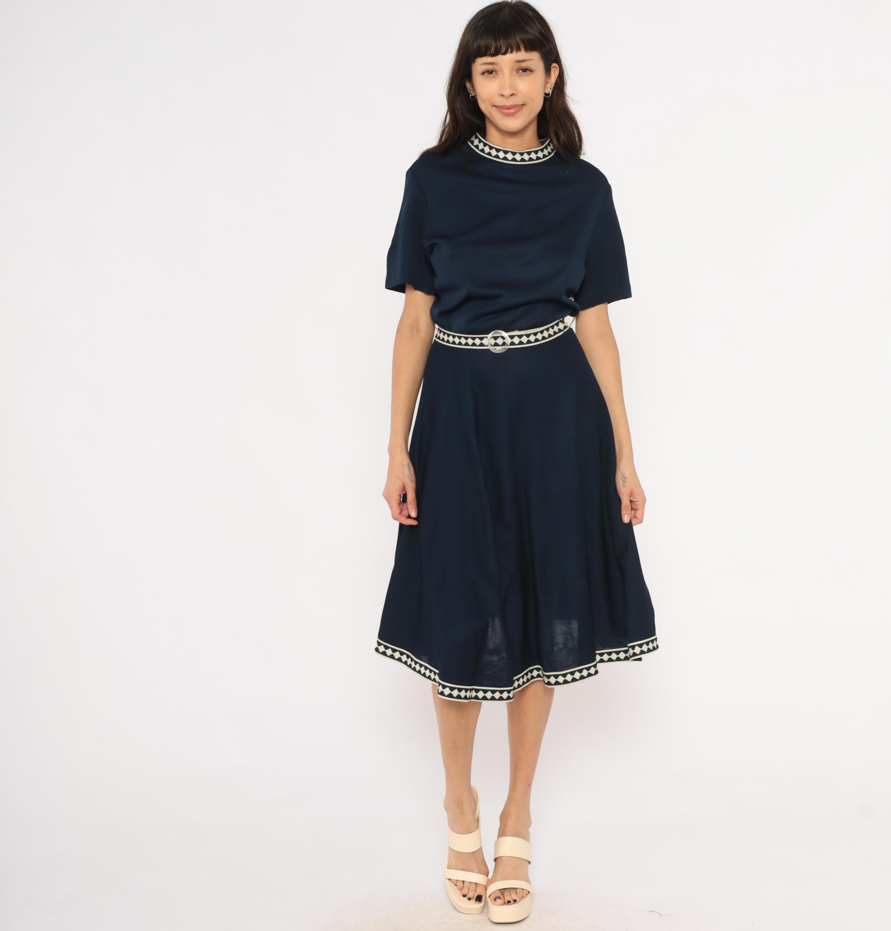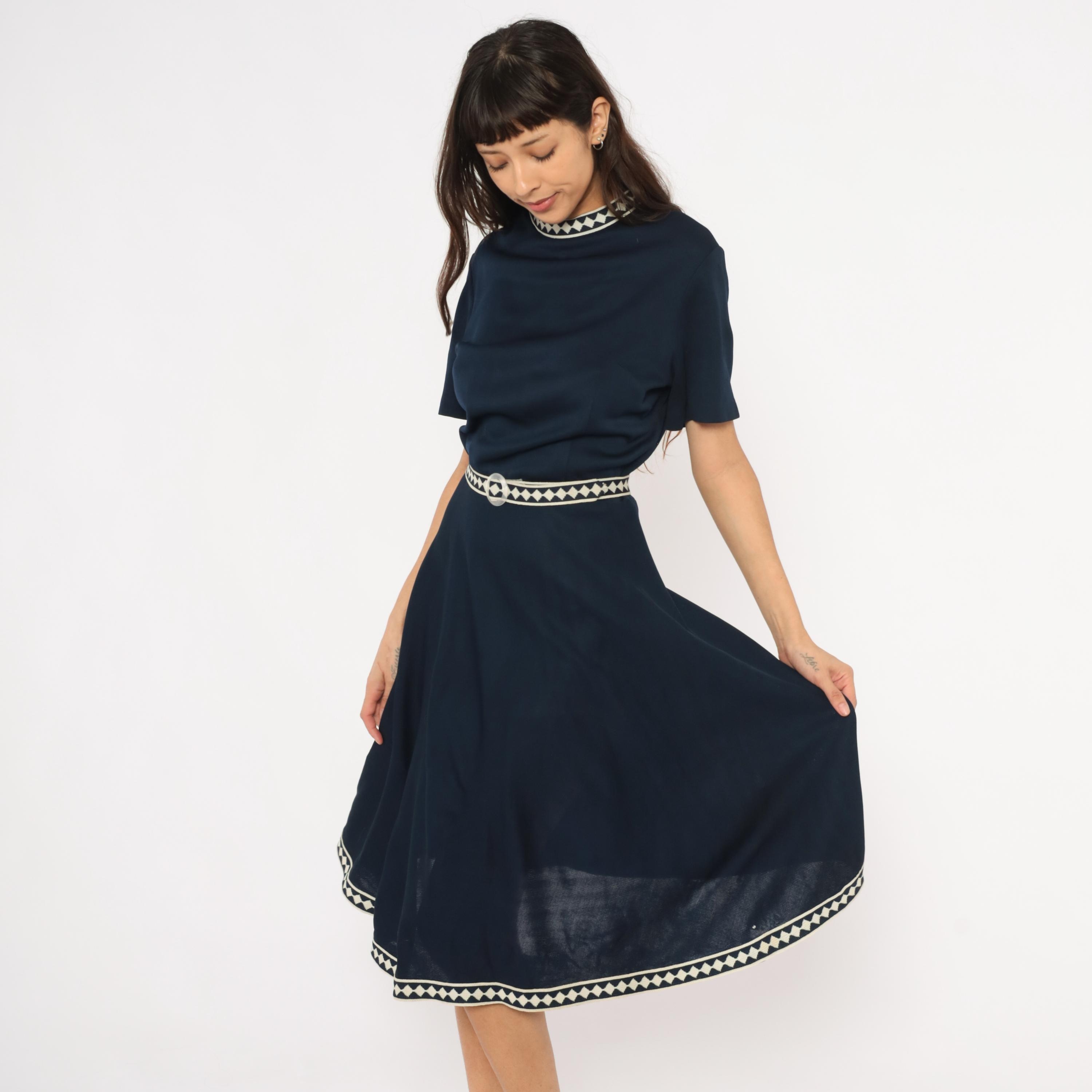 Navy 60s A-line dress by Marta D with cream and navy diamond-pattern woven trim at the neckline, waist belt, and hem. Short sleeves, round neckline, fitted waist with matching fabric belt and round buckle, and a flared skirt falling to mid-calf.