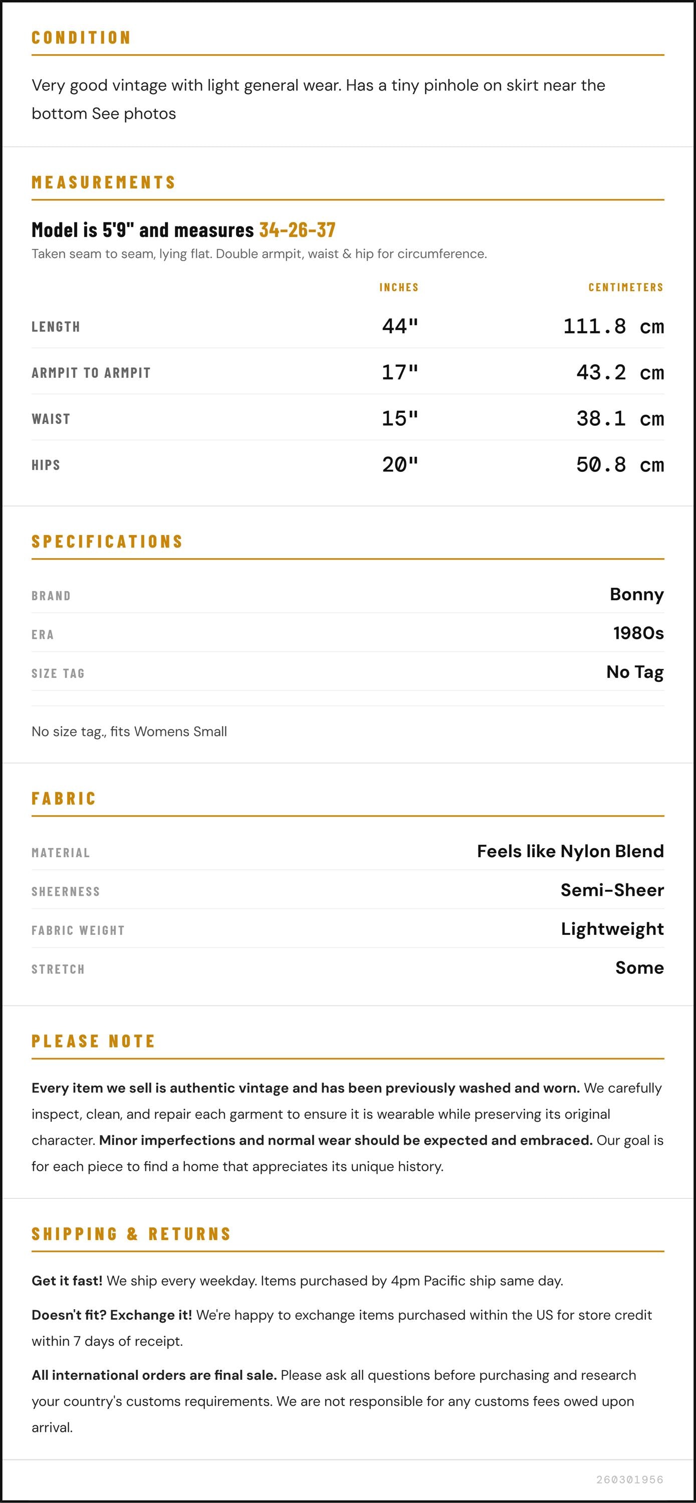 Condition: Very good vintage with light general wear. Has a tiny pinhole on skirt near the bottom See photos