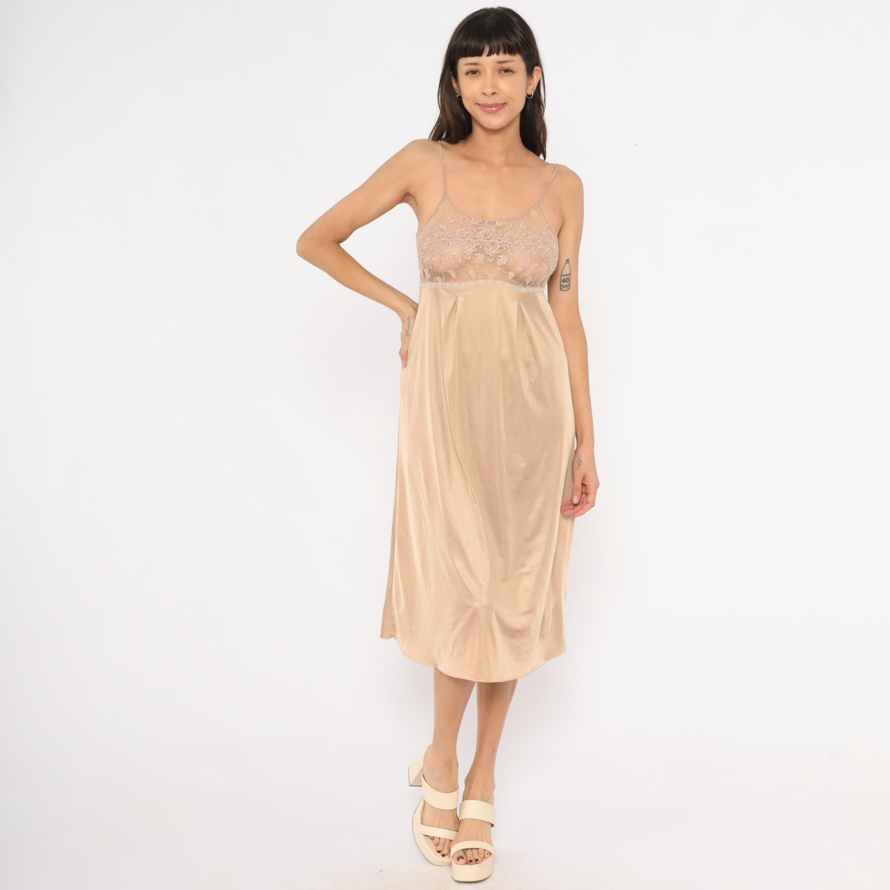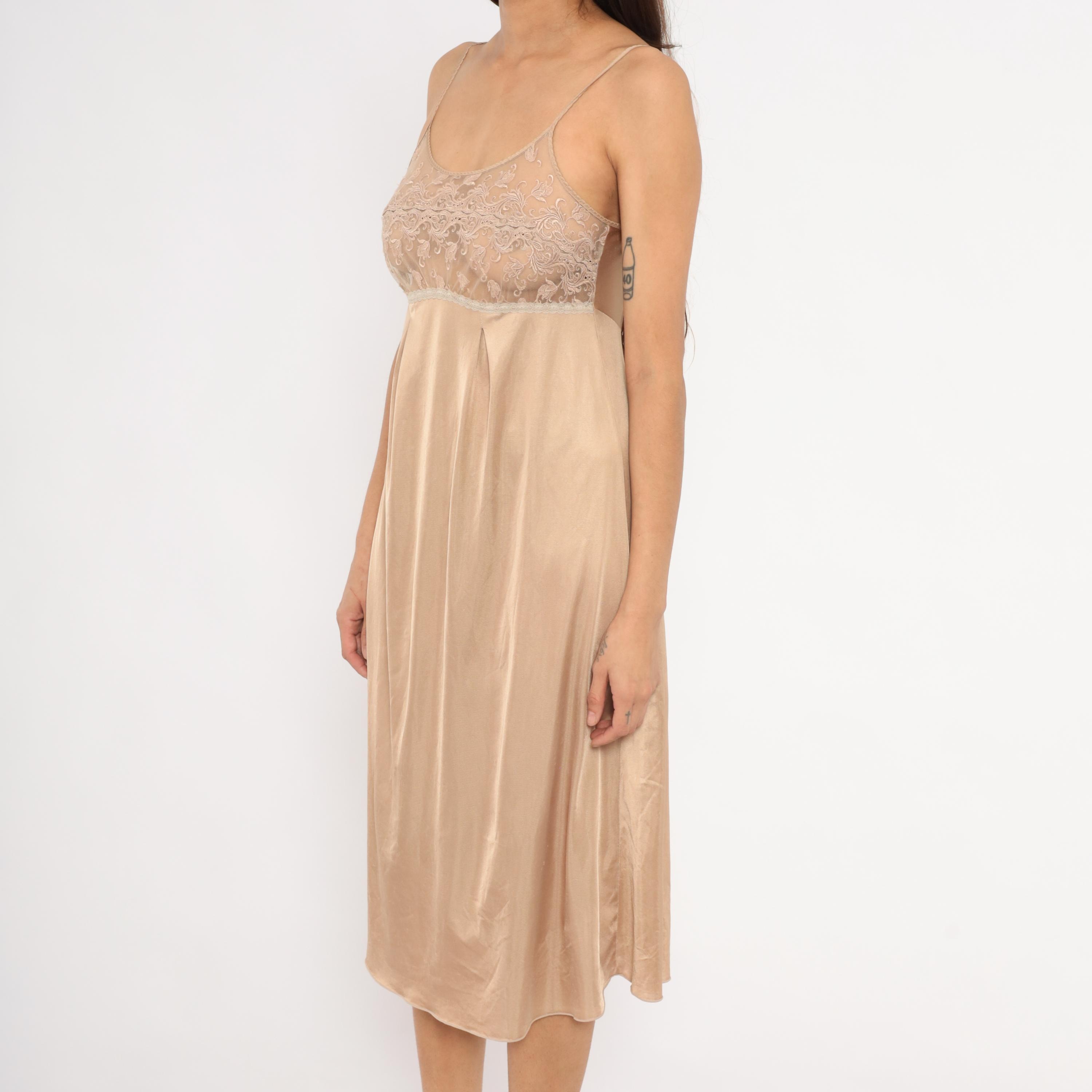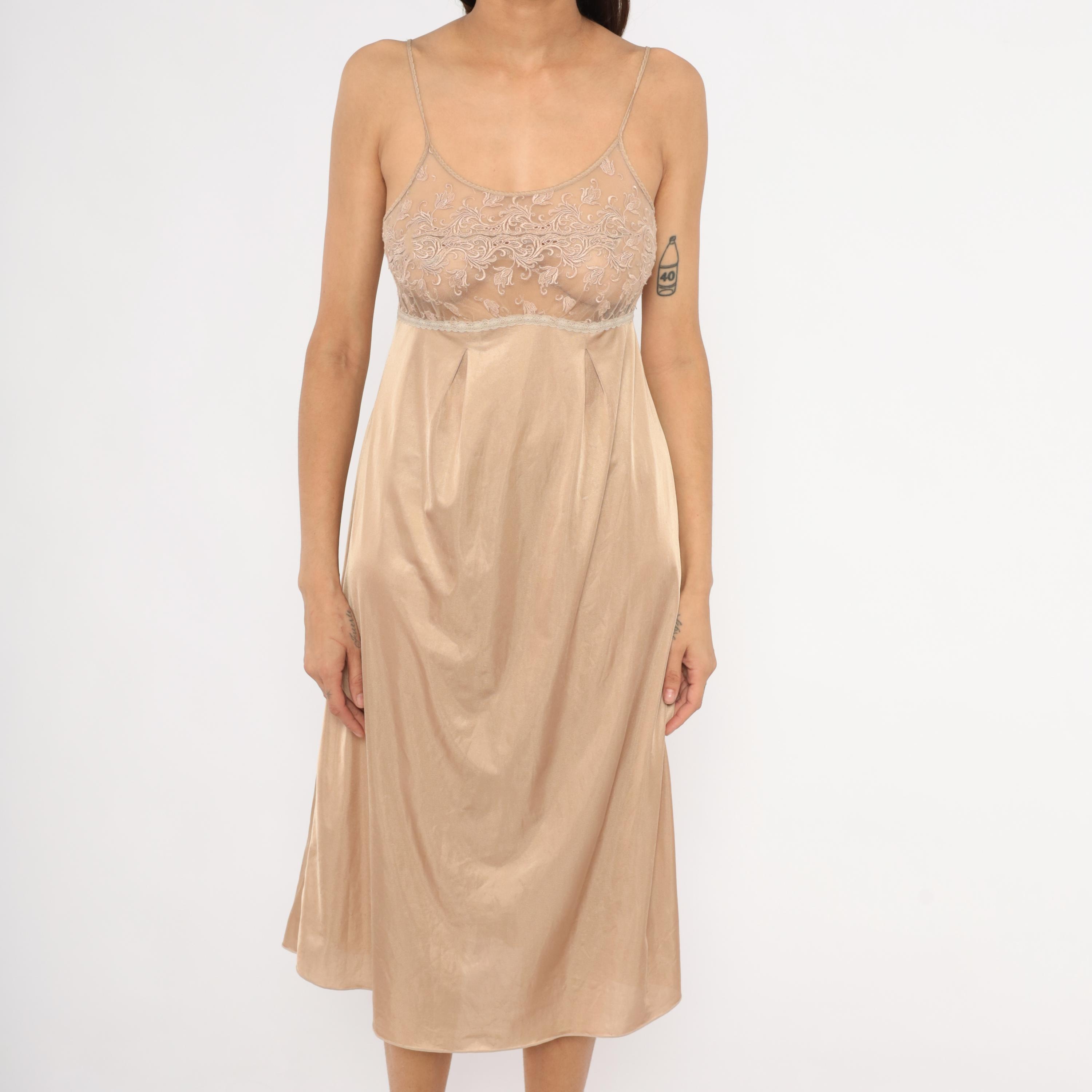 80s nude slip dress from Bonny with an embroidered lace bodice over a sheer mesh bust and a scalloped lace band at the empire waist. Spaghetti straps, pullover construction, and pleated detailing below the bustline. The satin skirt falls to mid-calf in a champagne tan tone with a slight A-line shape.
