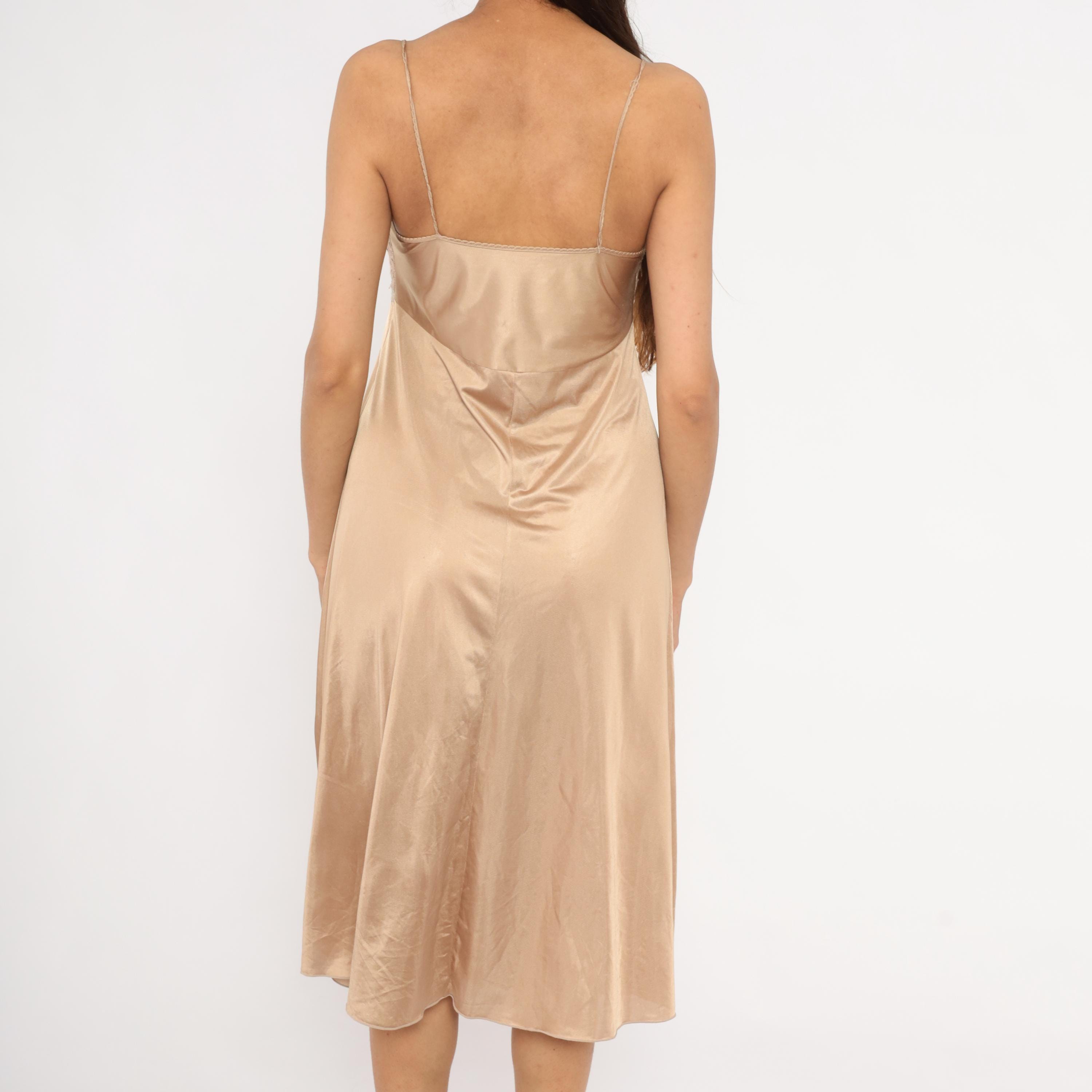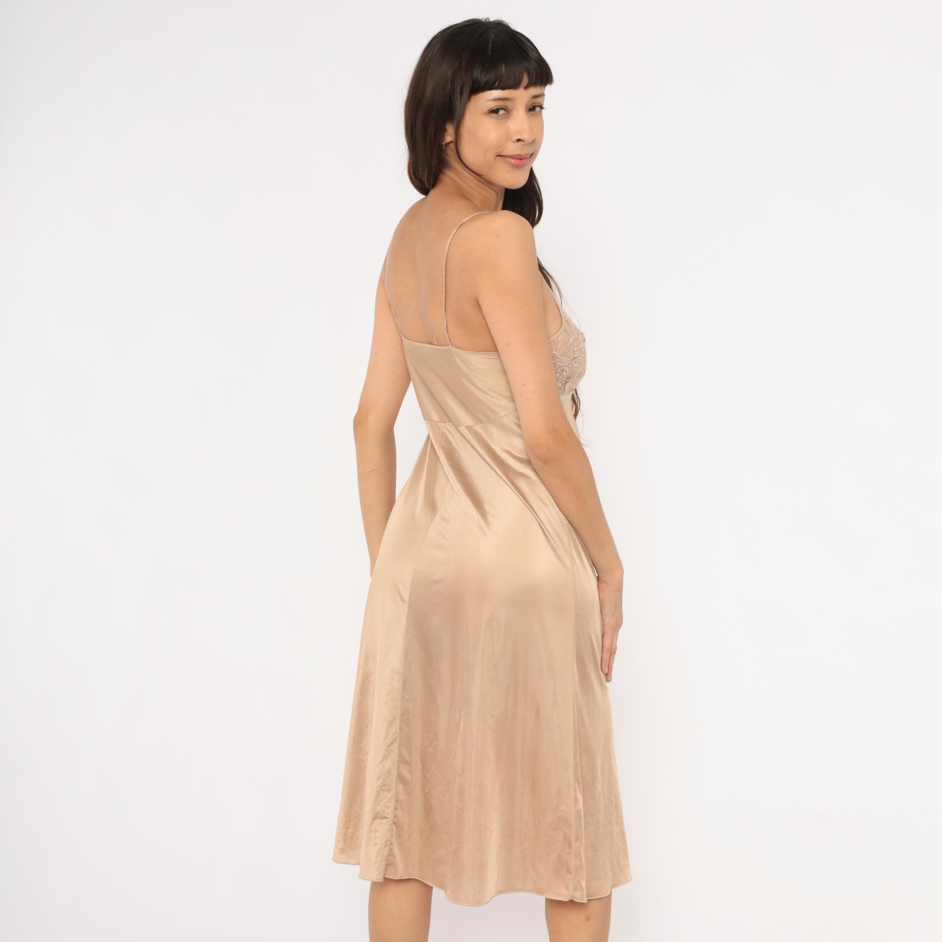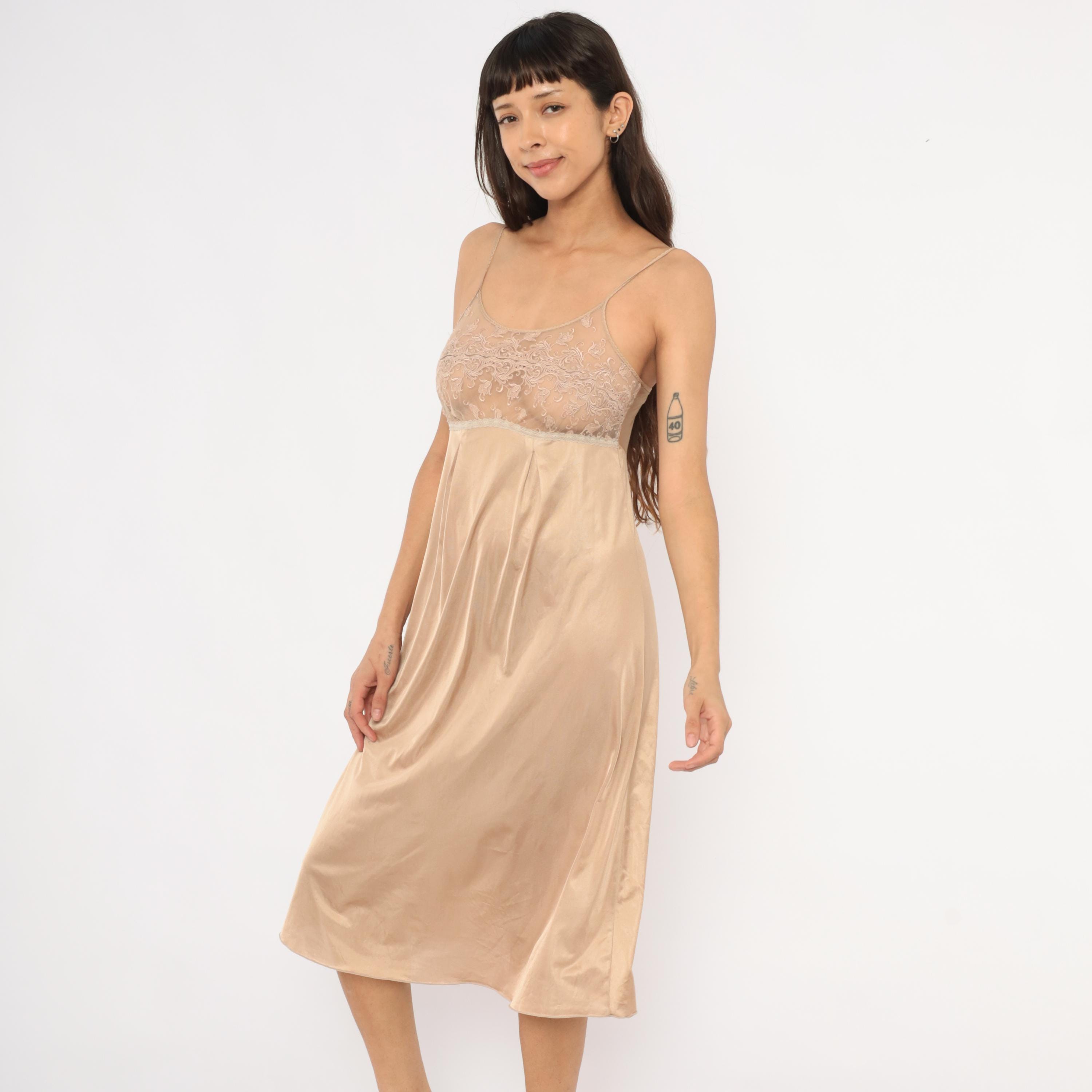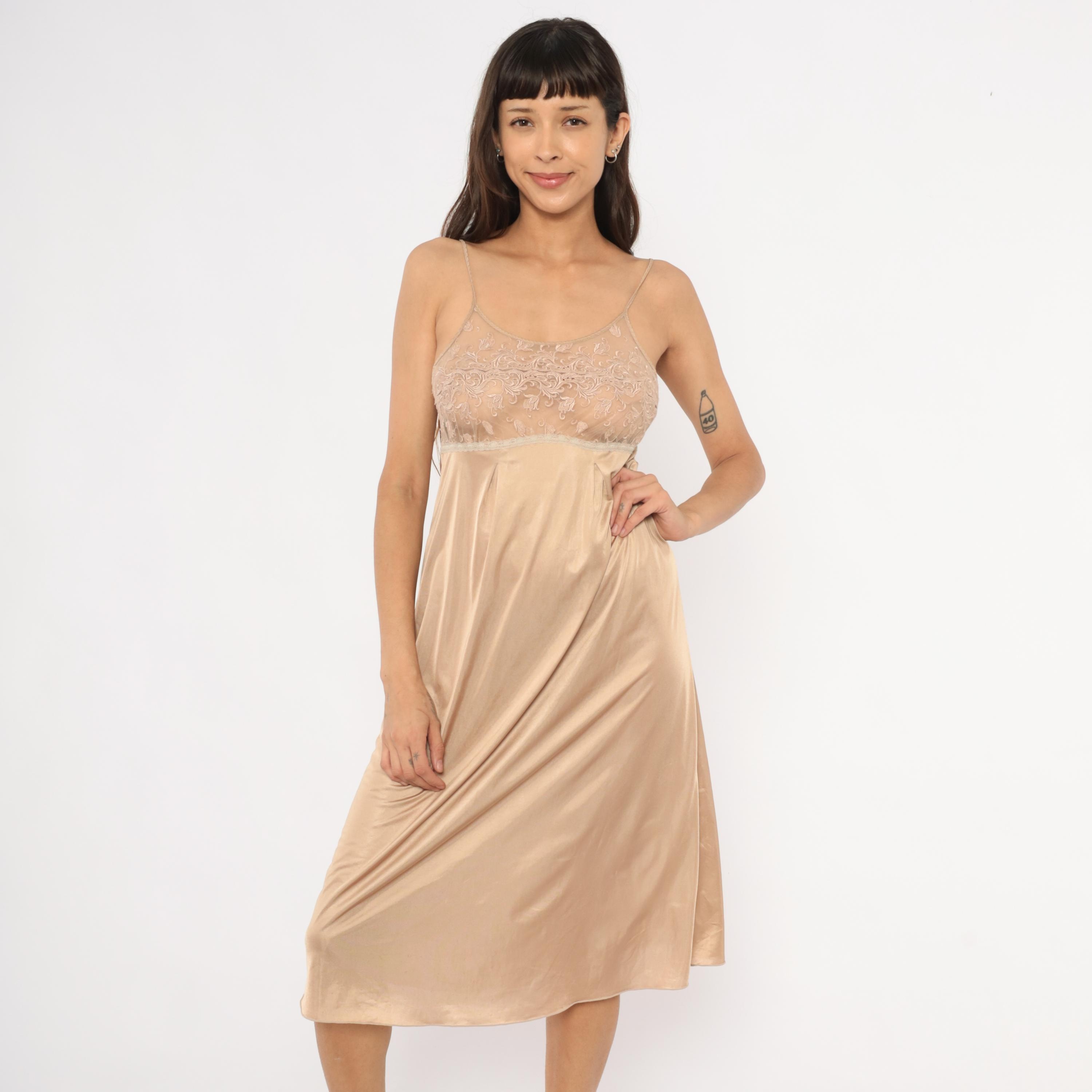 80s nude slip dress from Bonny with an embroidered lace bodice over a sheer mesh bust and a scalloped lace band at the empire waist. Spaghetti straps, pullover construction, and pleated detailing below the bustline. The satin skirt falls to mid-calf in a champagne tan tone with a slight A-line shape.