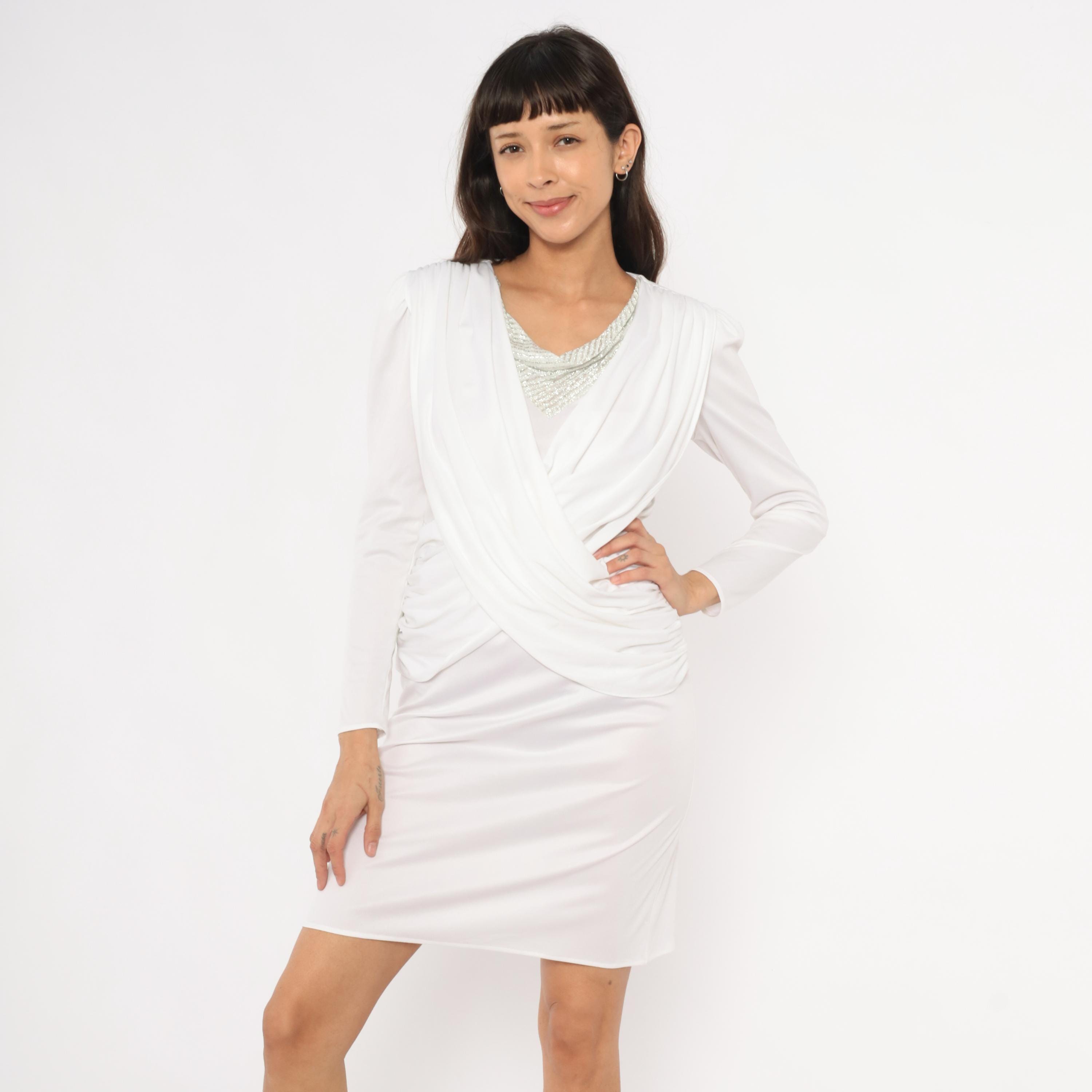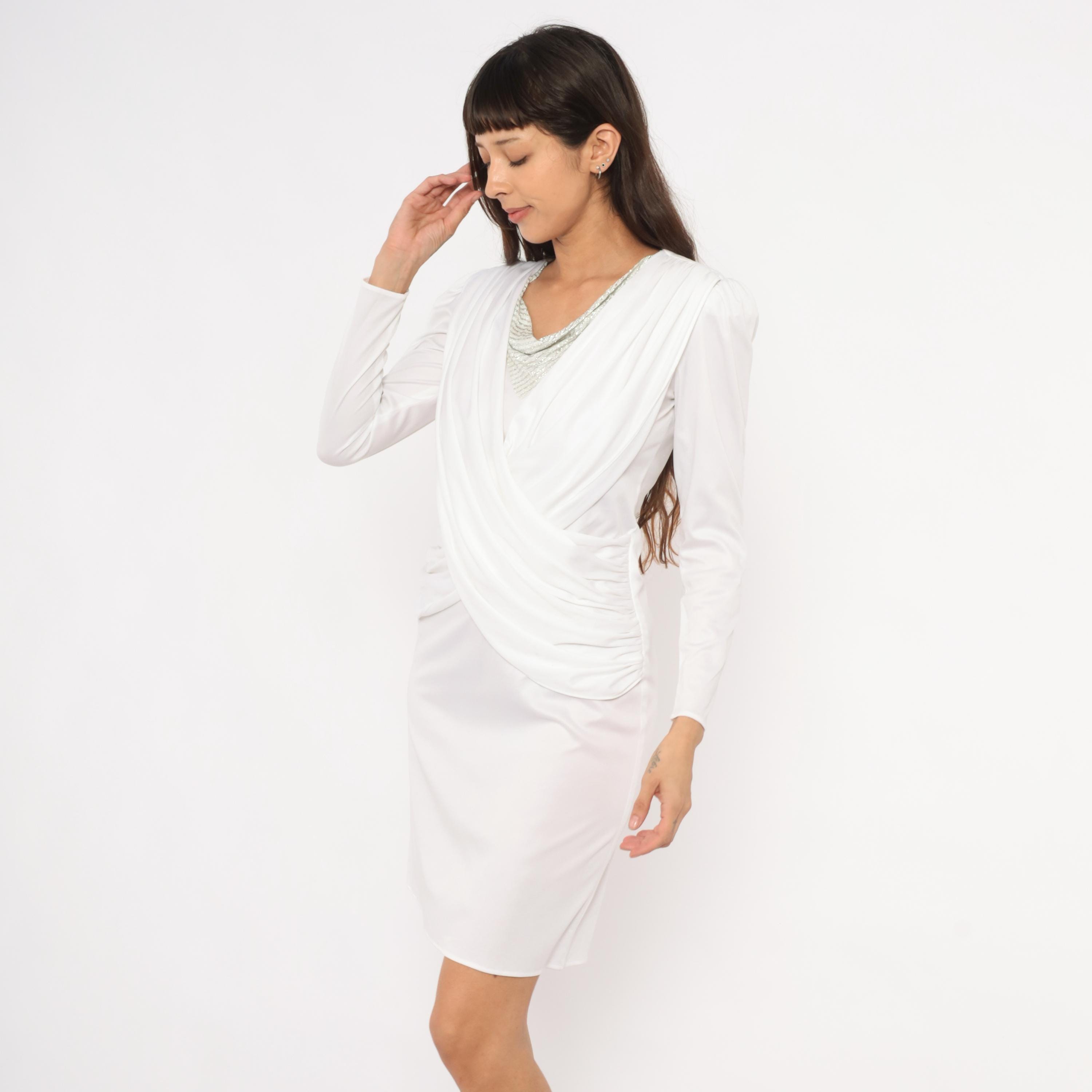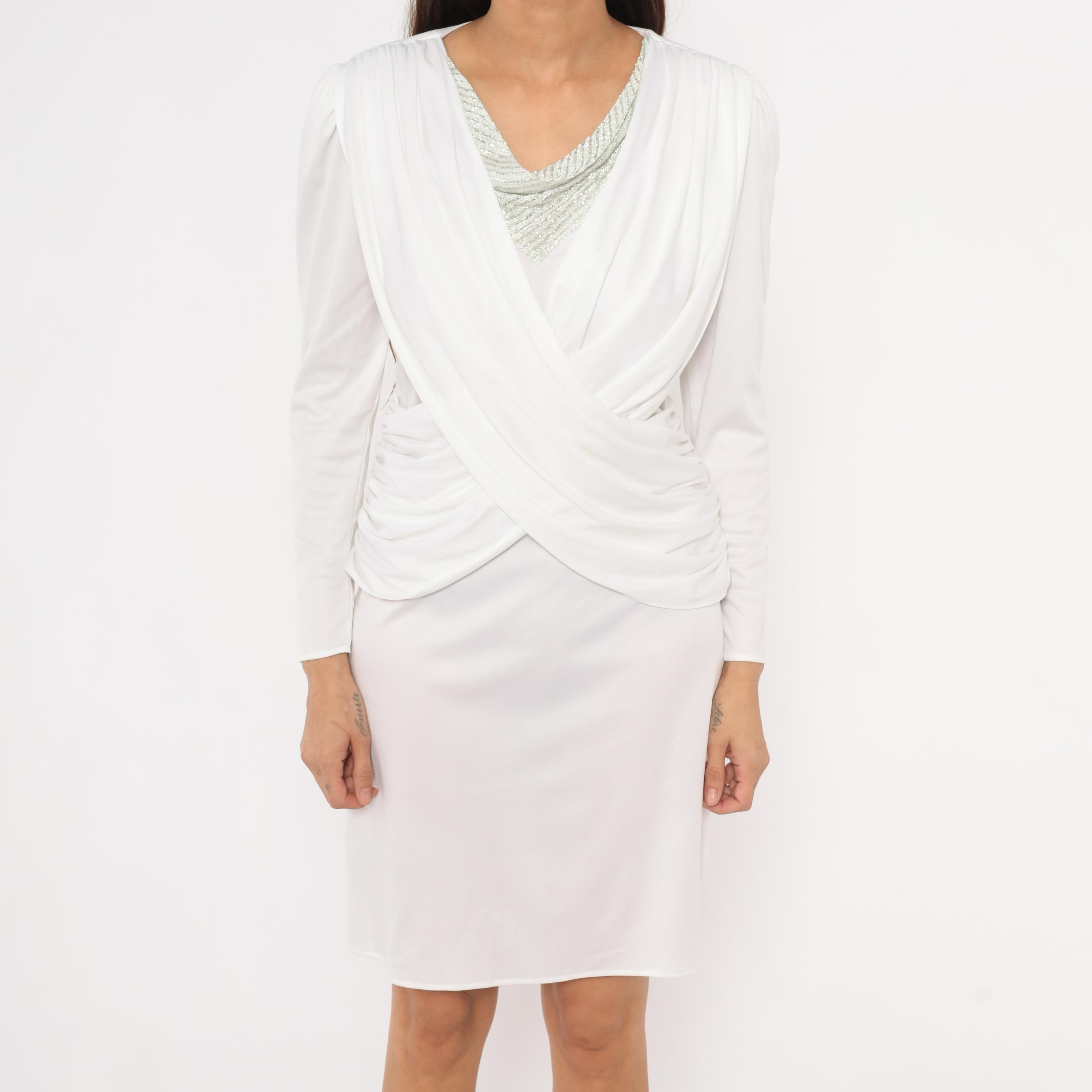 80s white draped crossover dress with a silver beaded V-neckline panel and long sleeves. Ruched wrap-front bodice with gathered fabric crossing at the midsection, slightly padded shoulders, and a straight knee-length skirt.