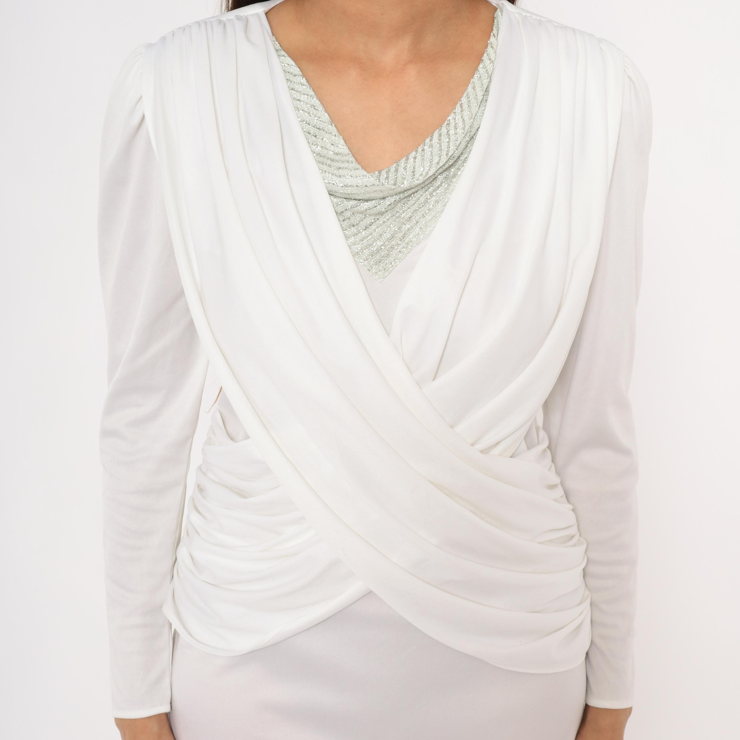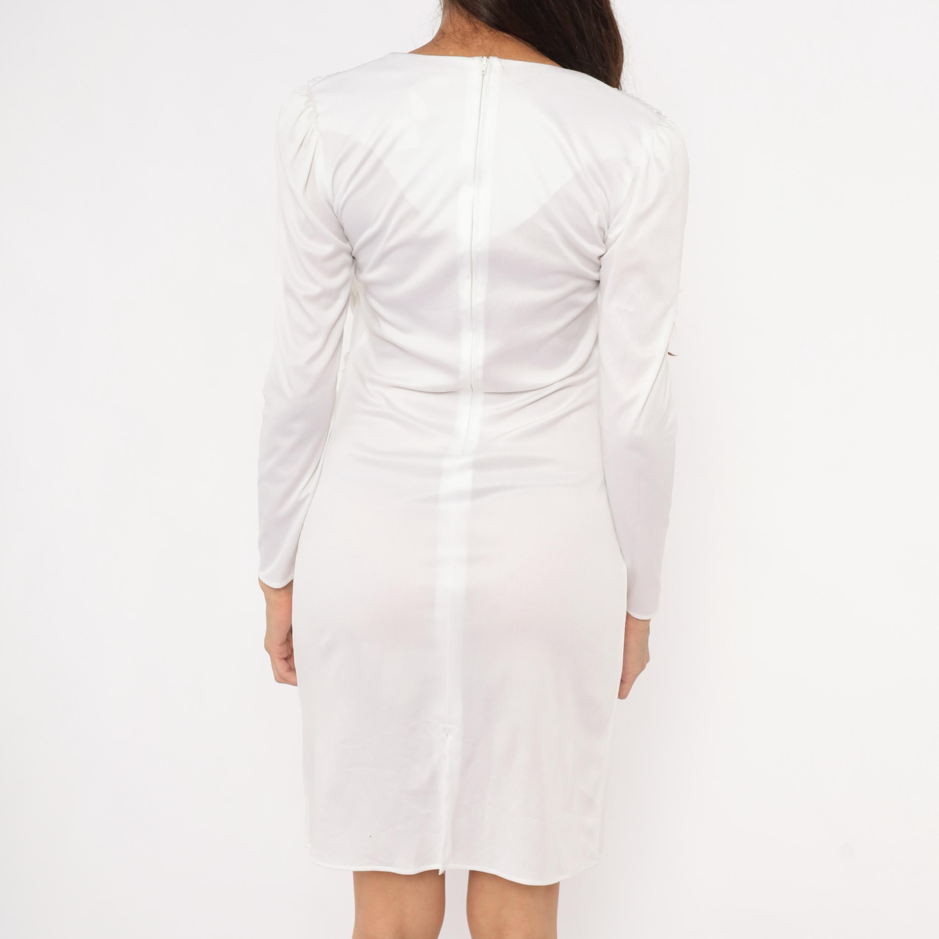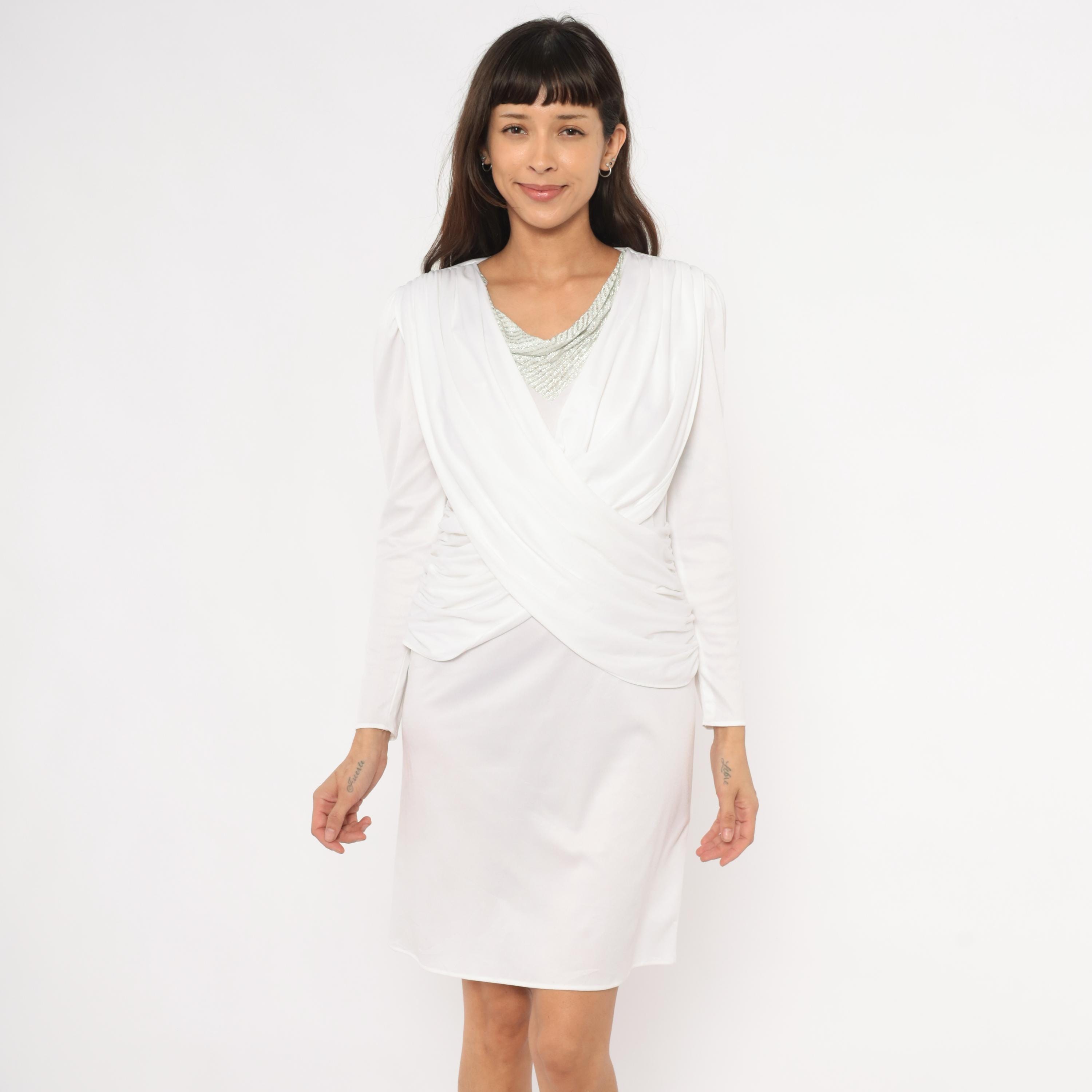80s white draped crossover dress with a silver beaded V-neckline panel and long sleeves. Ruched wrap-front bodice with gathered fabric crossing at the midsection, slightly padded shoulders, and a straight knee-length skirt.