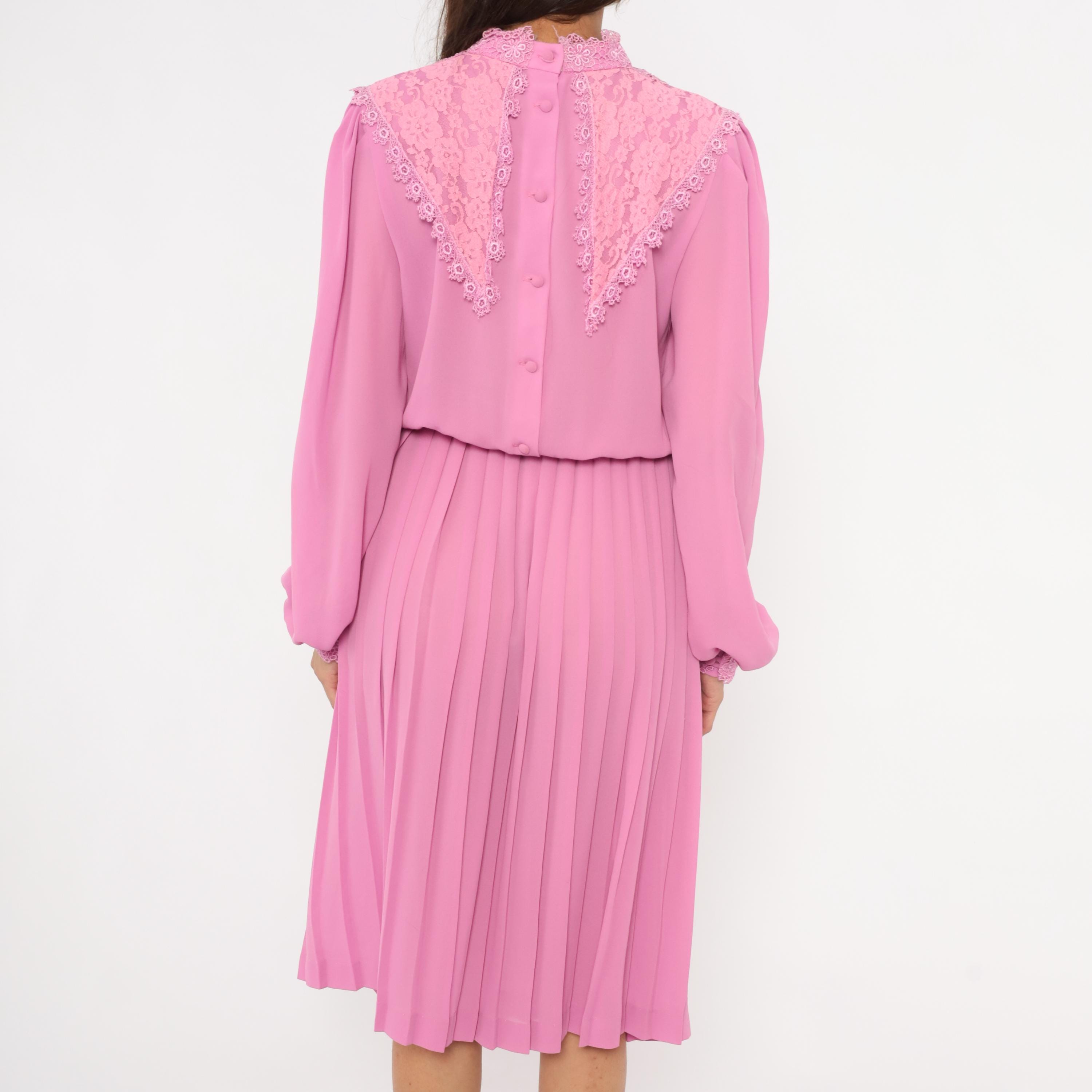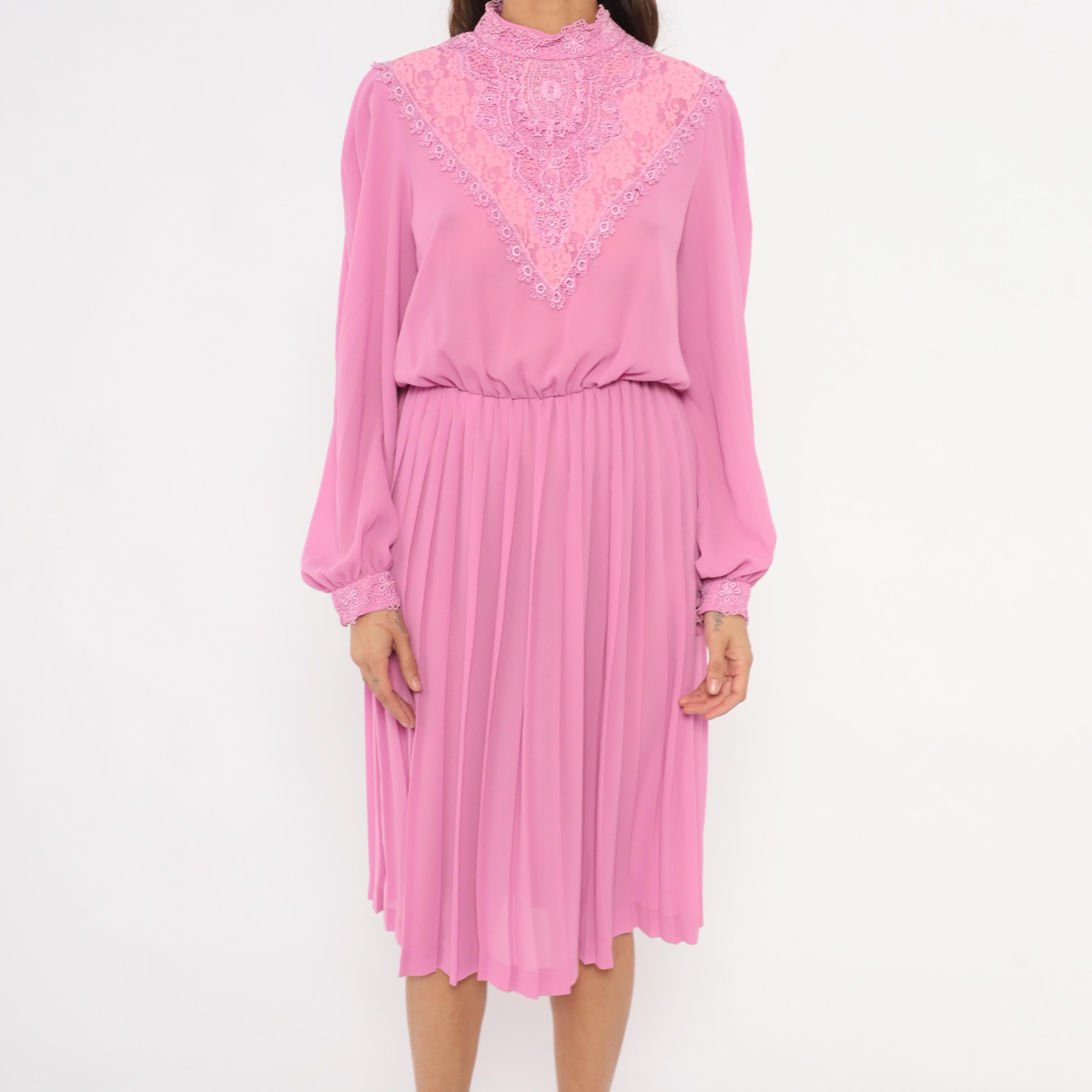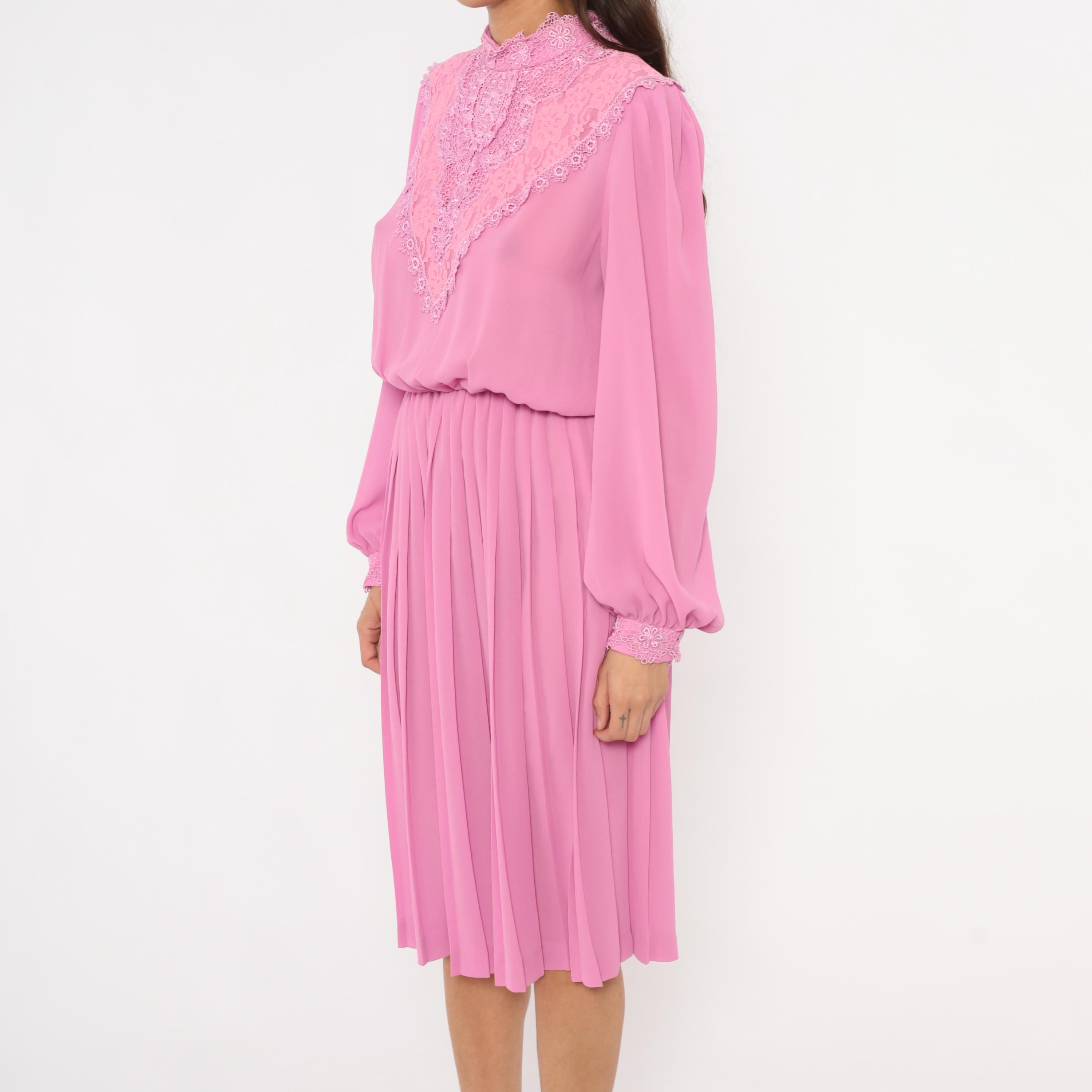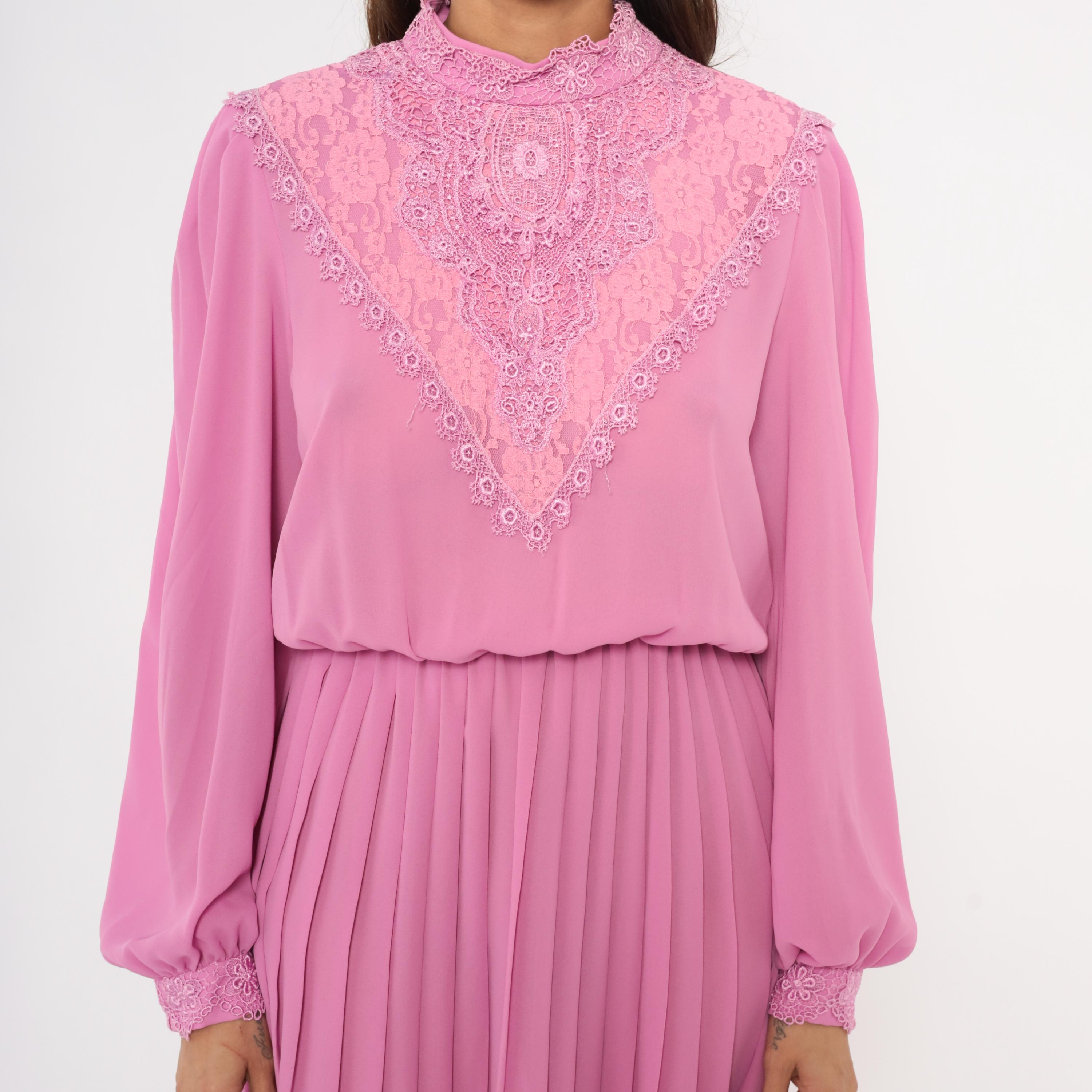80s pink dress from Rimini with a V-shaped lace bib panel at the front and back, high mock neck with lace trim, and matching lace cuffs. Bishop sleeves with gathered shoulders, elastic blouson waist, and a knife-pleated skirt. Back button closure with snap at the neck. Rose and mauve tones throughout with a semi-sheer lace yoke showing a floral medallion pattern.