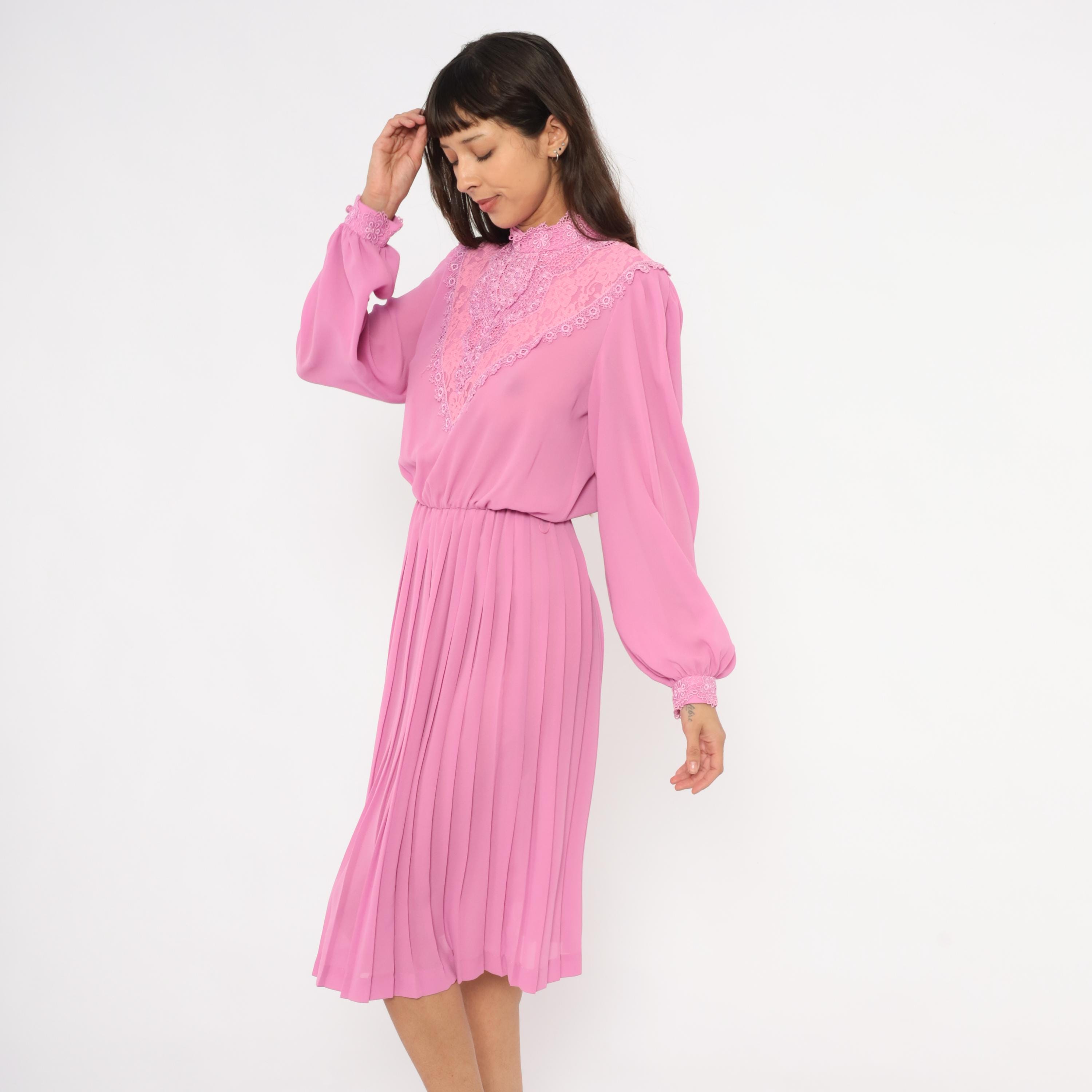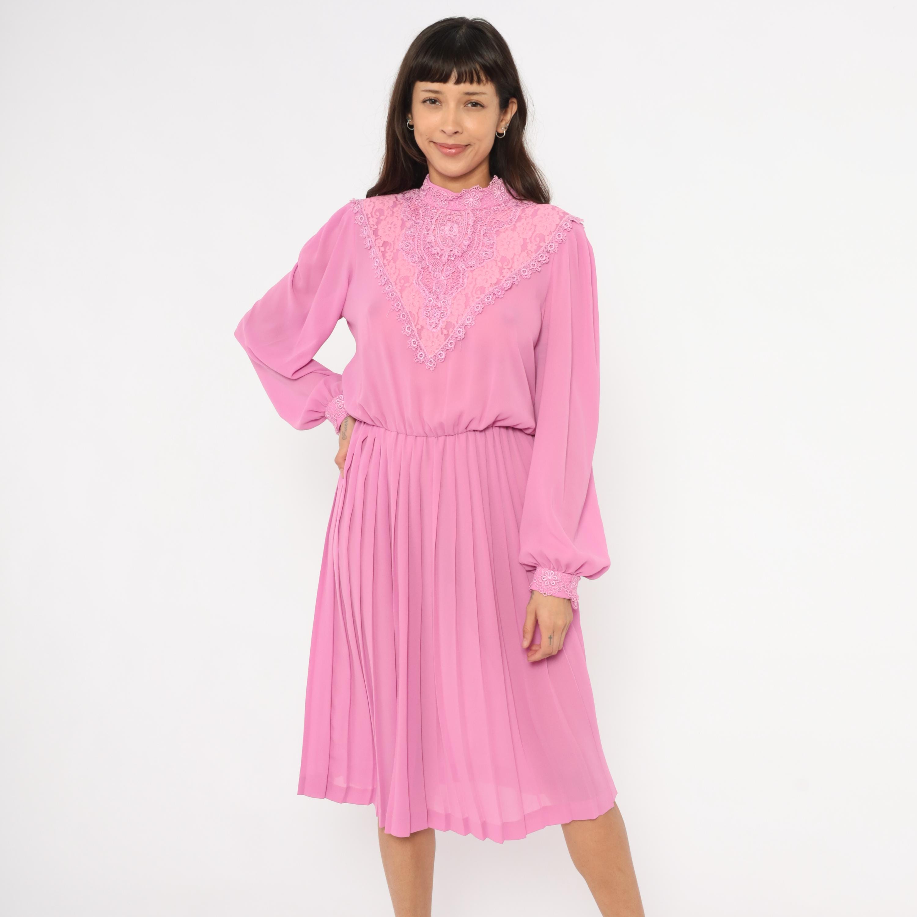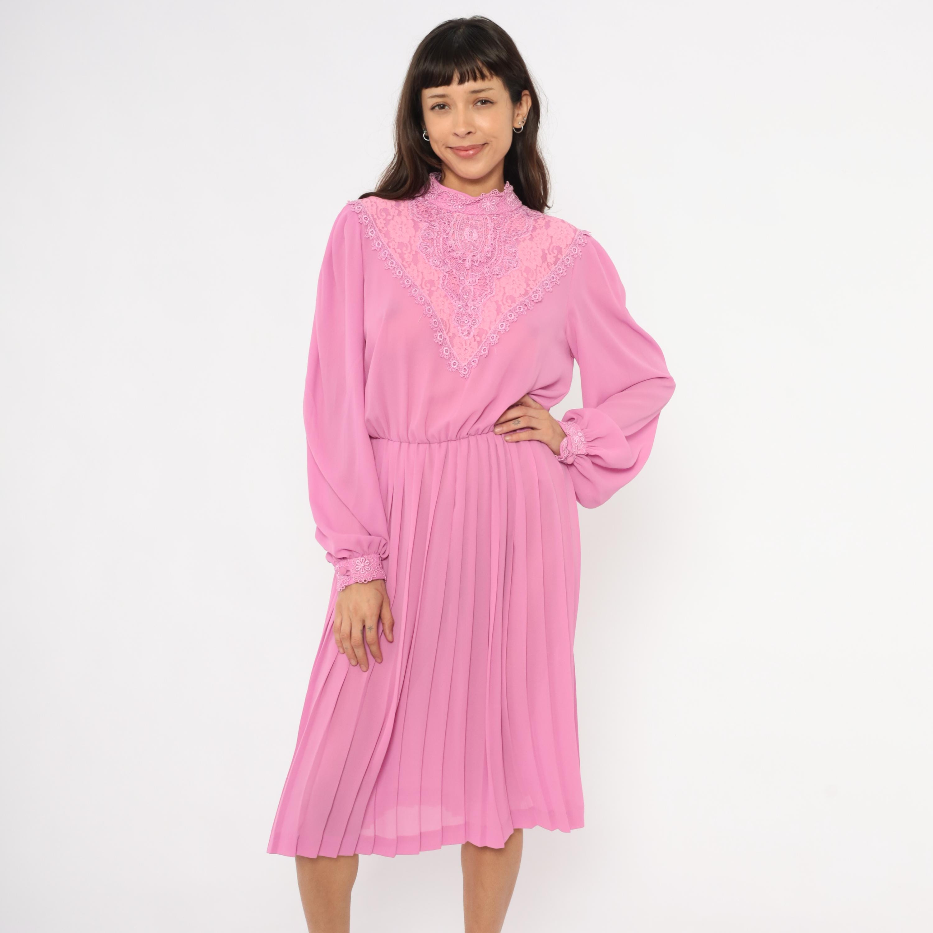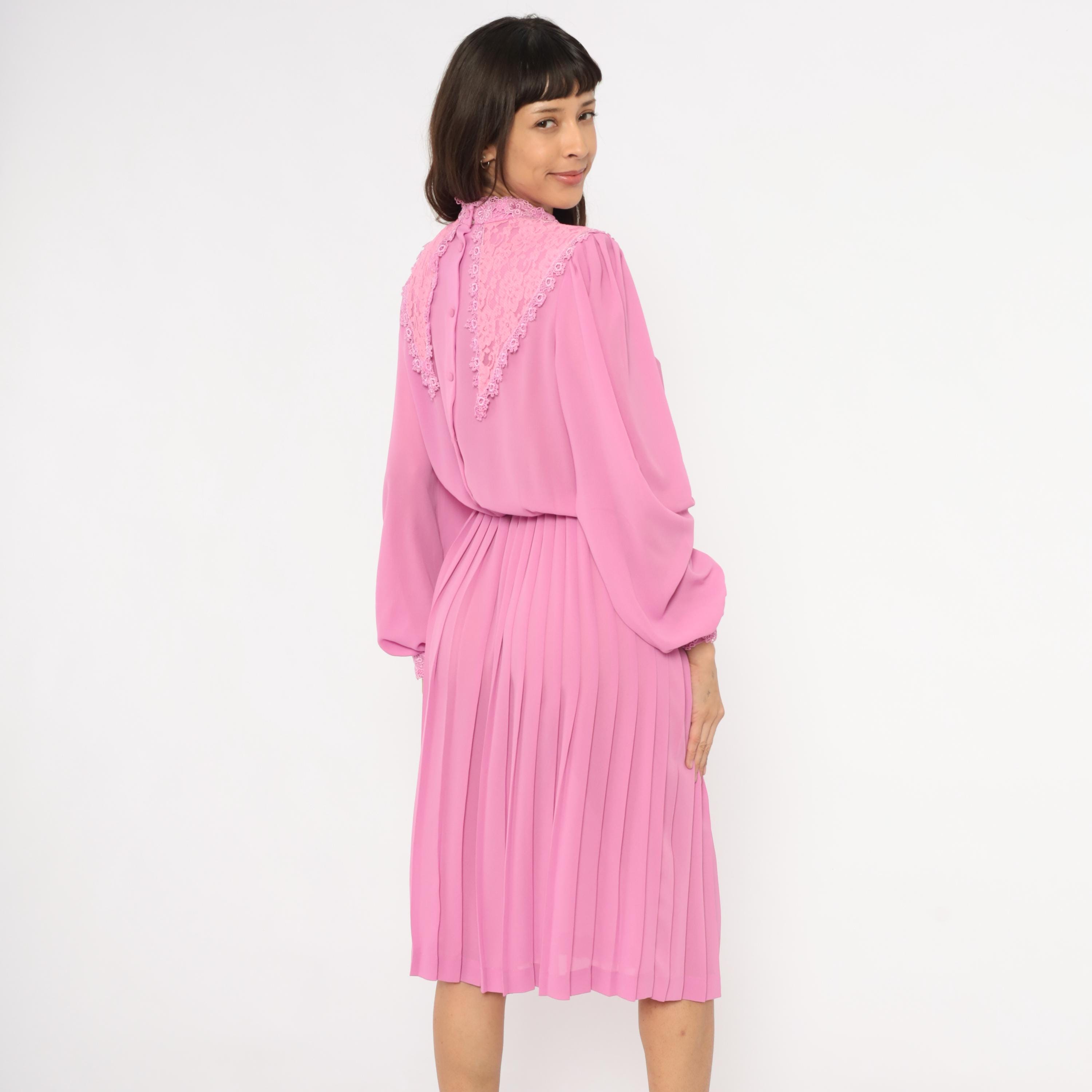 80s pink dress from Rimini with a V-shaped lace bib panel at the front and back, high mock neck with lace trim, and matching lace cuffs. Bishop sleeves with gathered shoulders, elastic blouson waist, and a knife-pleated skirt. Back button closure with snap at the neck. Rose and mauve tones throughout with a semi-sheer lace yoke showing a floral medallion pattern.