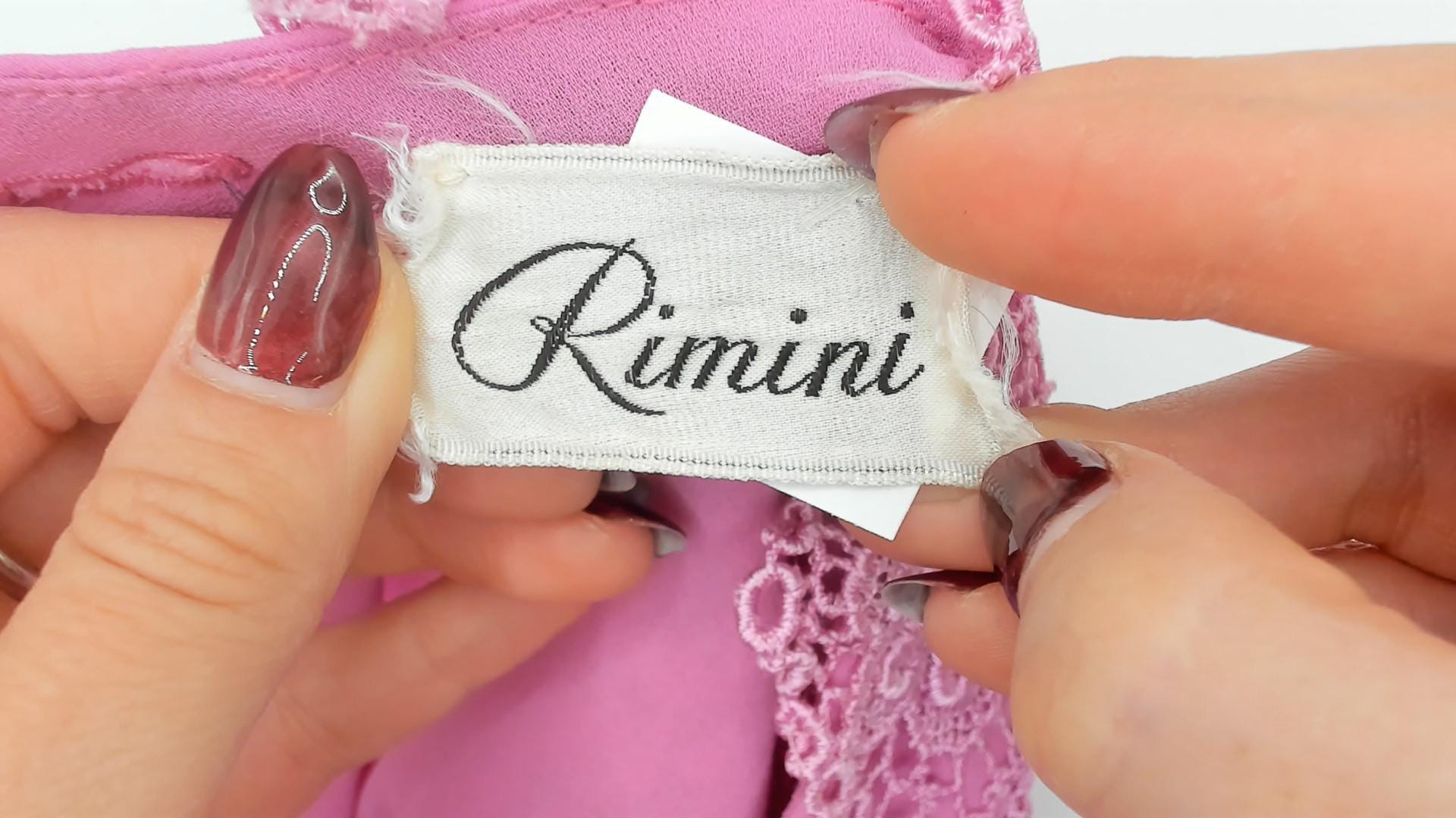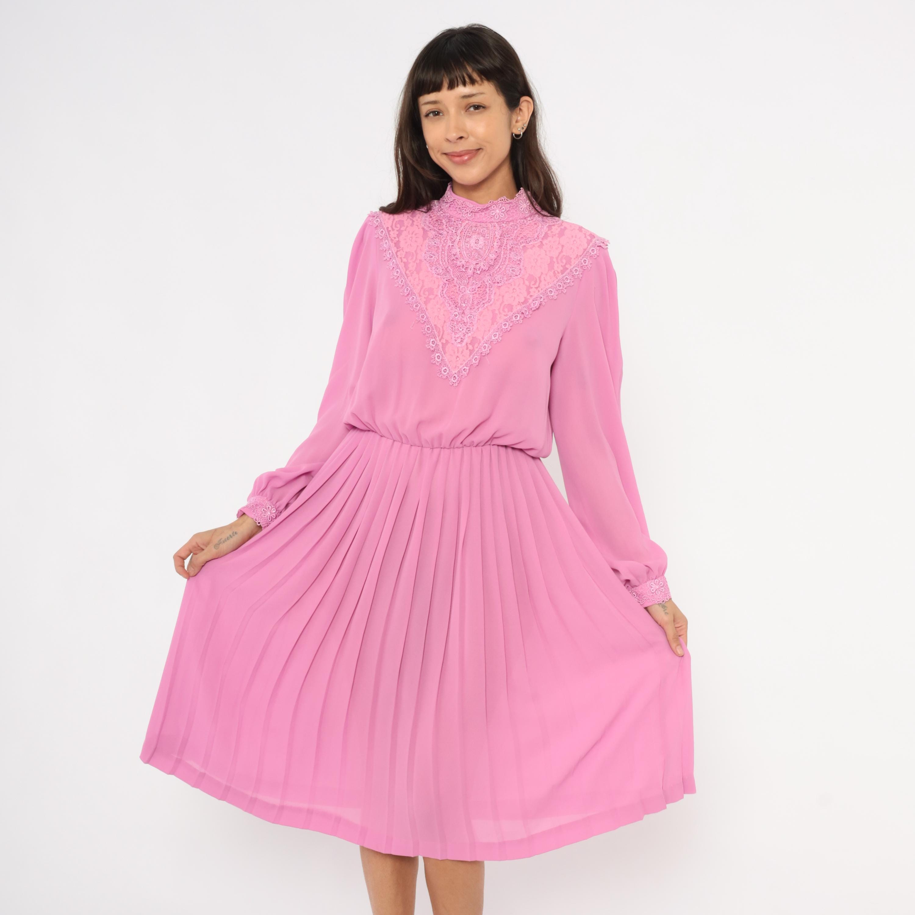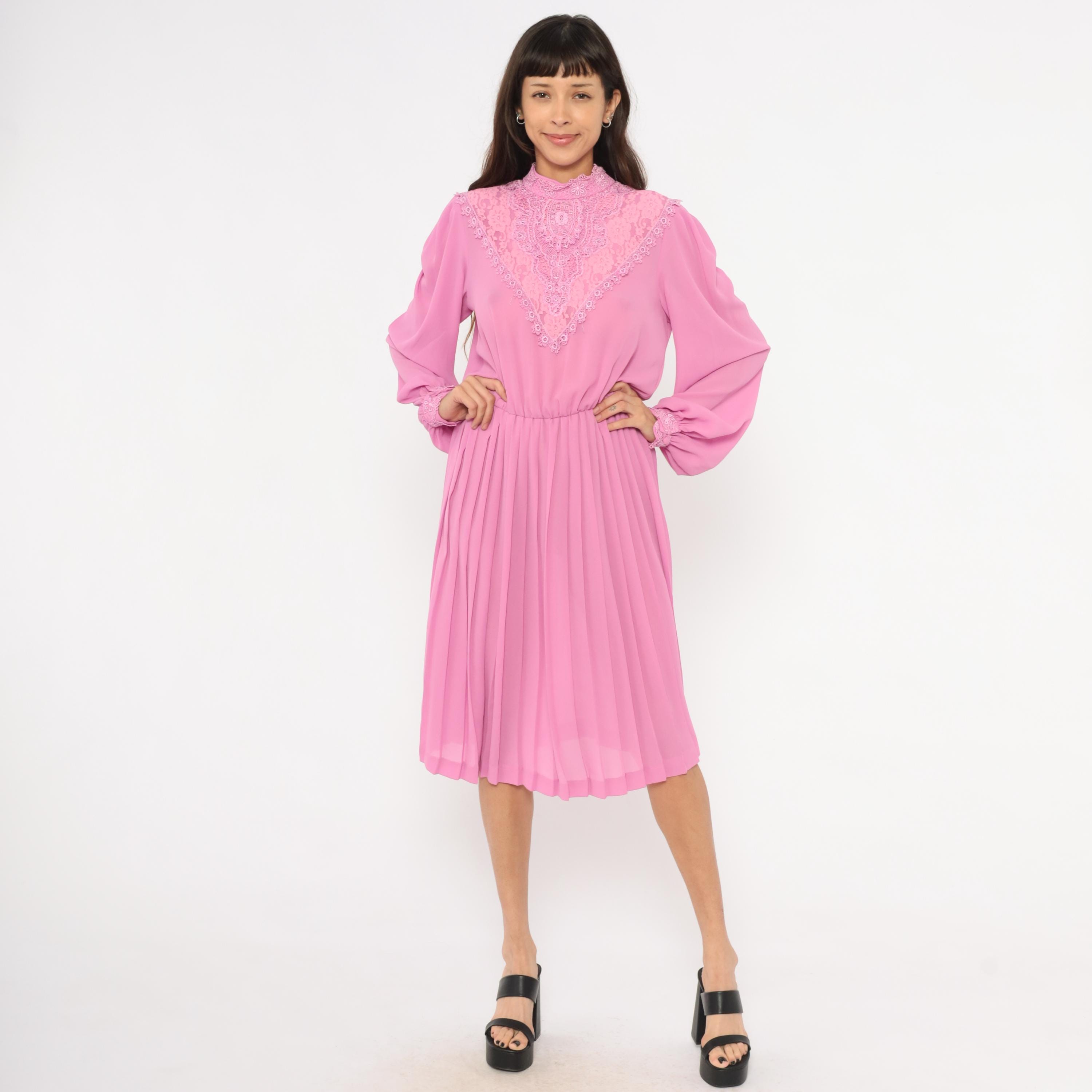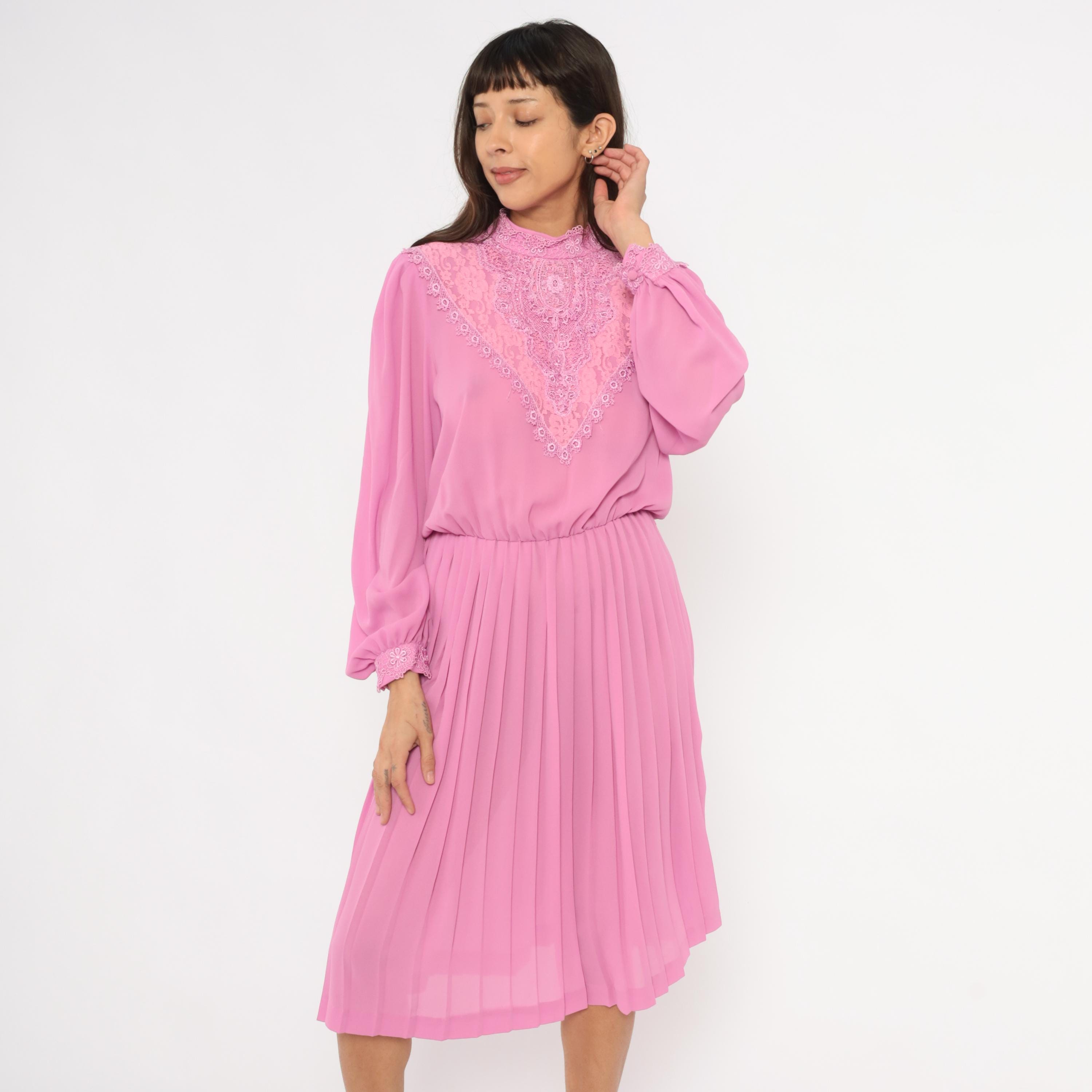80s pink dress from Rimini with a V-shaped lace bib panel at the front and back, high mock neck with lace trim, and matching lace cuffs. Bishop sleeves with gathered shoulders, elastic blouson waist, and a knife-pleated skirt. Back button closure with snap at the neck. Rose and mauve tones throughout with a semi-sheer lace yoke showing a floral medallion pattern.