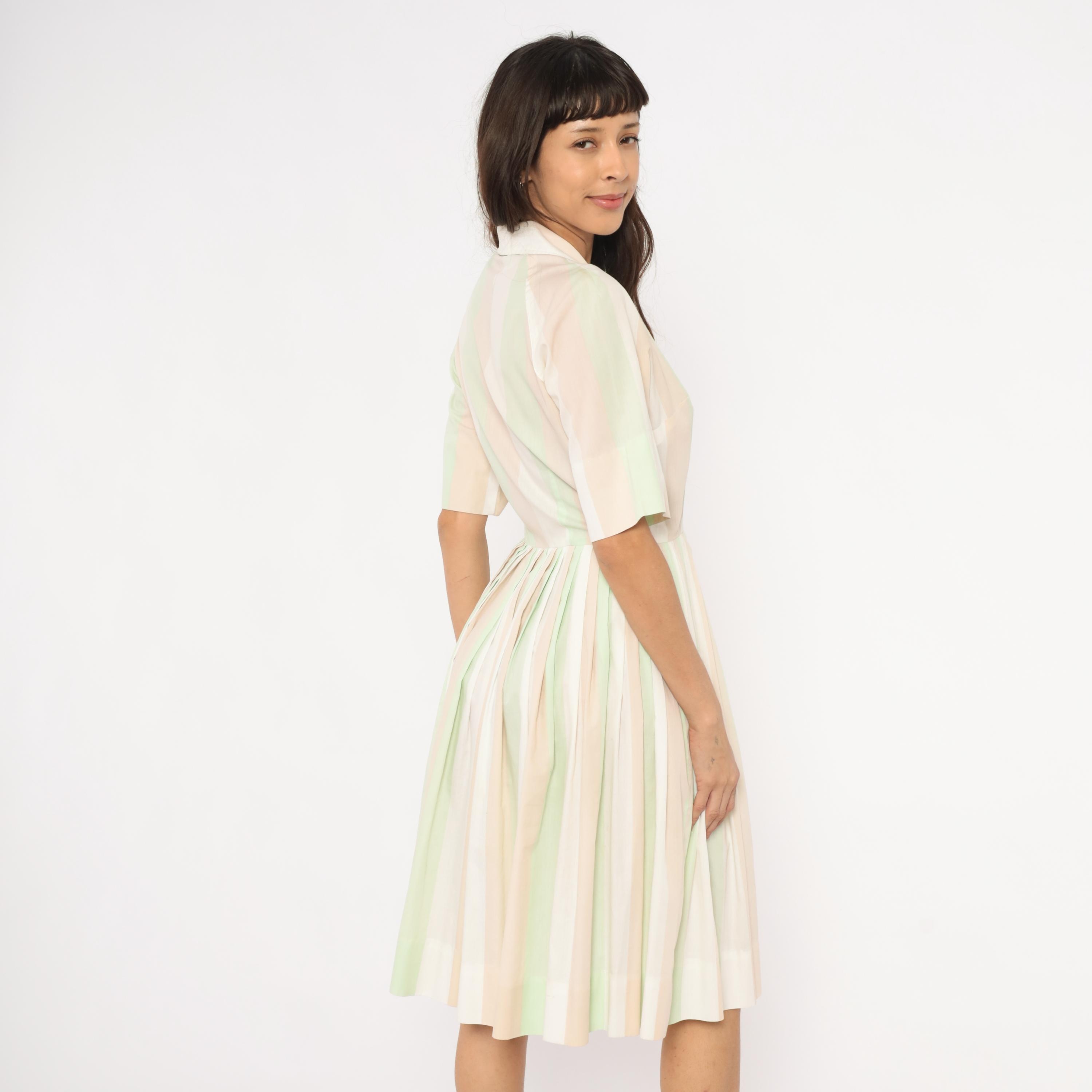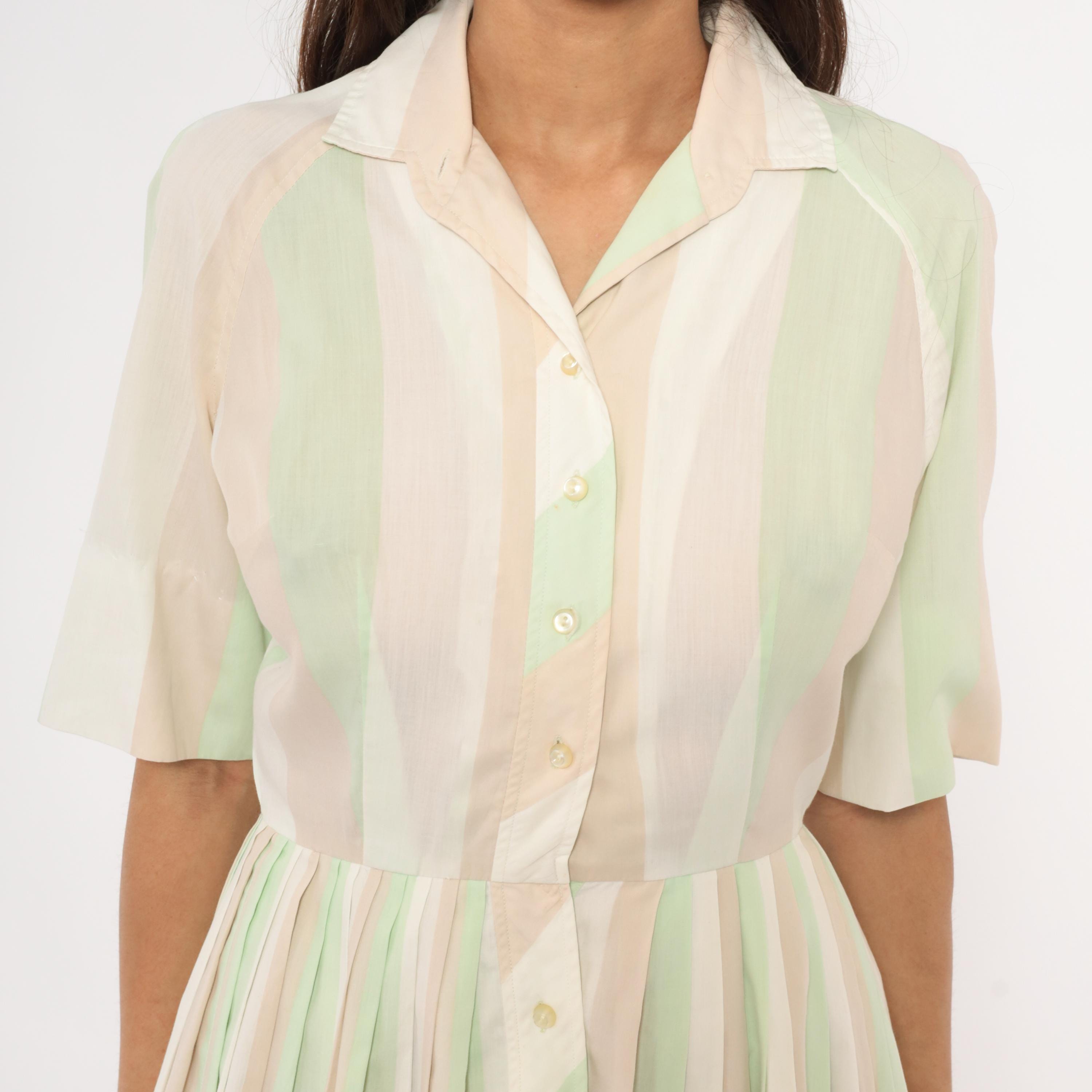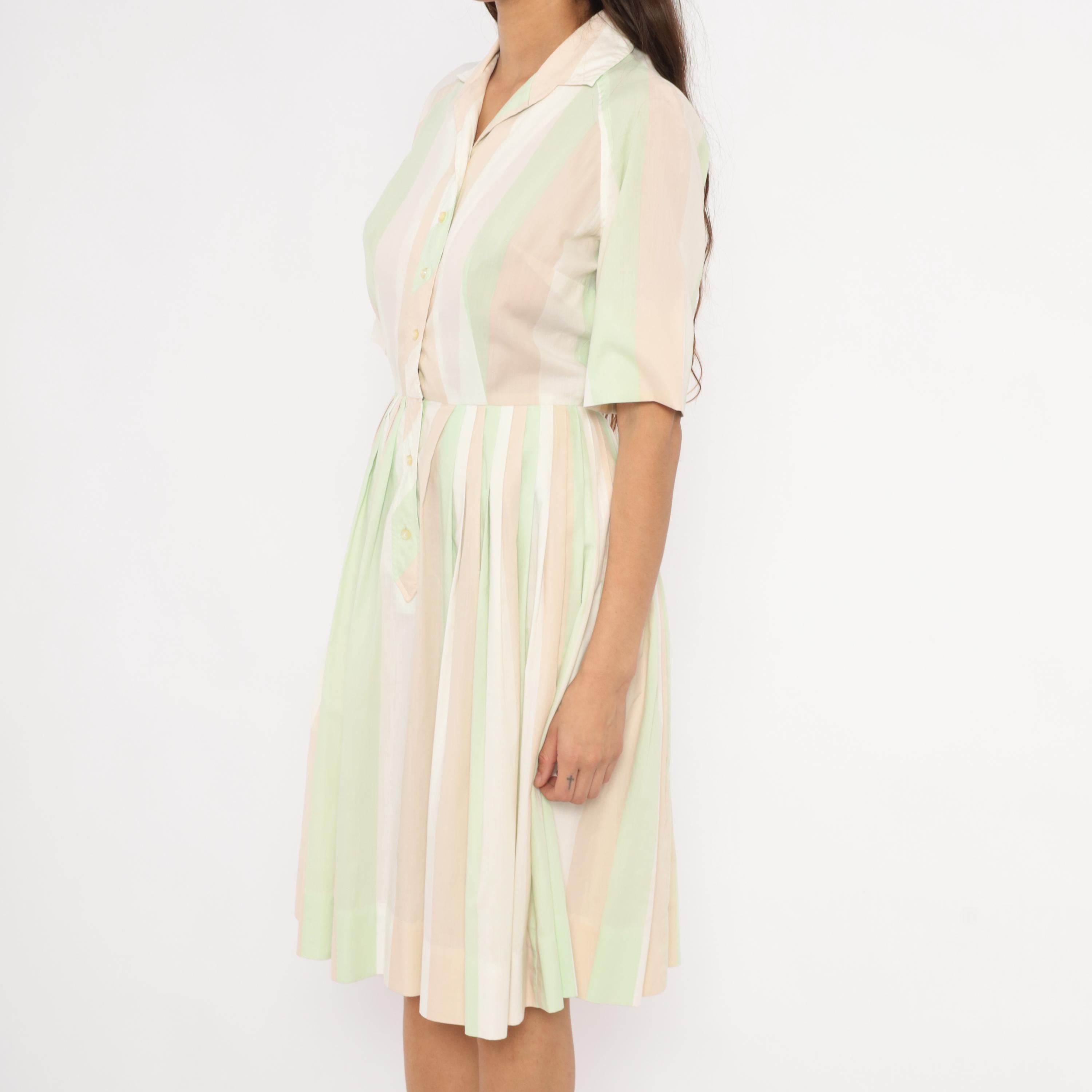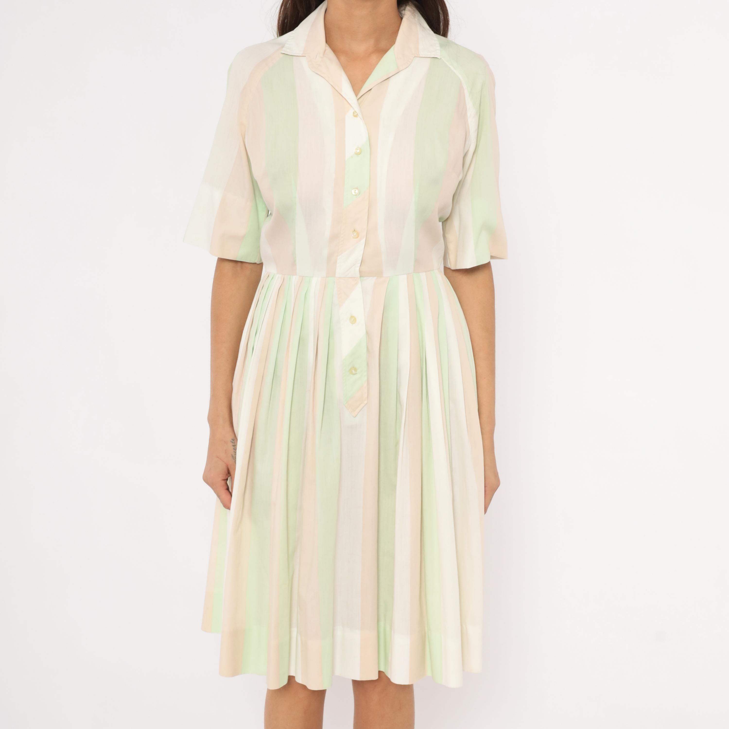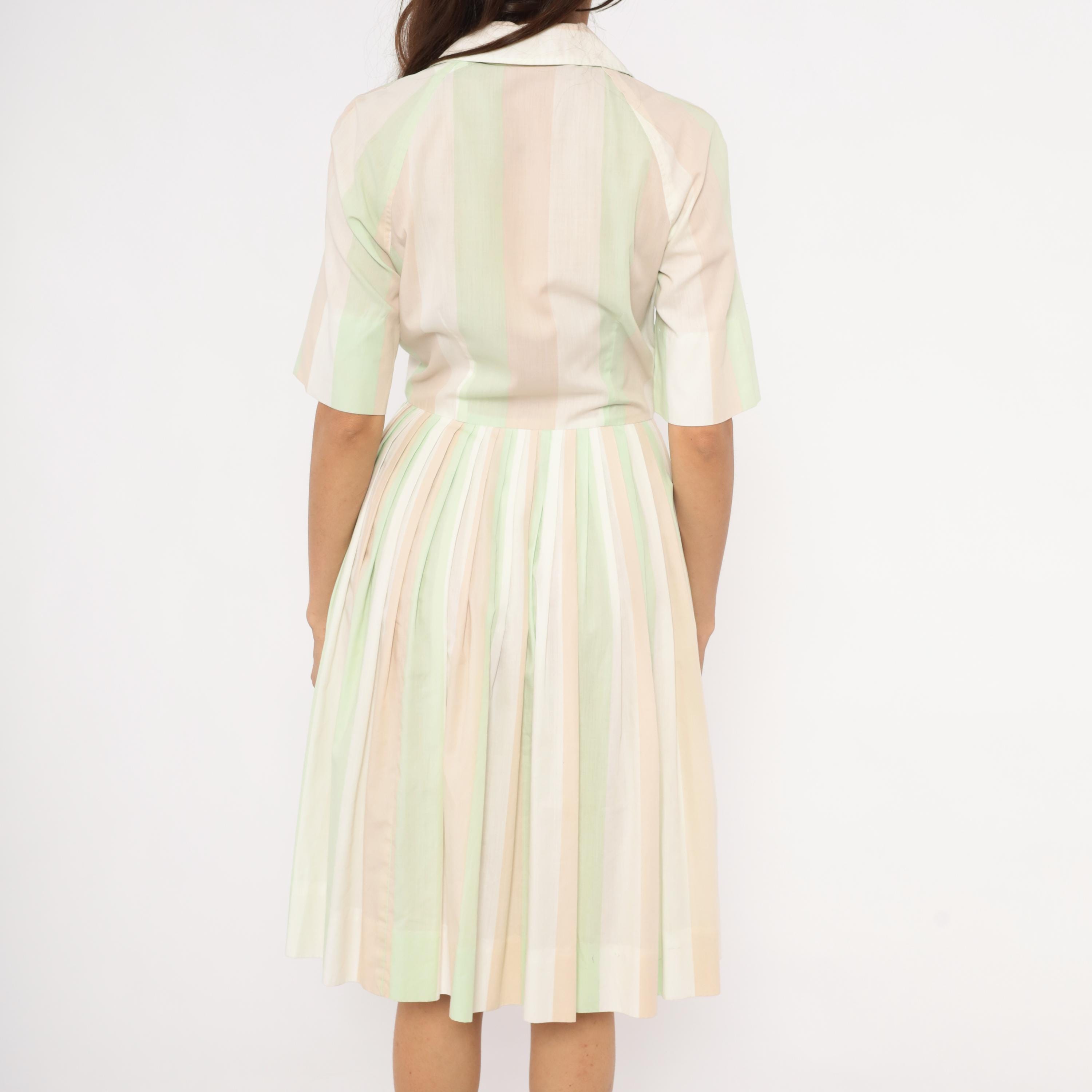 60s pastel striped shirtdress with alternating mint green, blush pink, and ivory vertical stripes. Notched collar, button front closure, and elbow-length sleeves on a fitted bodice with a defined waist. Pleated full skirt falls to knee length with the stripe pattern continuing through the pleats.
