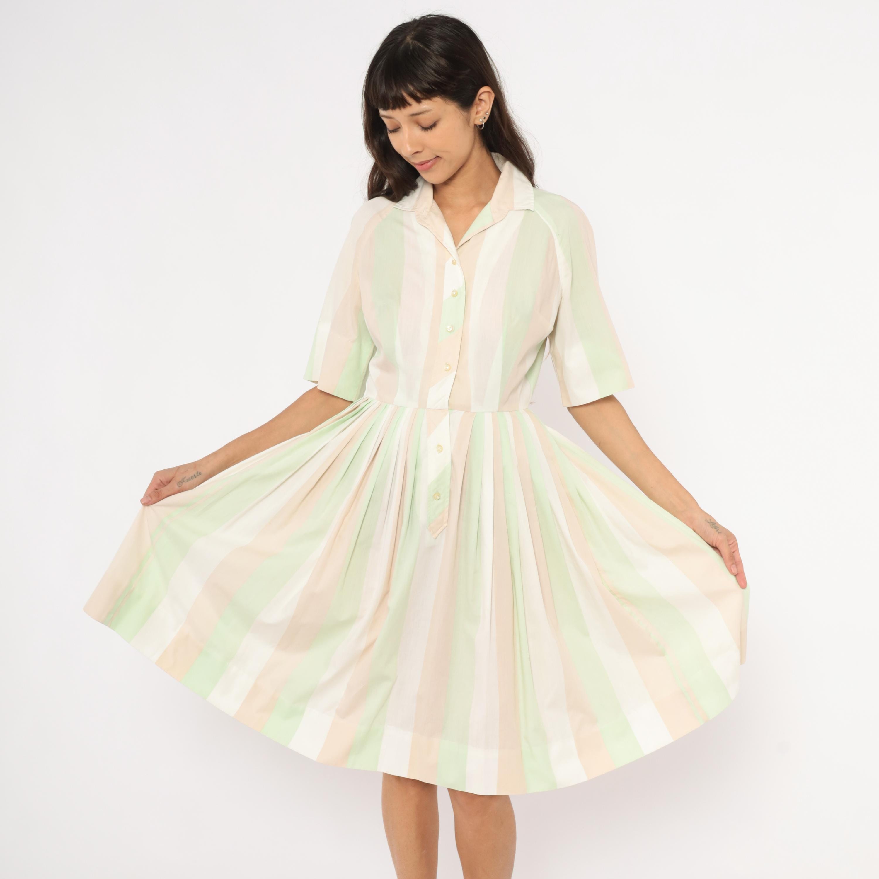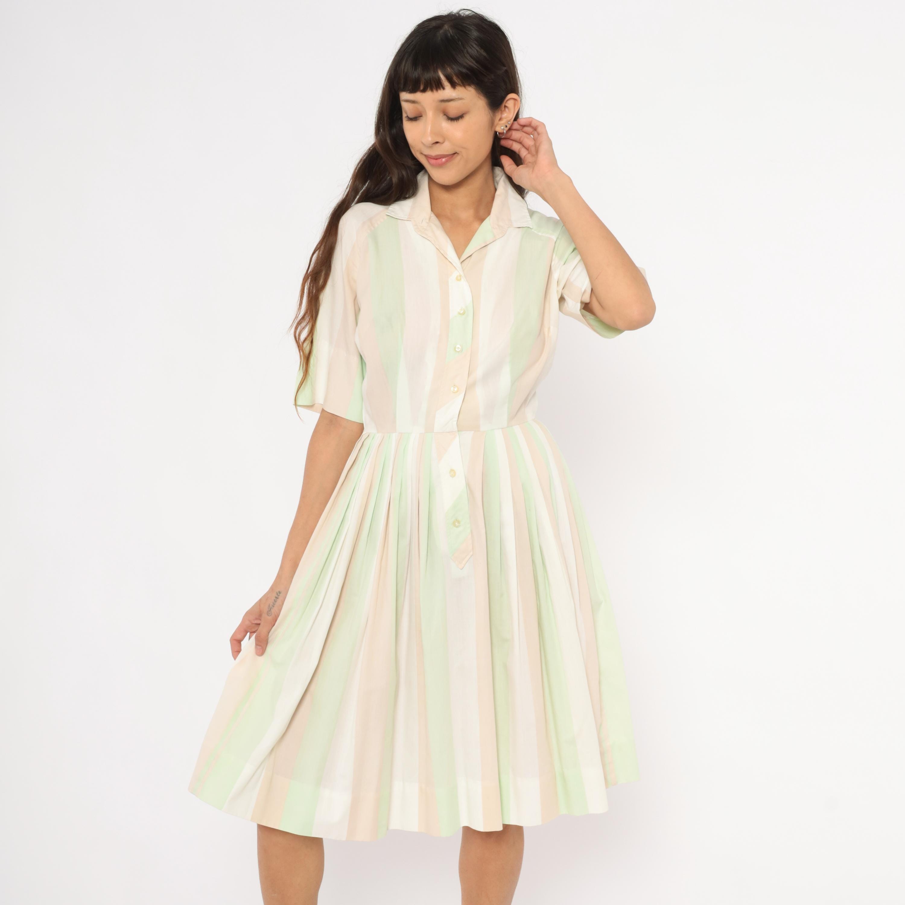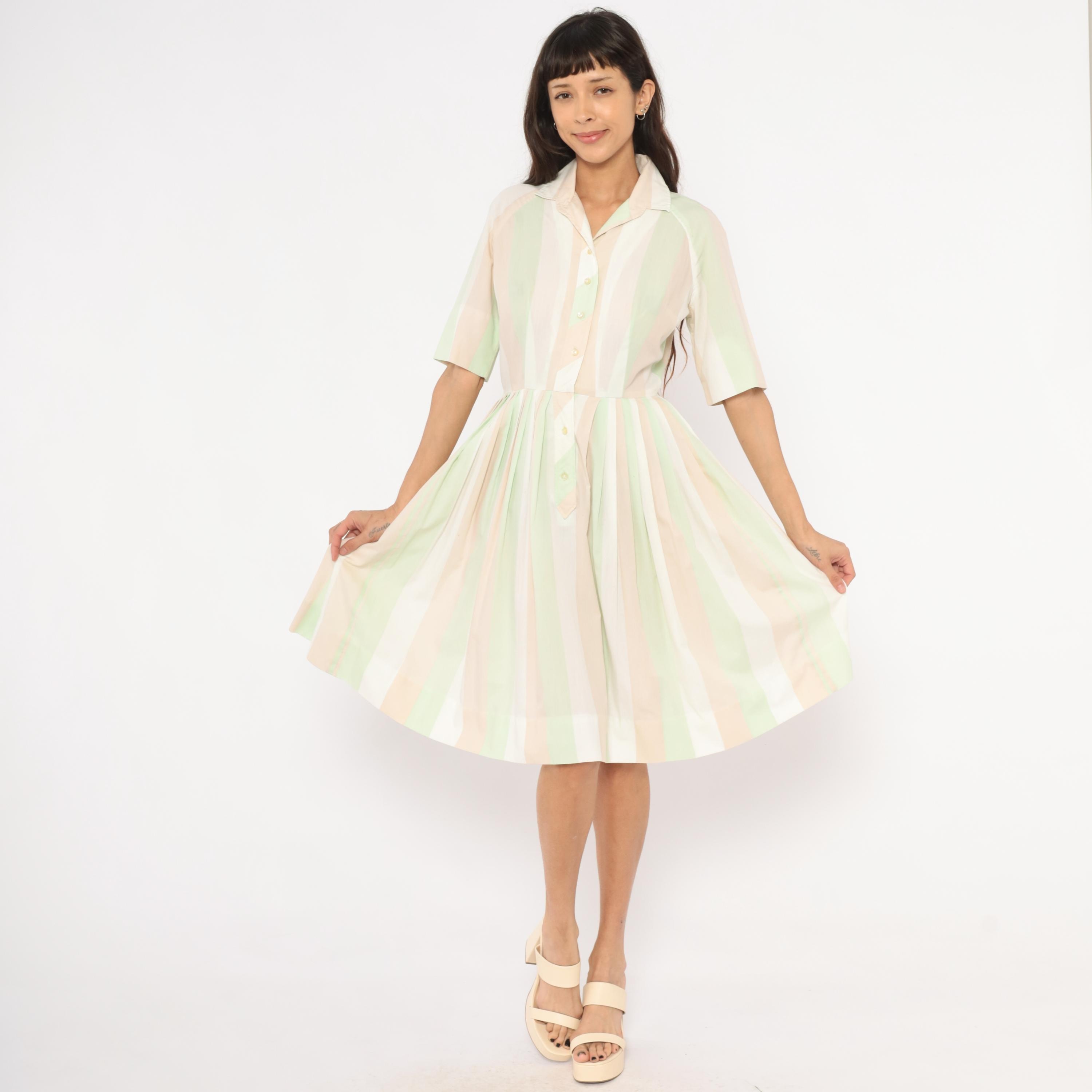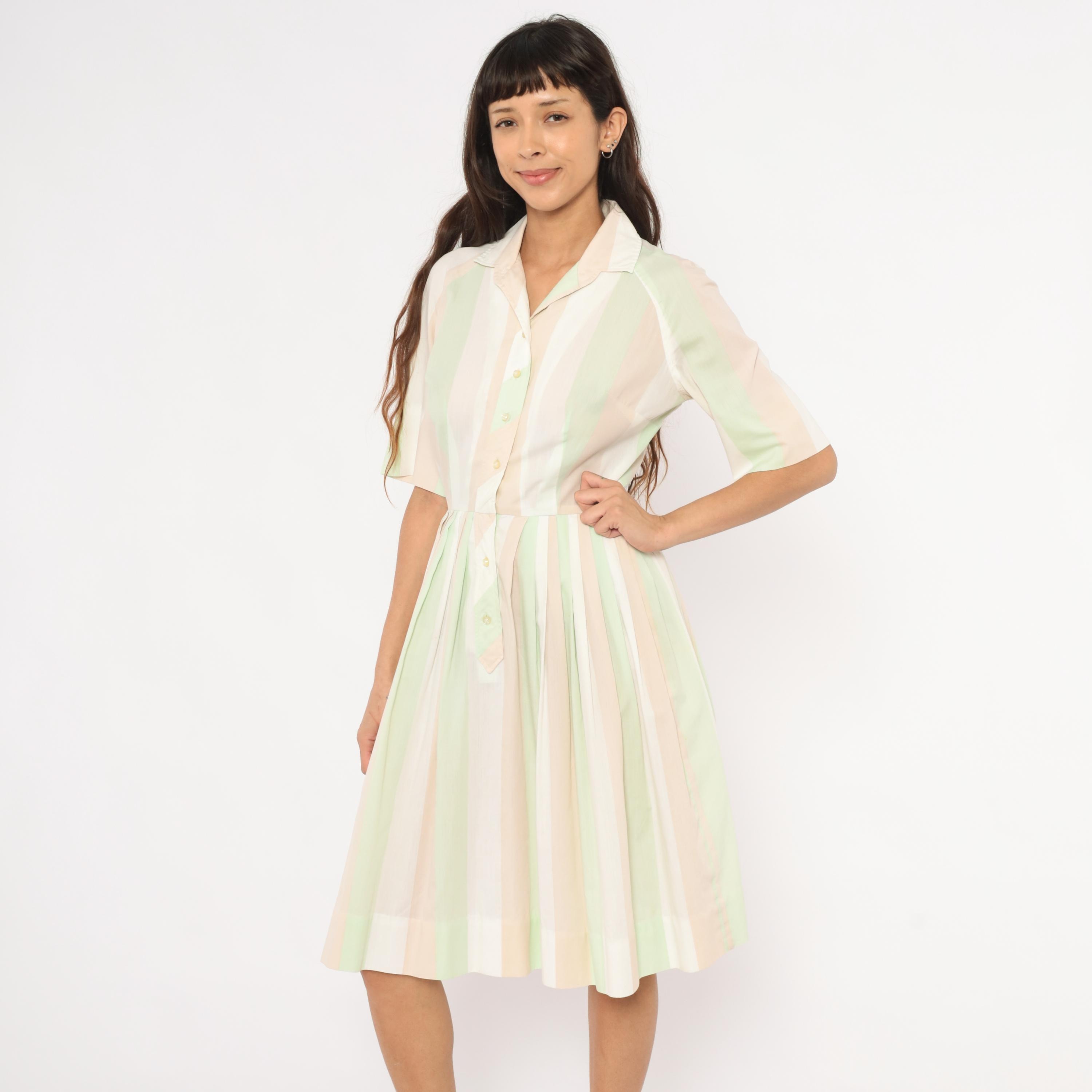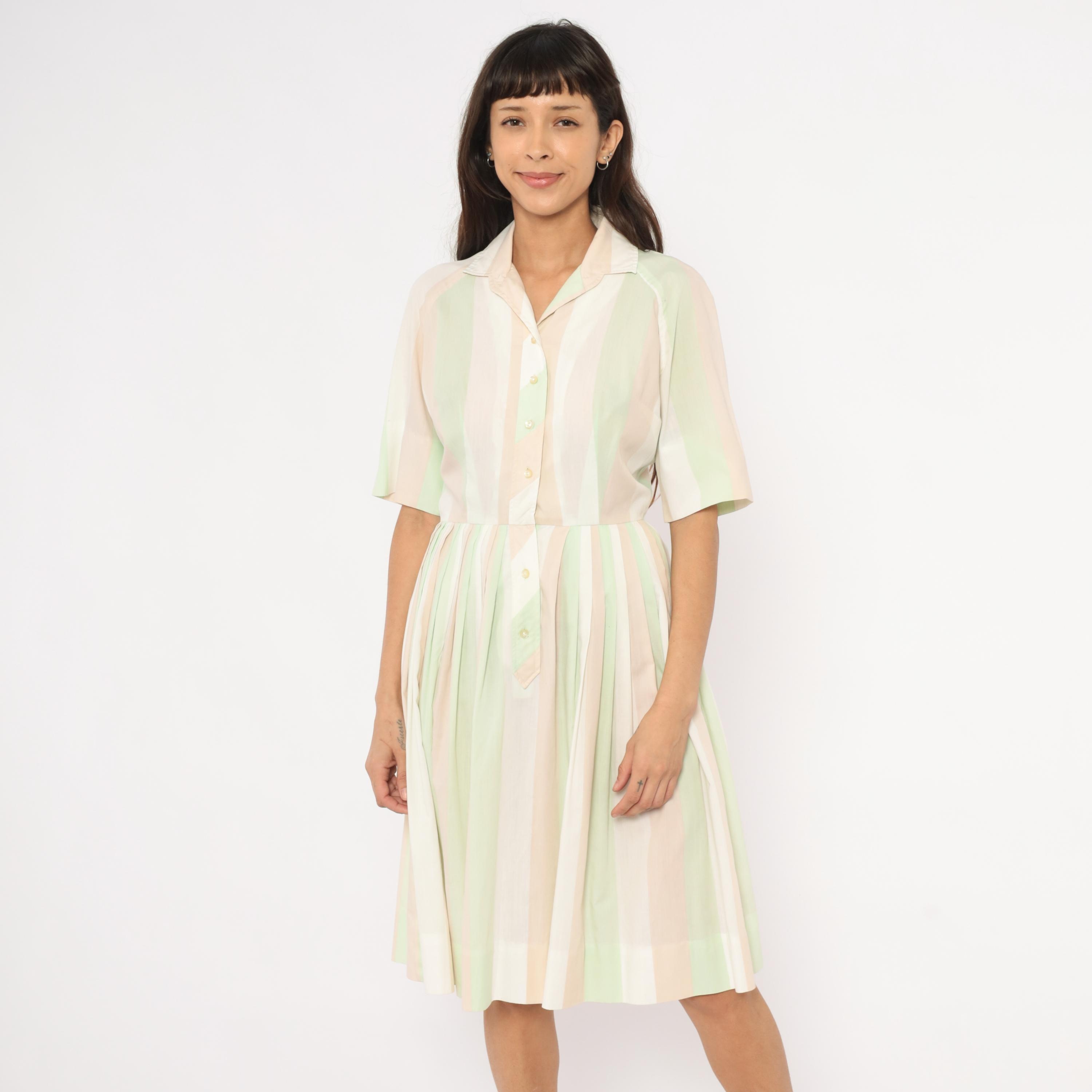 60s pastel striped shirtdress with alternating mint green, blush pink, and ivory vertical stripes. Notched collar, button front closure, and elbow-length sleeves on a fitted bodice with a defined waist. Pleated full skirt falls to knee length with the stripe pattern continuing through the pleats.