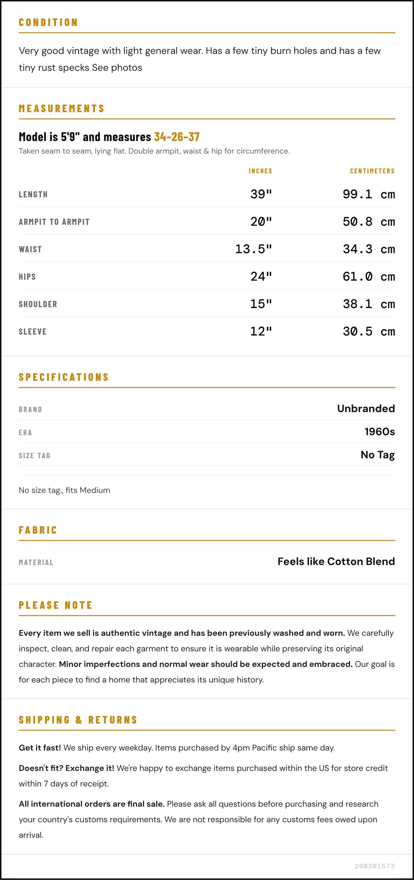 Condition: Very good vintage with light general wear. Has a few tiny burn holes and has a few tiny rust specks See photos