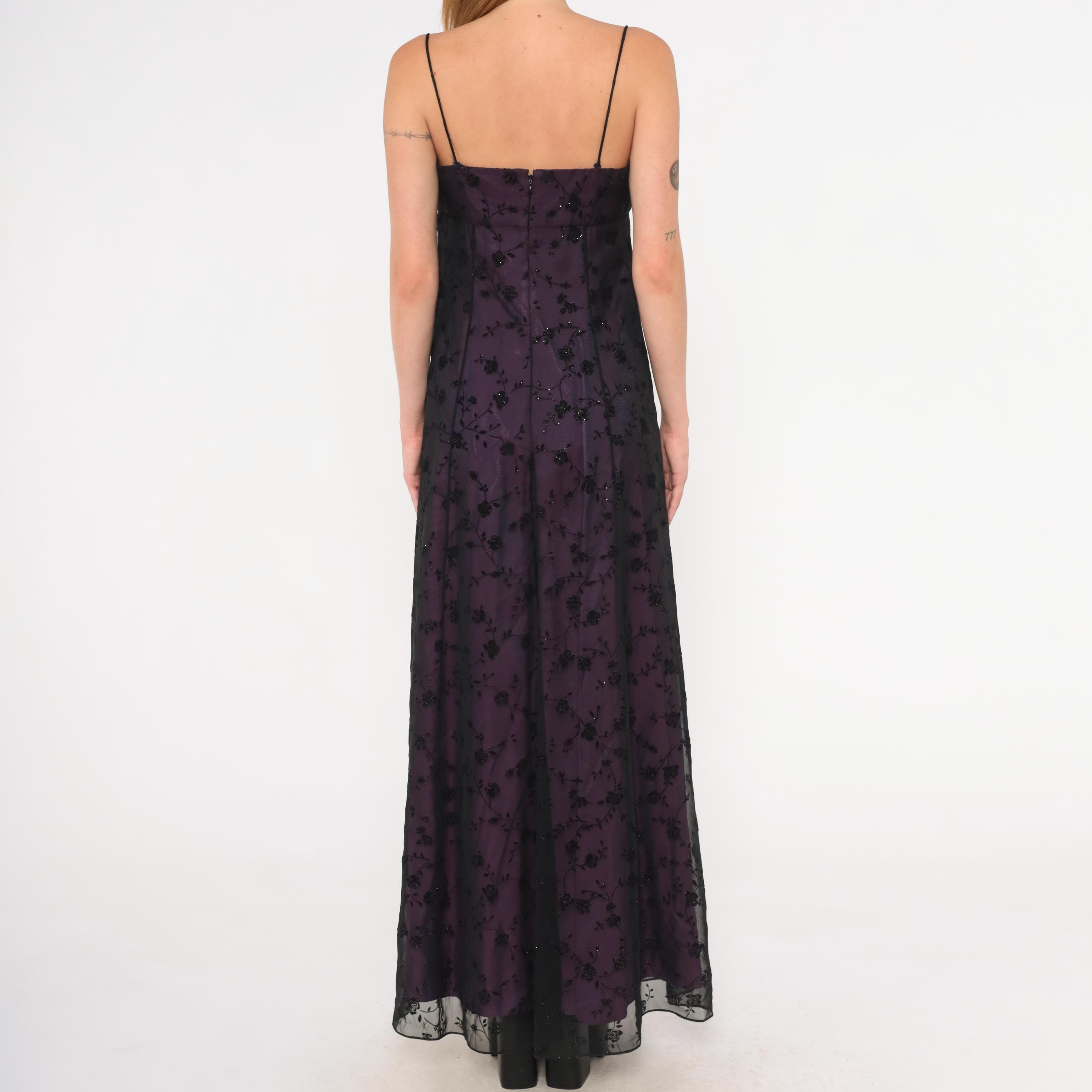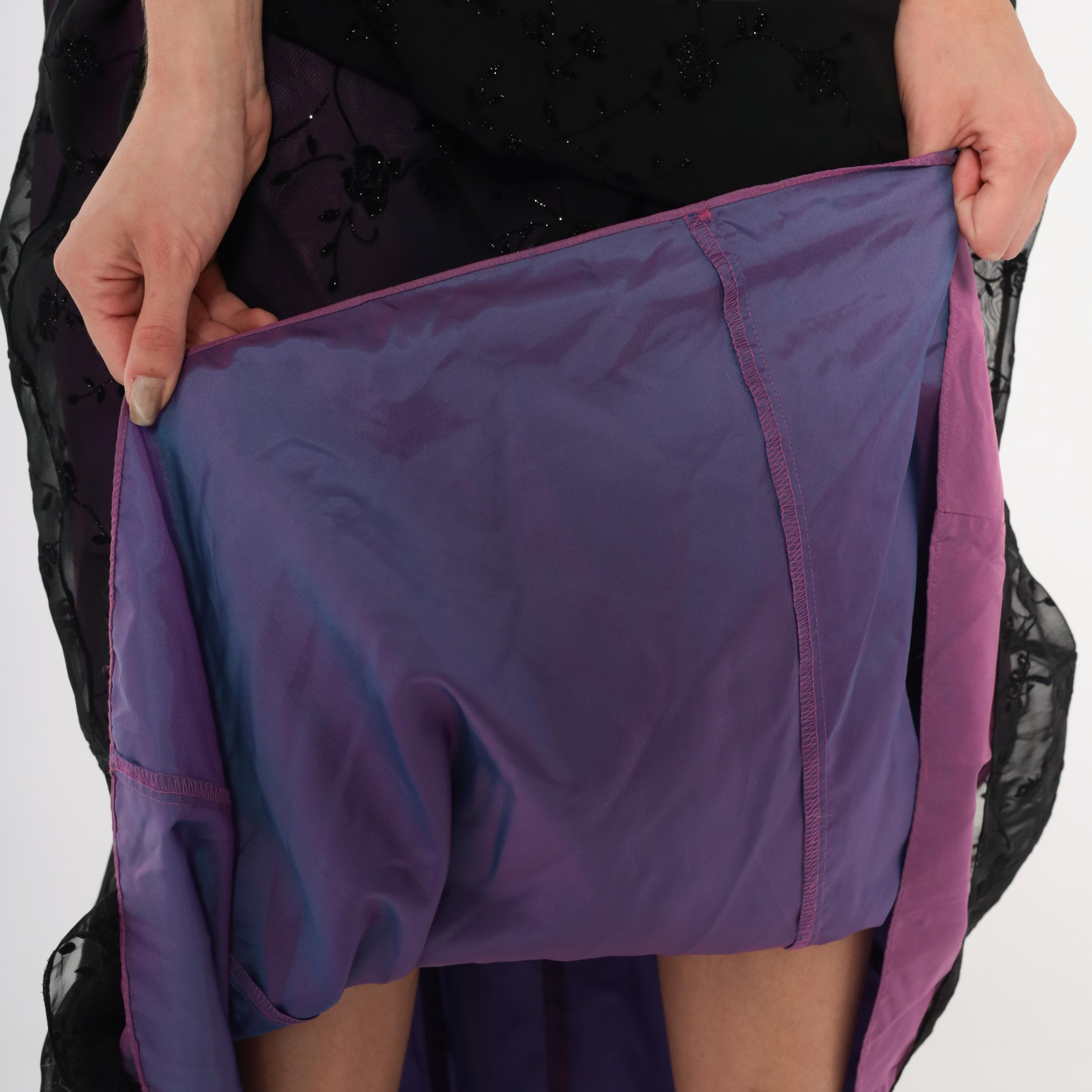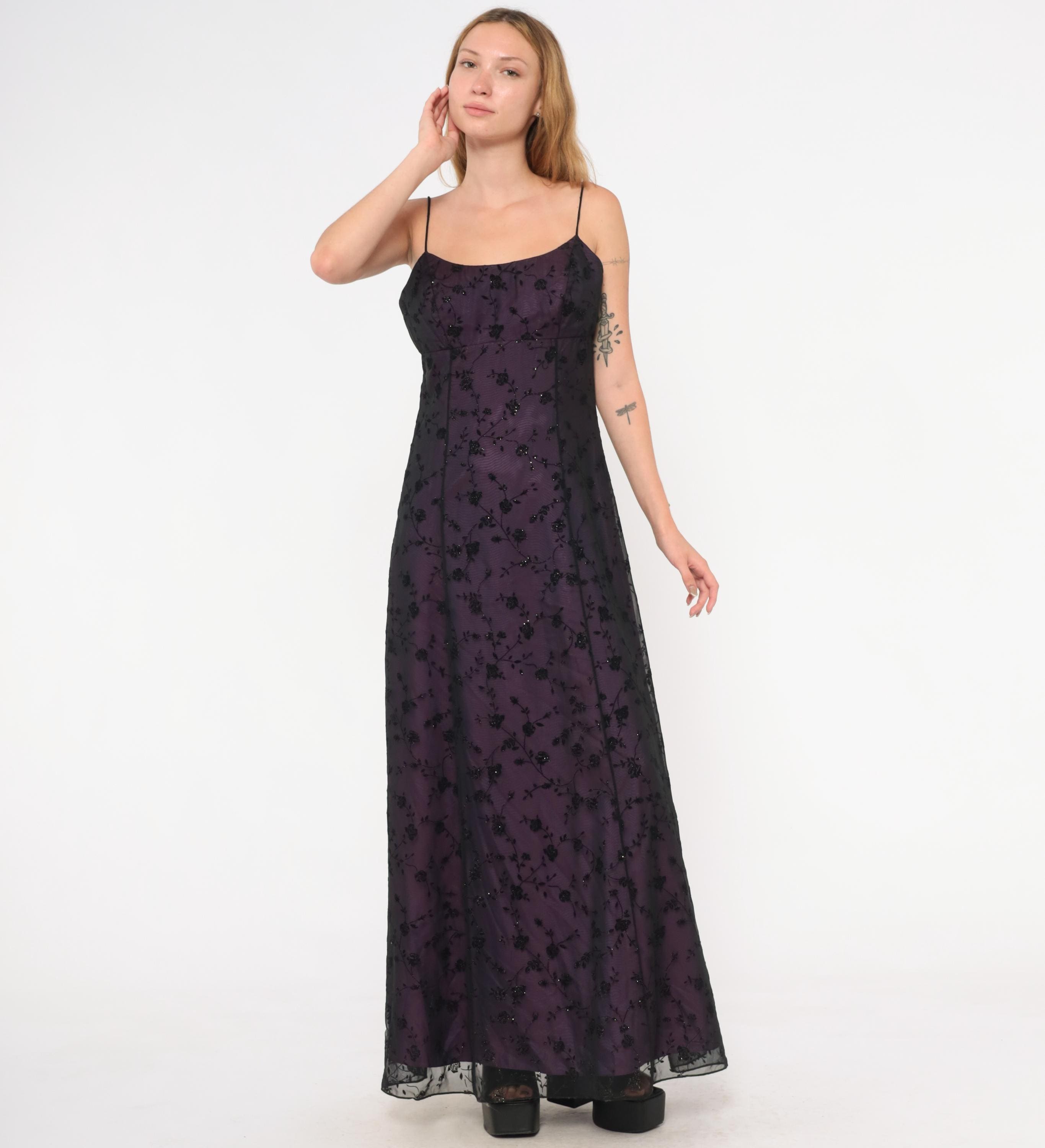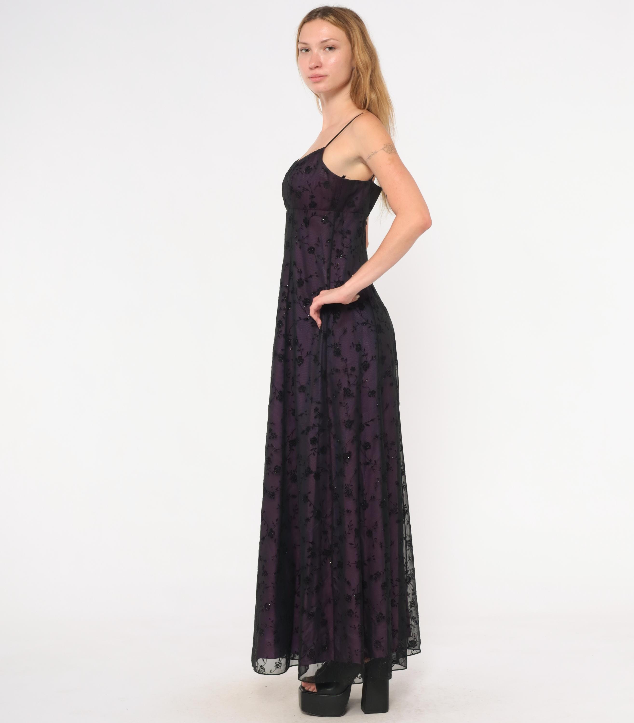 90s black floral lace overlay maxi gown from Chelsea Nites with a deep plum purple lining visible beneath the sheer embroidered mesh outer layer. Glitter accents scattered throughout the floral vine embroidery pattern across the entire dress.