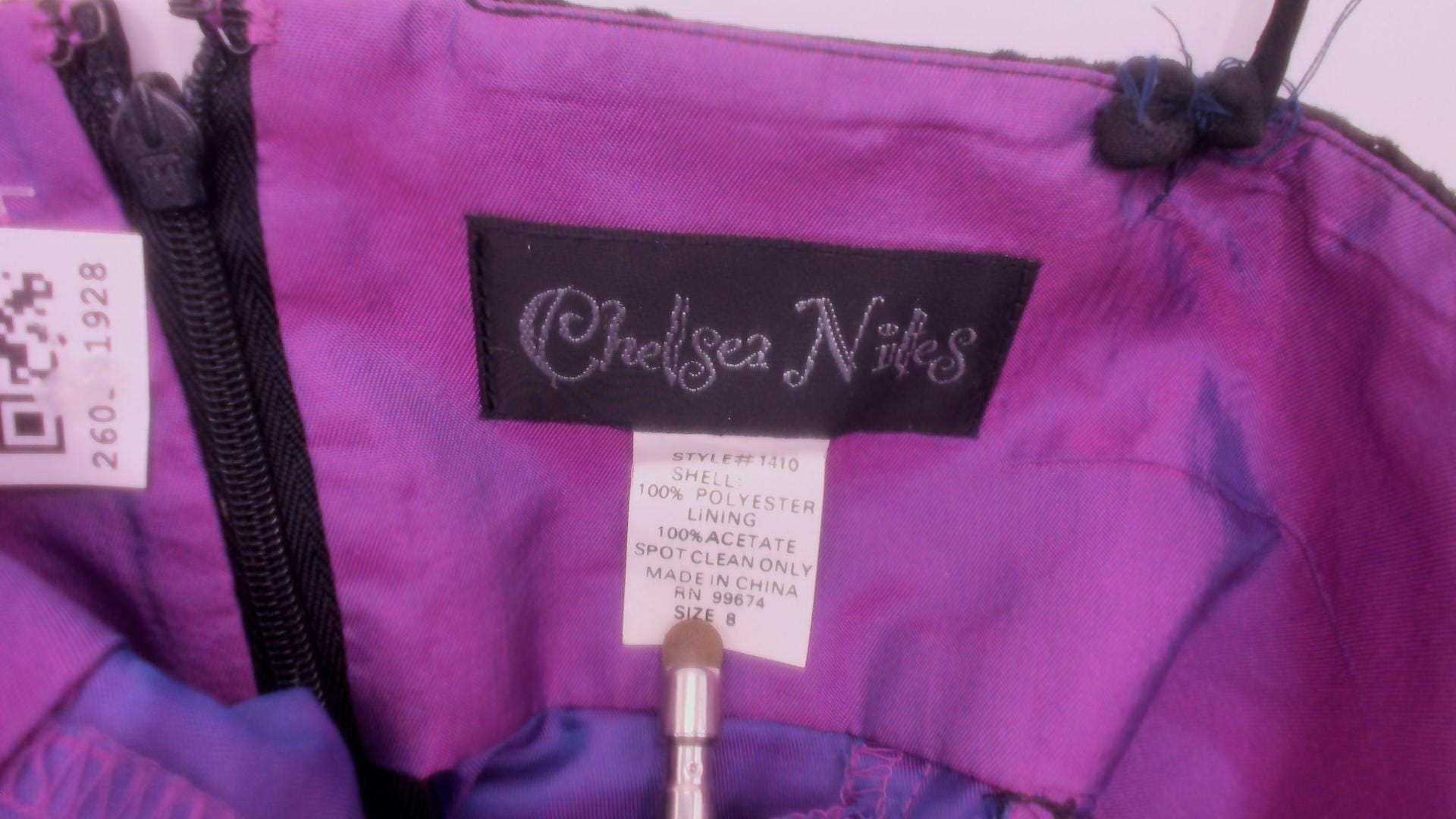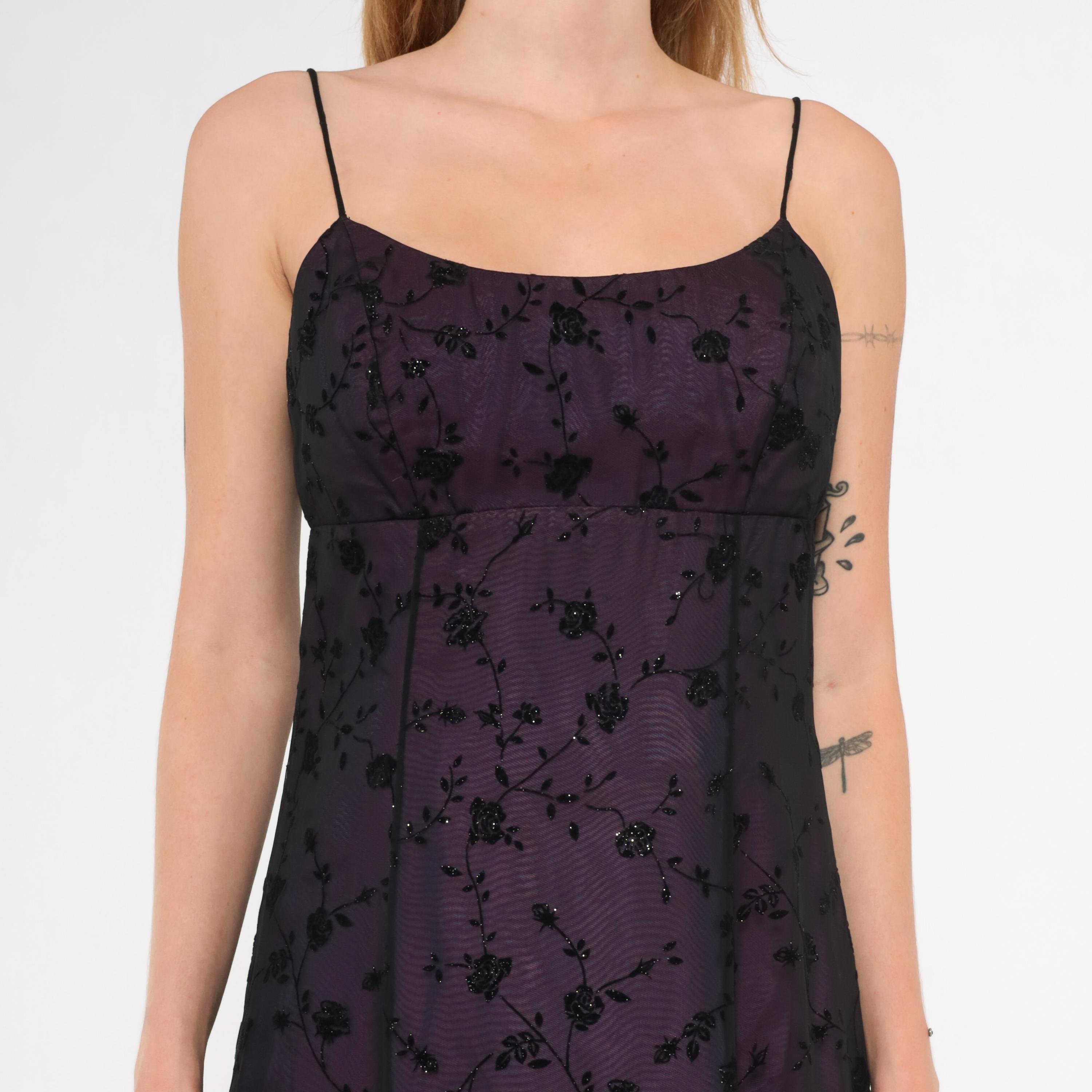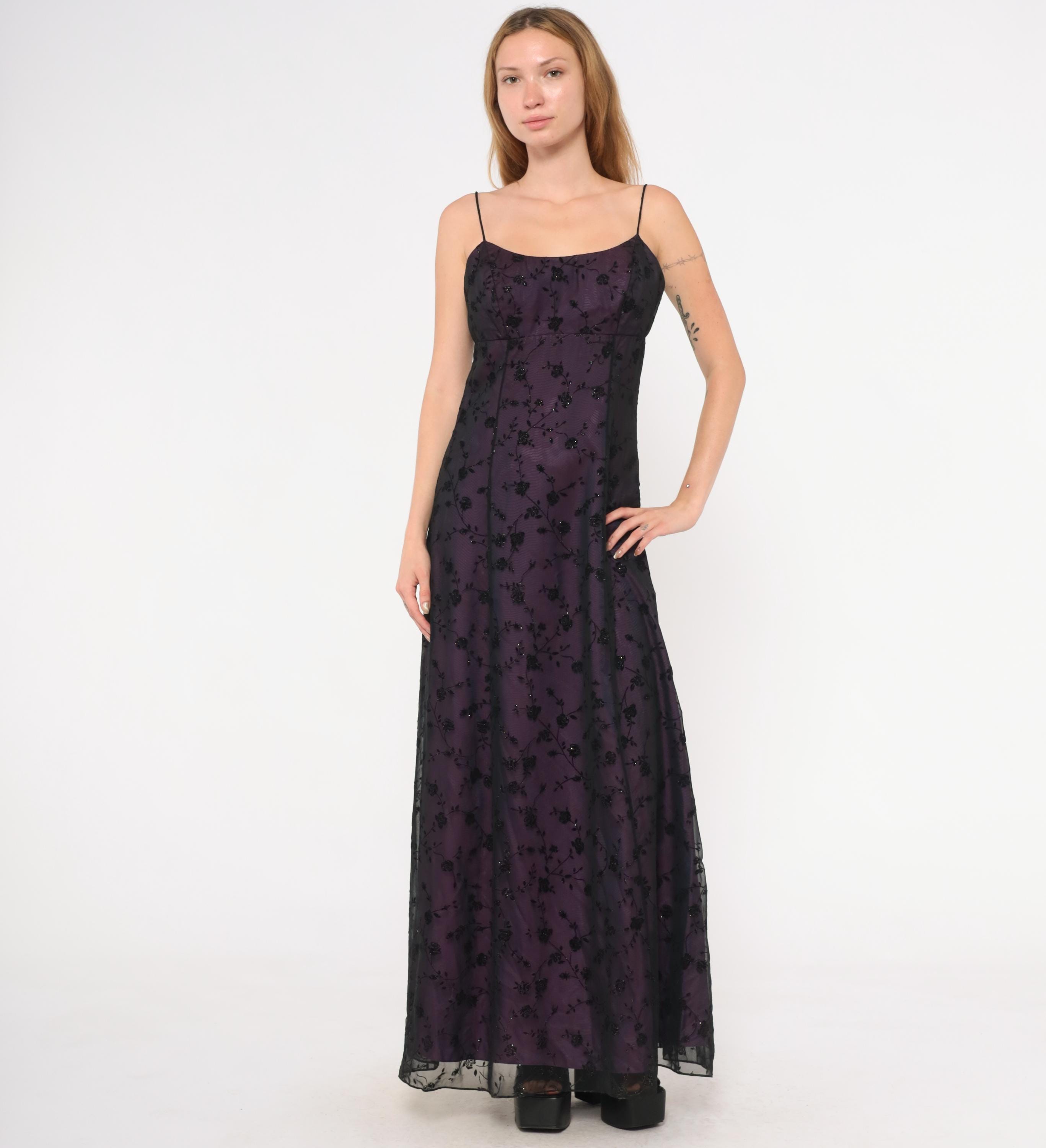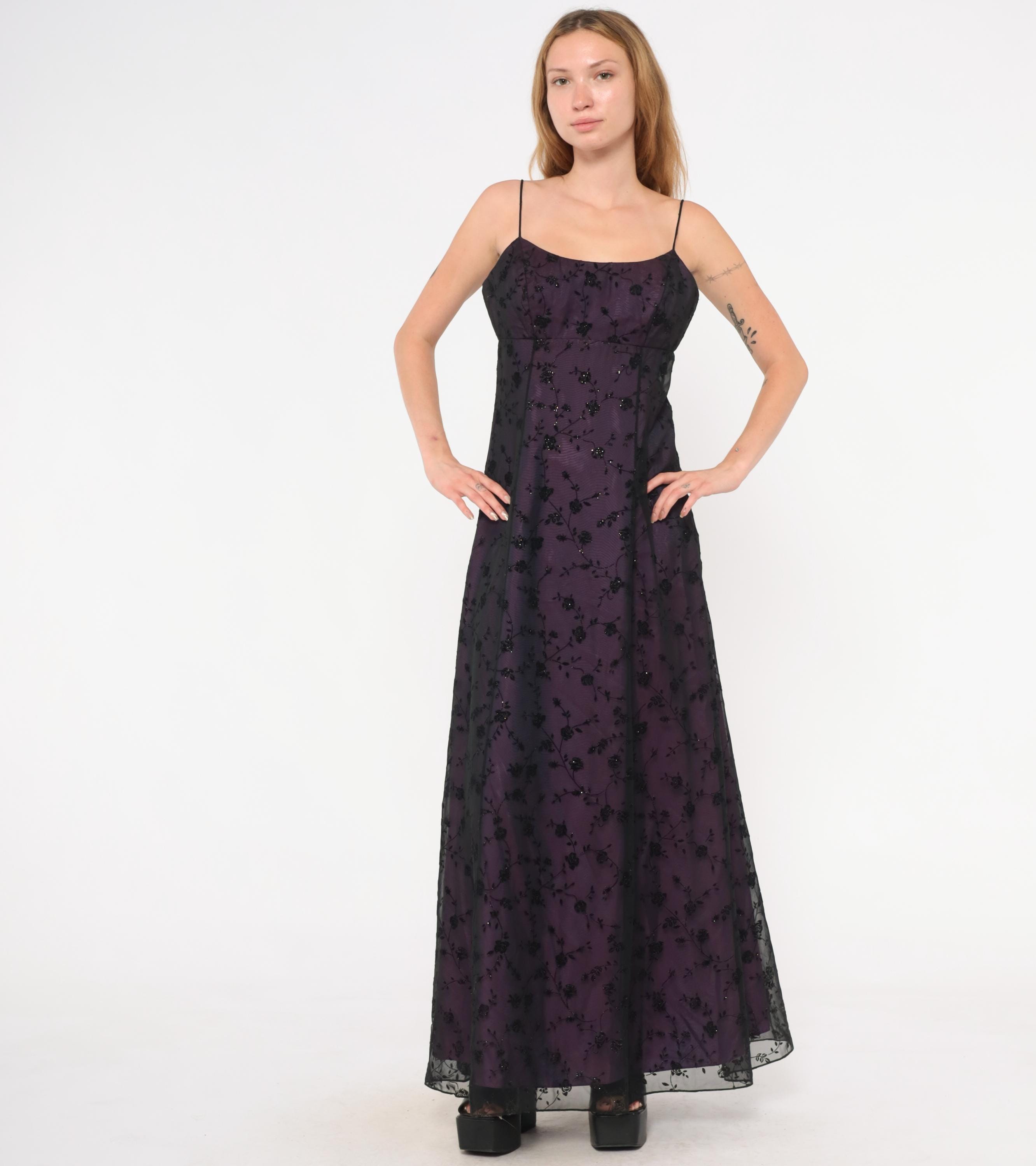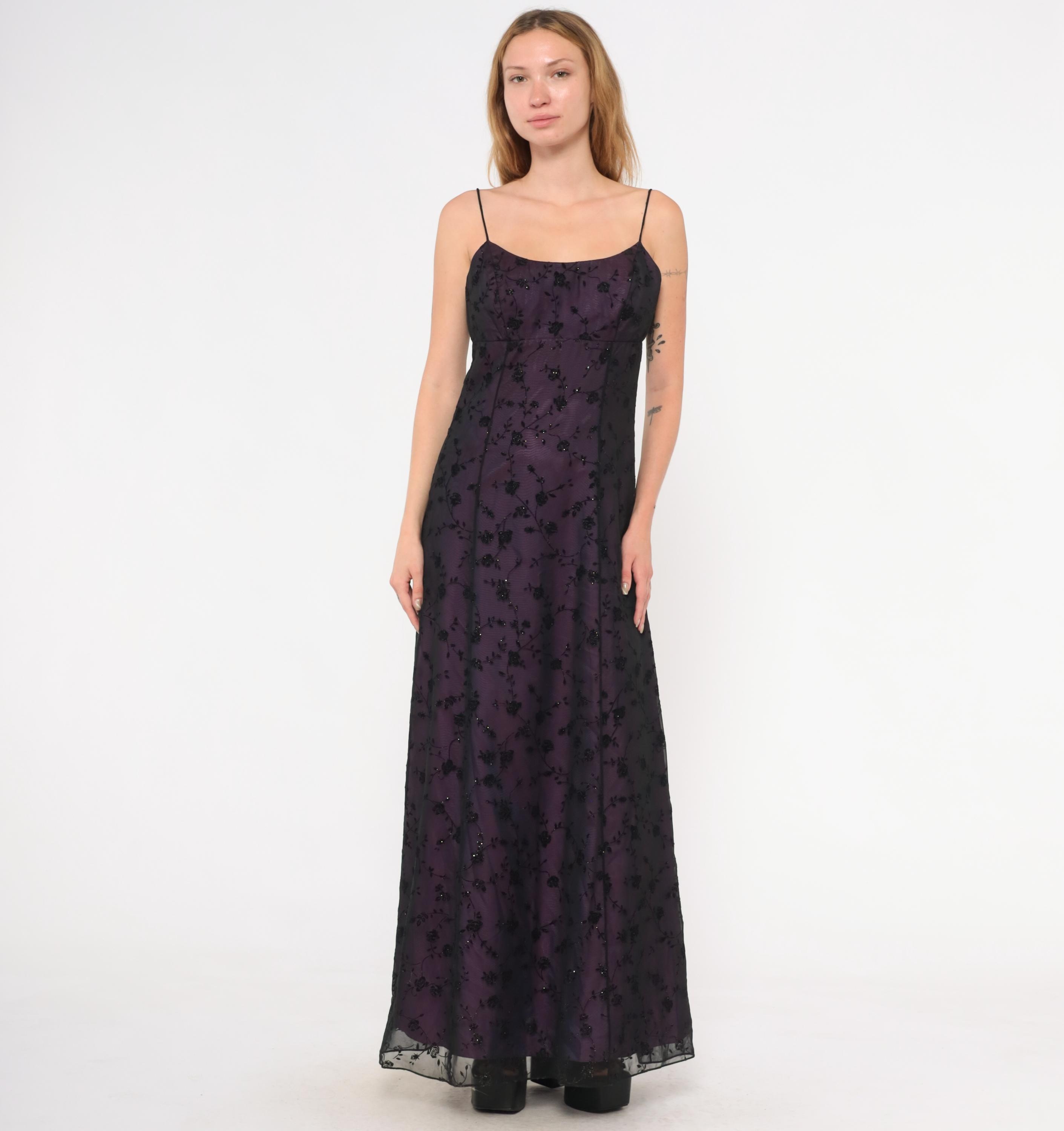 90s black floral lace overlay maxi gown from Chelsea Nites with a deep plum purple lining visible beneath the sheer embroidered mesh outer layer. Glitter accents scattered throughout the floral vine embroidery pattern across the entire dress.