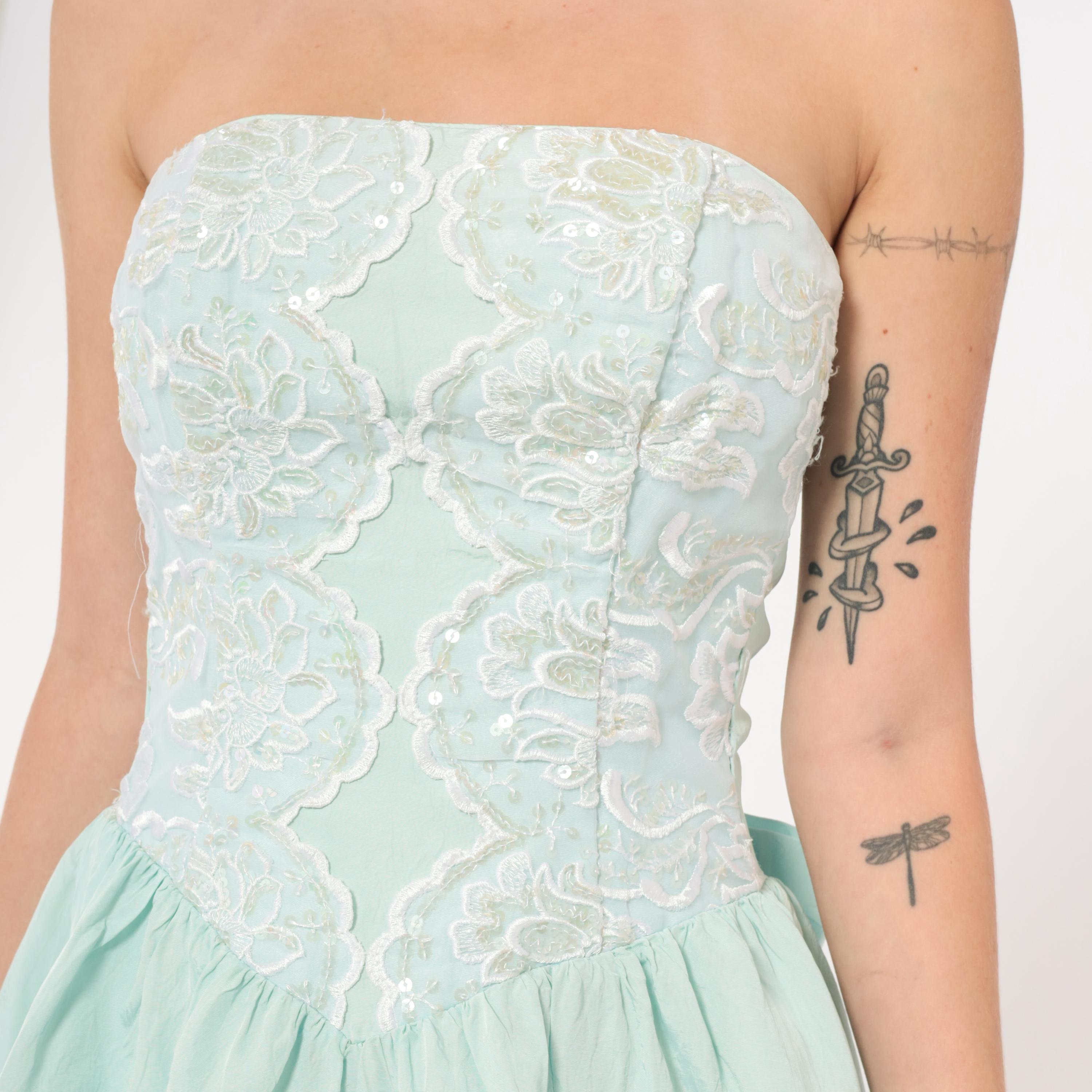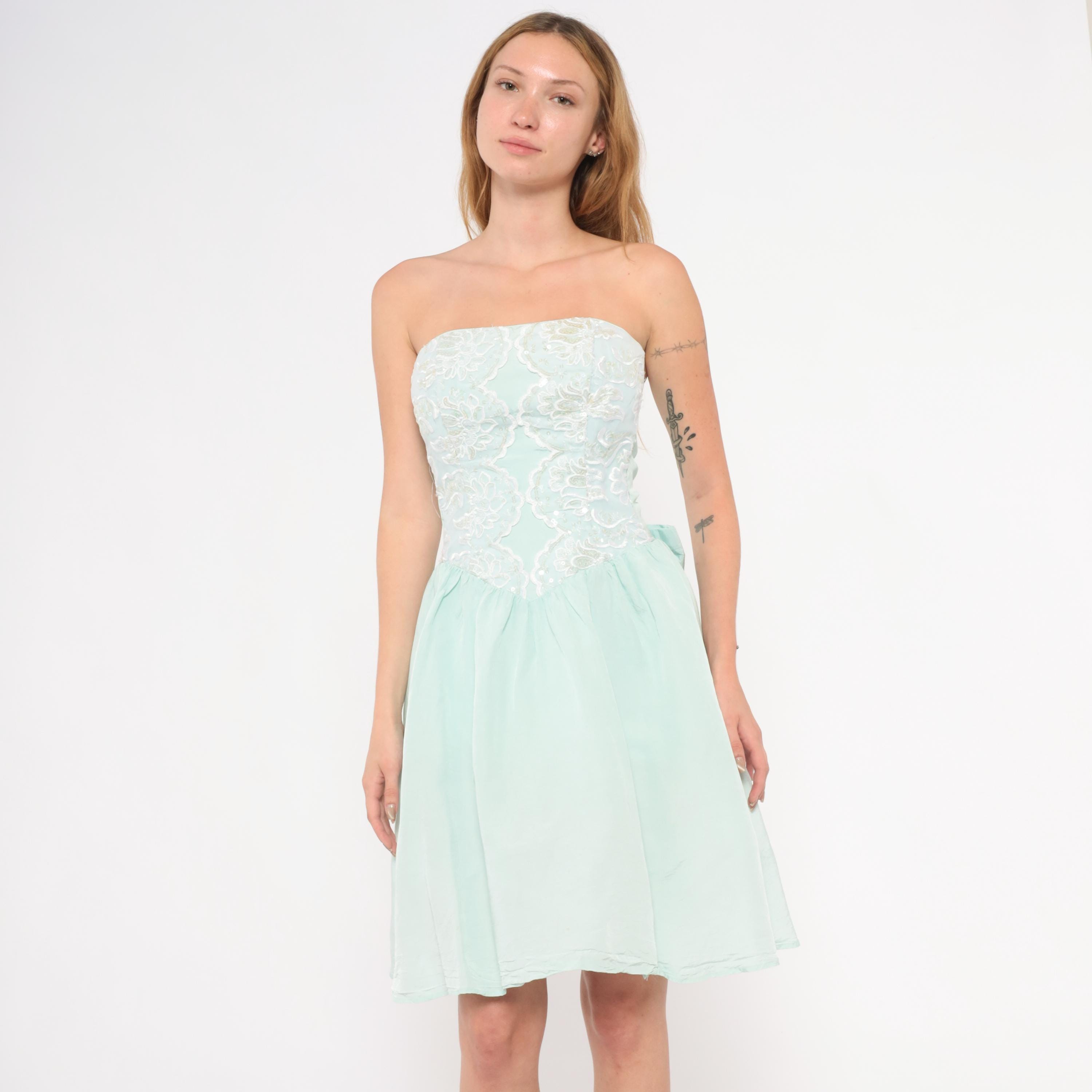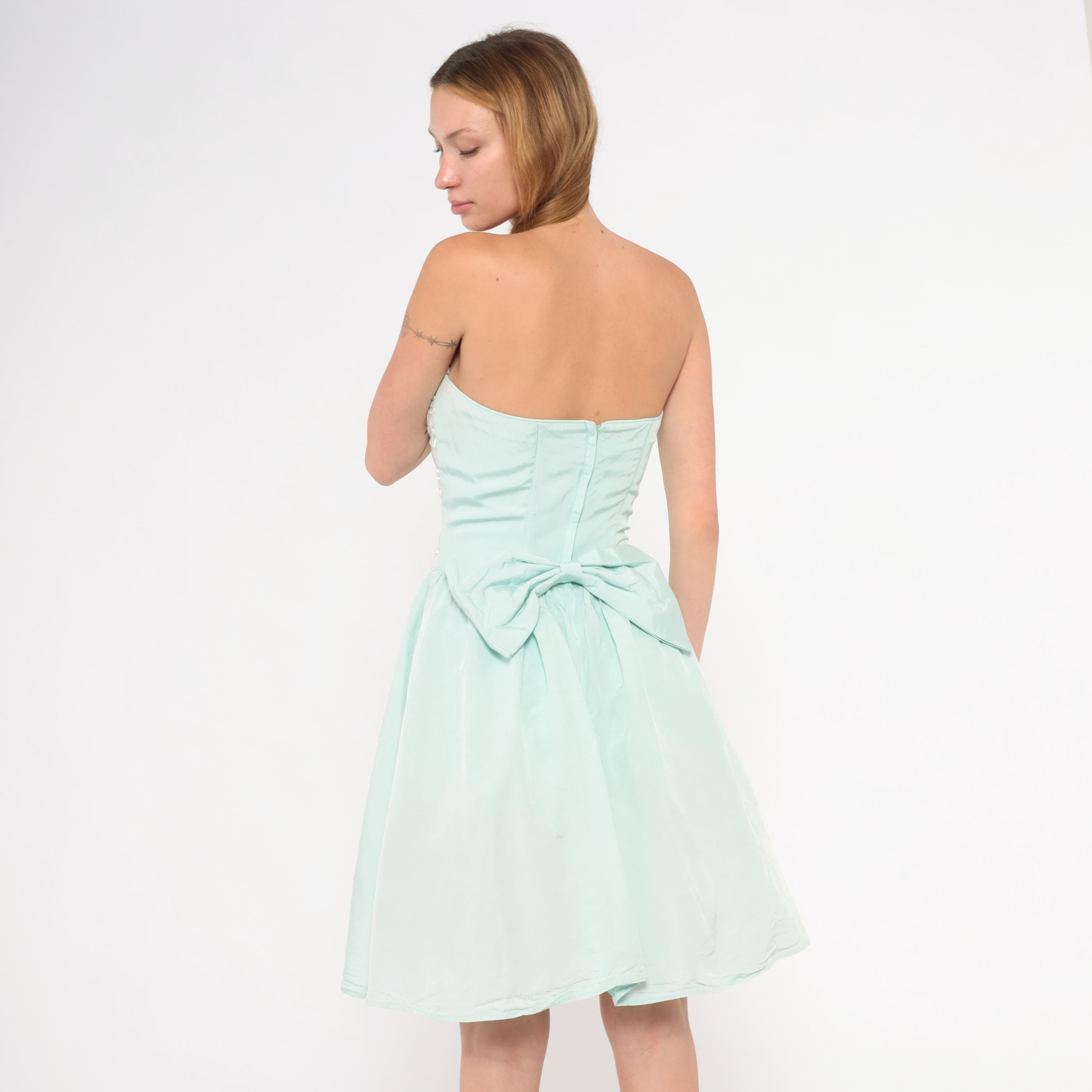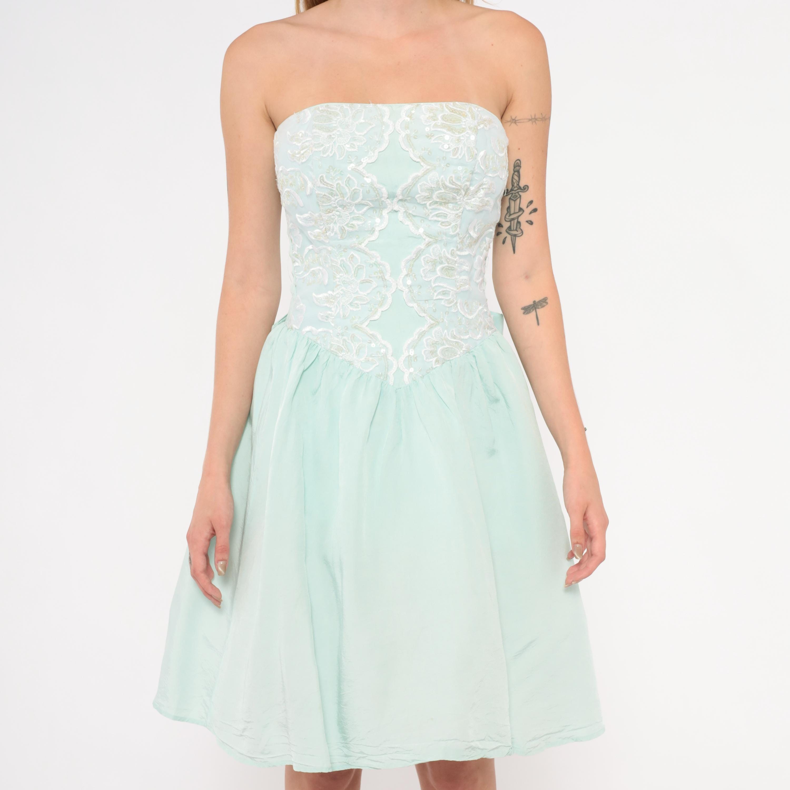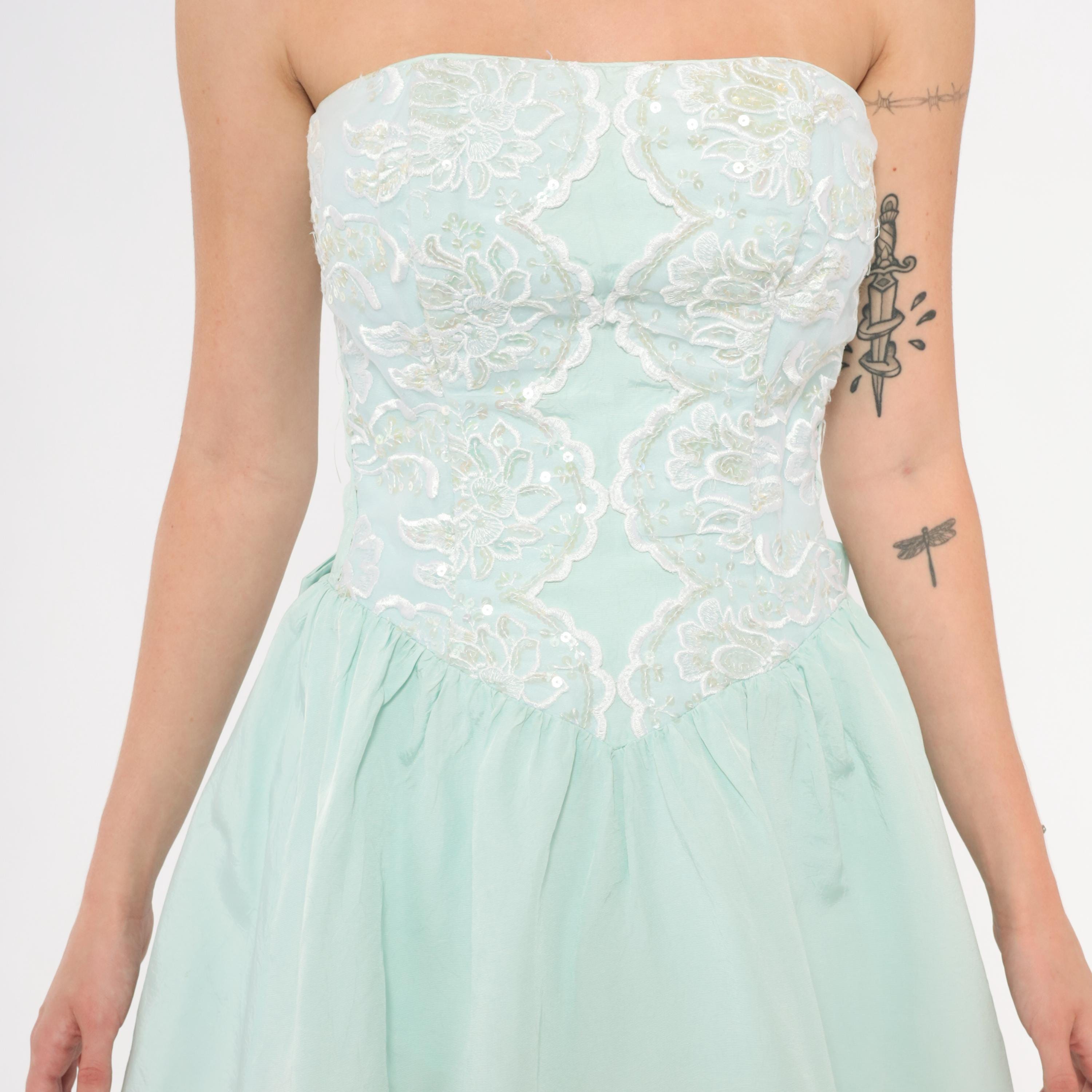 80s mint strapless dress from Gunne Sax with a fitted sequin and lace appliqué bodice and gathered A-line skirt. Sweetheart neckline with floral lace overlay and scattered clear sequins across the front. Back zipper closure with a large decorative bow at the waist. Ice blue skirt falls to knee length with a full, gathered shape.