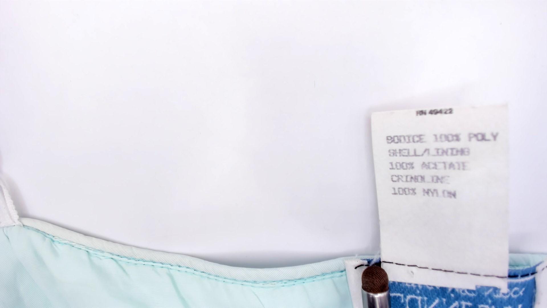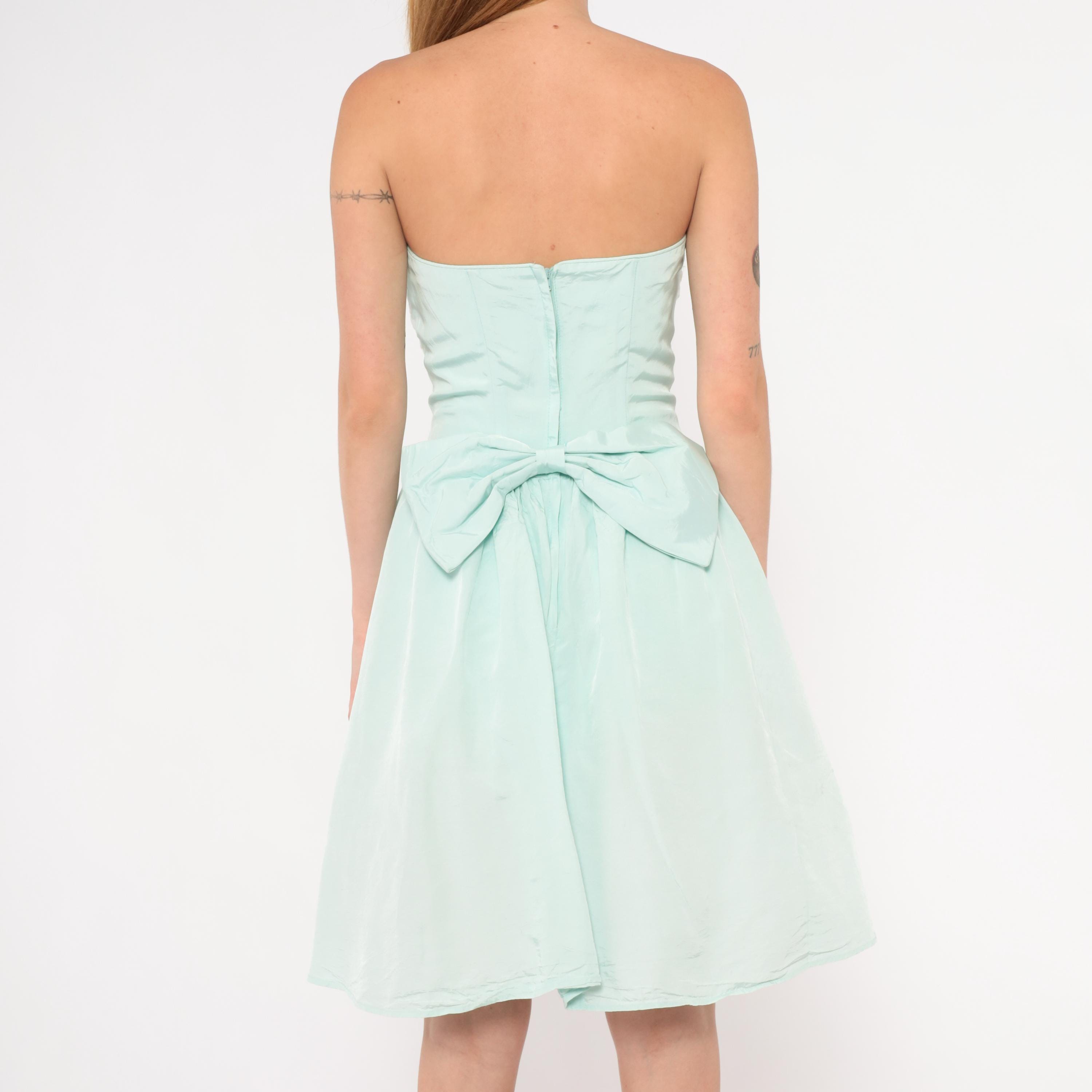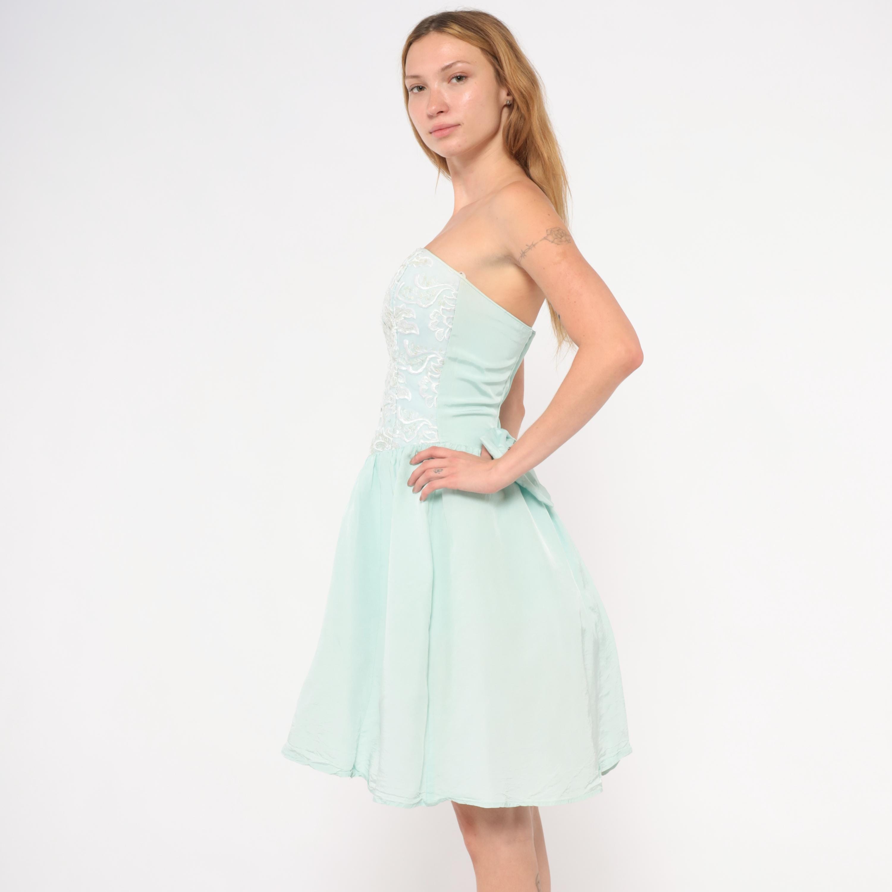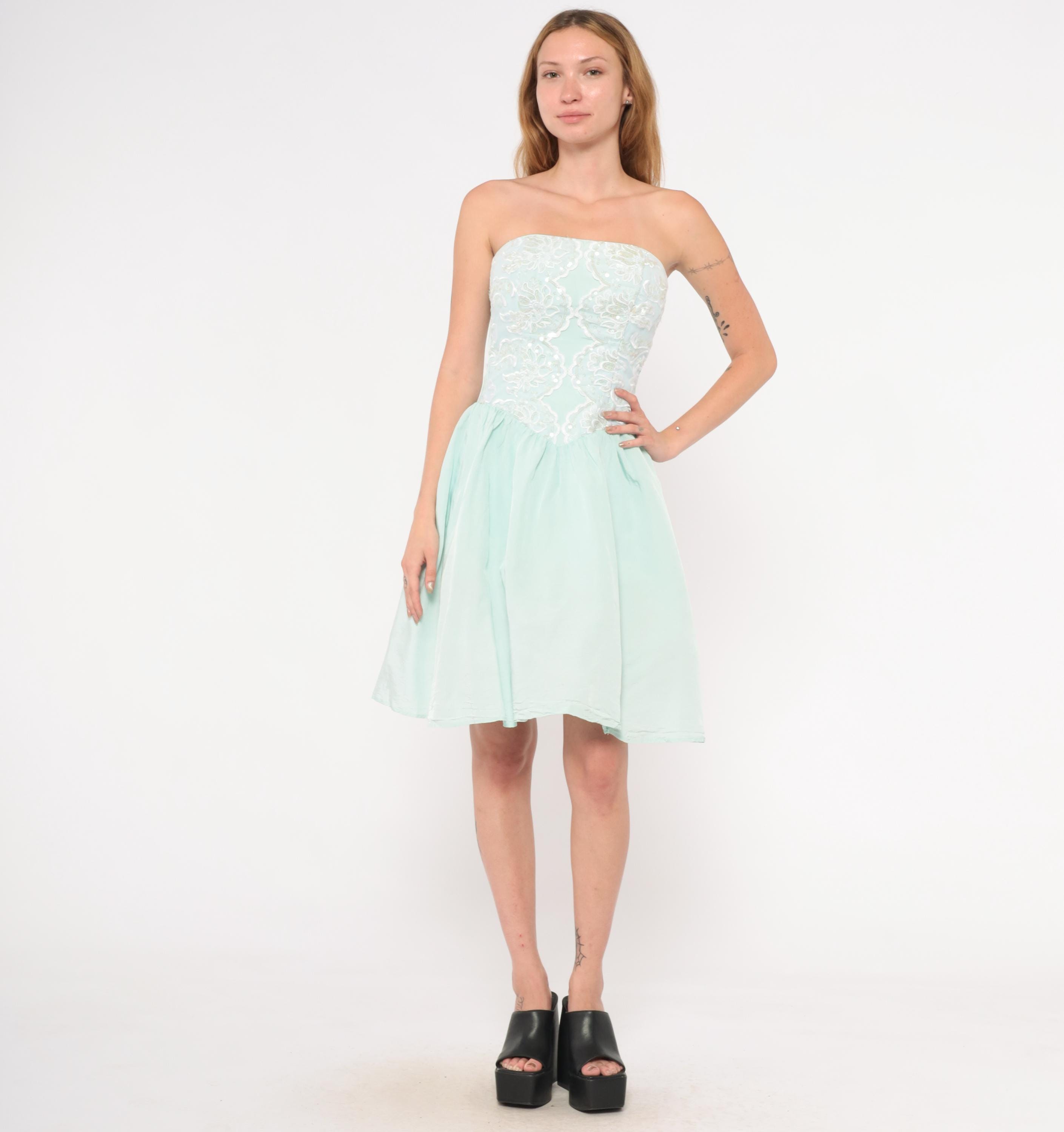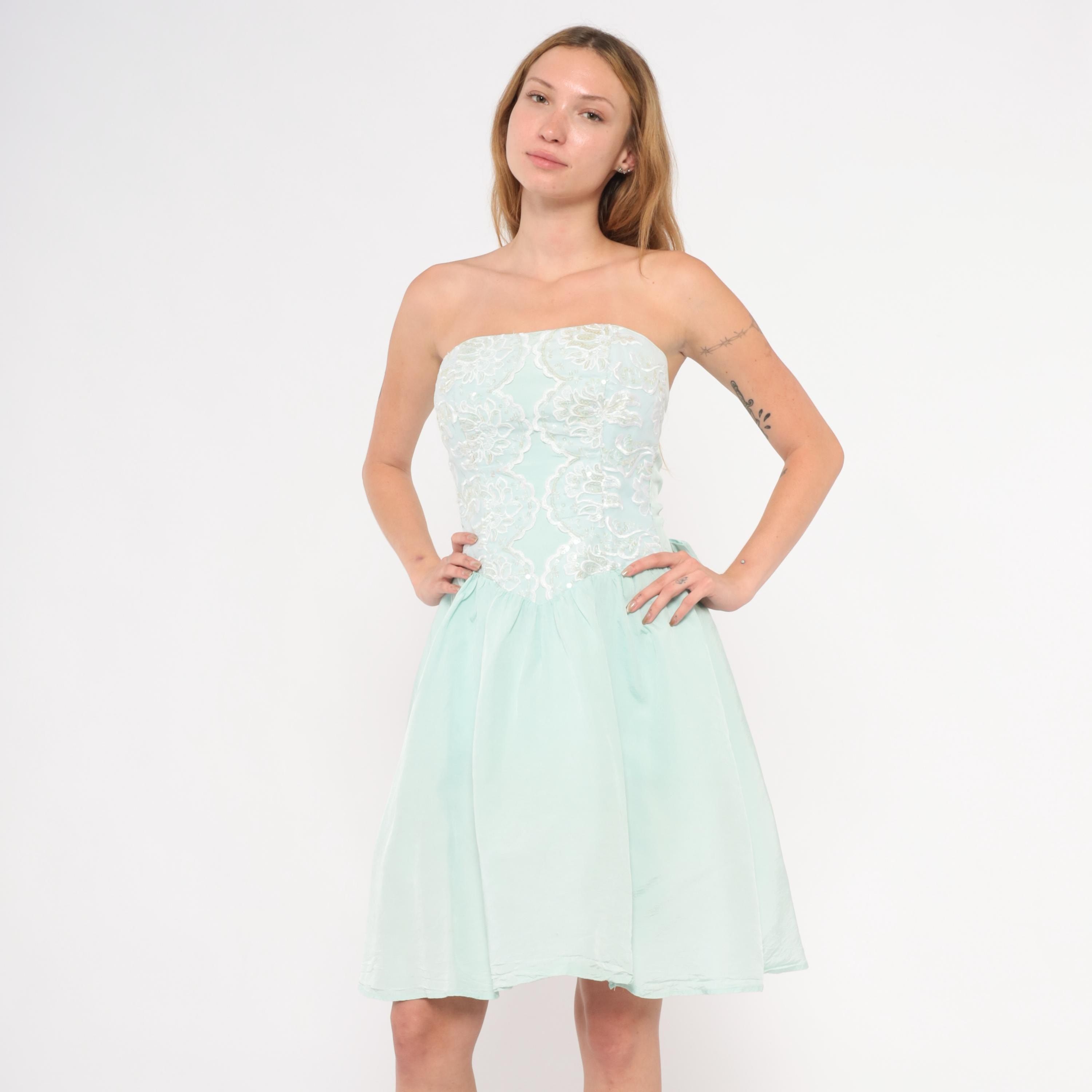 80s mint strapless dress from Gunne Sax with a fitted sequin and lace appliqué bodice and gathered A-line skirt. Sweetheart neckline with floral lace overlay and scattered clear sequins across the front. Back zipper closure with a large decorative bow at the waist. Ice blue skirt falls to knee length with a full, gathered shape.