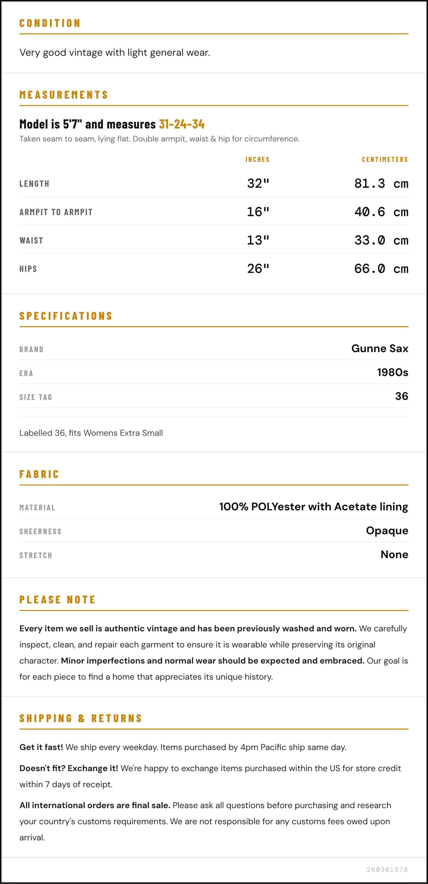 Vintage denim was usually made without any stretch, unlike modern jeans. Check the measurements to ensure proper fit, and remember to give yourself a little wiggle room in the waist and hips, depending on your preferred fit.