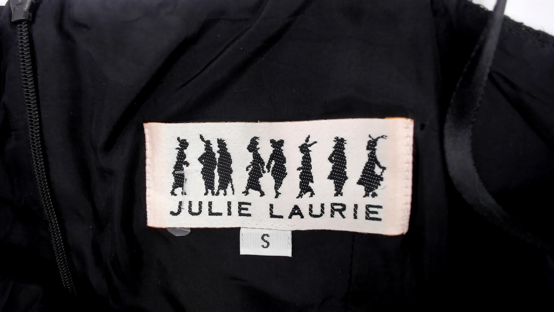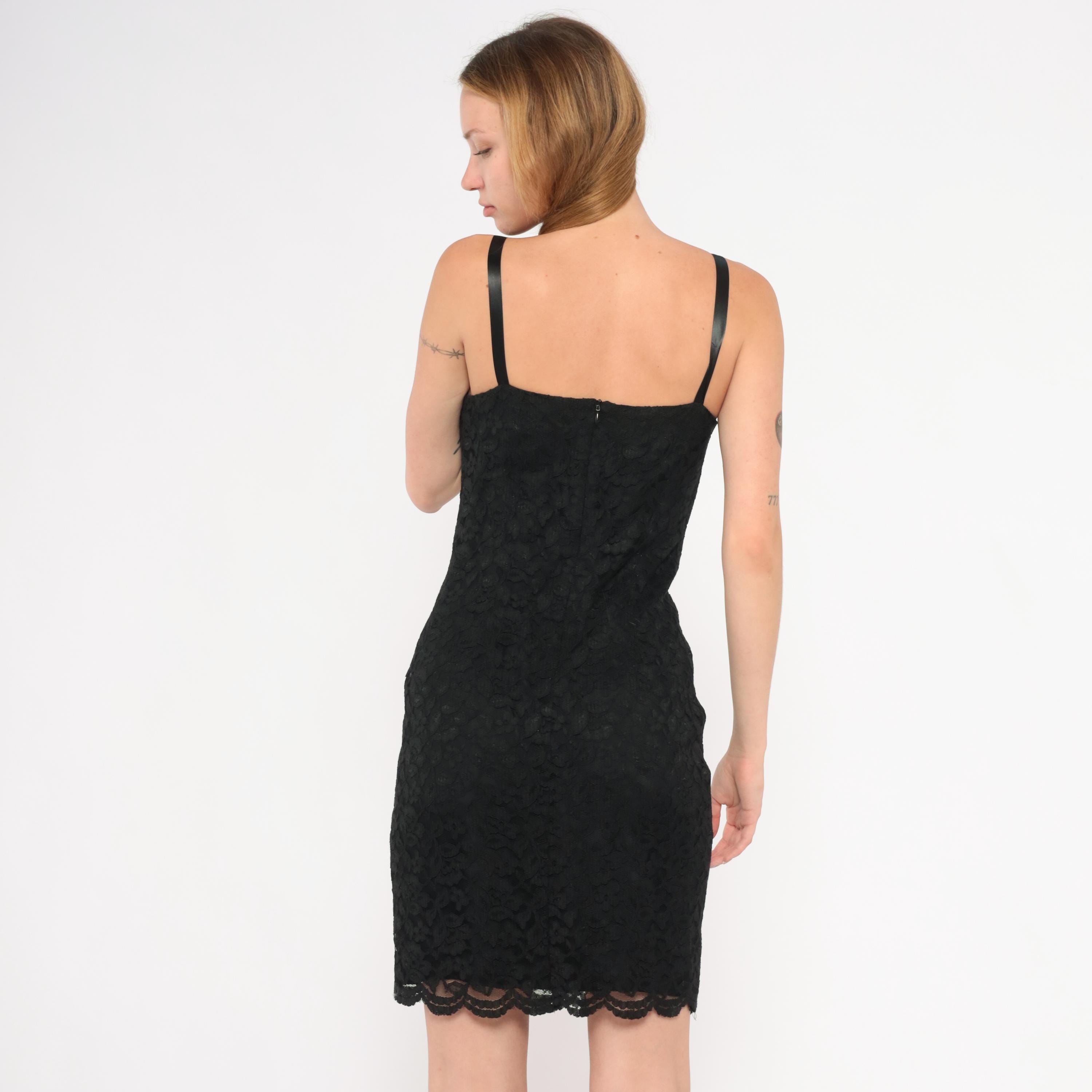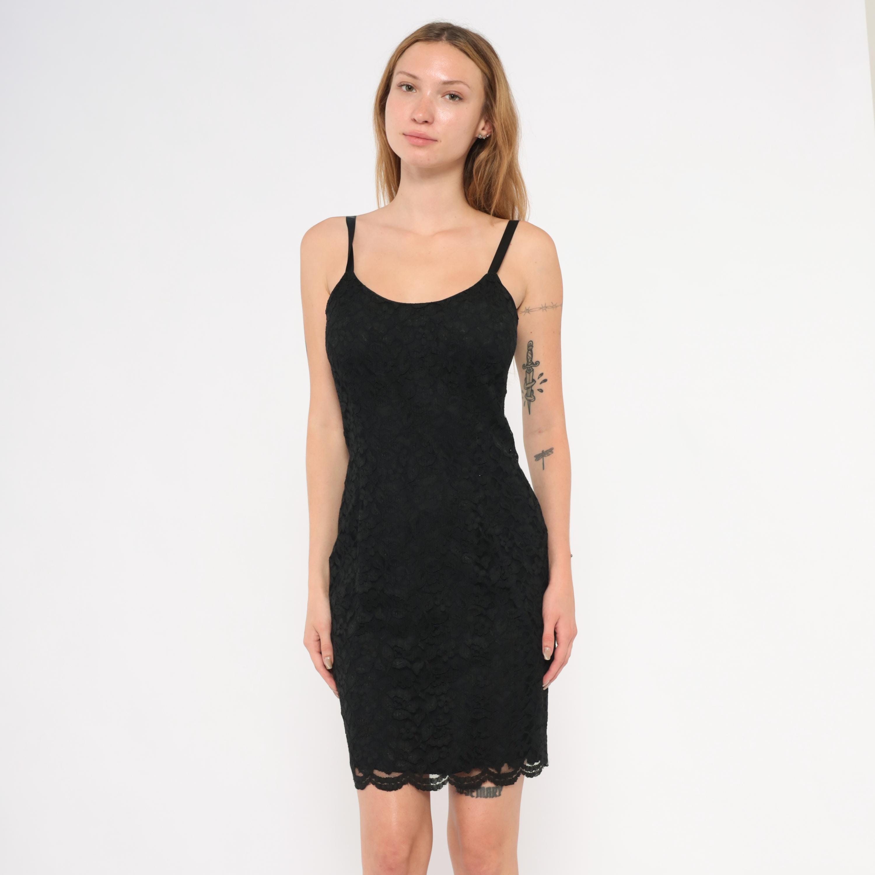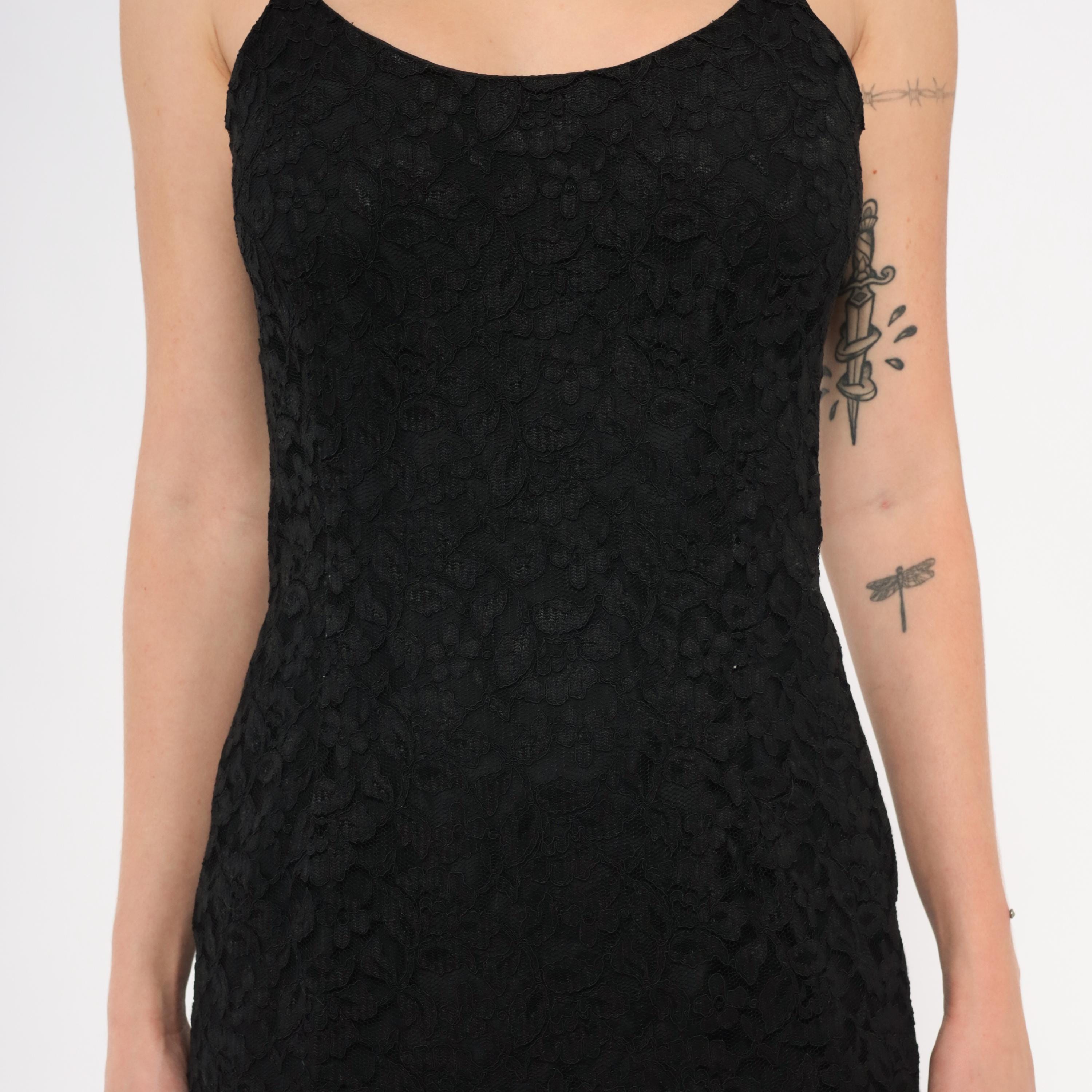 90s black lace slip dress from Julie Laurie with allover floral lace overlay, spaghetti straps, and scoop neckline. Fitted bodycon silhouette with back zipper closure and scalloped lace hem. The lace has a raised floral pattern throughout the body of the dress.
