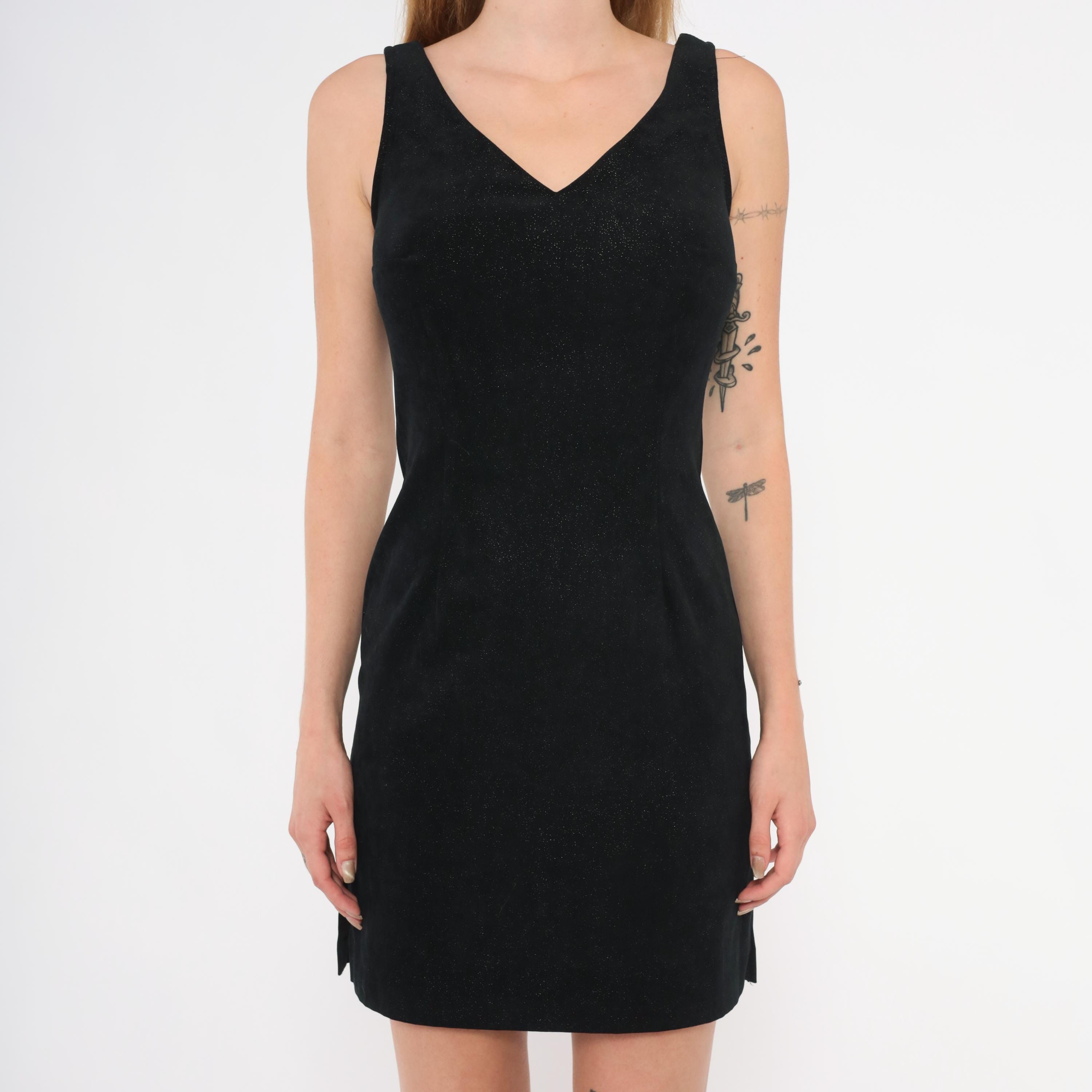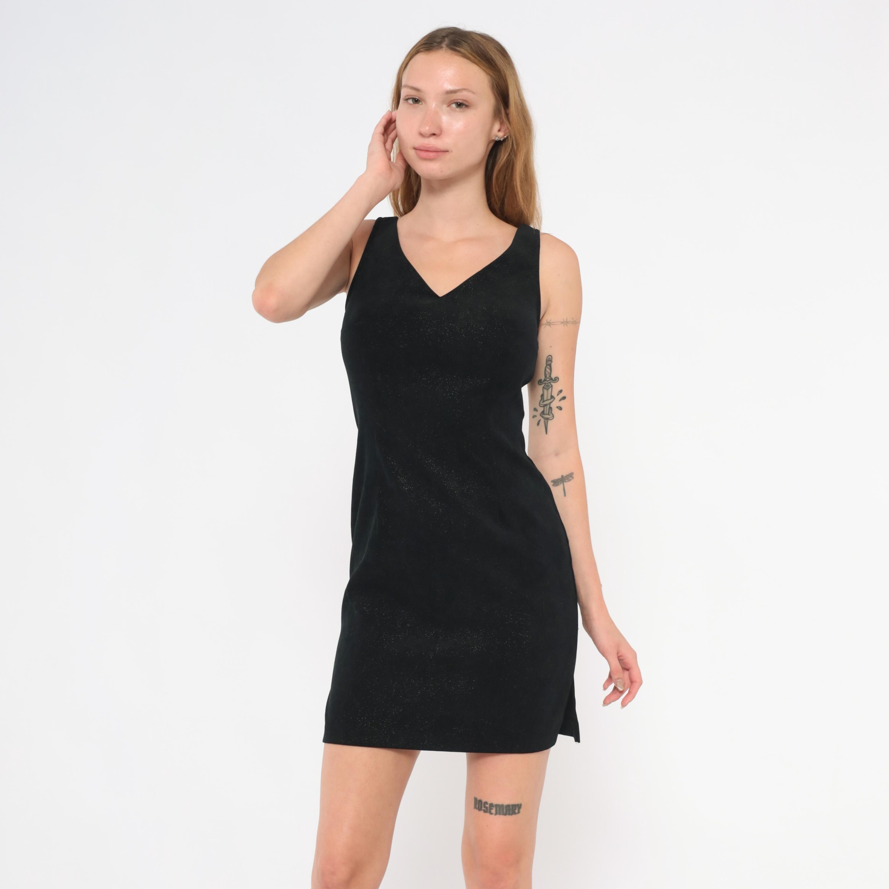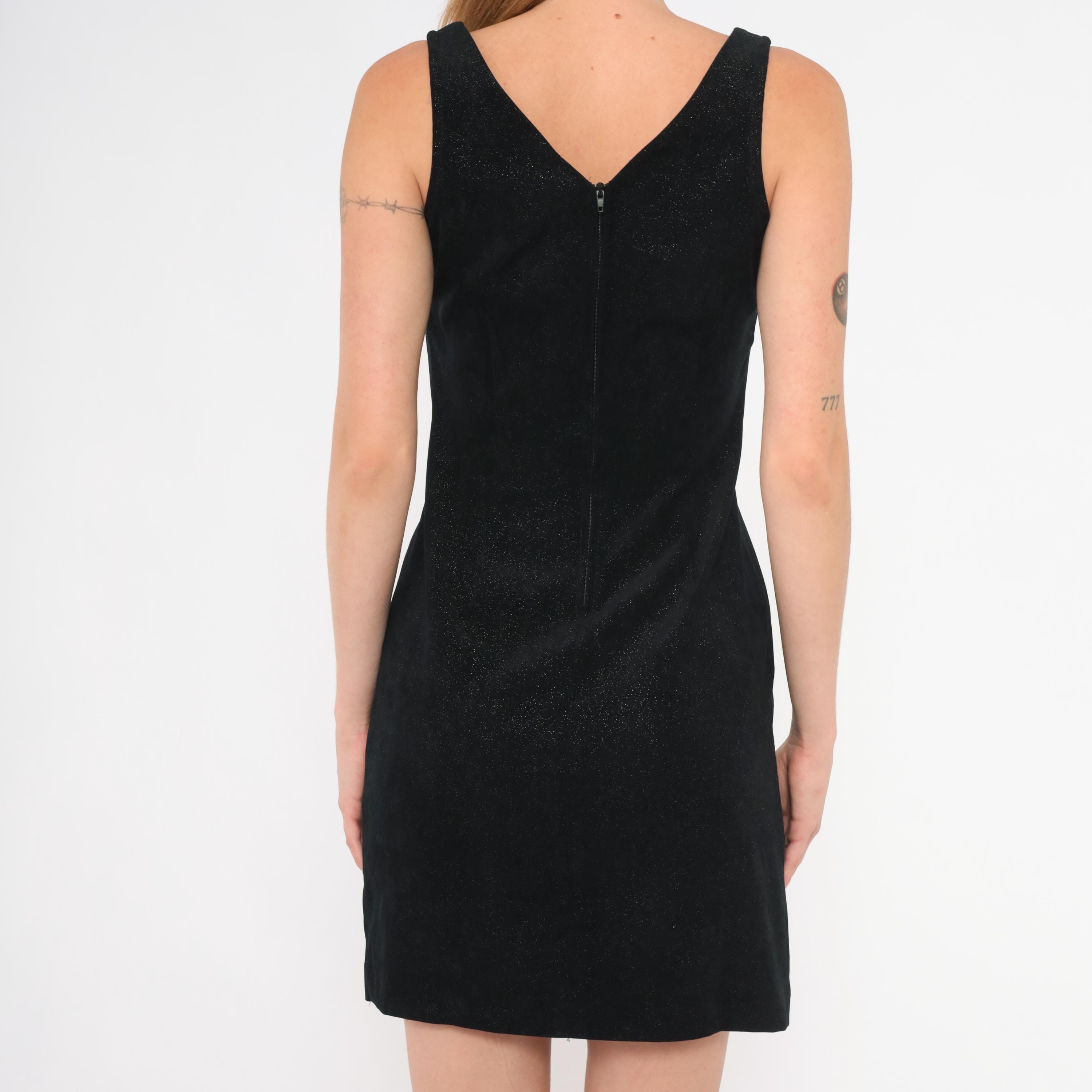 90s black glitter mini dress from Splurge with a V-neckline on both front and back, wide shoulder straps, and a fitted sheath silhouette. Subtle sparkle embedded throughout the fabric catches light across the entire surface. Back zipper closure and small side slits at the hem.